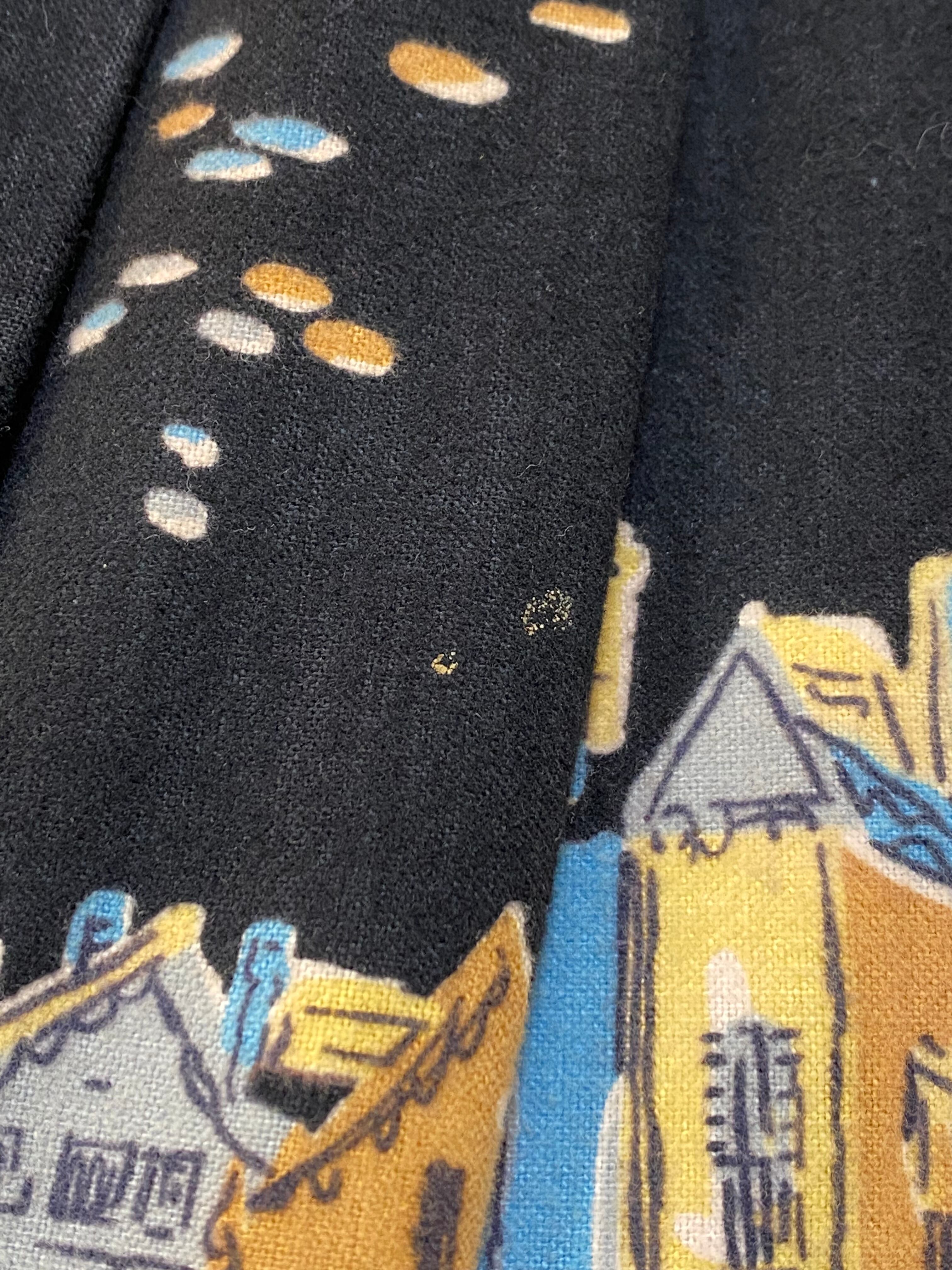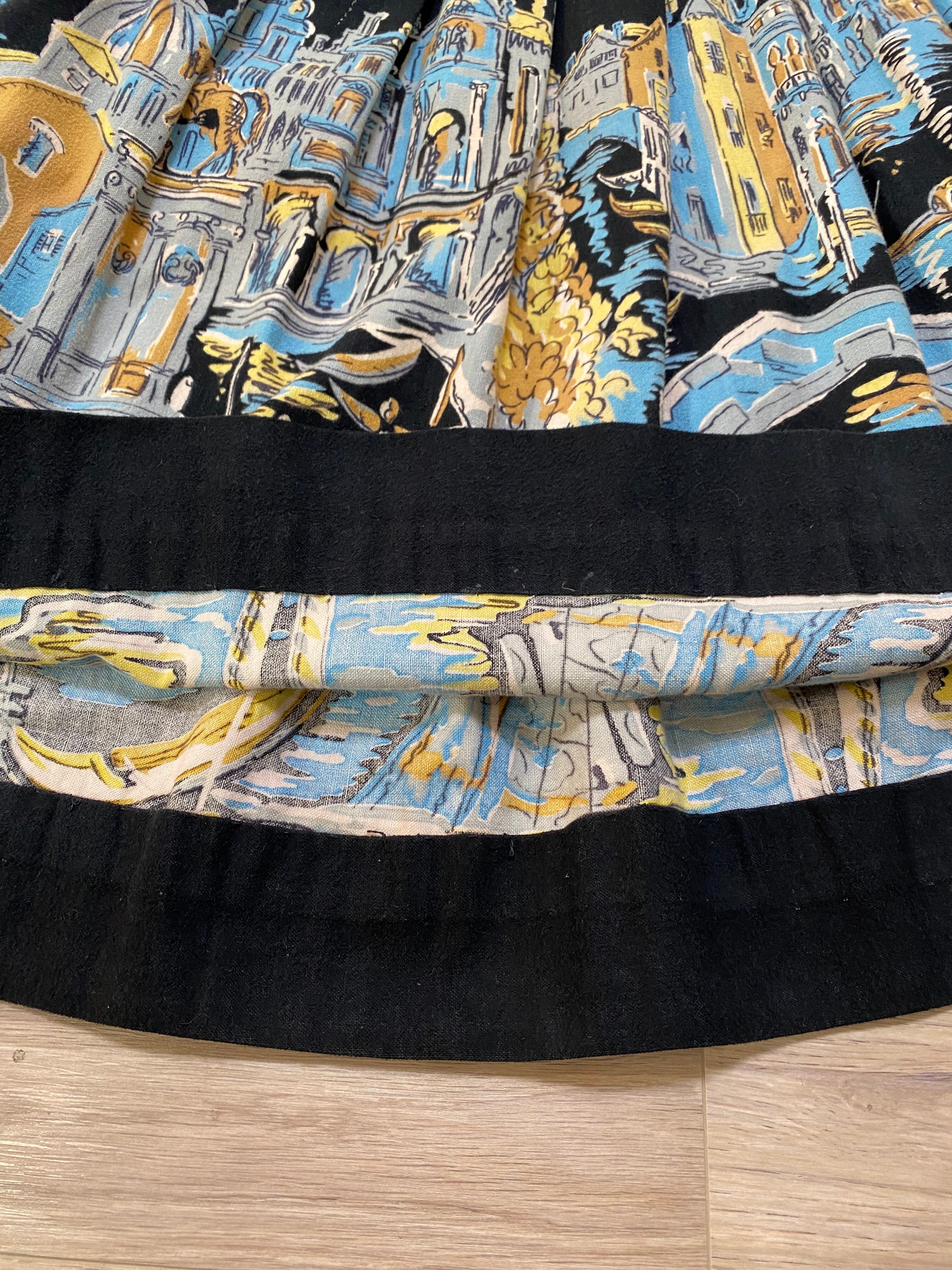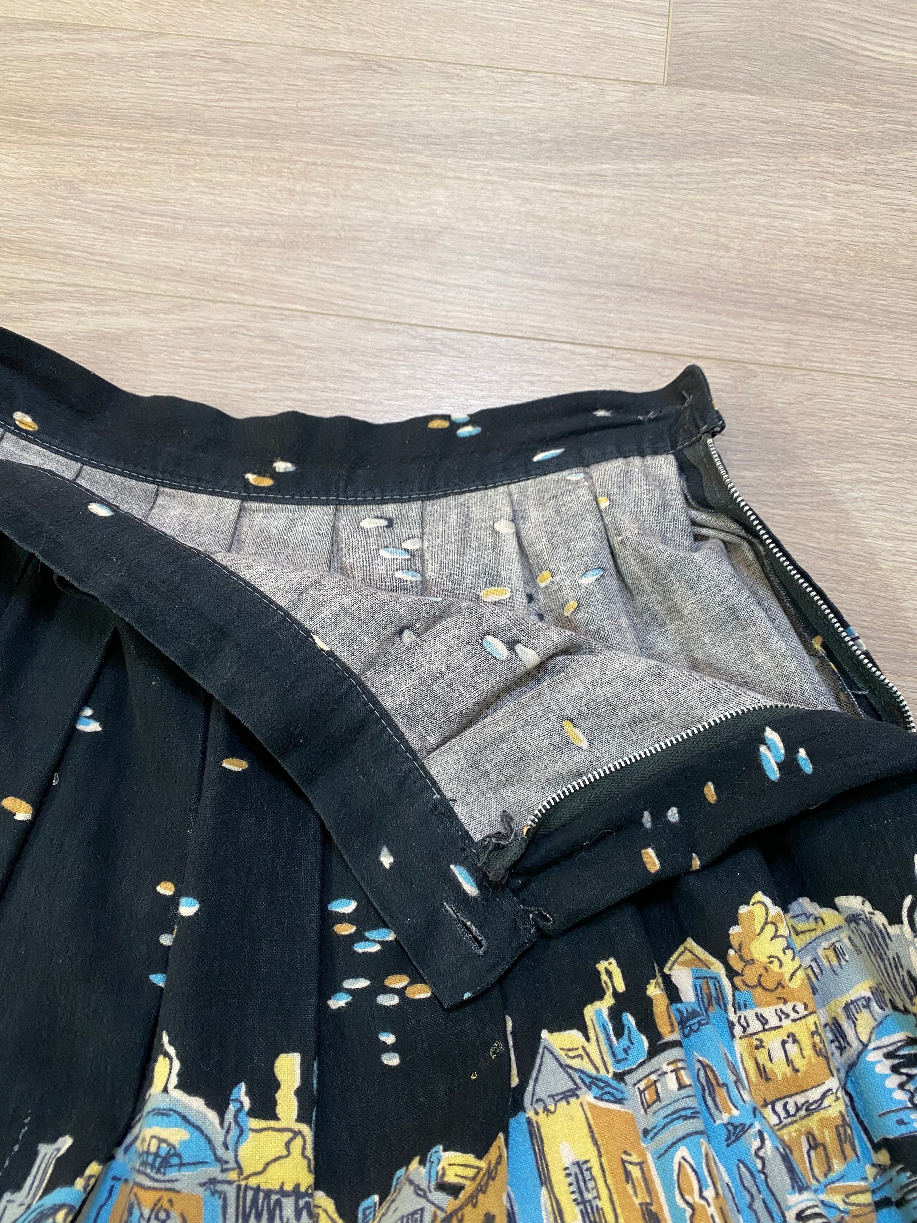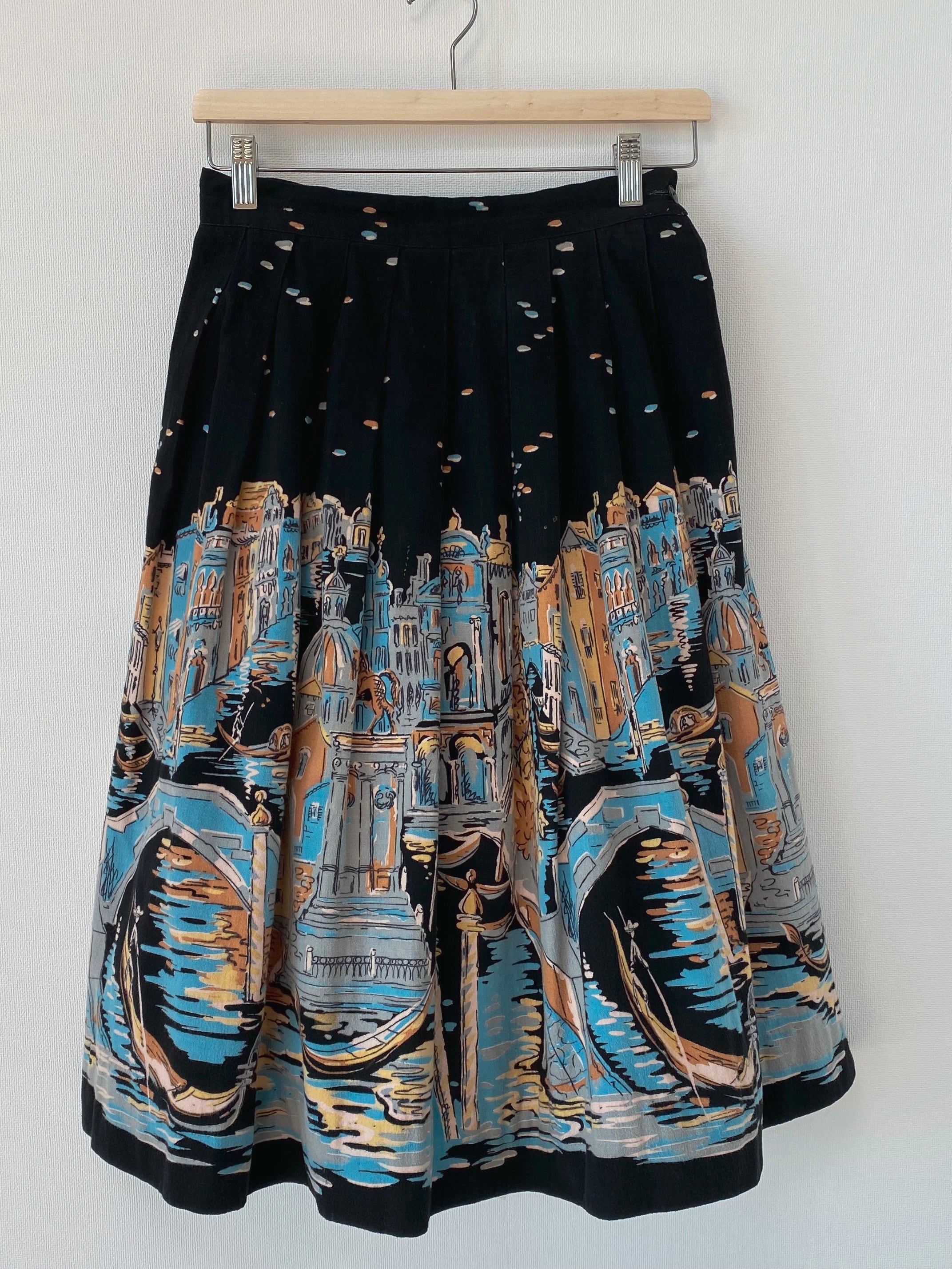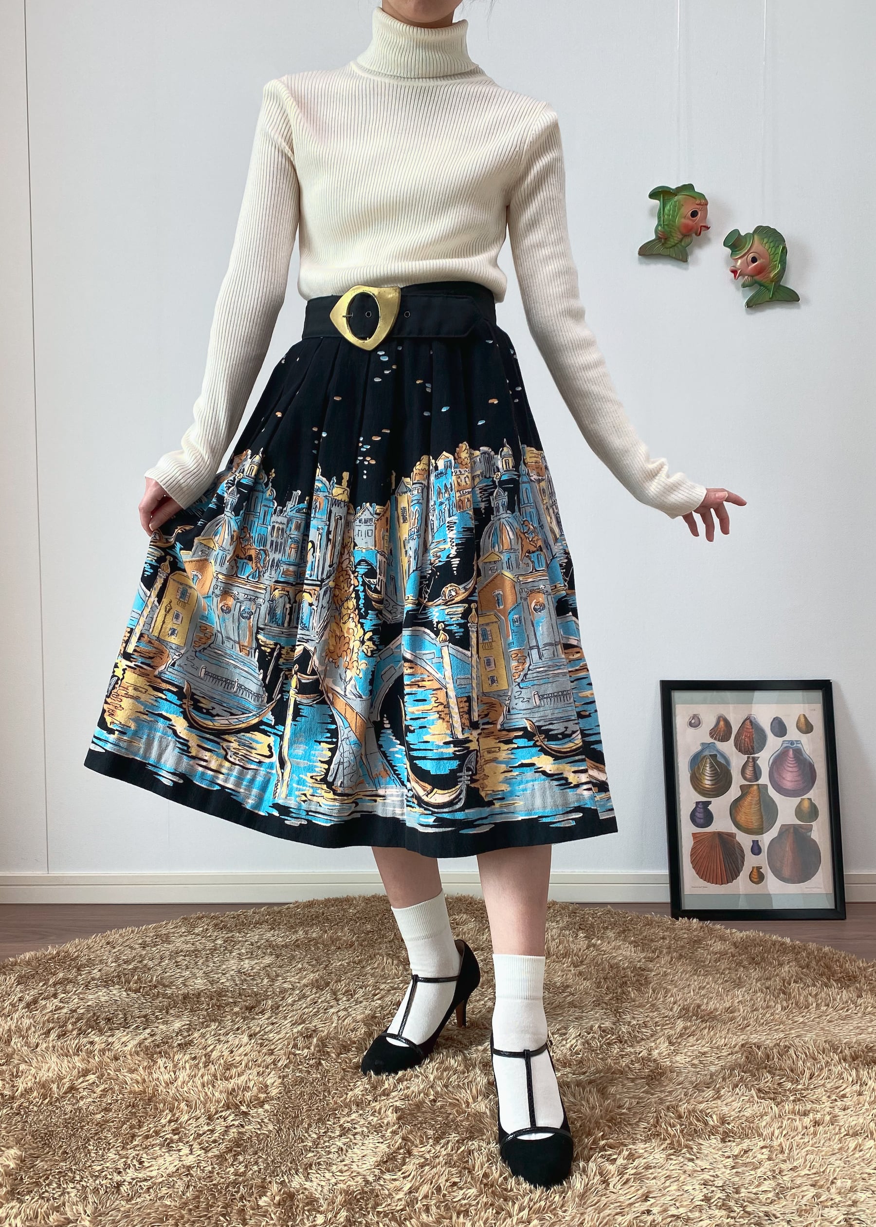 ベネチアの街並みがプリントされたタックスカート。ハンドメイドかと思われます。優しいタッチのプリント風景に思わずほっこりします。太めのベルトとパニエでフィット&フレアーな着こなしに。
