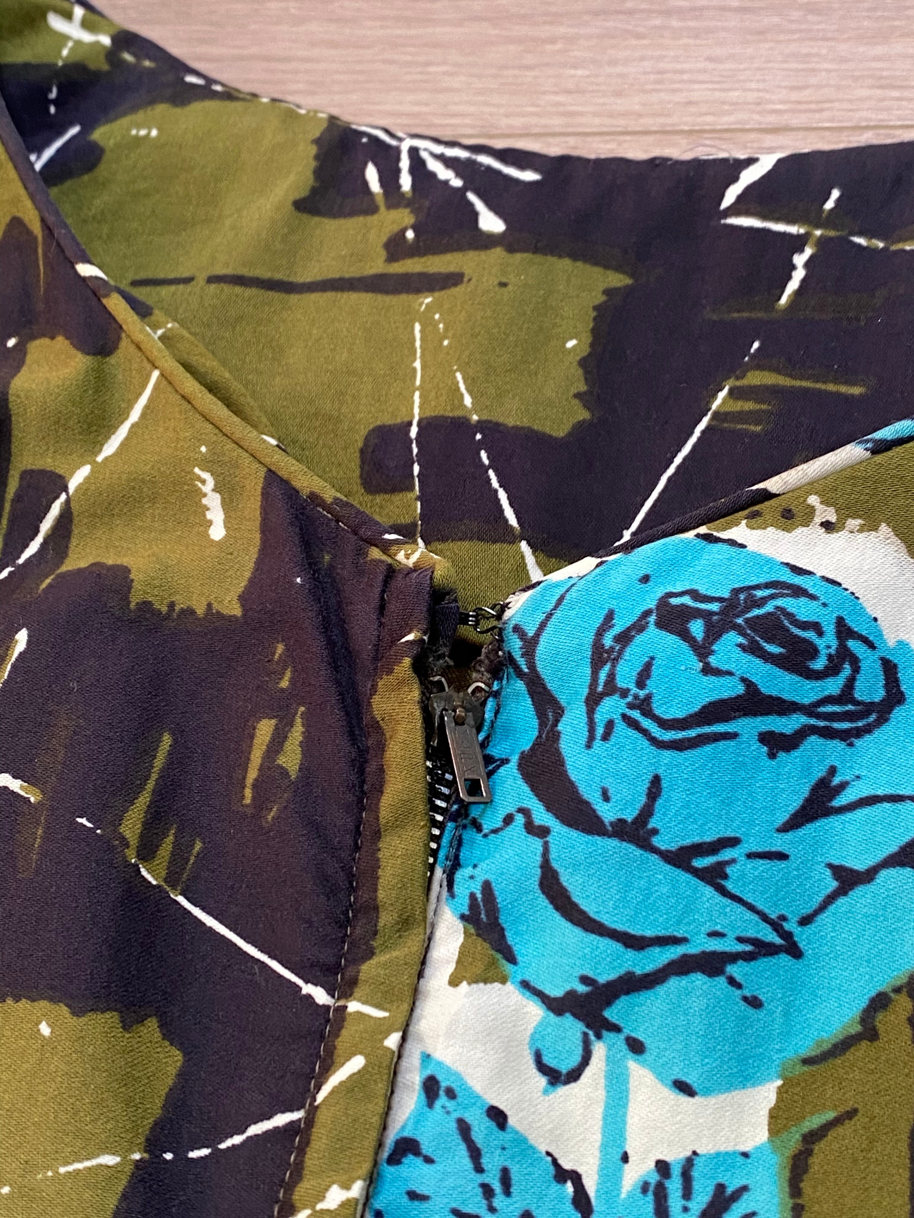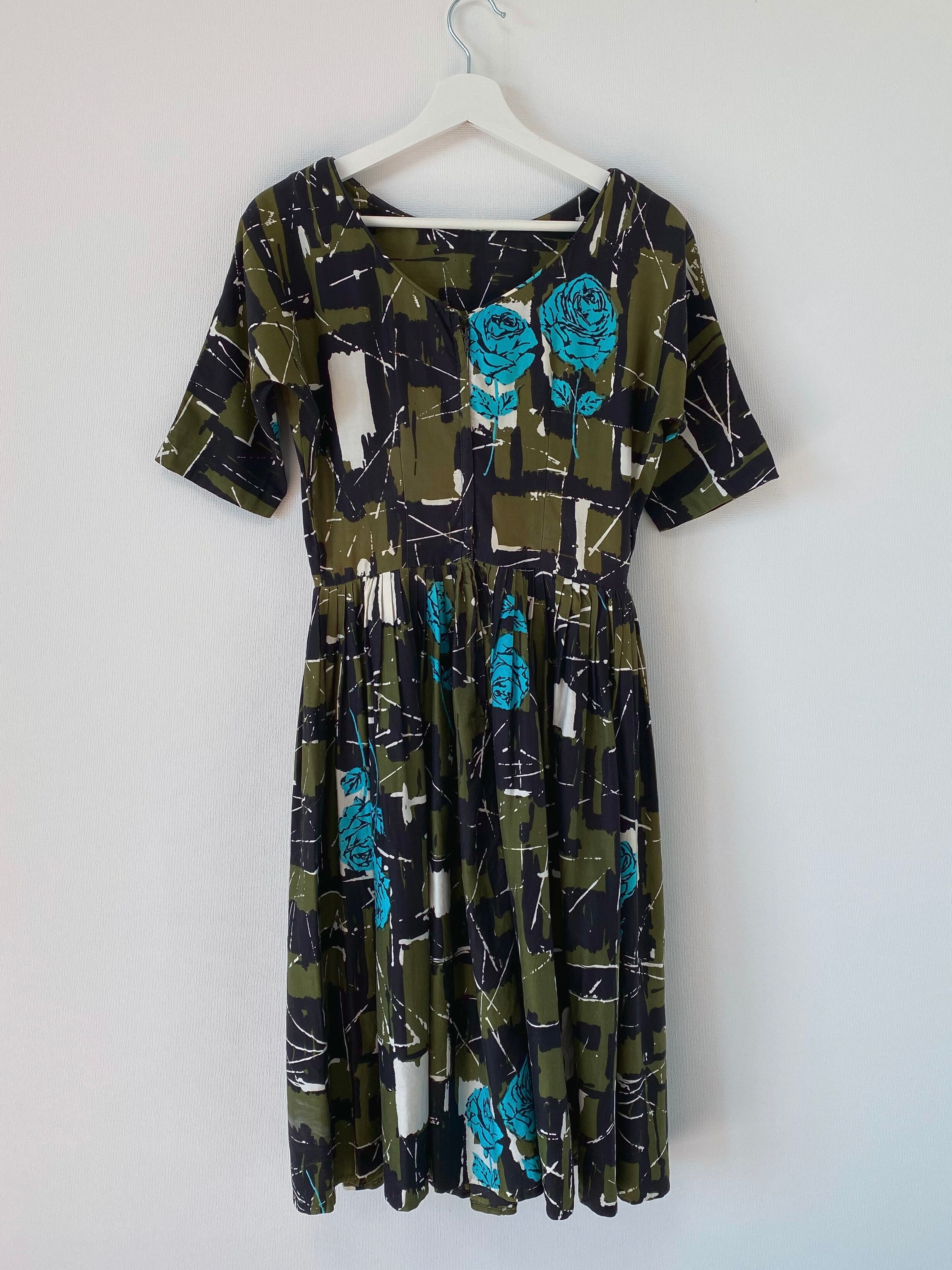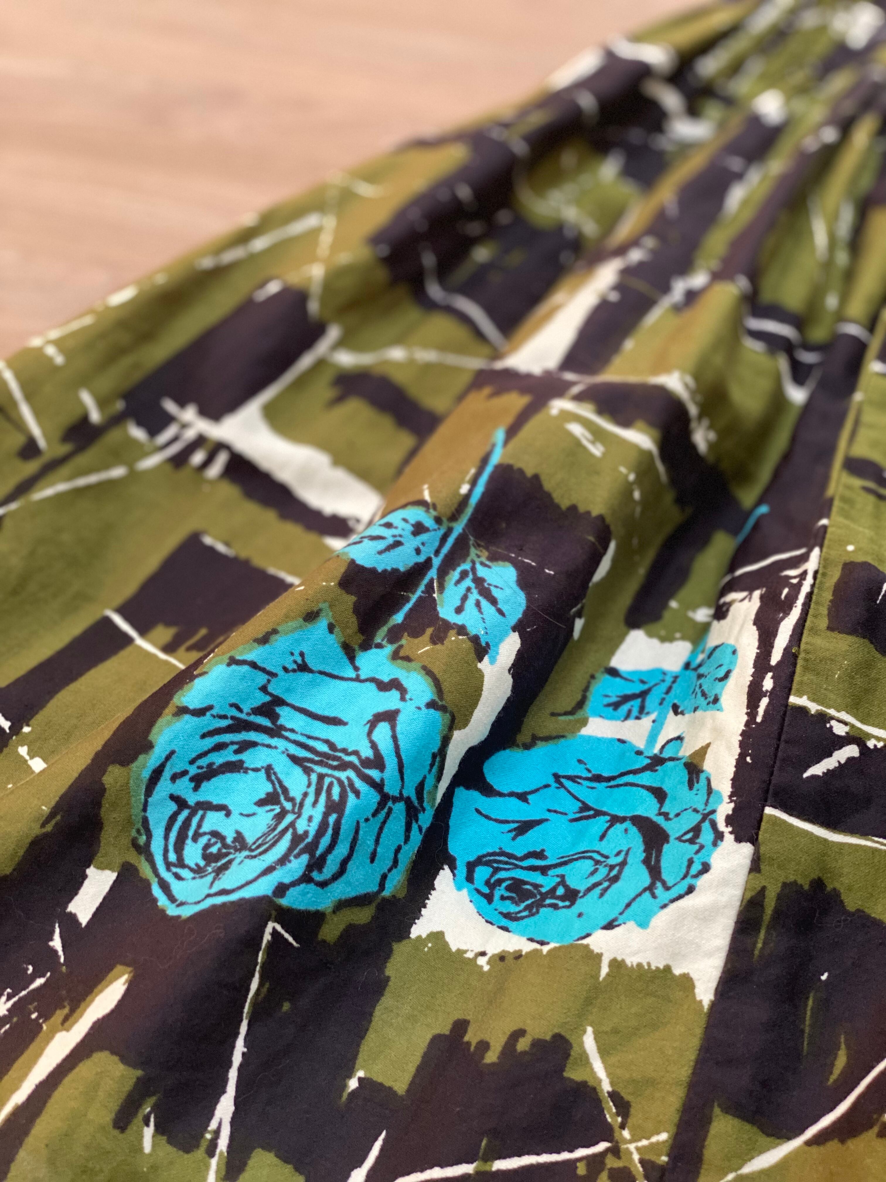 鮮やかブルーのバラが印象的なドルマンスリーブのワンピースです。細かいタックからのたっぷりフレアーが可愛いデザインです。フロントの襟ぐりは浅く、バックは深め、5分袖の印象も慎ましやか。ハンドメイドかと思われます。