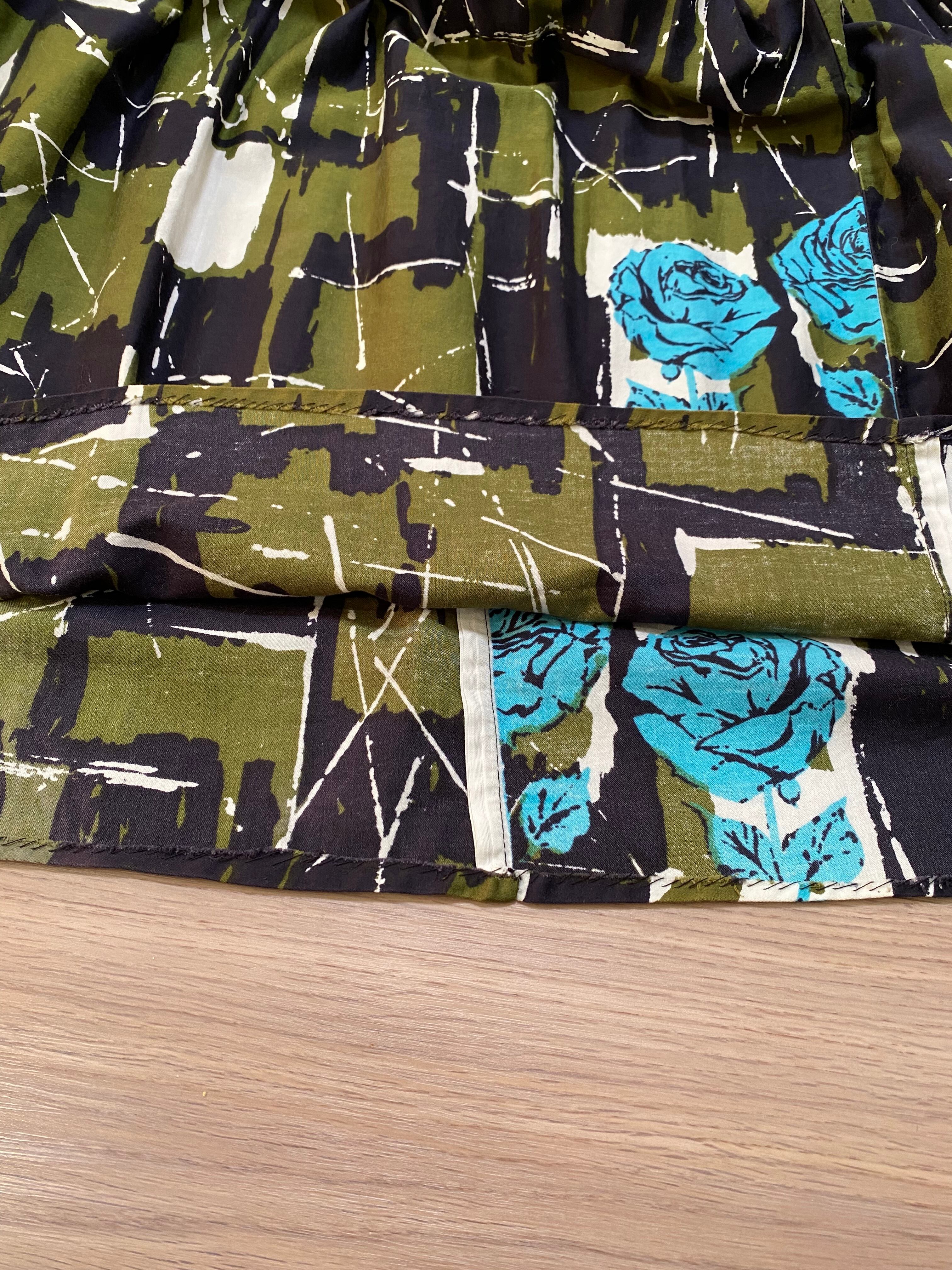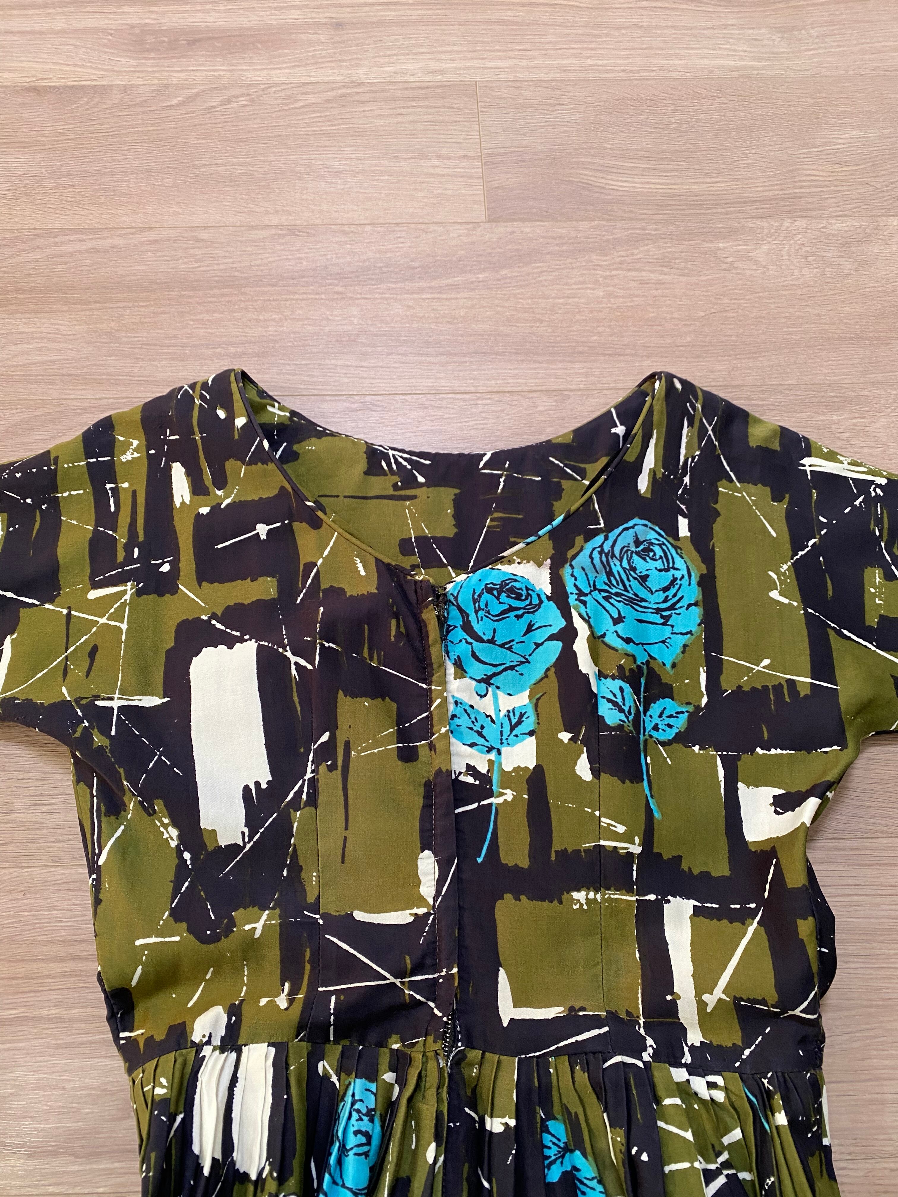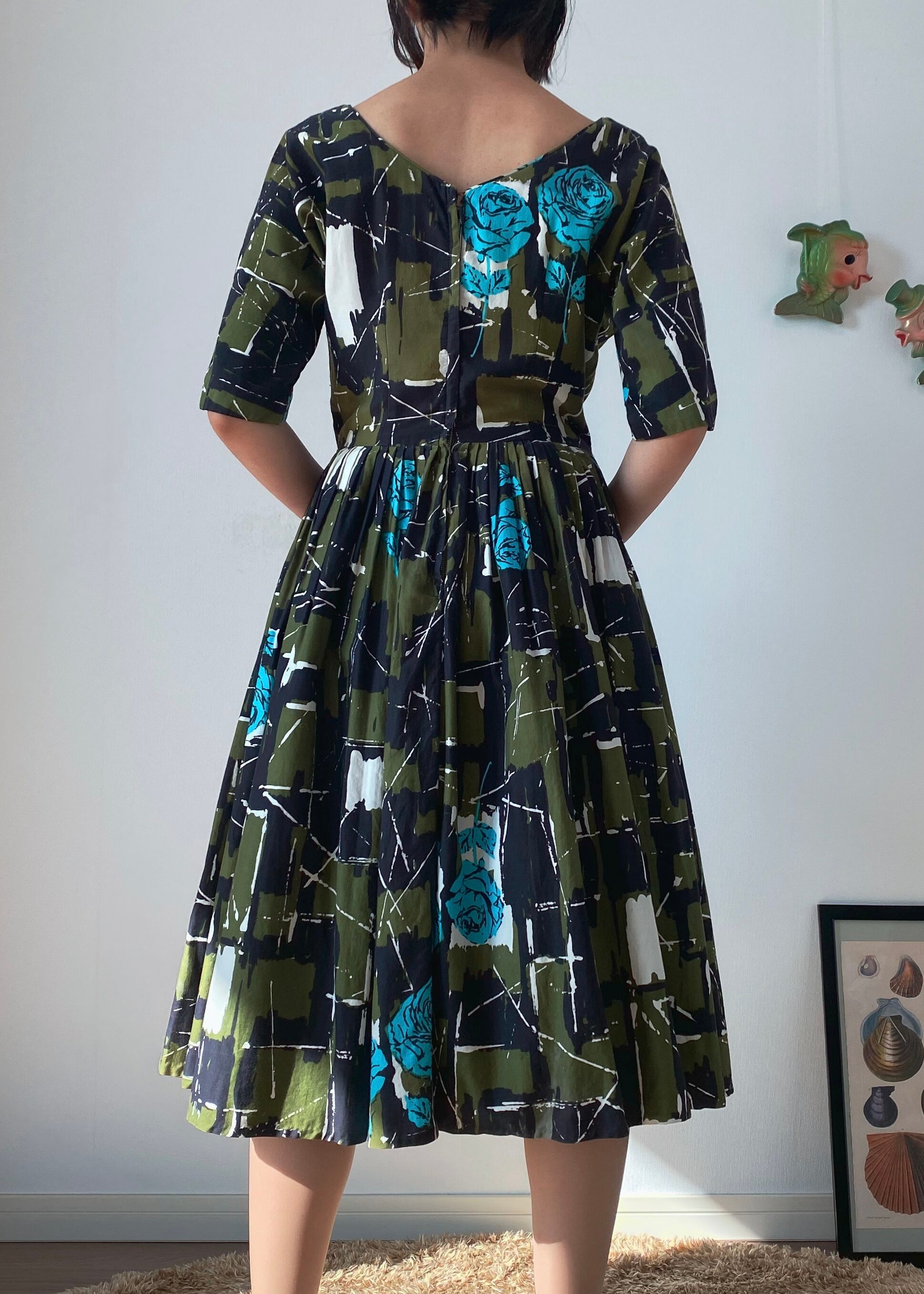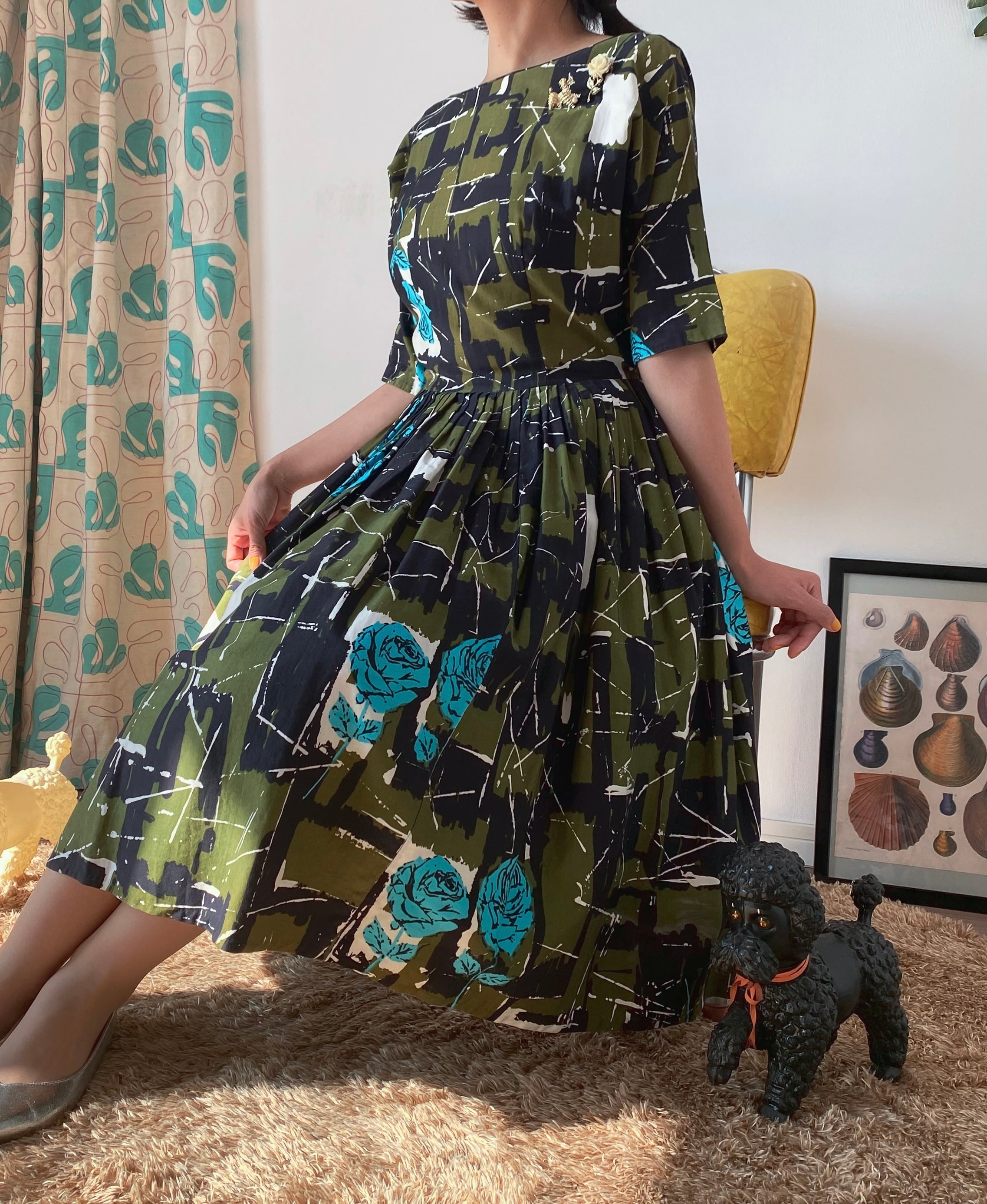 鮮やかブルーのバラが印象的なドルマンスリーブのワンピースです。細かいタックからのたっぷりフレアーが可愛いデザインです。フロントの襟ぐりは浅く、バックは深め、5分袖の印象も慎ましやか。ハンドメイドかと思われます。