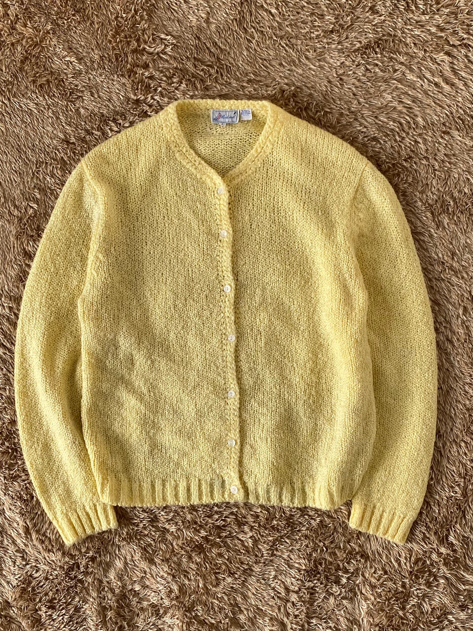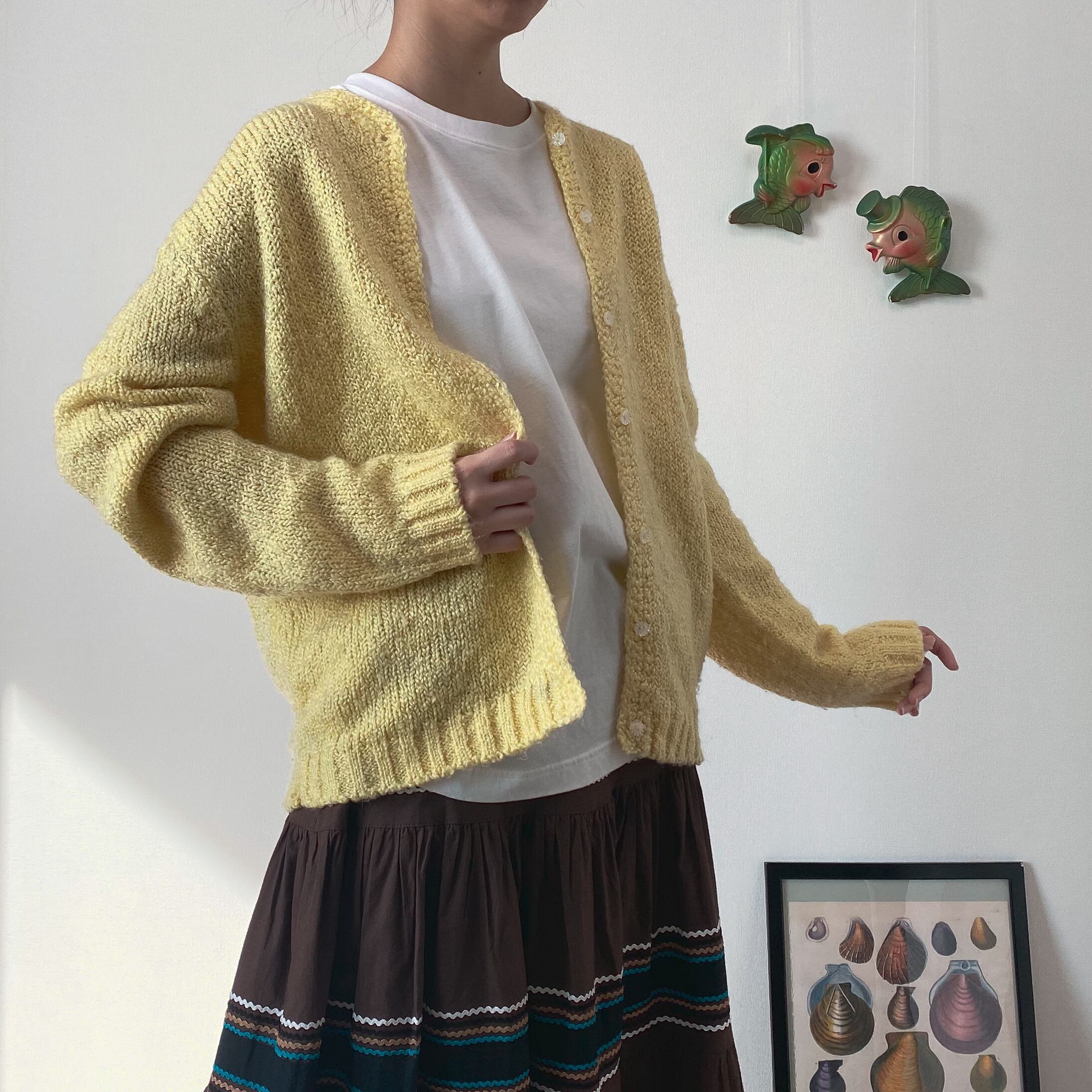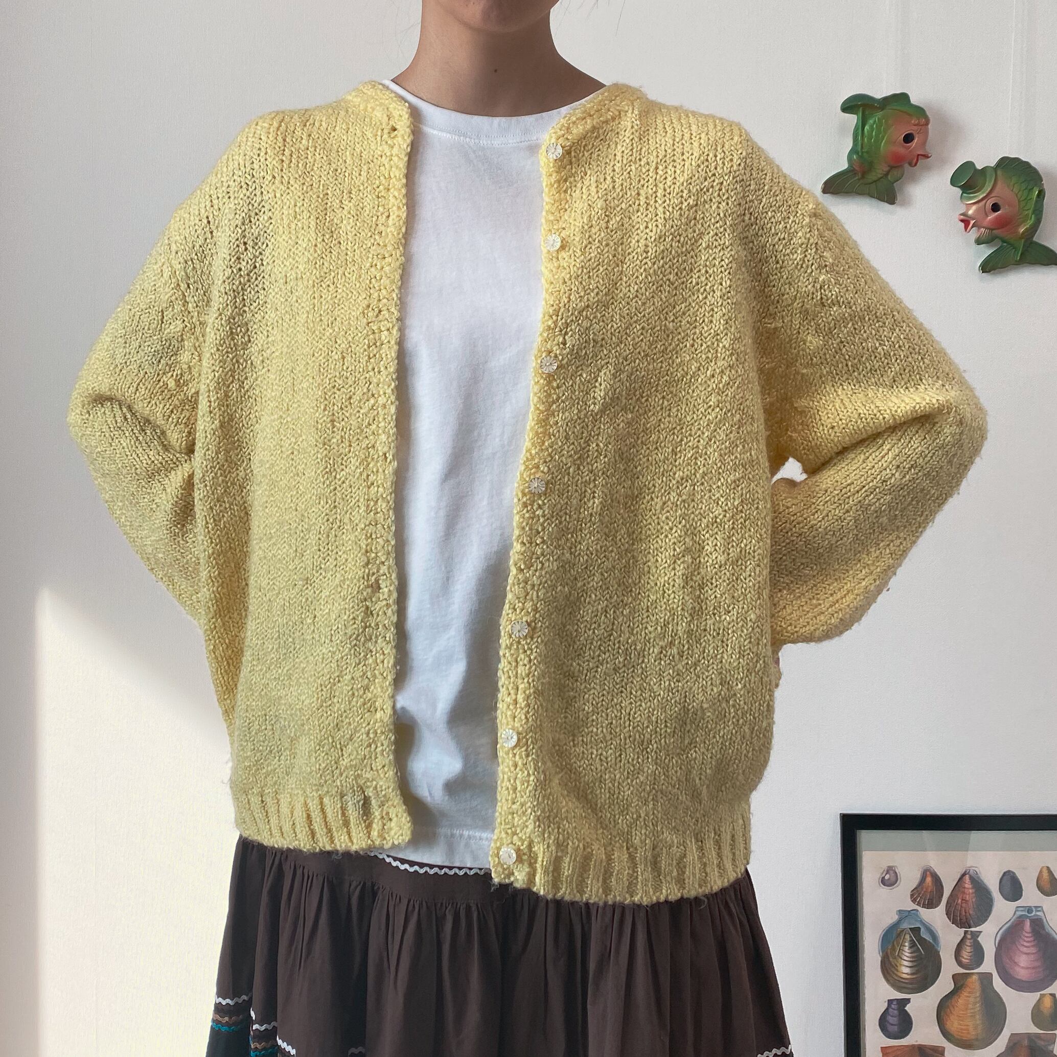 キャンディカラーの黄色いカーディガン。アクリル素材とプラスチックのお花モチーフボタンでおもちゃっぽい可愛さです。大きめボックスシルエットなので着やすいです。