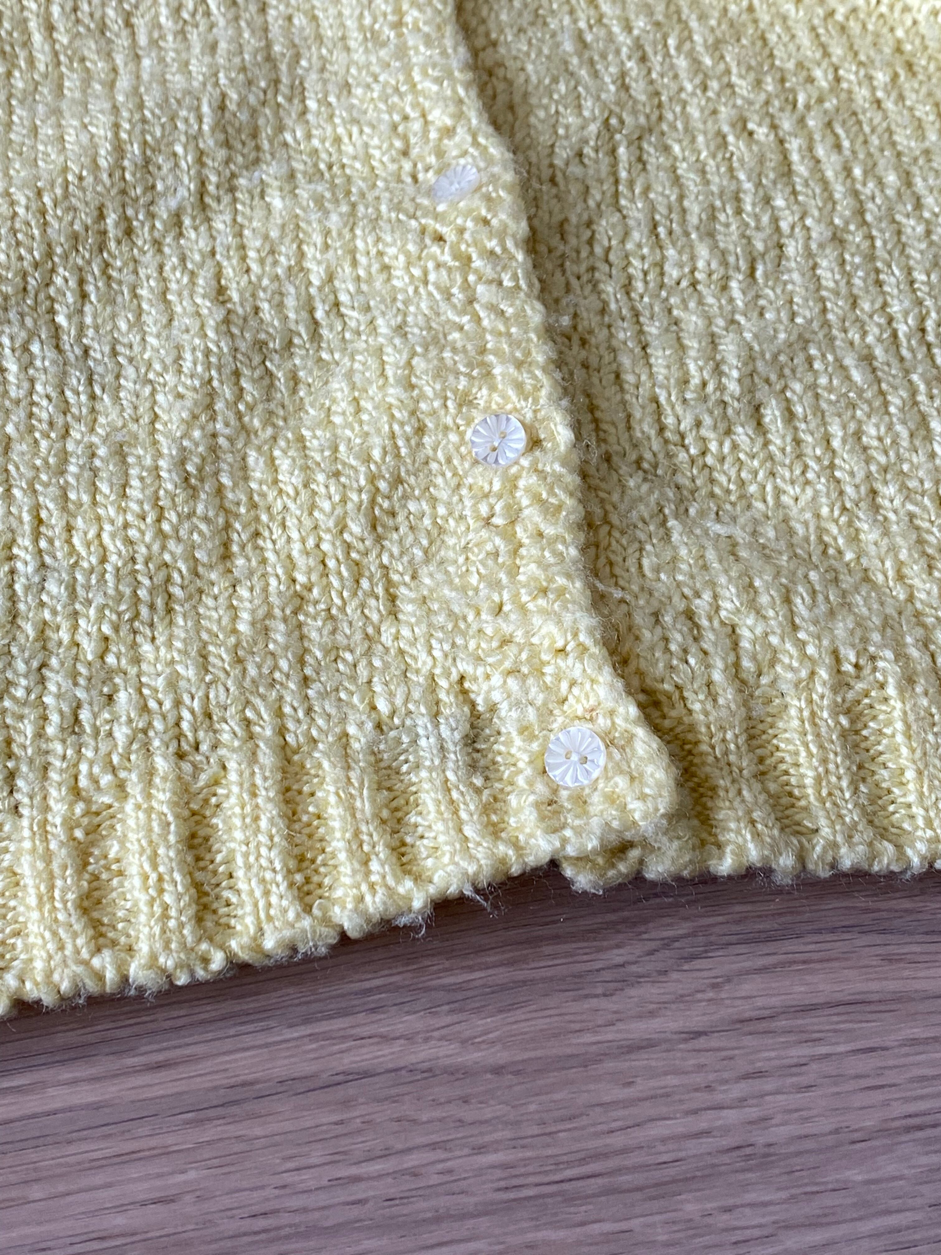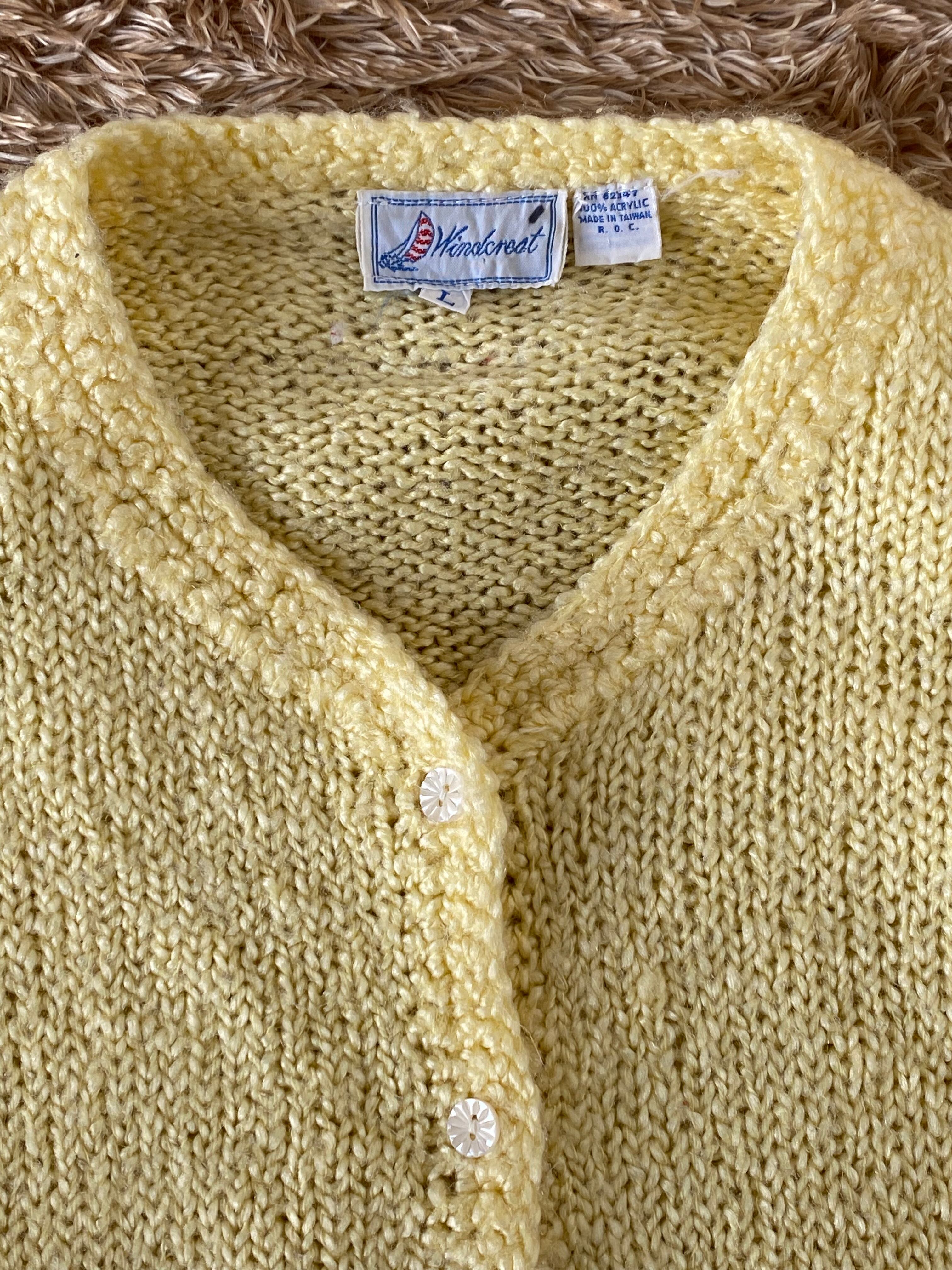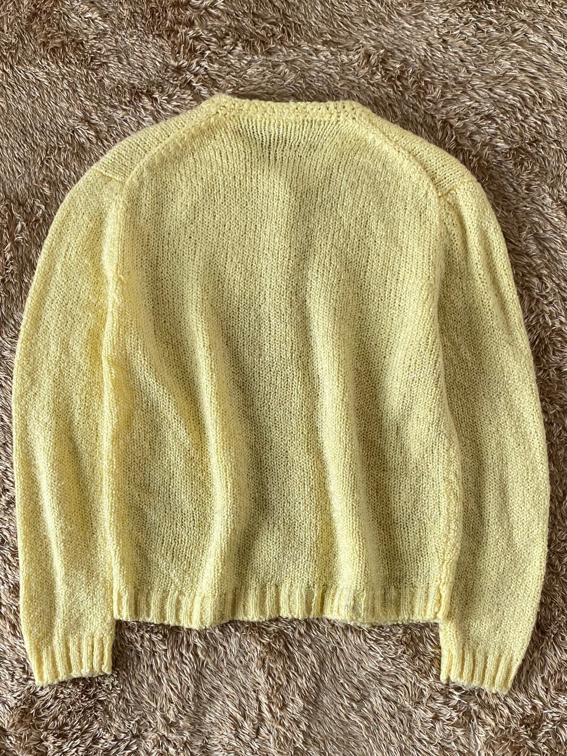 キャンディカラーの黄色いカーディガン。アクリル素材とプラスチックのお花モチーフボタンでおもちゃっぽい可愛さです。大きめボックスシルエットなので着やすいです。