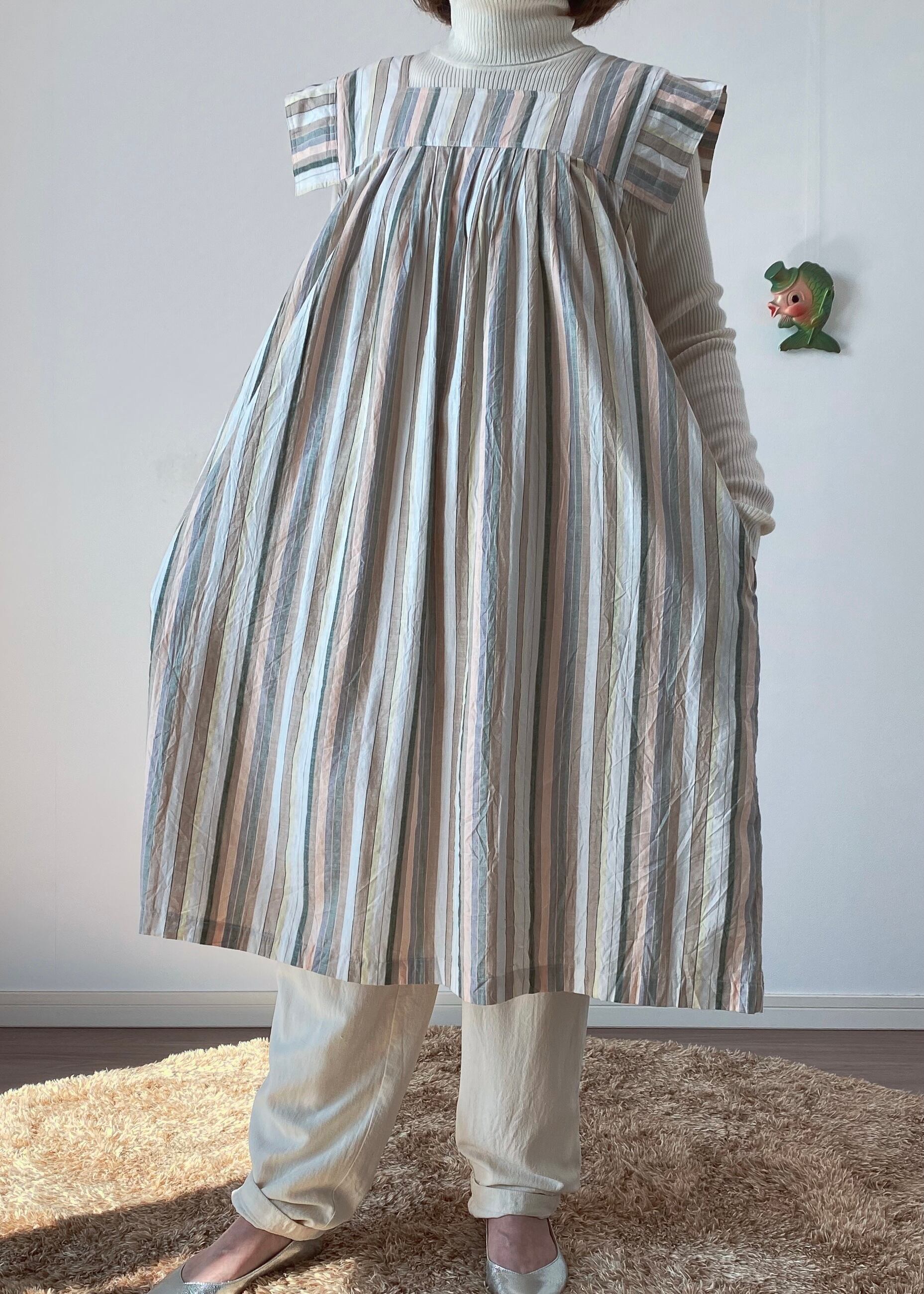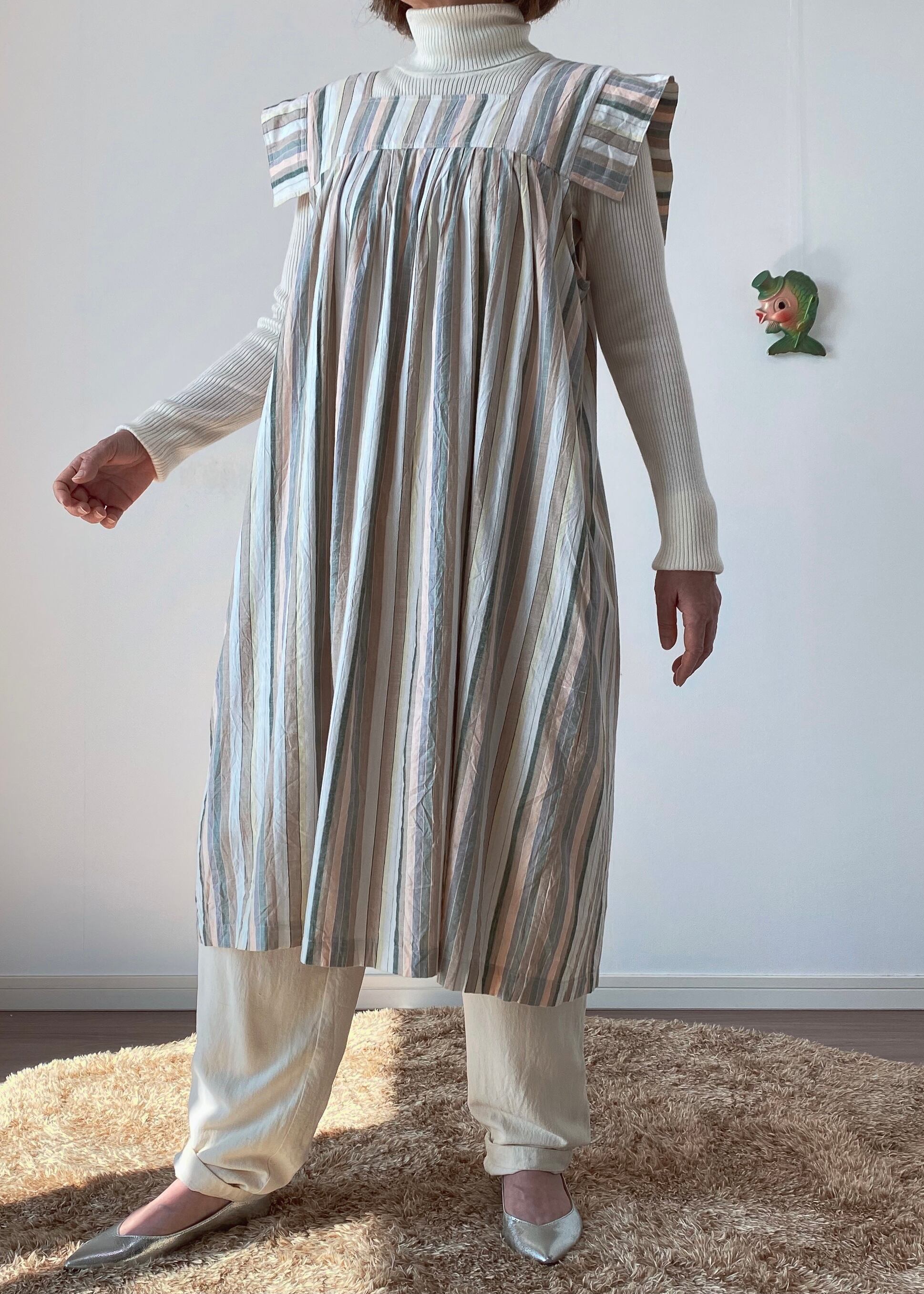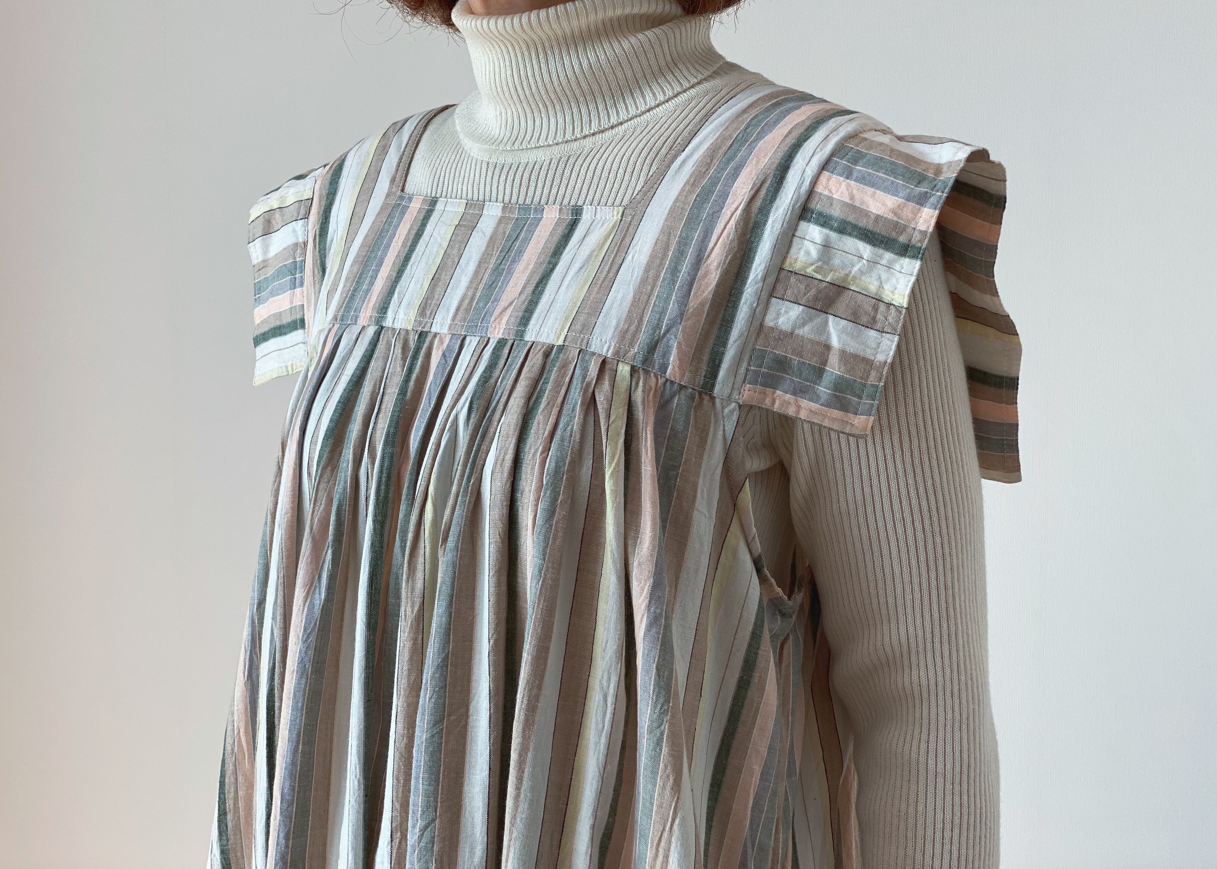 バスト上からのたっぷりギャザー使いのエスニックワンピース。優しい色合いで大人っぽい印象です。アームホールが広めなので、Tシャツやセーターなど季節を問わずレイヤードスタイルが楽しめます。