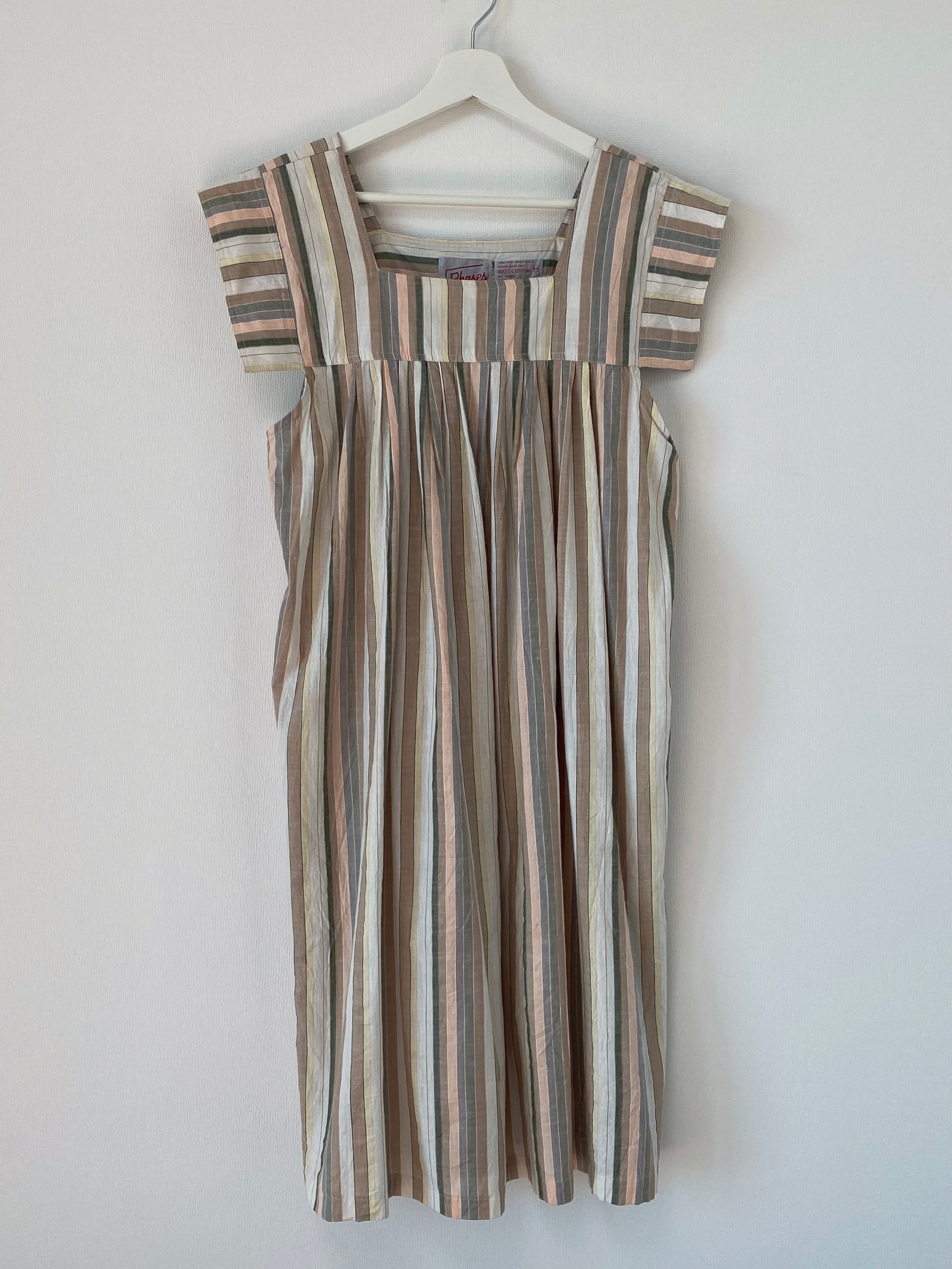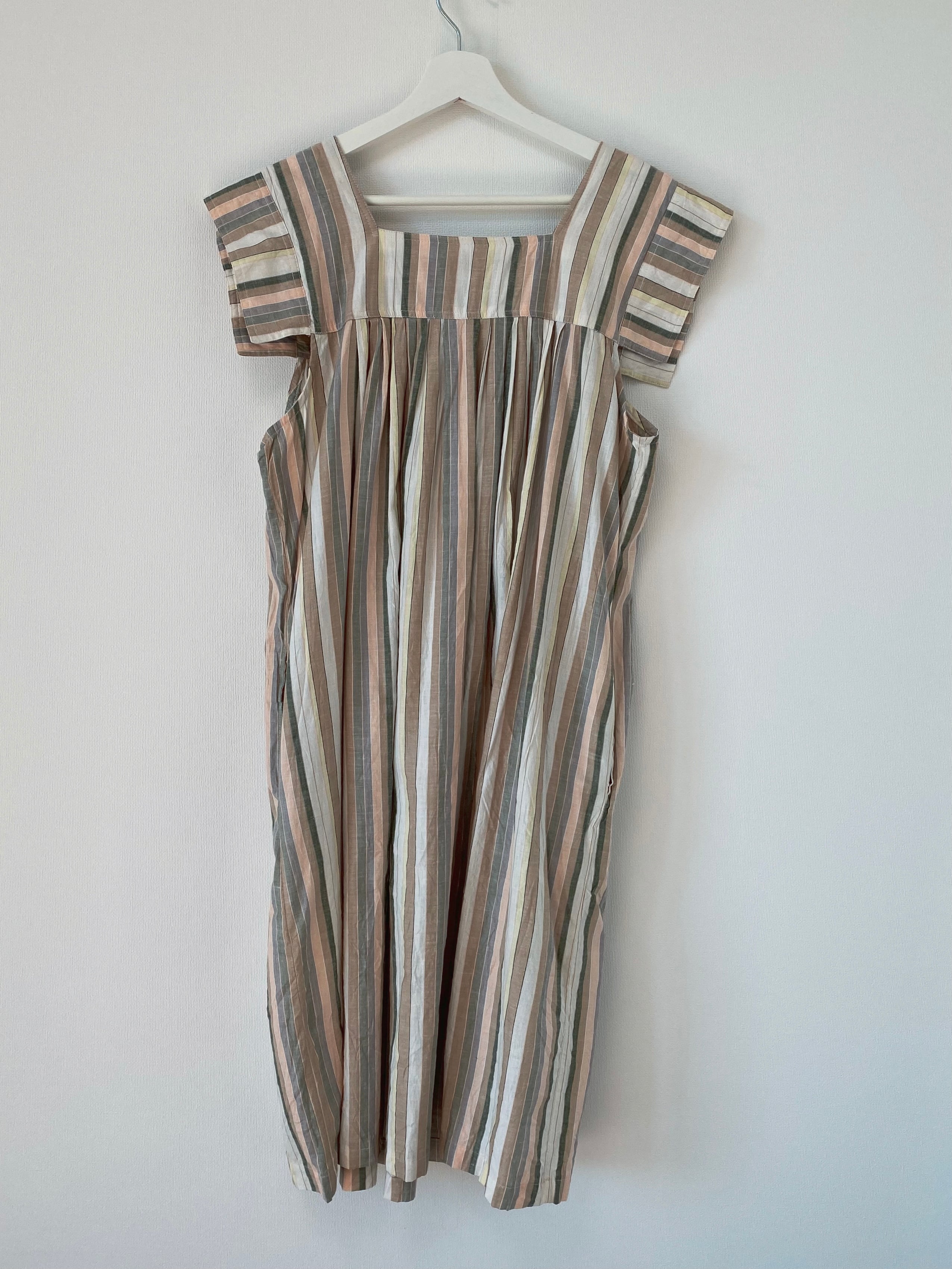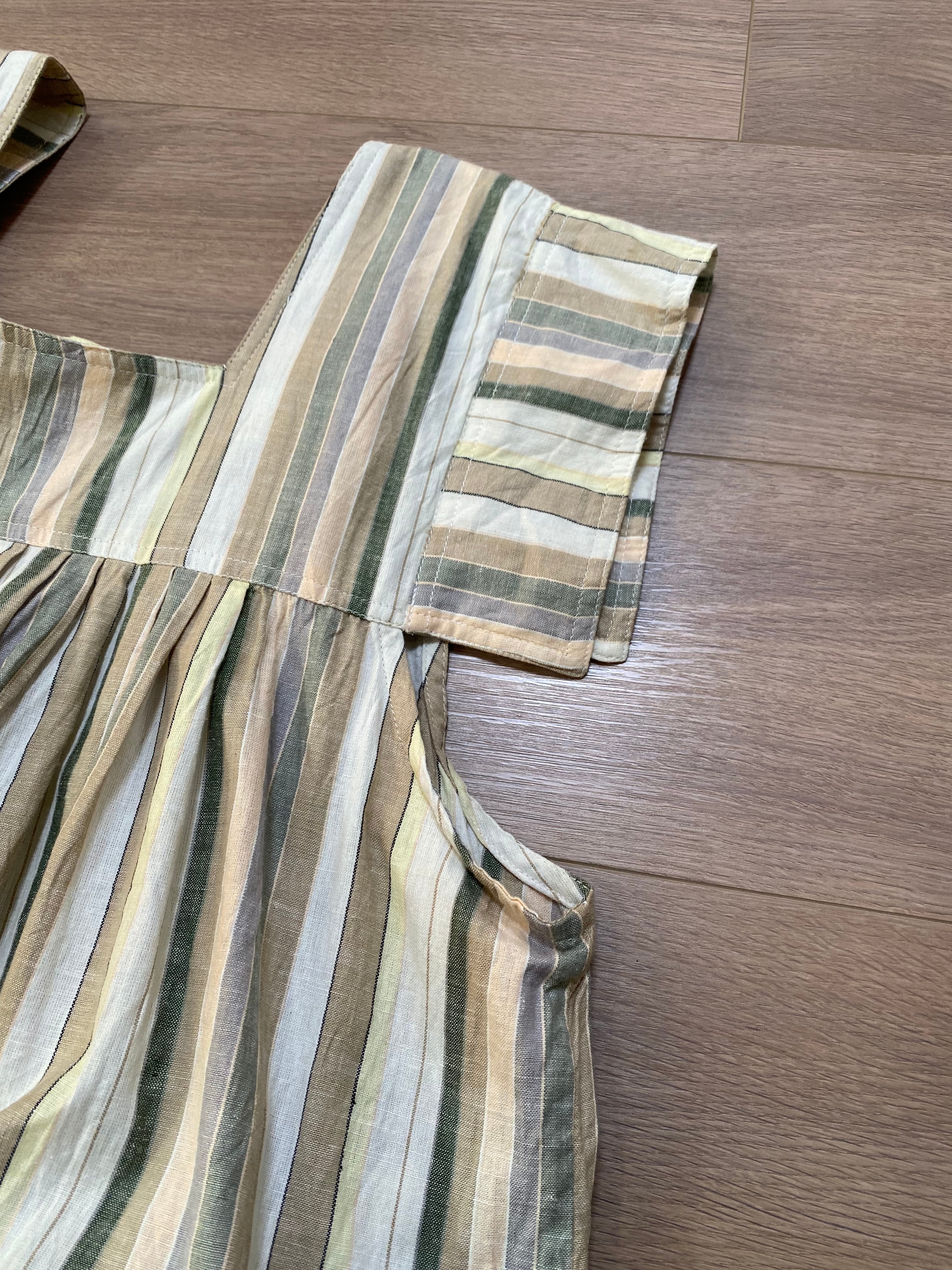 バスト上からのたっぷりギャザー使いのエスニックワンピース。優しい色合いで大人っぽい印象です。アームホールが広めなので、Tシャツやセーターなど季節を問わずレイヤードスタイルが楽しめます。