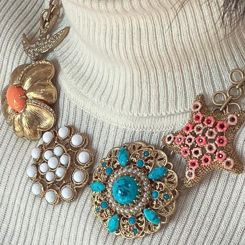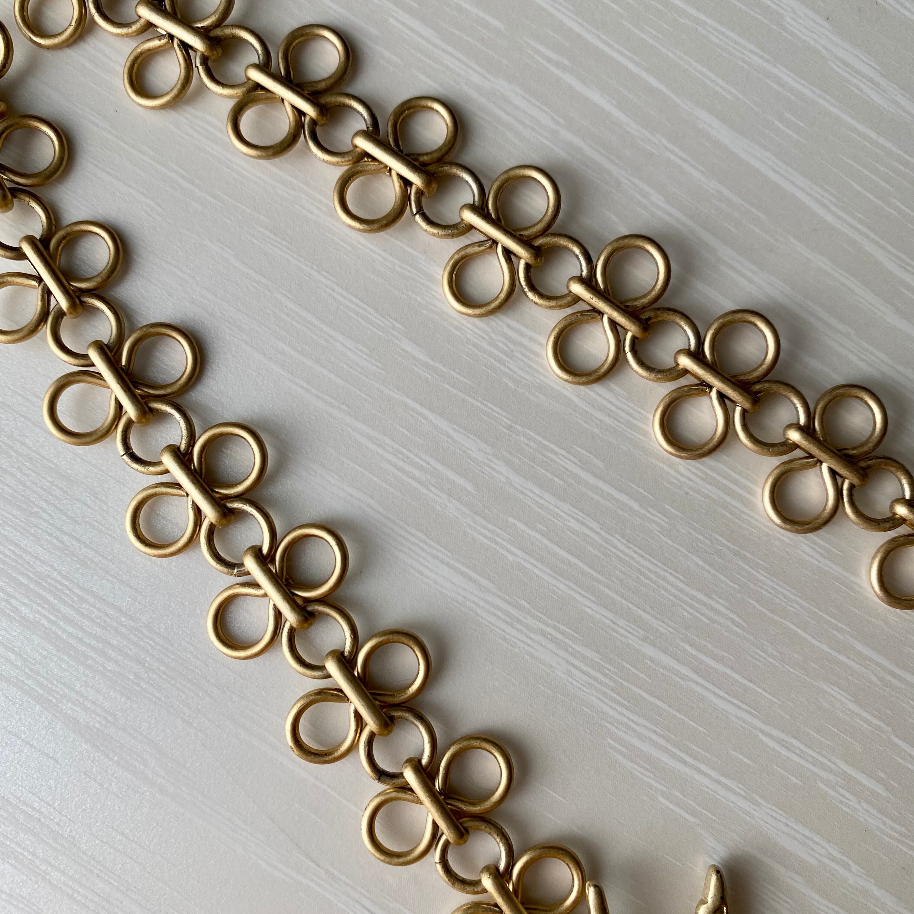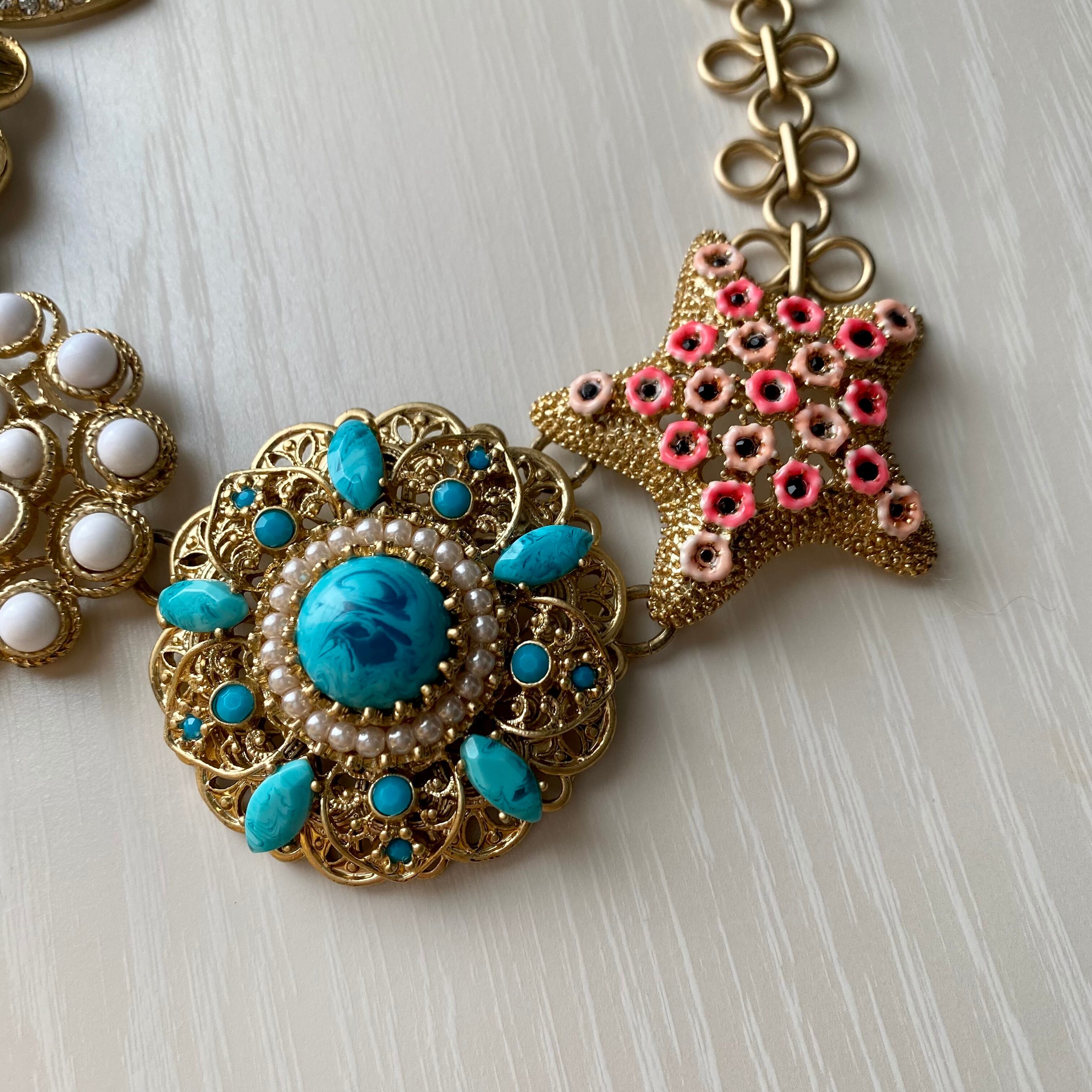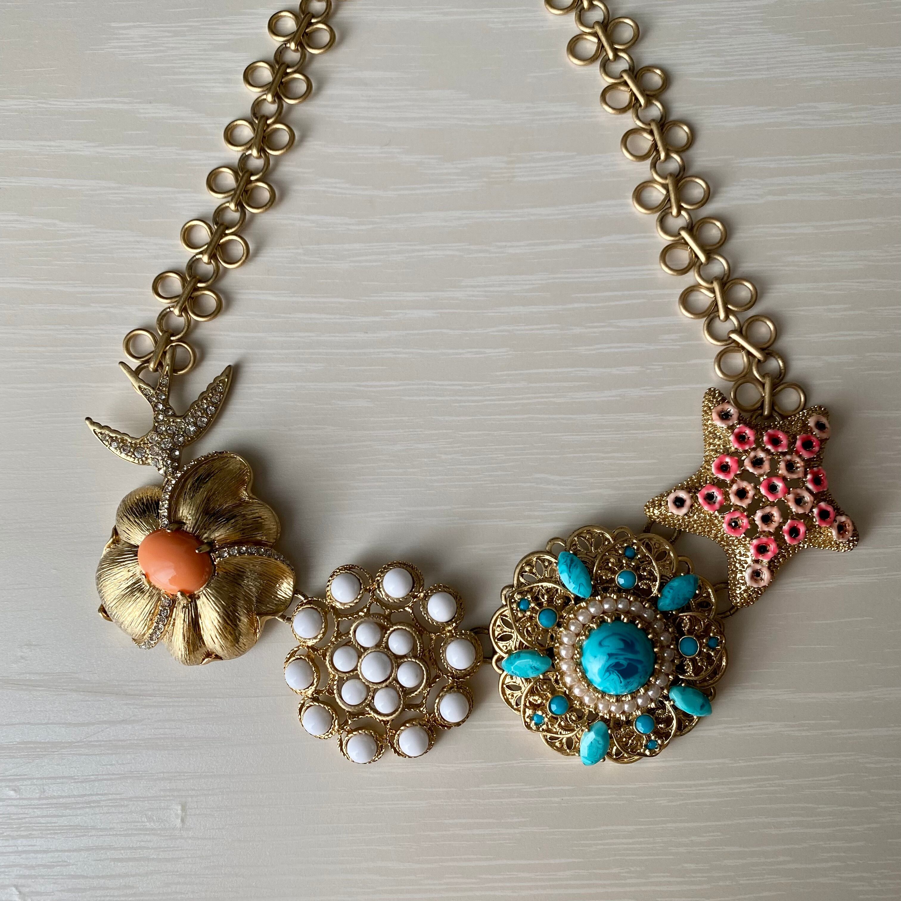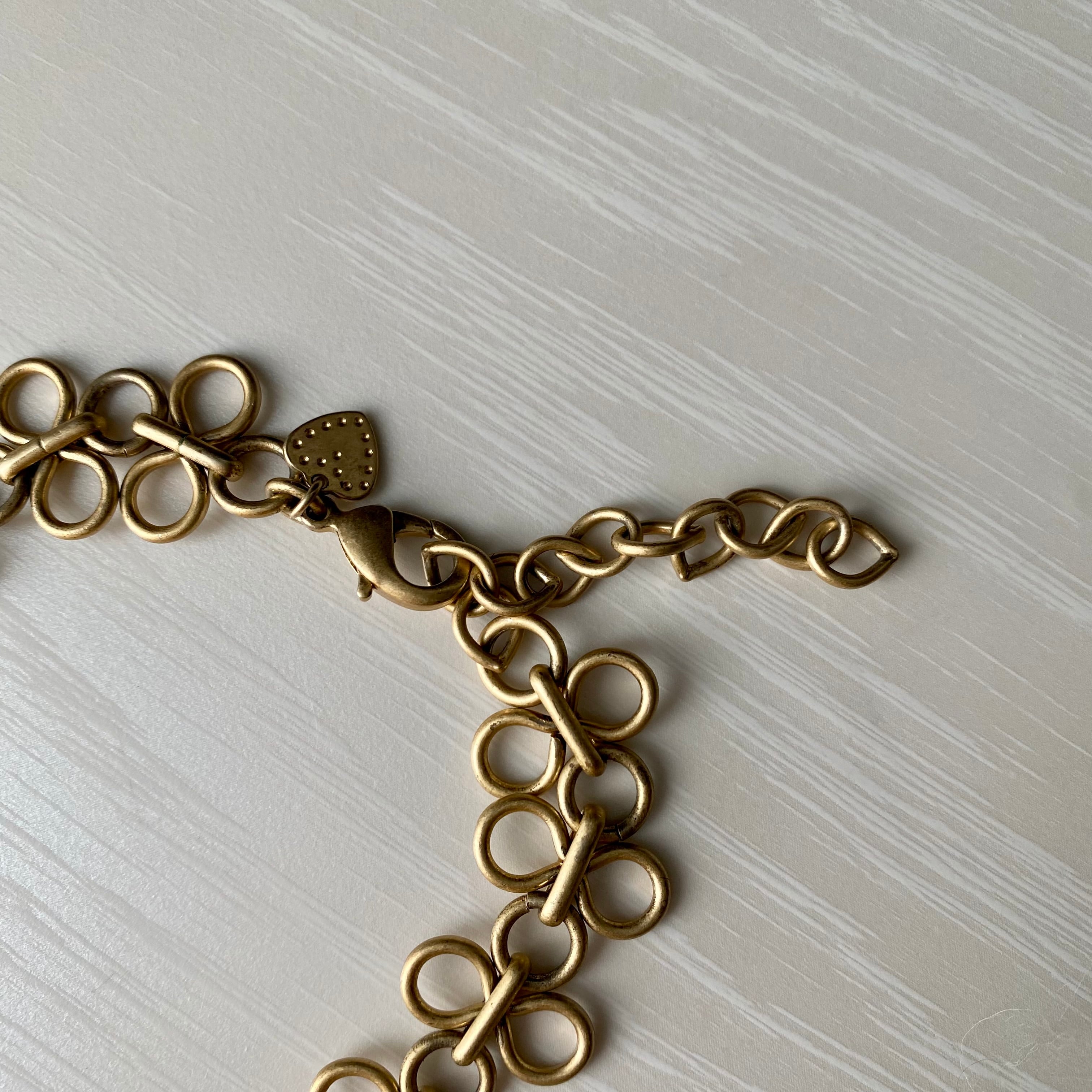 大きな5つのモチーフが連なったネックレス。個性的なモチーフはひとつひとつがとても可愛いくチェーンも個性的。シンプルなTシャツやセーターに合わせるだけでグッと華やかな印象になります。