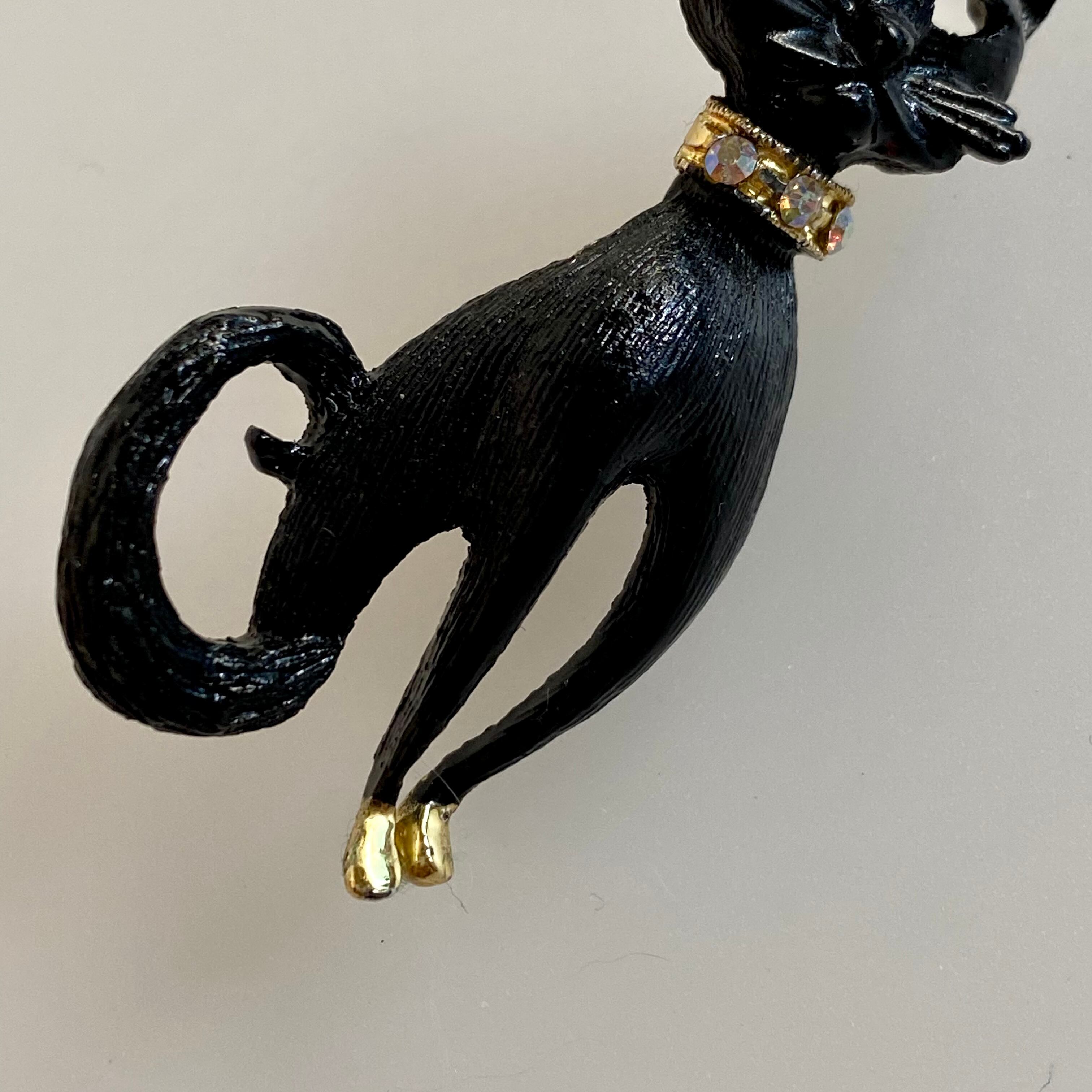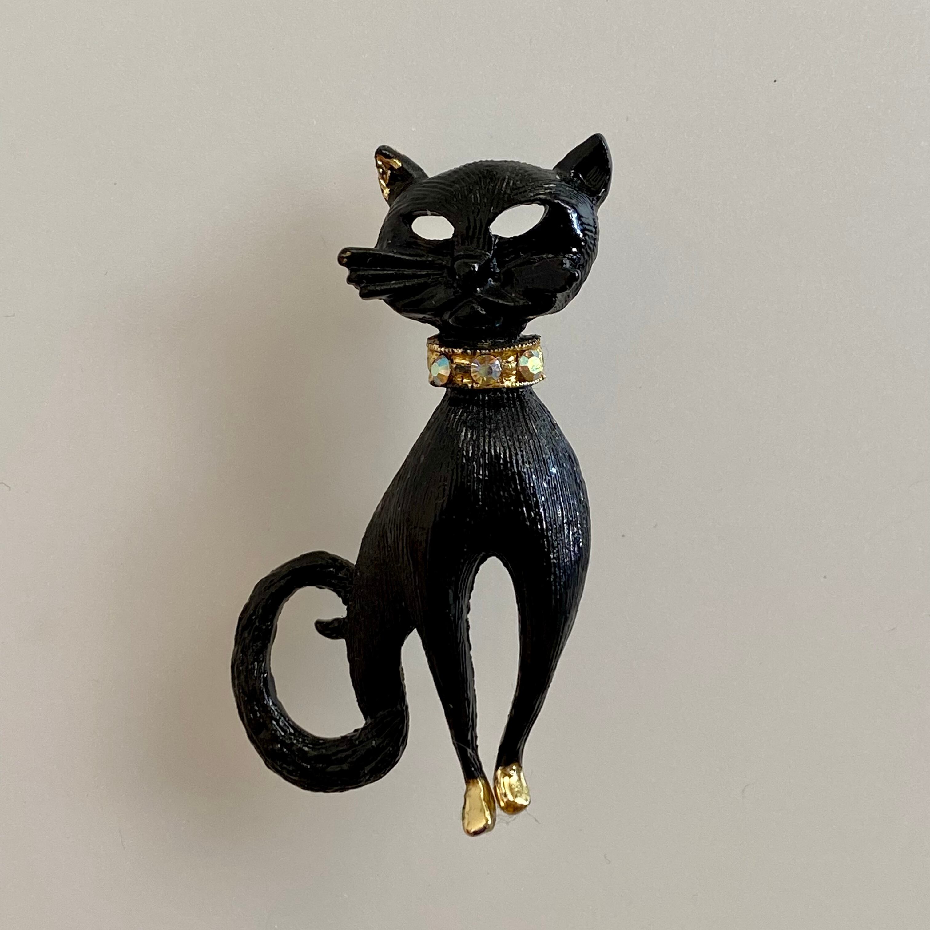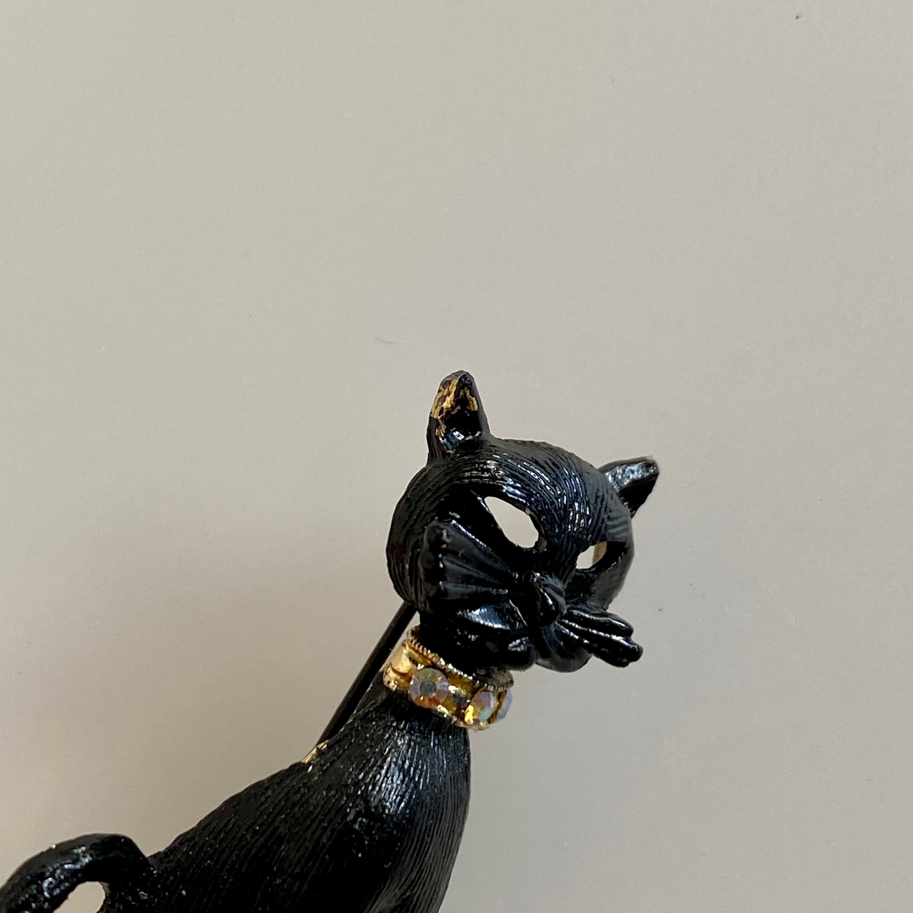 オーロララインストーンの首輪をした黒猫ちゃん。足はゴールドでソックスネコちゃんのデザインです。姿勢良く座る姿と目がホールなのもクールな印象。右耳のメッキが禿げていますが可愛いです。