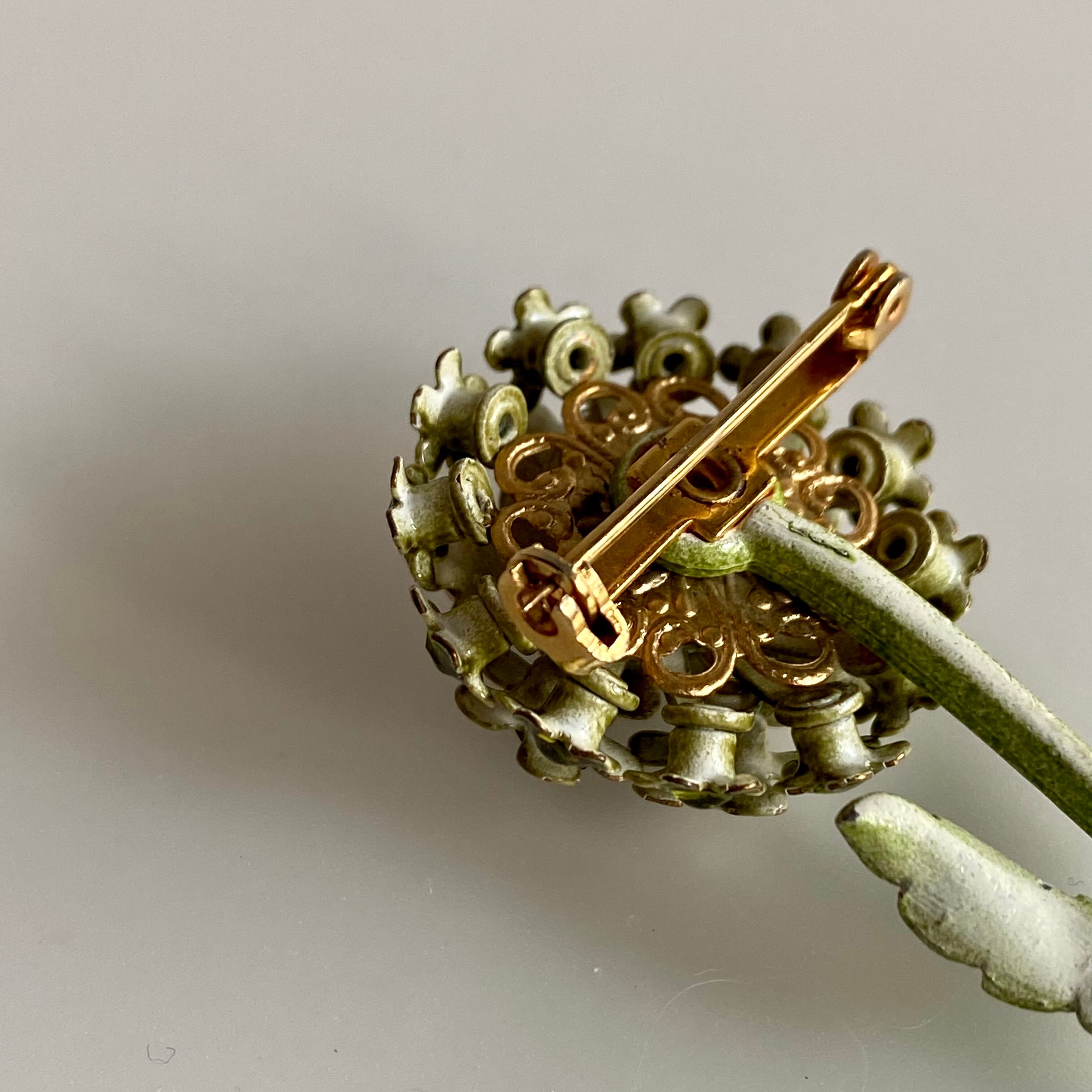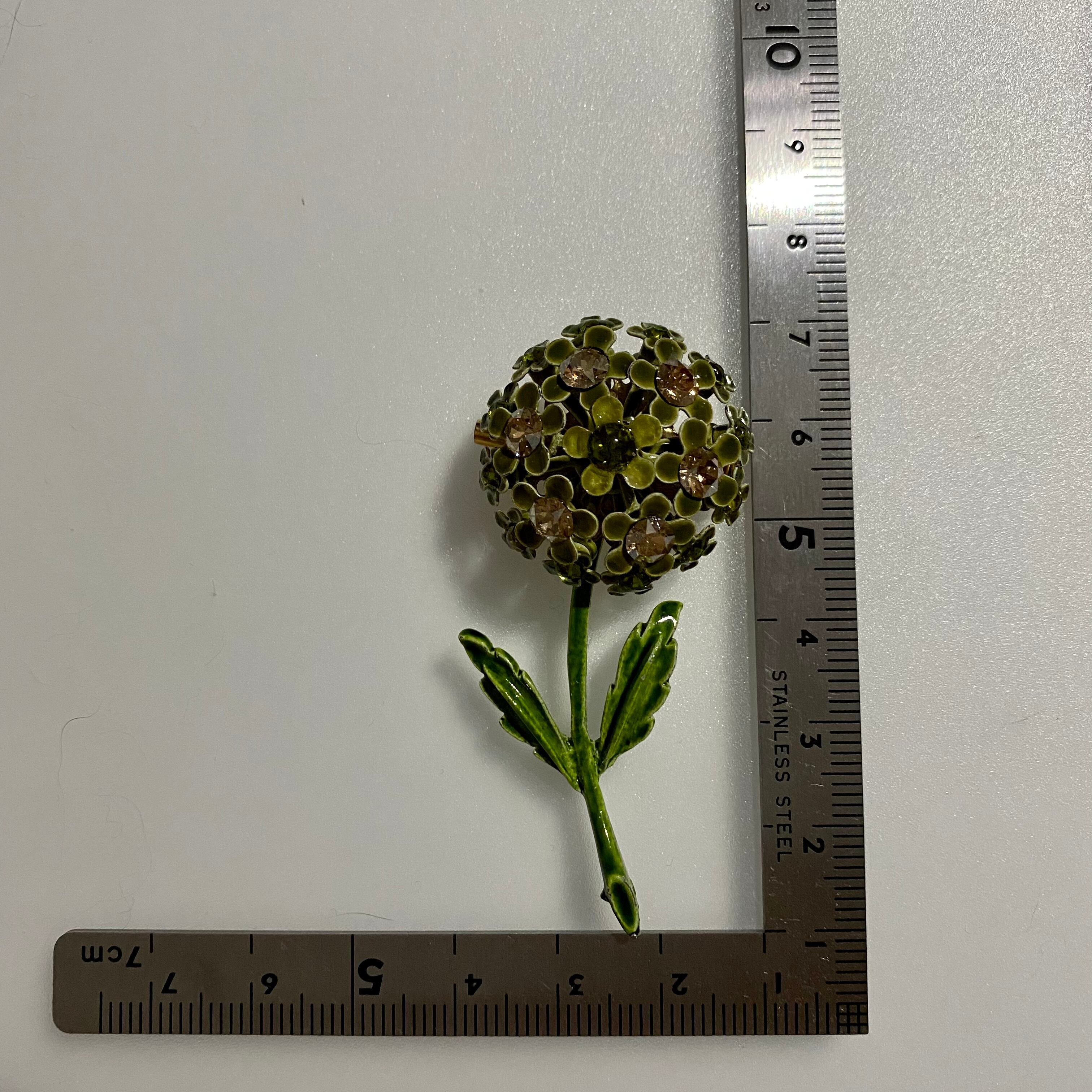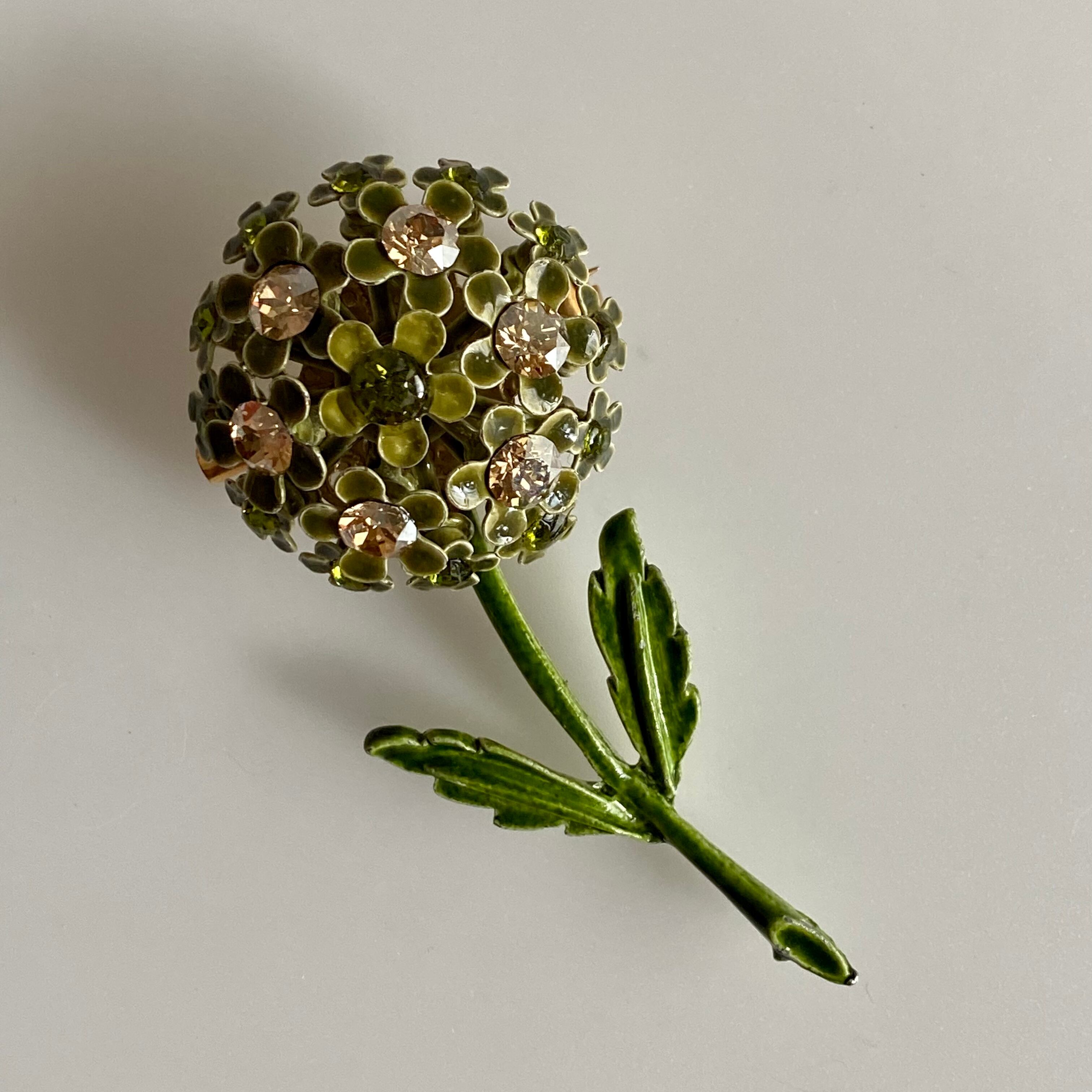 コロンと丸いフォルムのフラワーブローチ。サイズ違いのお花達はモチーフの真ん中にグリーンとベージュのラインストーンがそれぞれ付いています。ドイツ製らしい繊細なデザインです。グリーンのワントーンなので、お花でも甘すぎない印象のお品です。