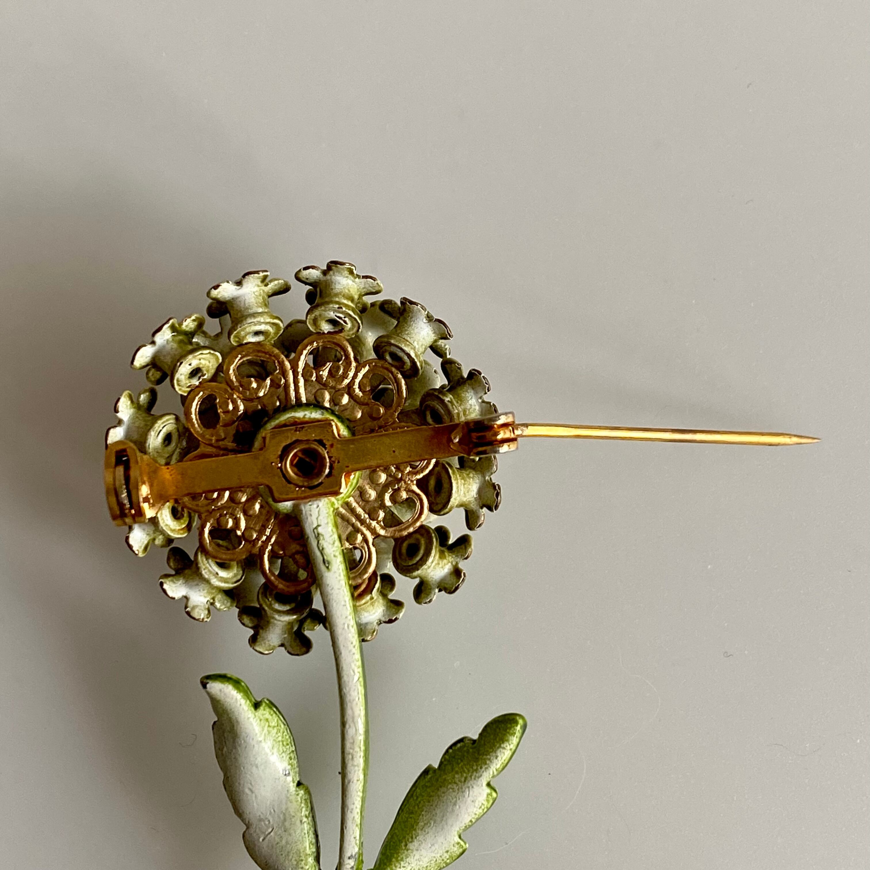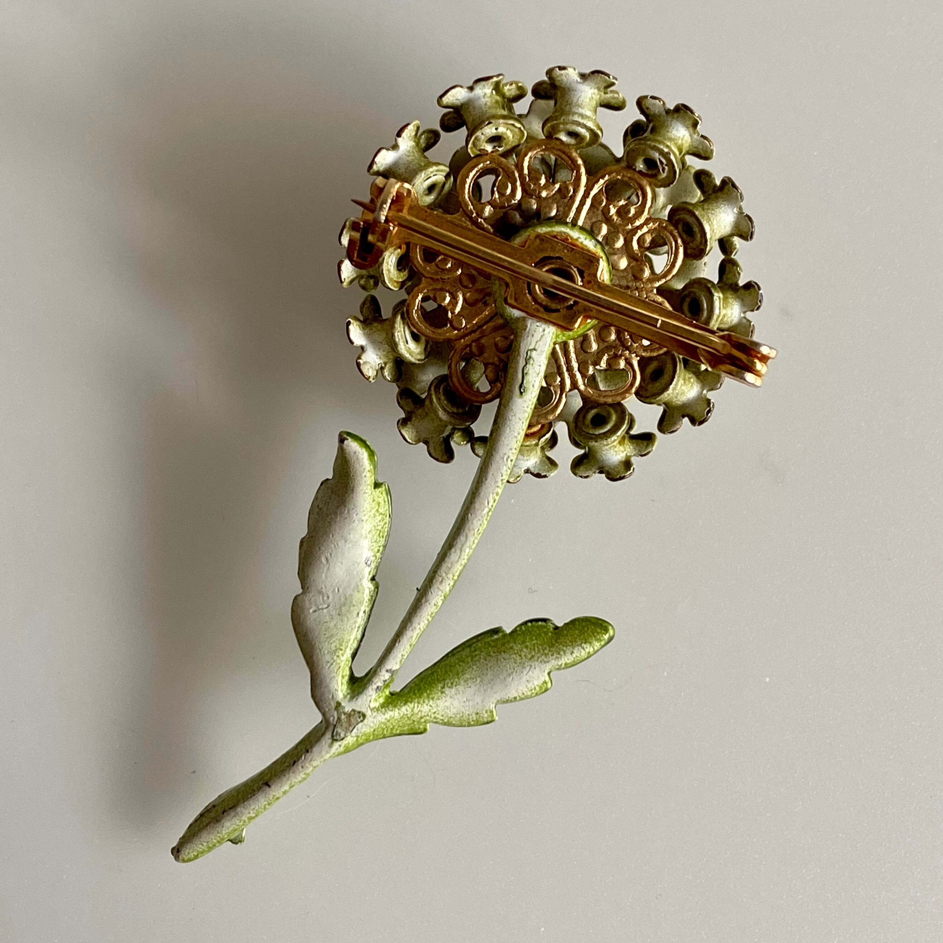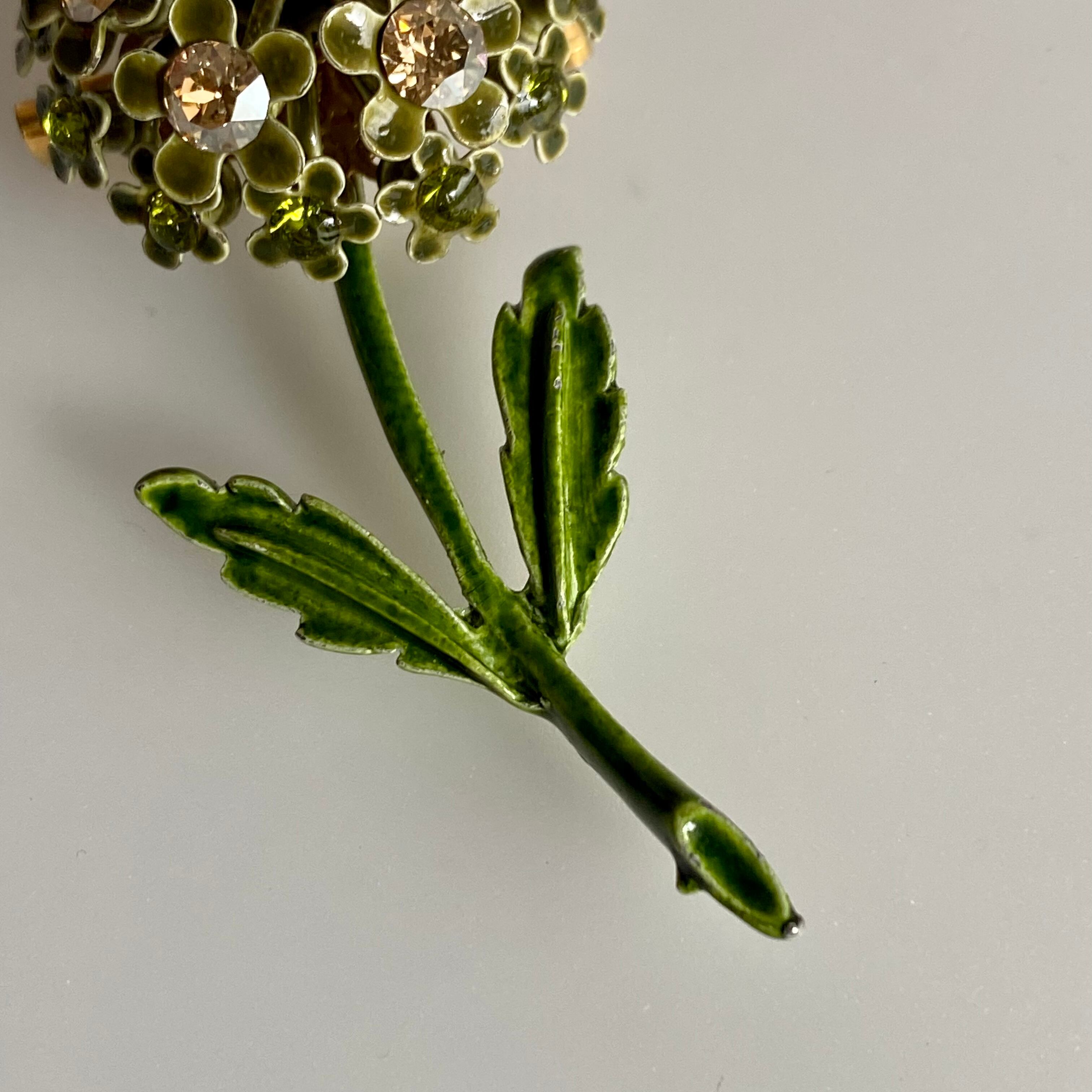 コロンと丸いフォルムのフラワーブローチ。サイズ違いのお花達はモチーフの真ん中にグリーンとベージュのラインストーンがそれぞれ付いています。ドイツ製らしい繊細なデザインです。グリーンのワントーンなので、お花でも甘すぎない印象のお品です。