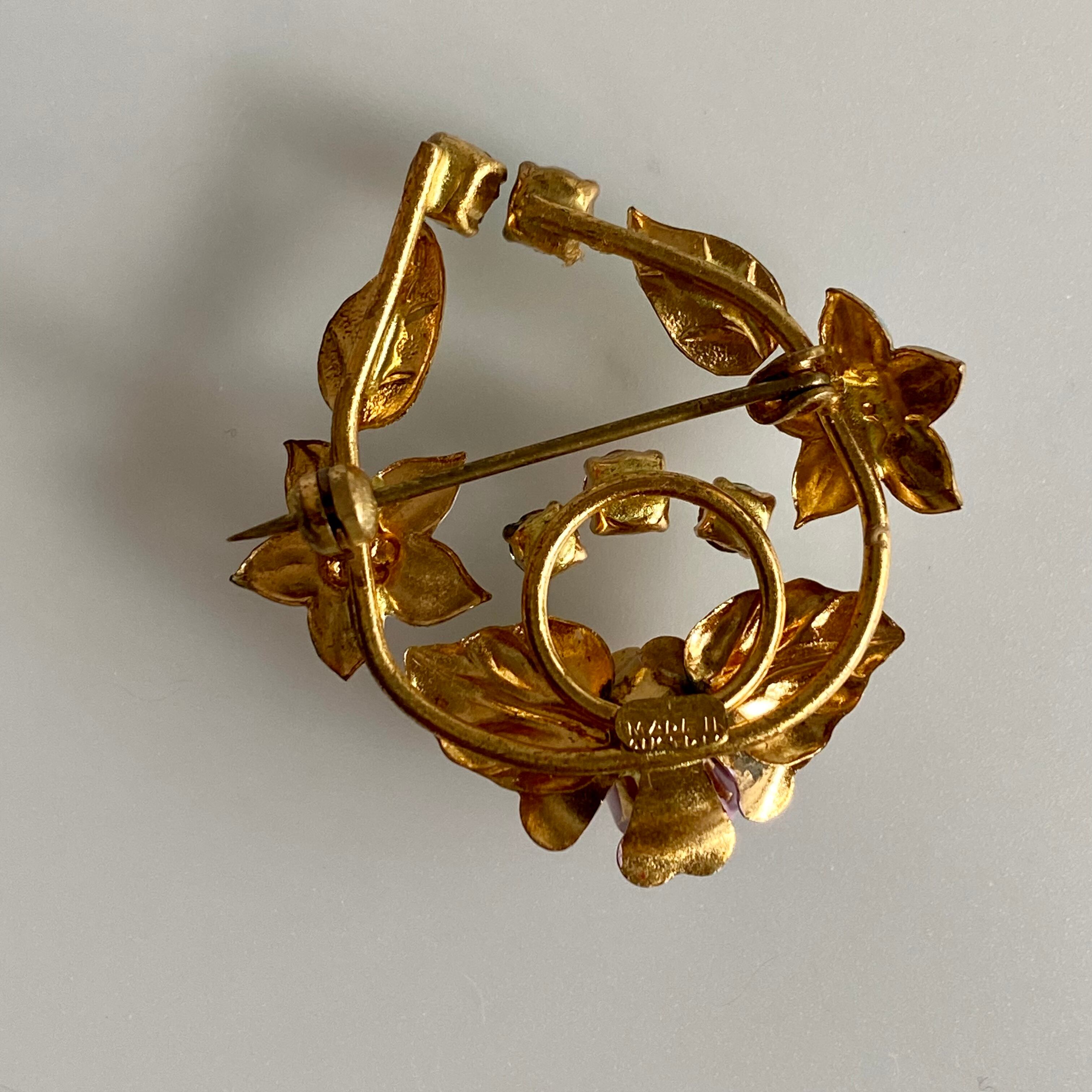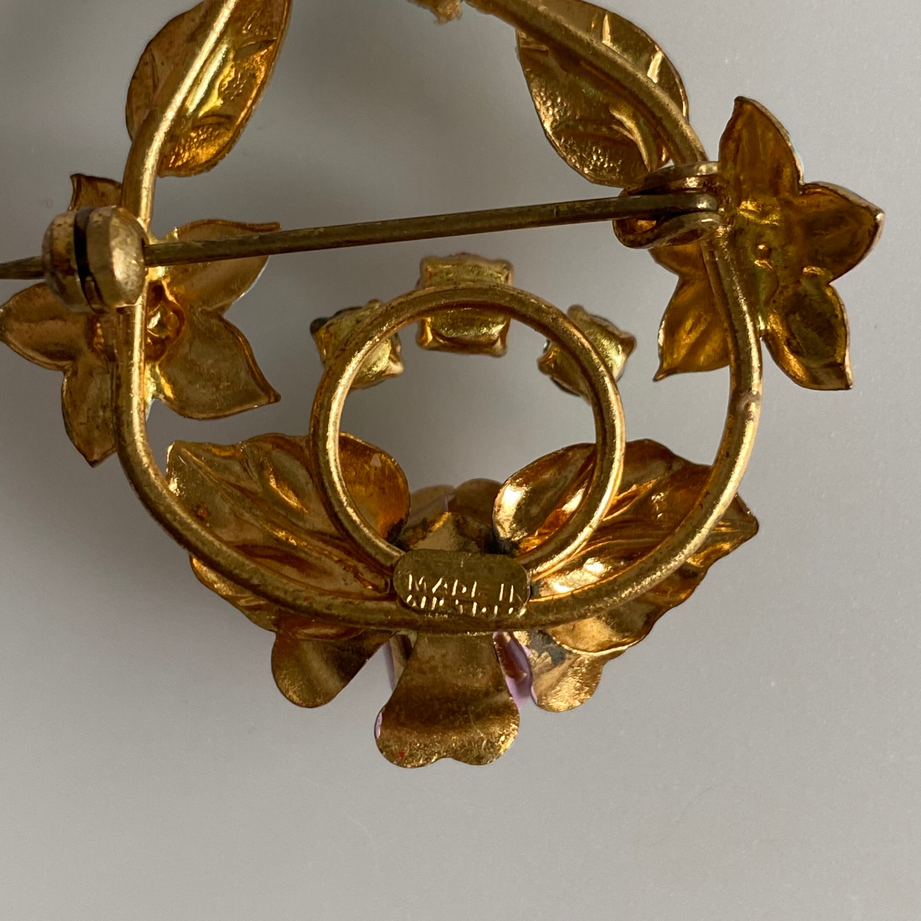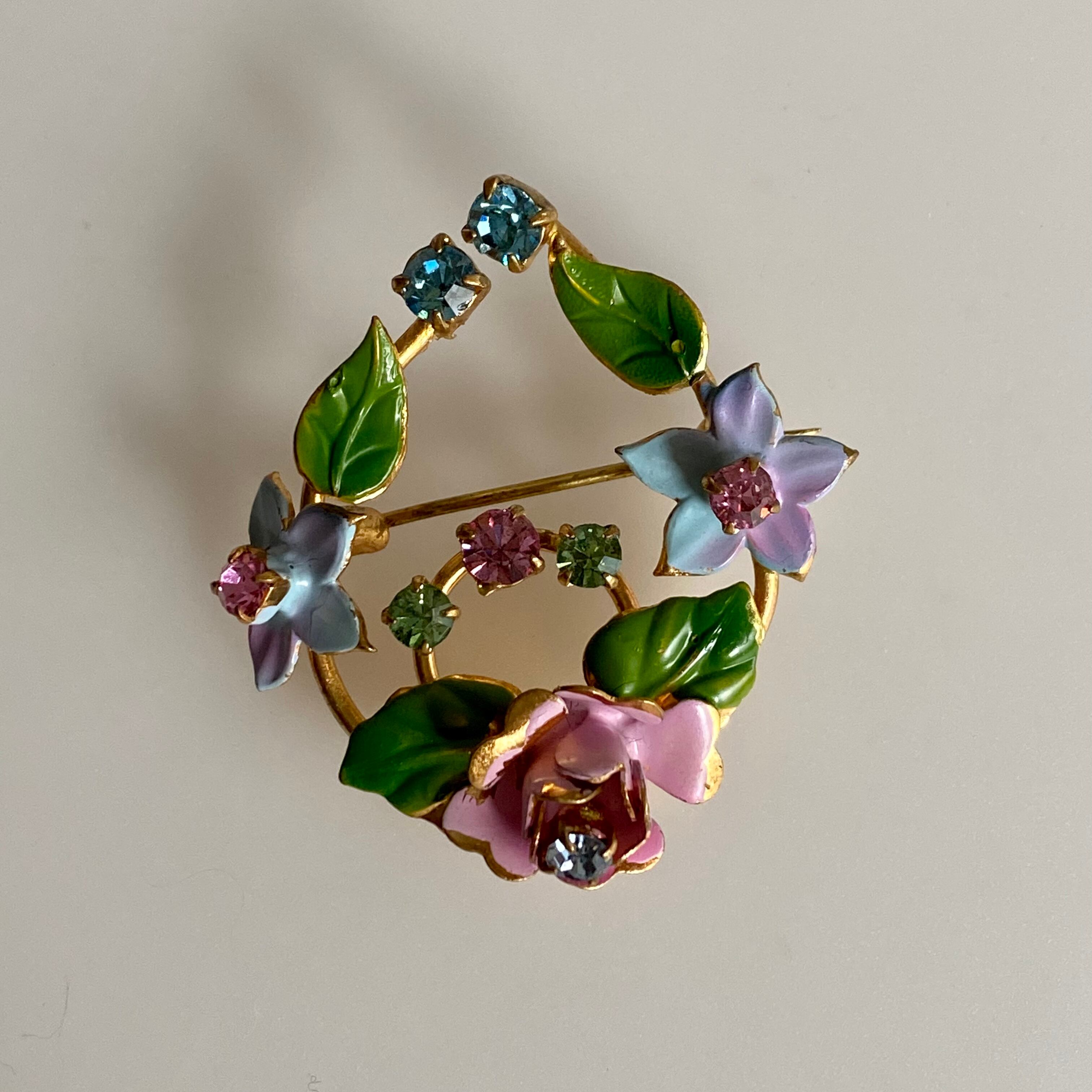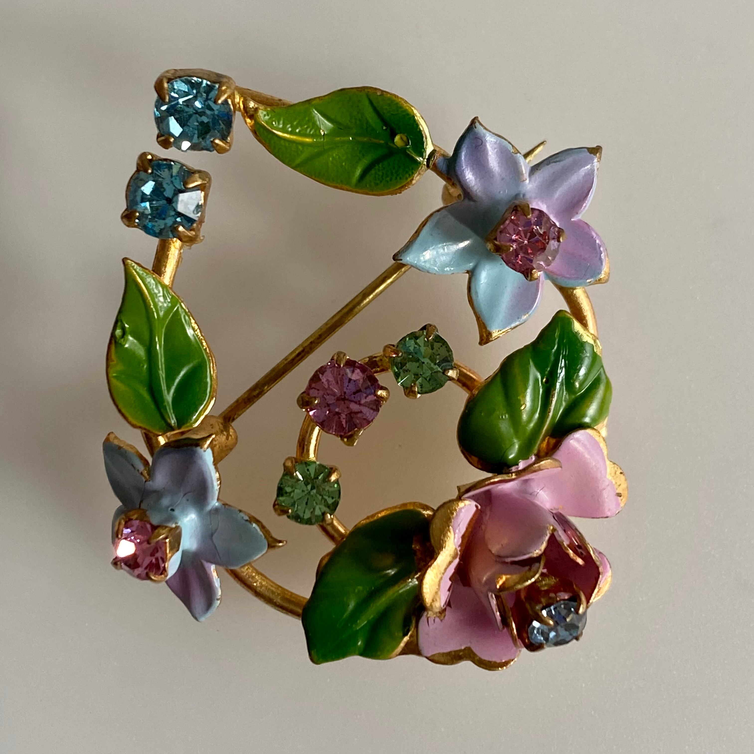 ラインストーンの色と配置が絶妙なお花のブローチ。新緑を思わせるリーフの色、グラデーションカラーの左右のお花などオーストリアの古城に咲く花のような繊細なデザインのお品です。