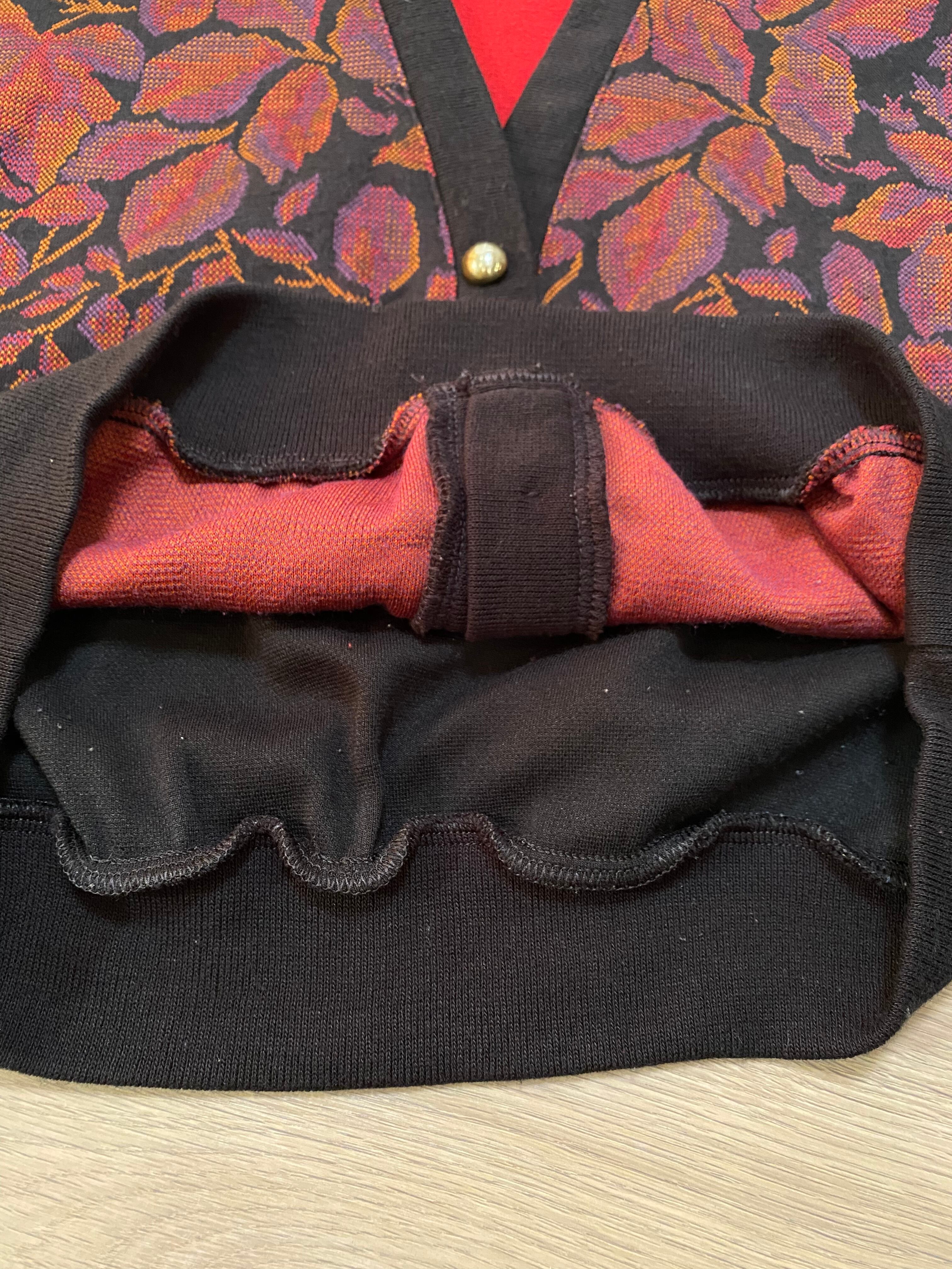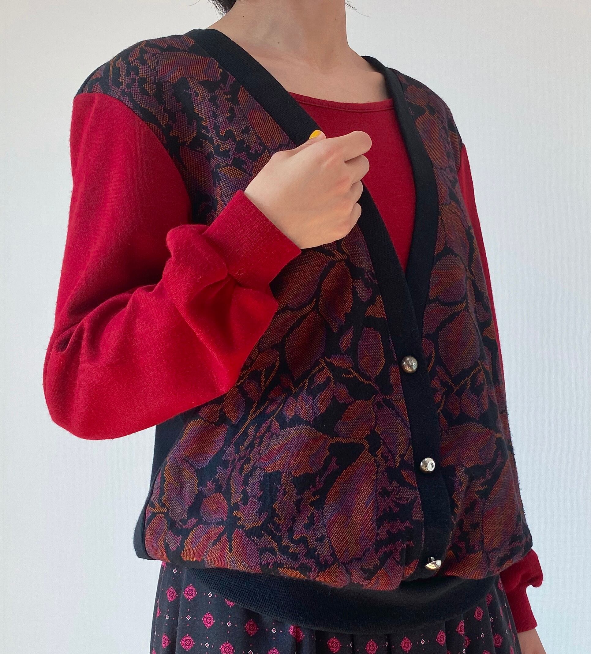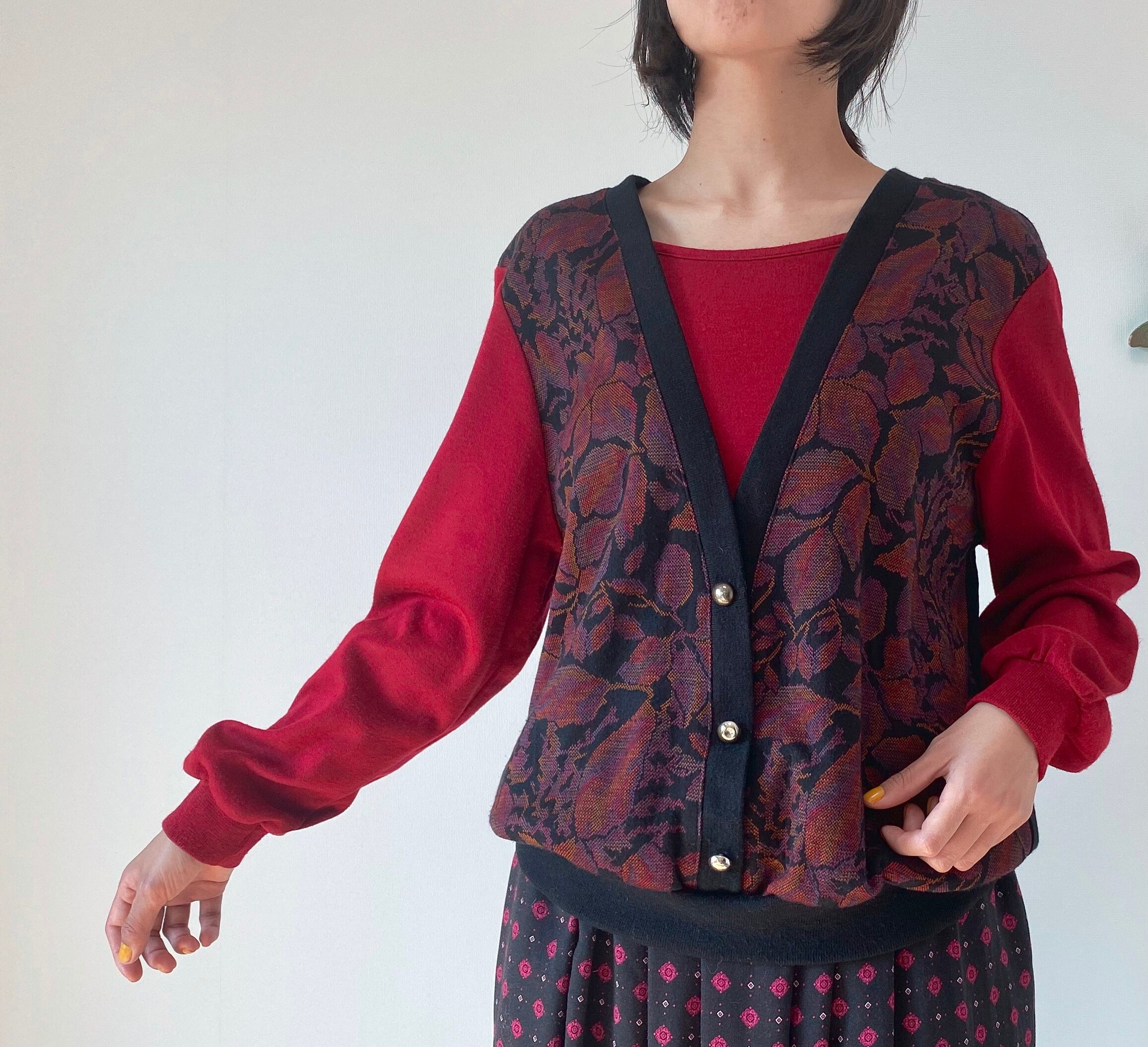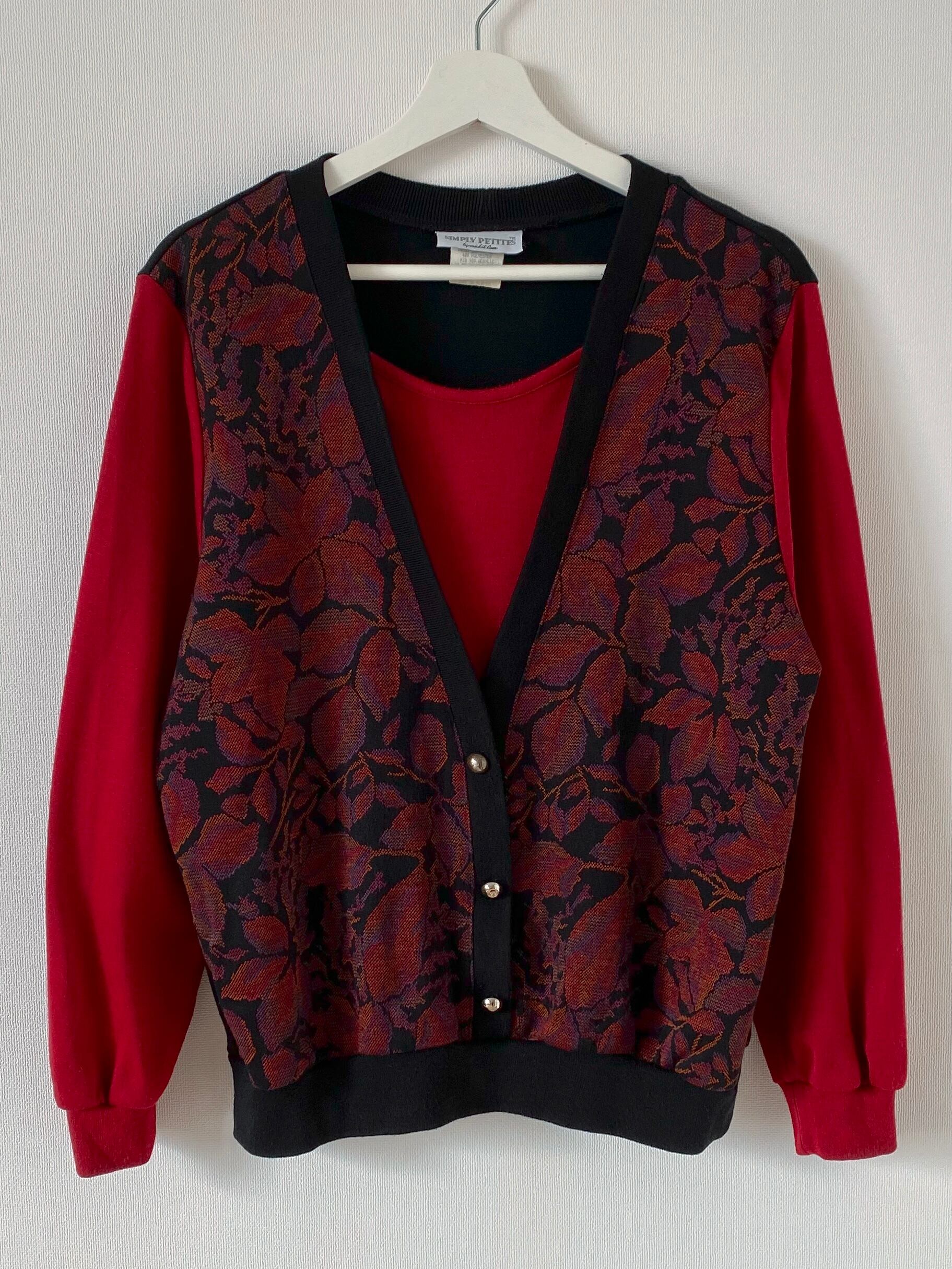 ベストの重ね着風ロンT。リーフ柄のゴブラン風ベスト(に見える)がエンジ色なので赤いお袖もマイルドに。バックは無地の黒。裾リブなので着るだけでOKなお品です。