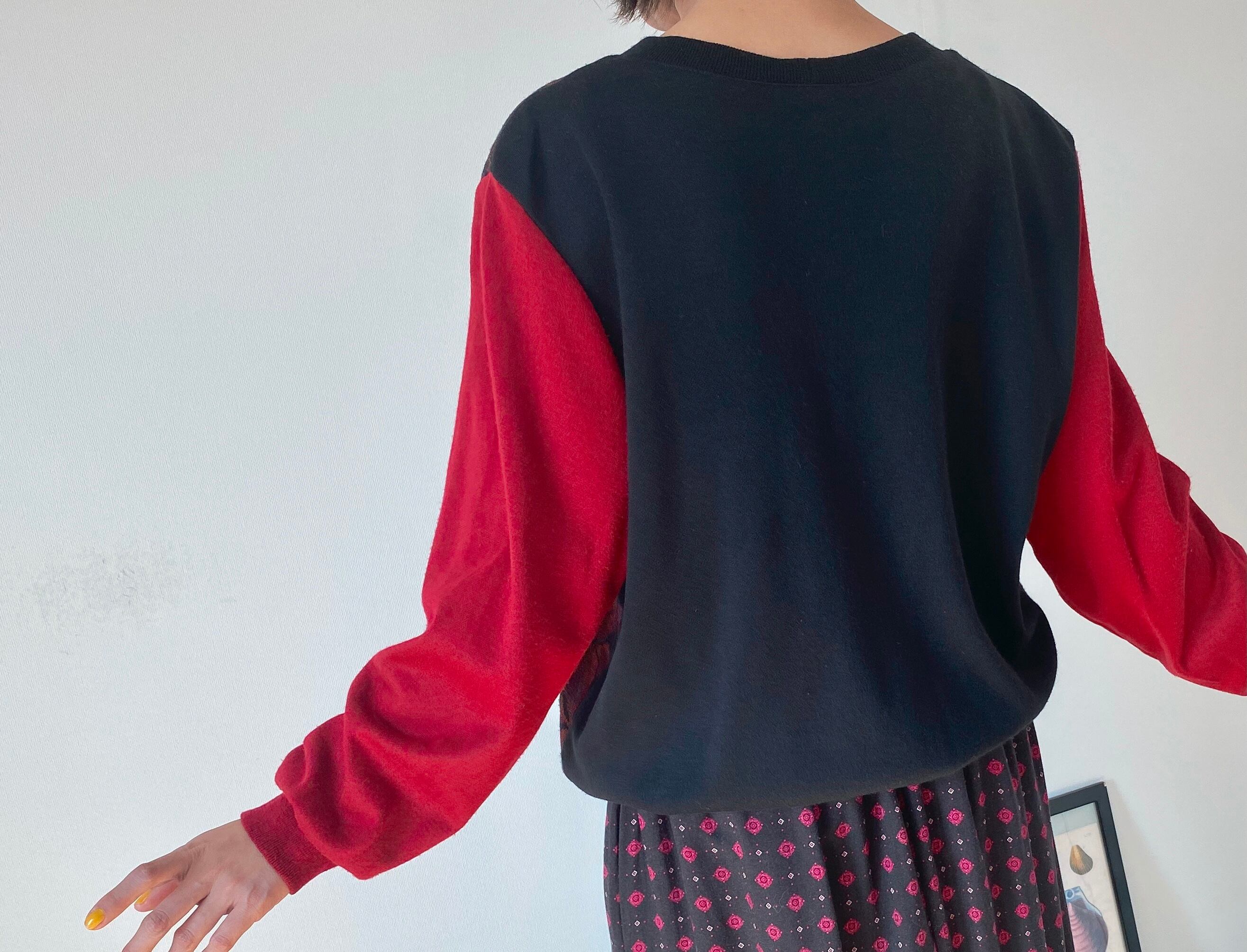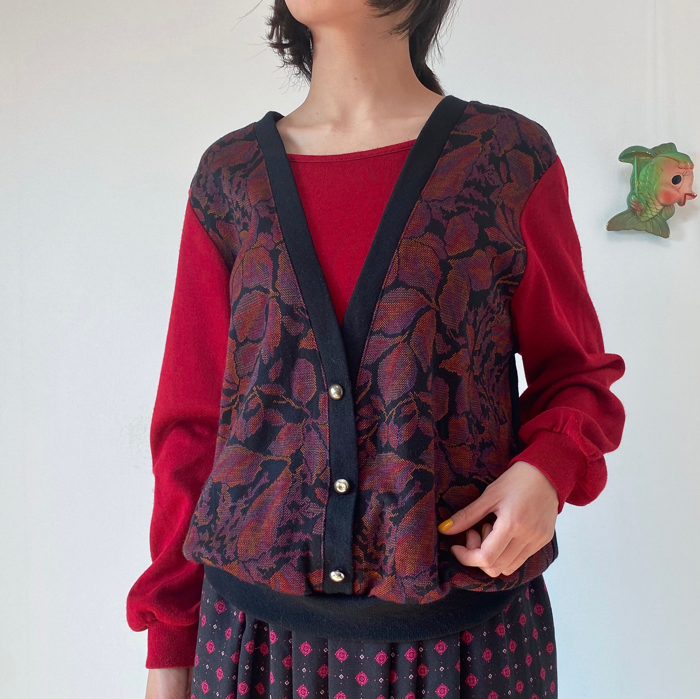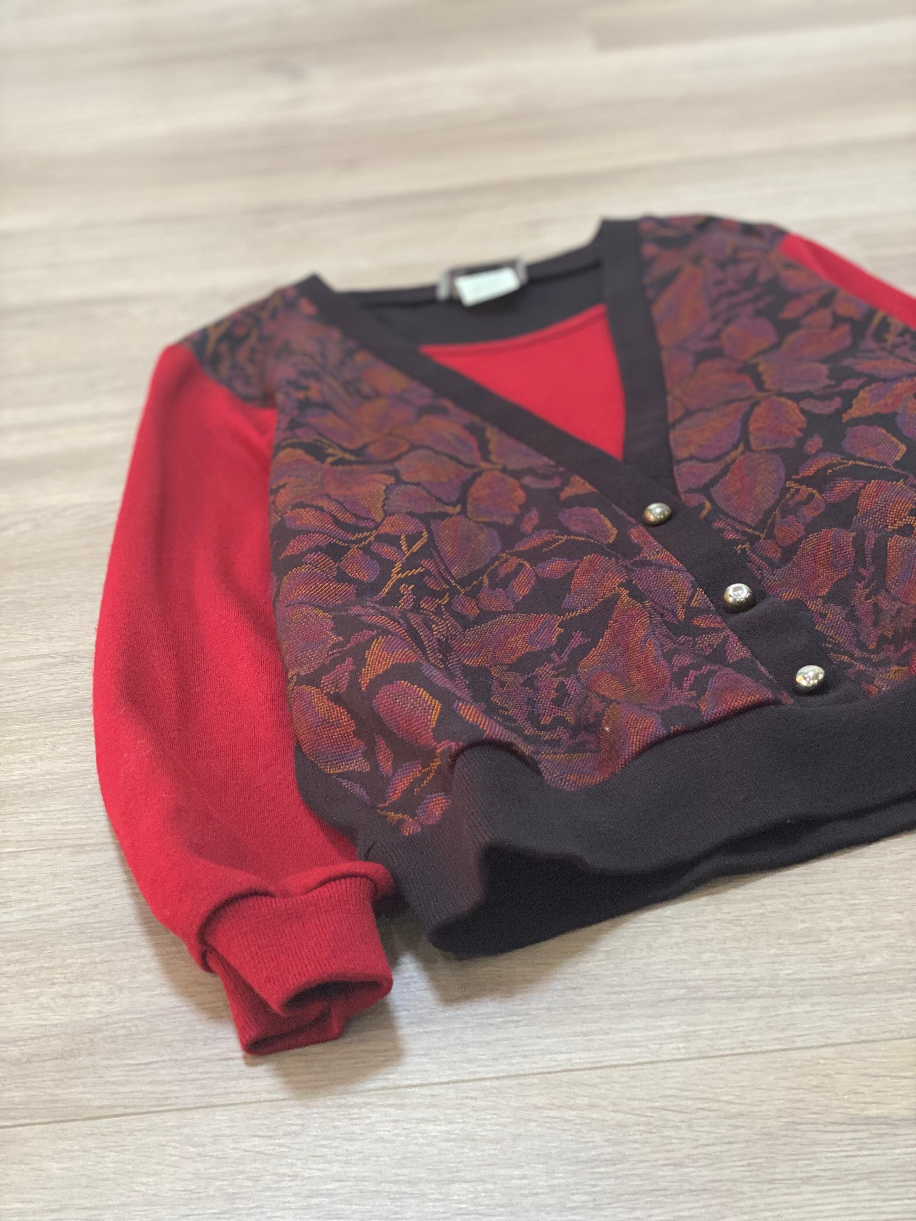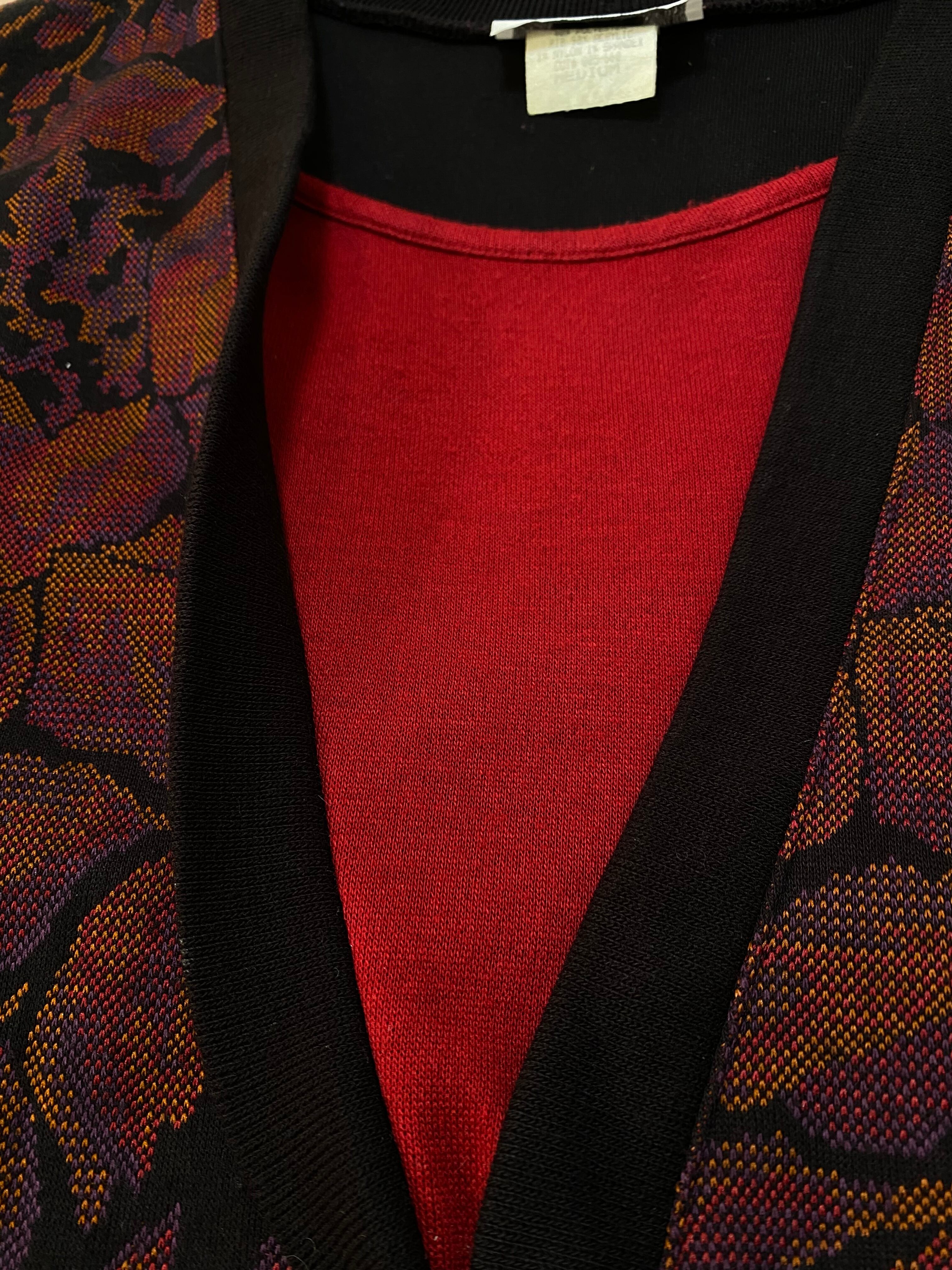 ベストの重ね着風ロンT。リーフ柄のゴブラン風ベスト(に見える)がエンジ色なので赤いお袖もマイルドに。バックは無地の黒。裾リブなので着るだけでOKなお品です。