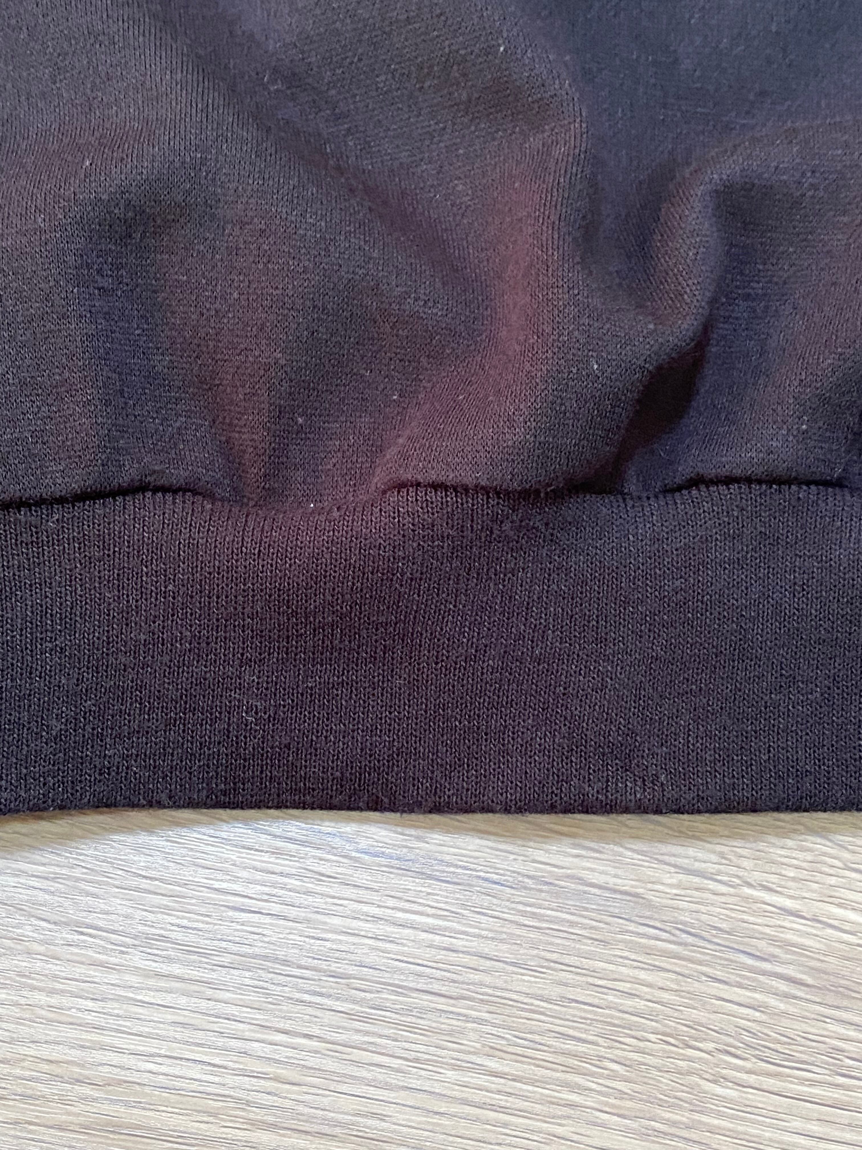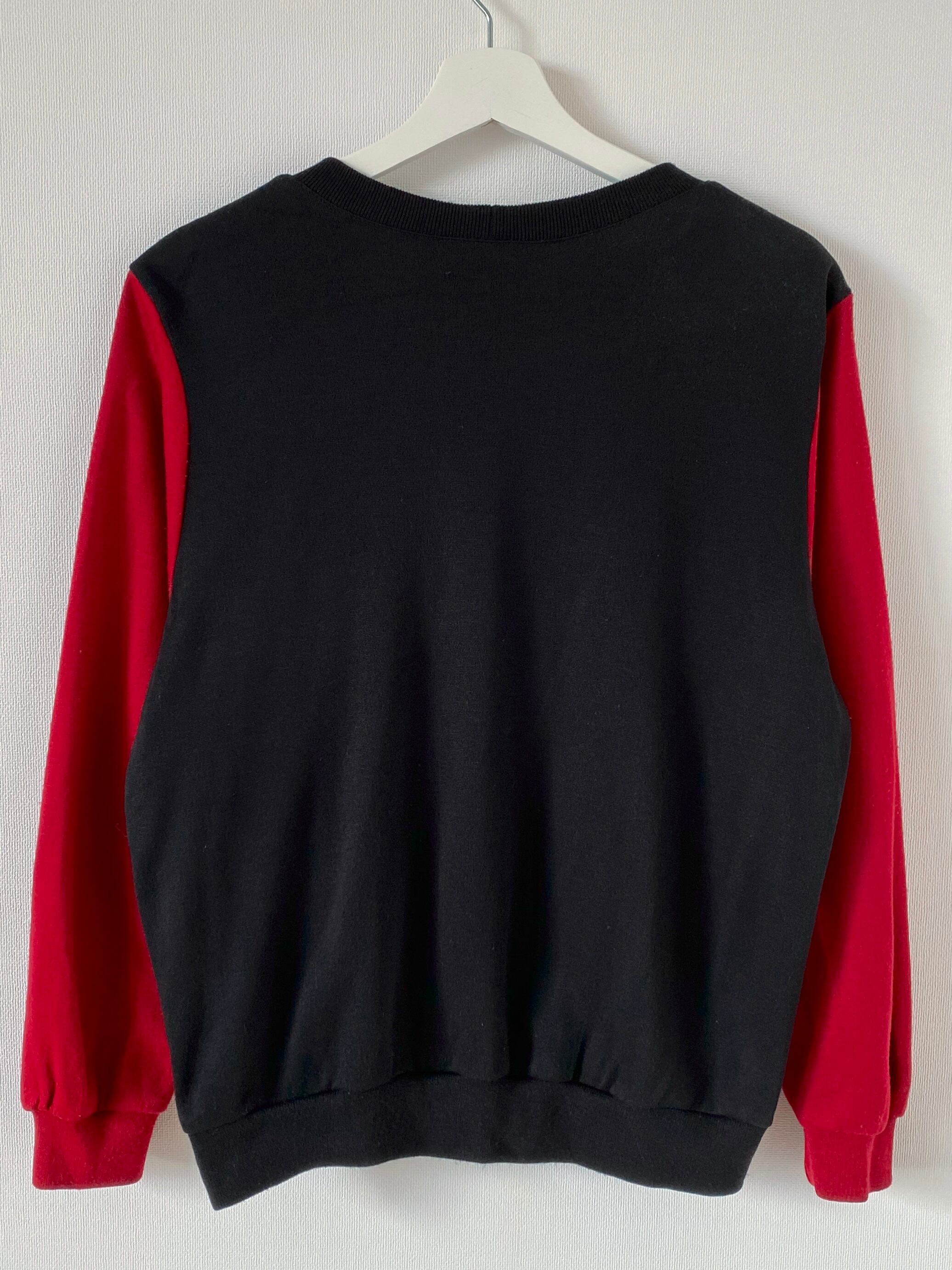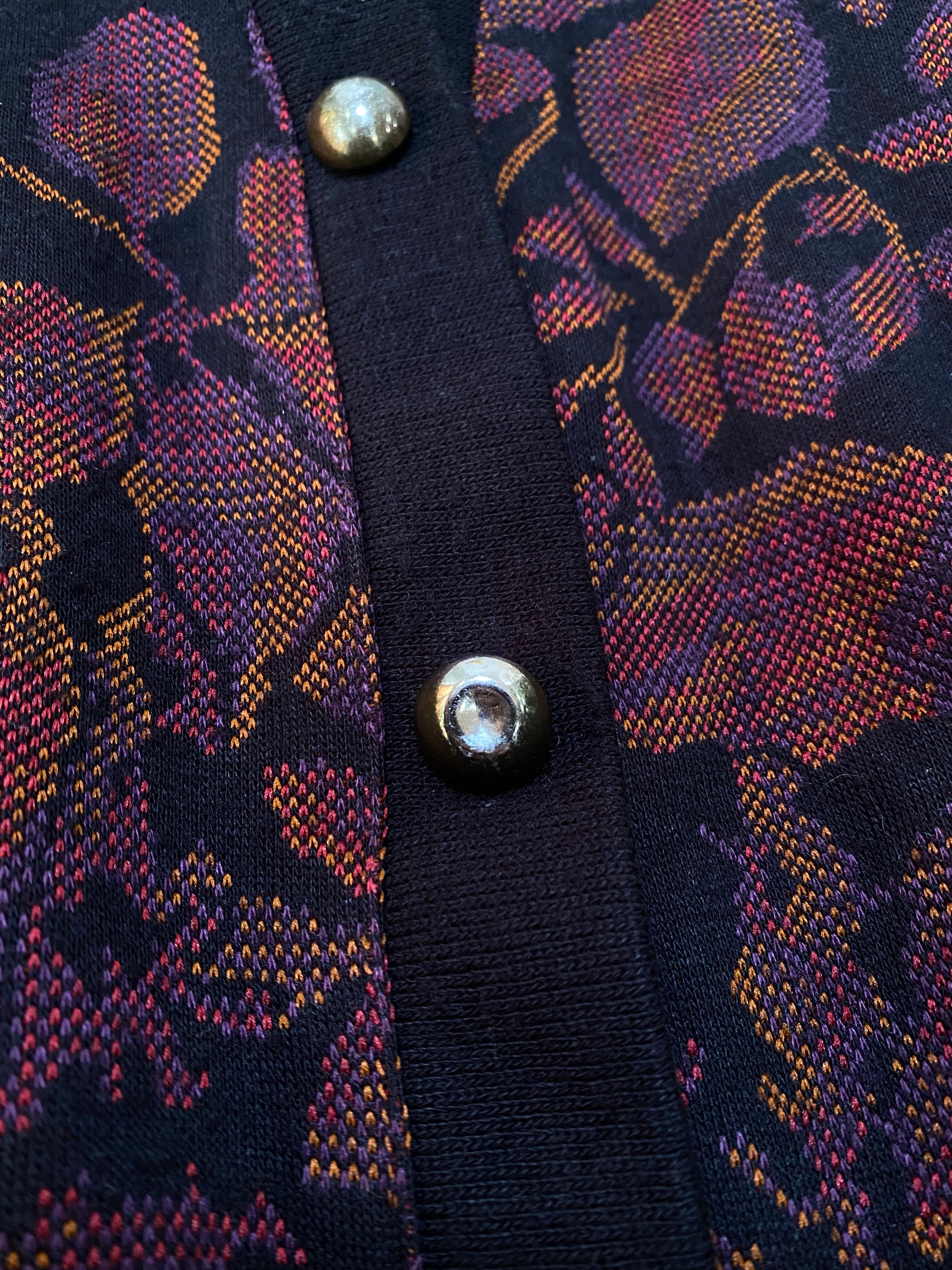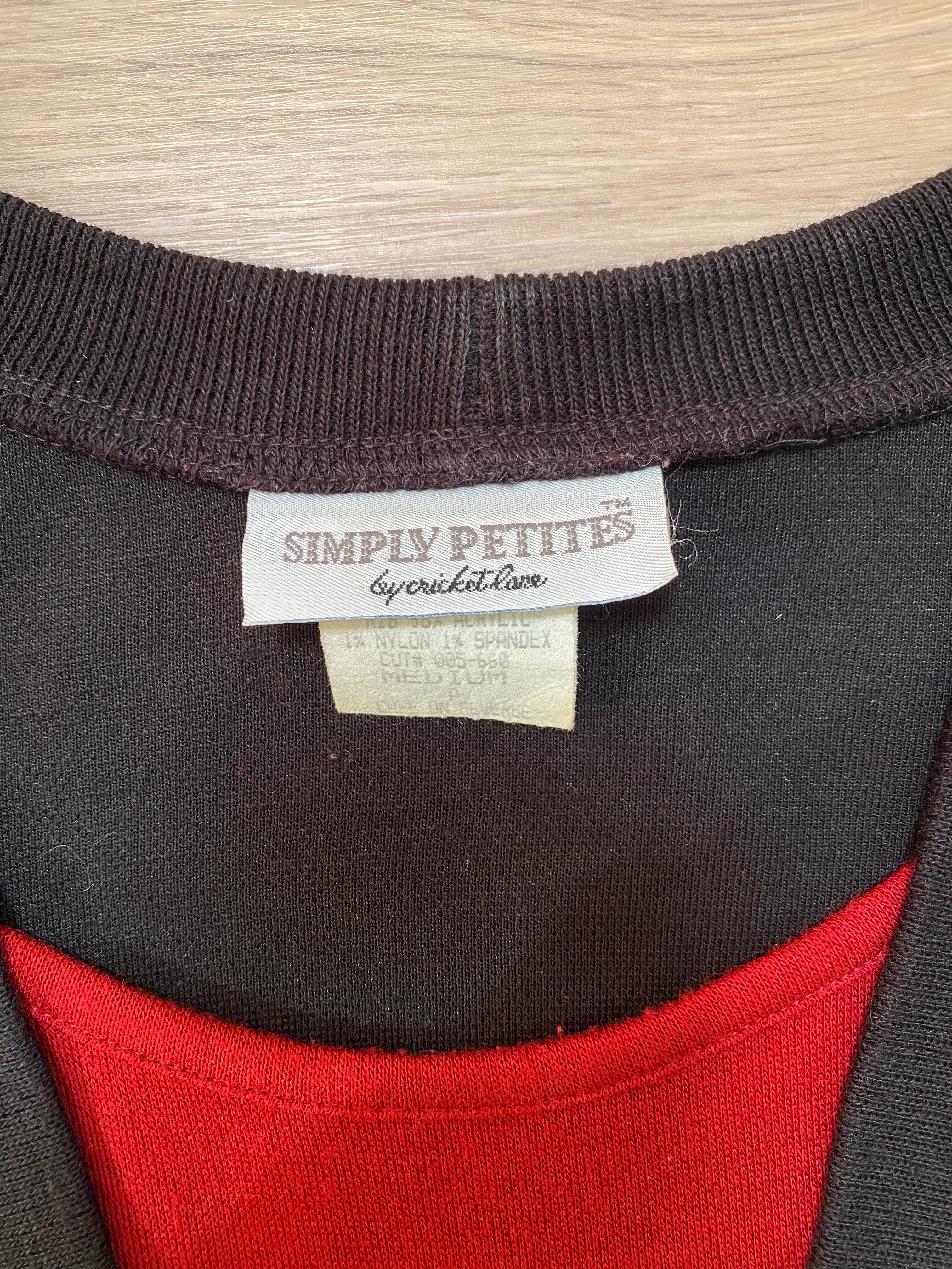ベストの重ね着風ロンT。リーフ柄のゴブラン風ベスト(に見える)がエンジ色なので赤いお袖もマイルドに。バックは無地の黒。裾リブなので着るだけでOKなお品です。