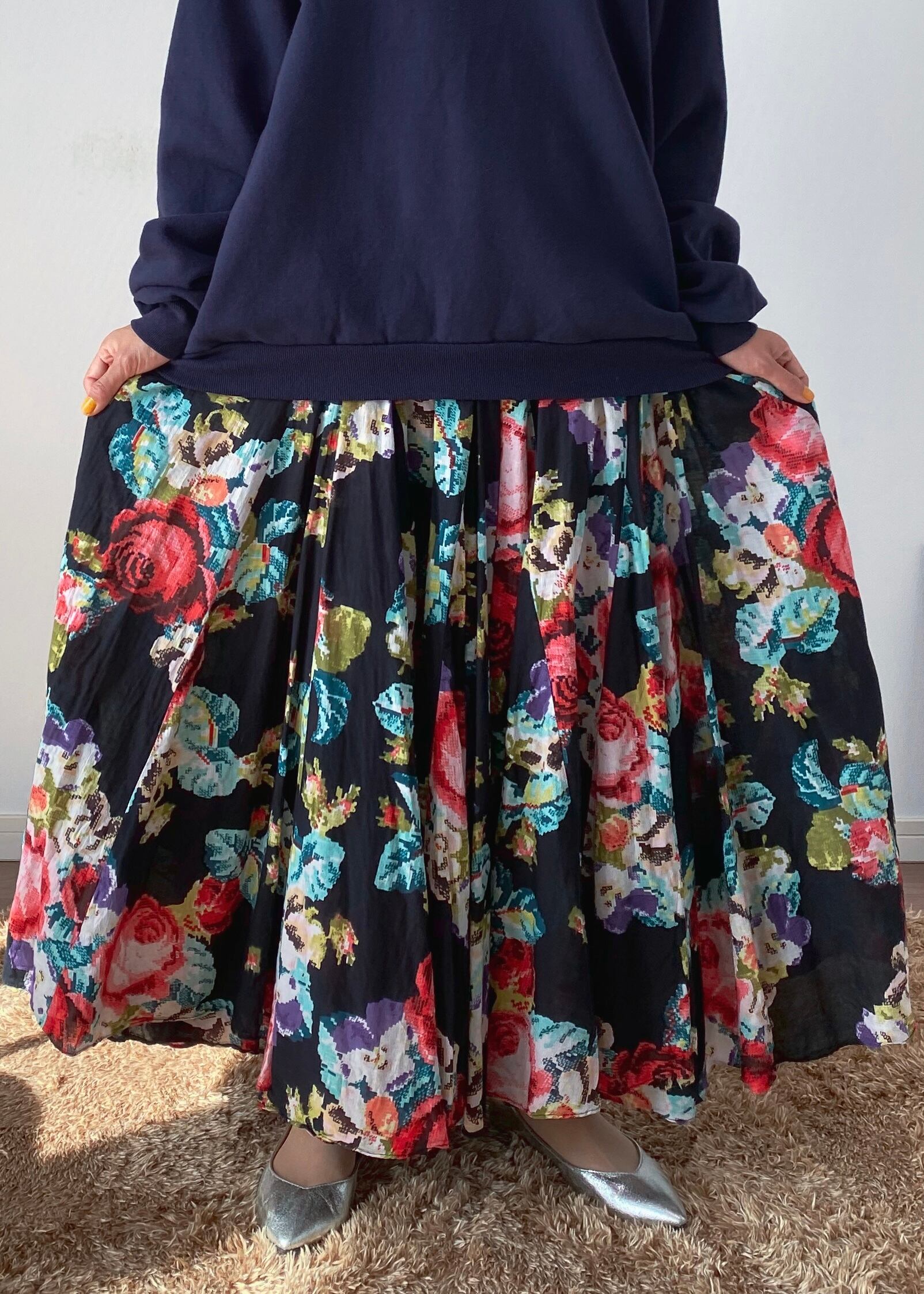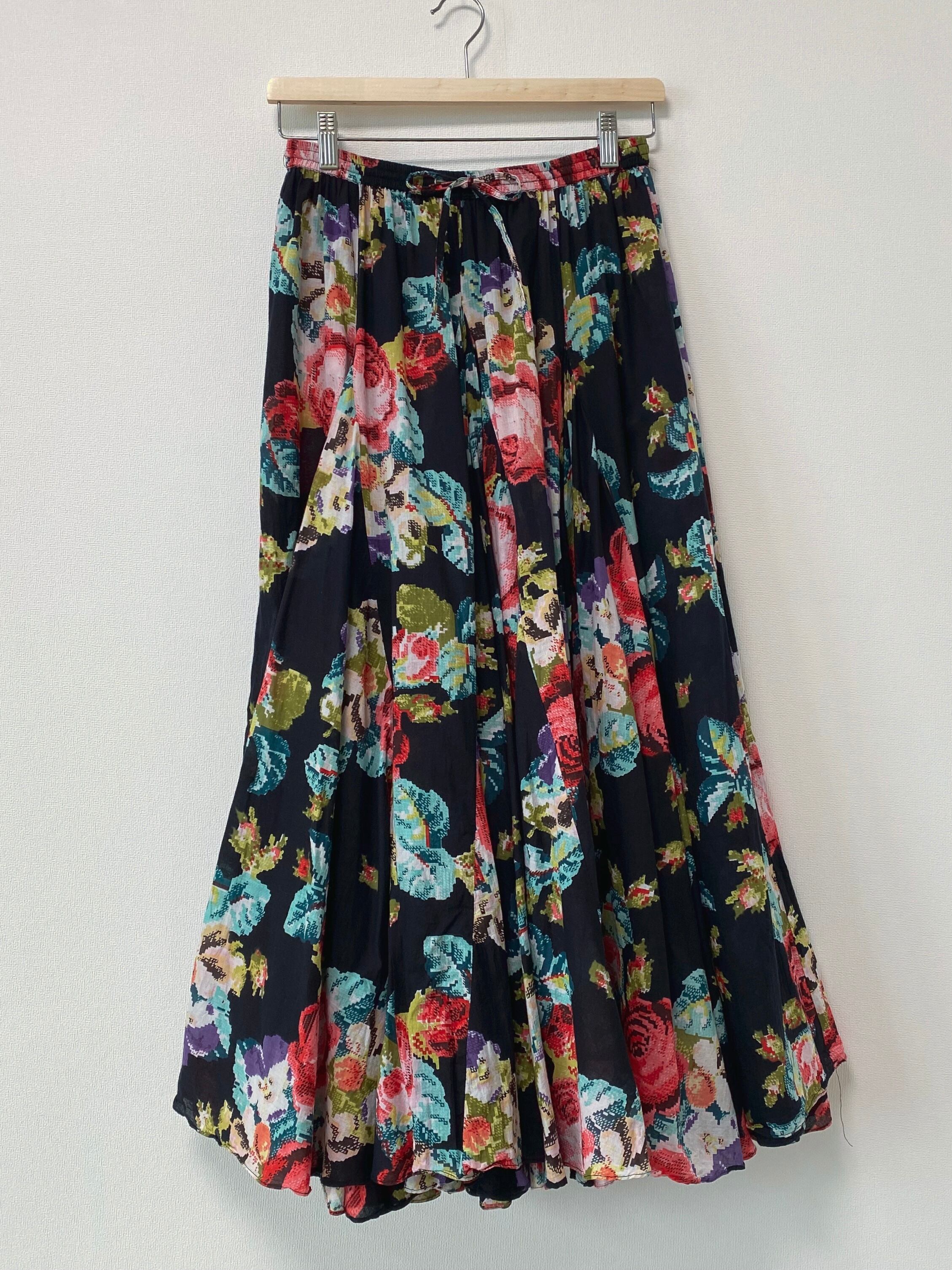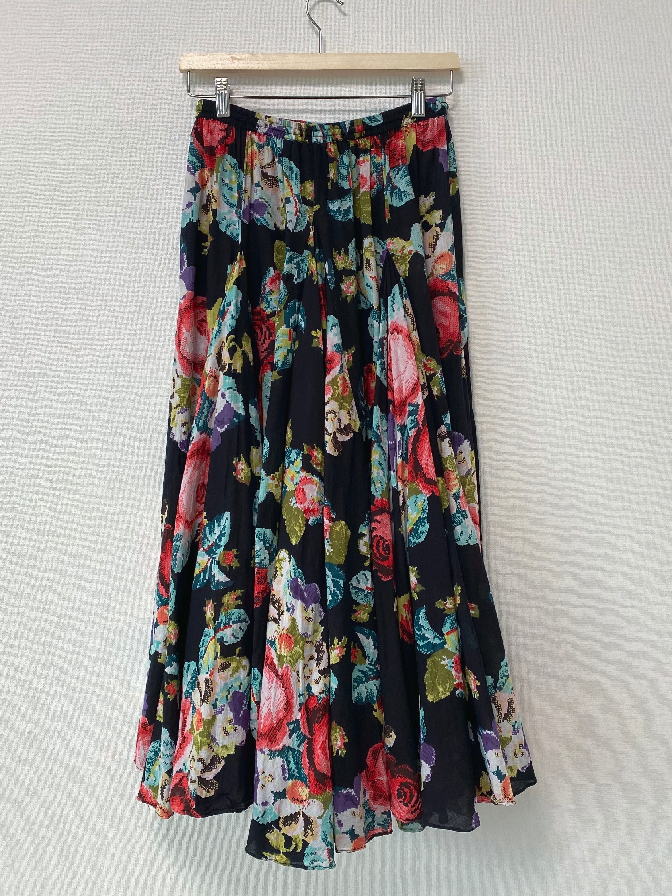 モザイクのフラワープリントが印象的なロングスカート。腰付近からのハギでウエストはスッキリでボリュームたっぷり。少し透け感のあるガーゼのような手触りのお品です。