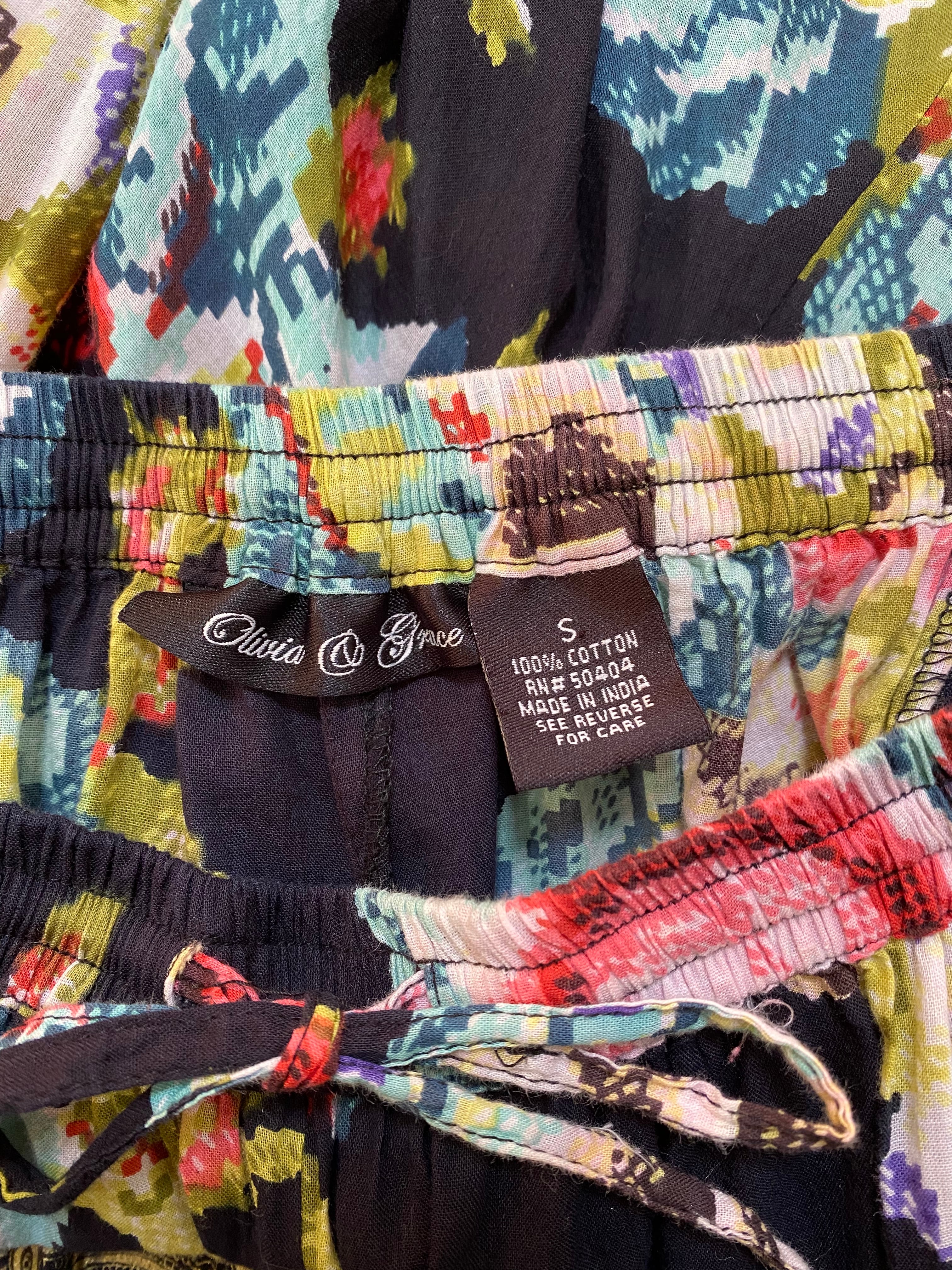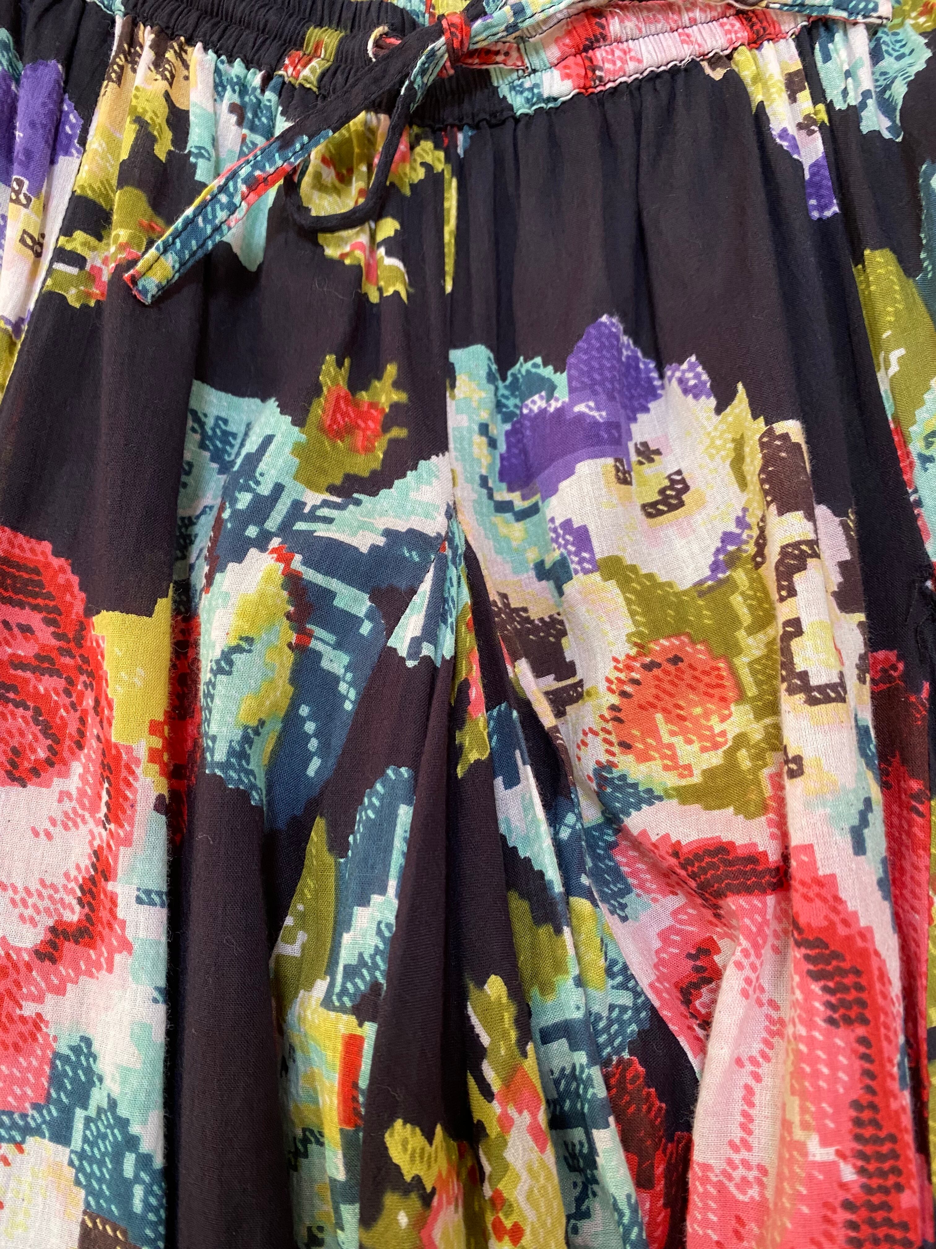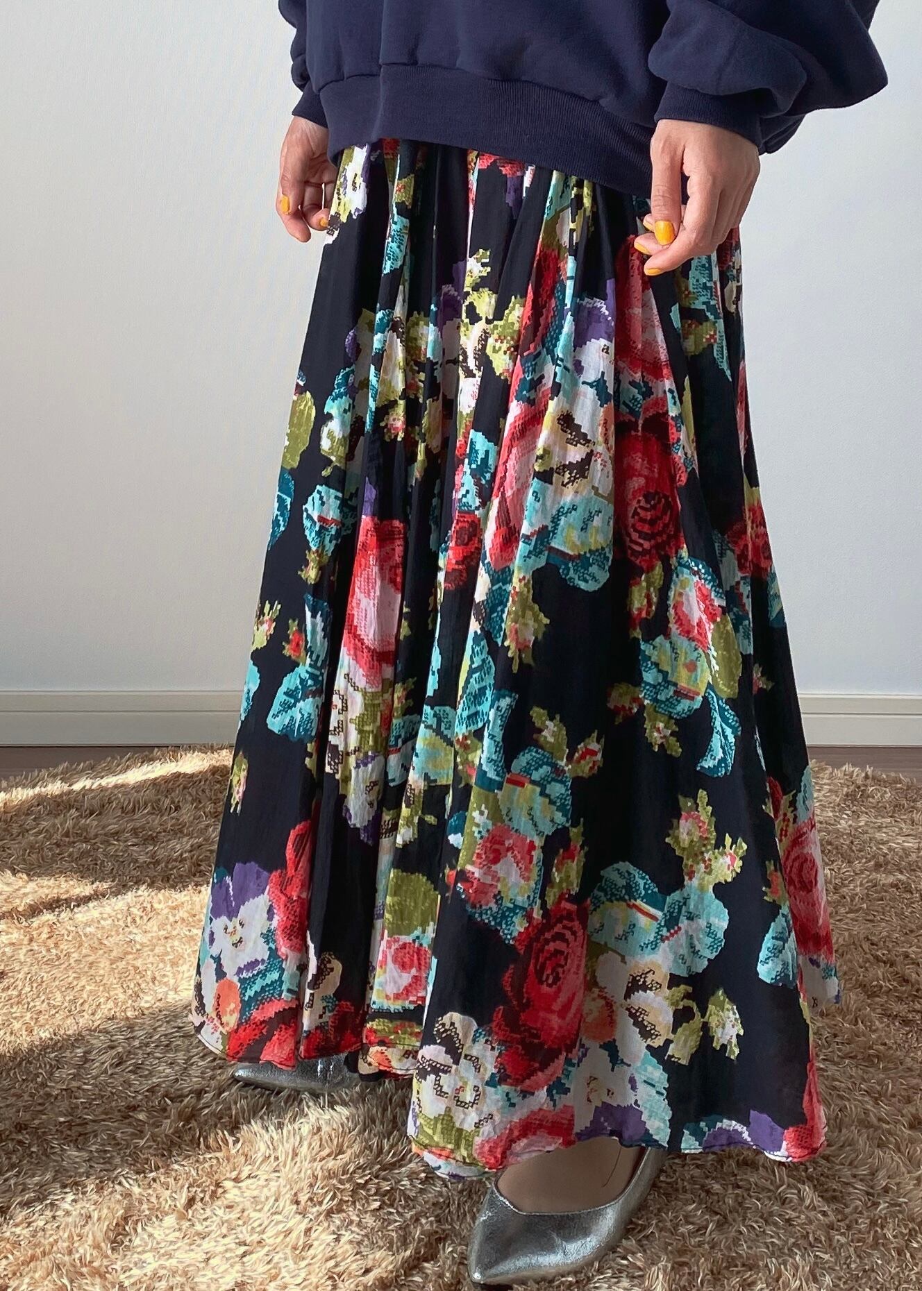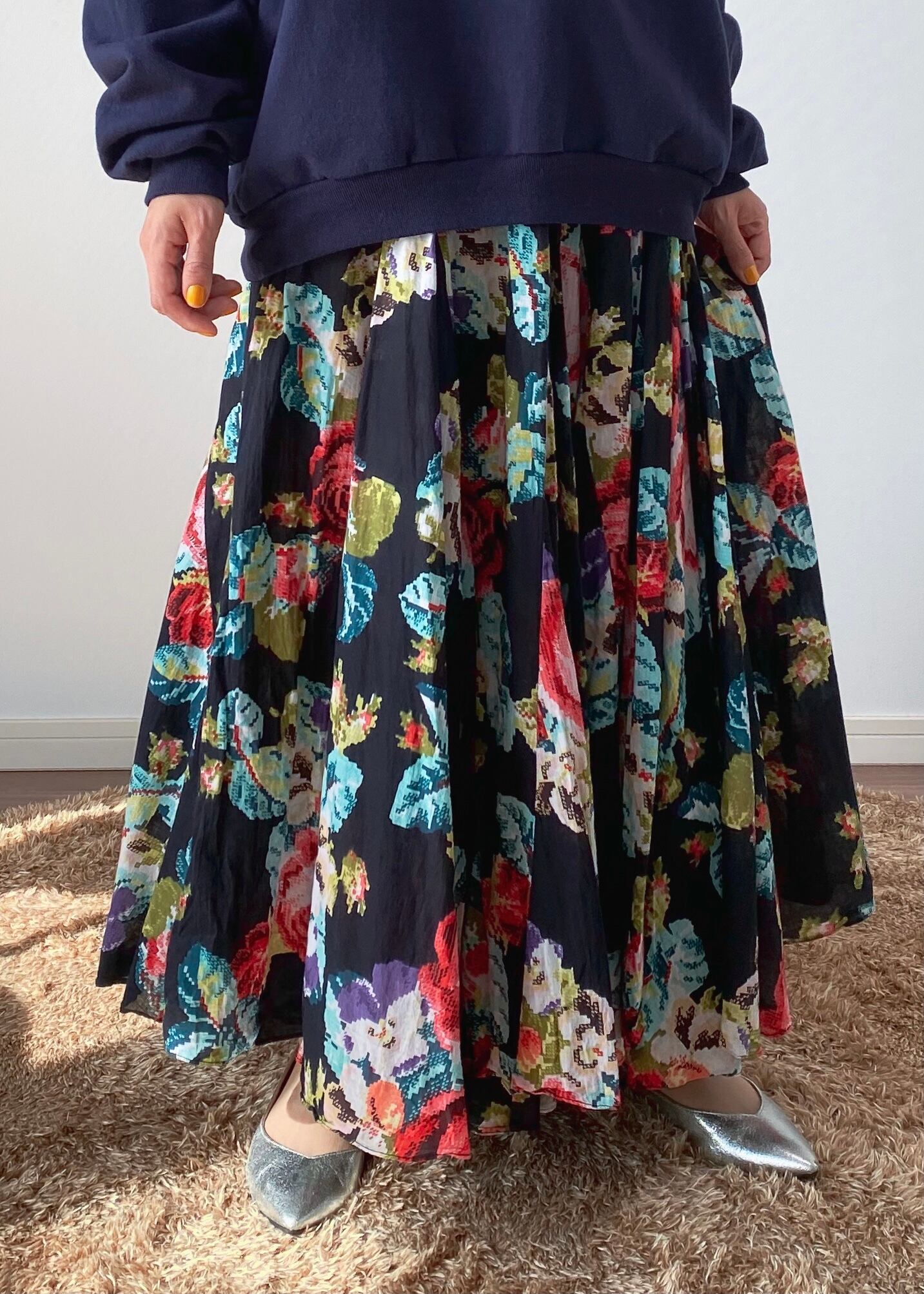 モザイクのフラワープリントが印象的なロングスカート。腰付近からのハギでウエストはスッキリでボリュームたっぷり。少し透け感のあるガーゼのような手触りのお品です。