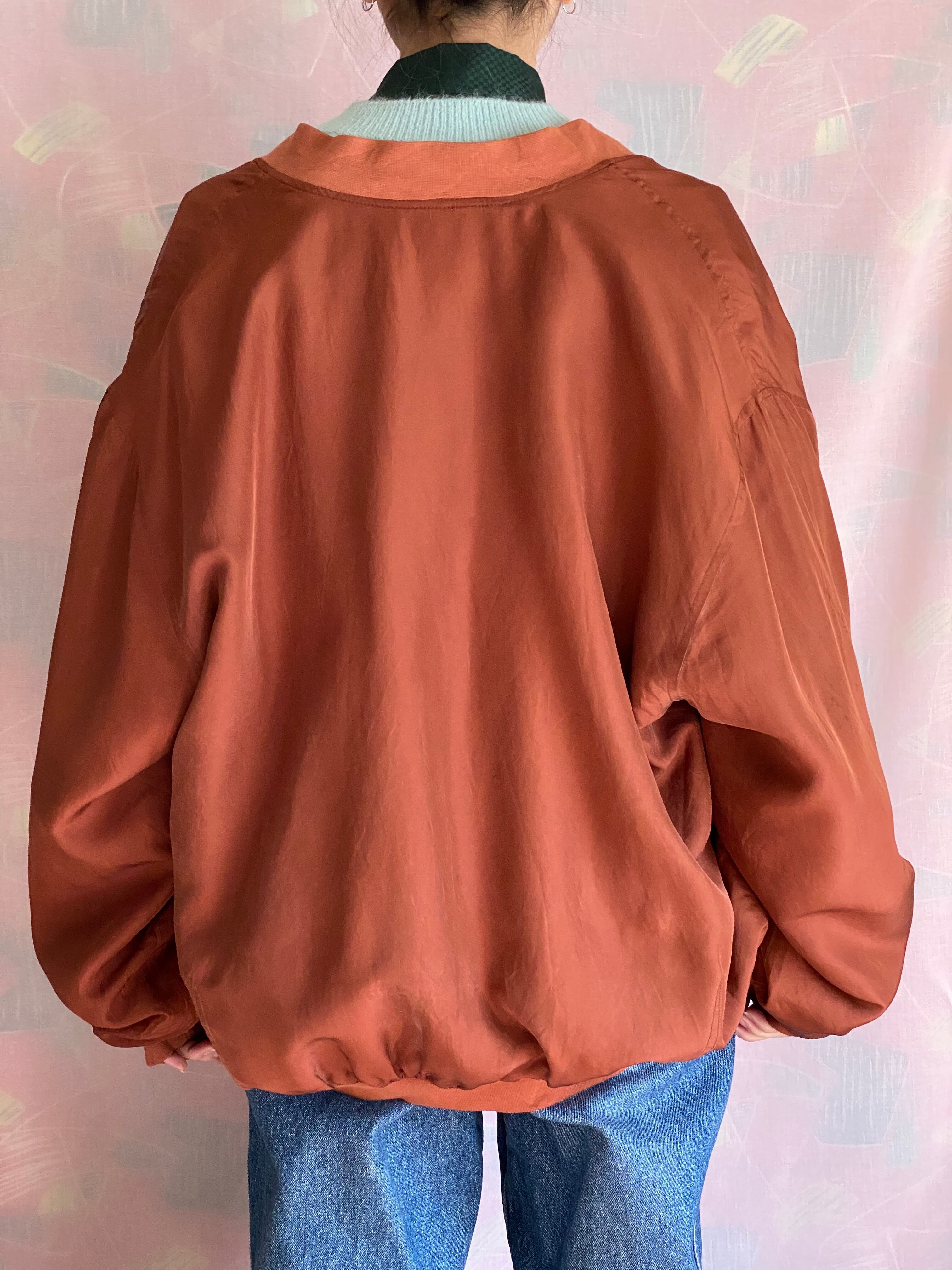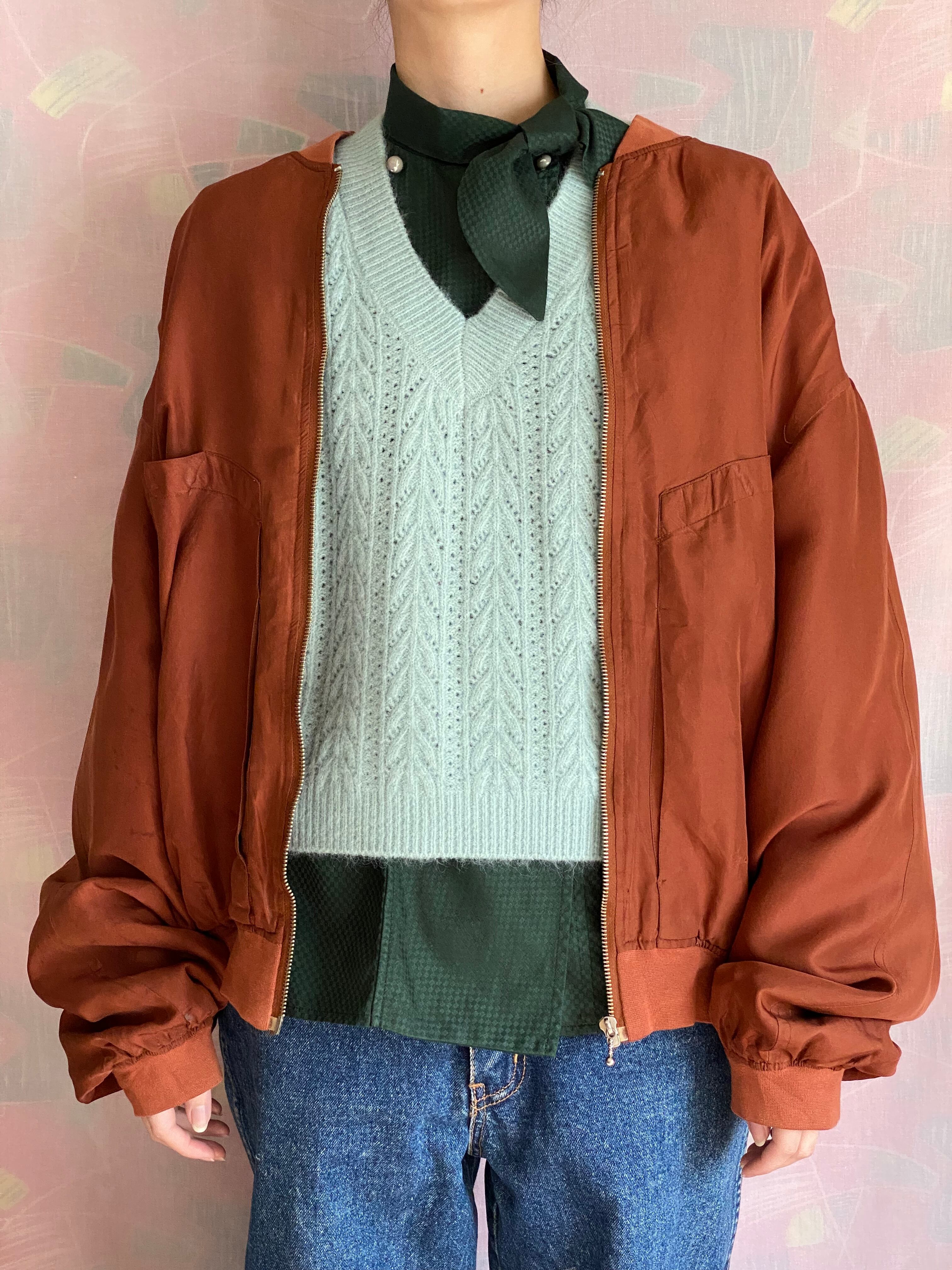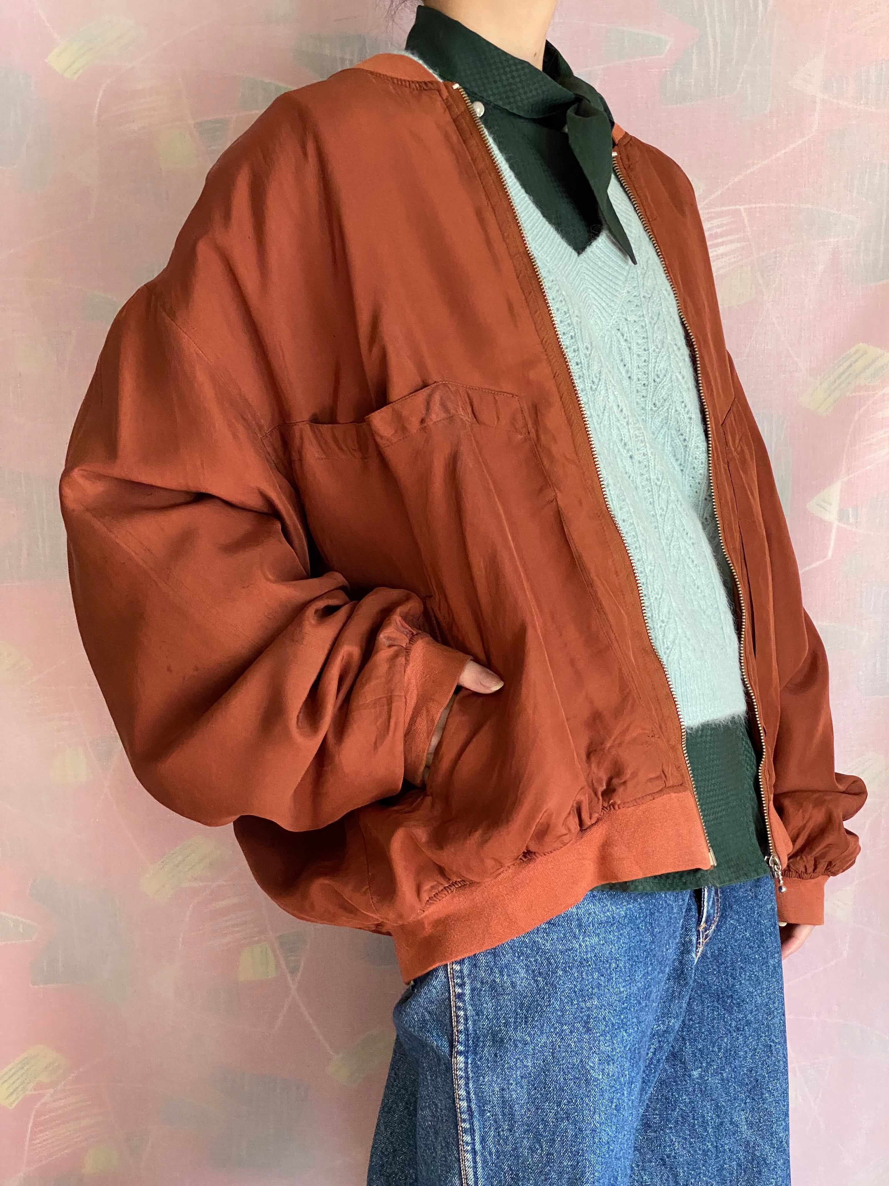 中綿入りシルクのジップブルゾン。胸元に深いポケット、両サイドにもポケットが付いています。中綿入りなので早春からご着用頂けます。オーバーサイズでゆったり可愛く着こなせます。