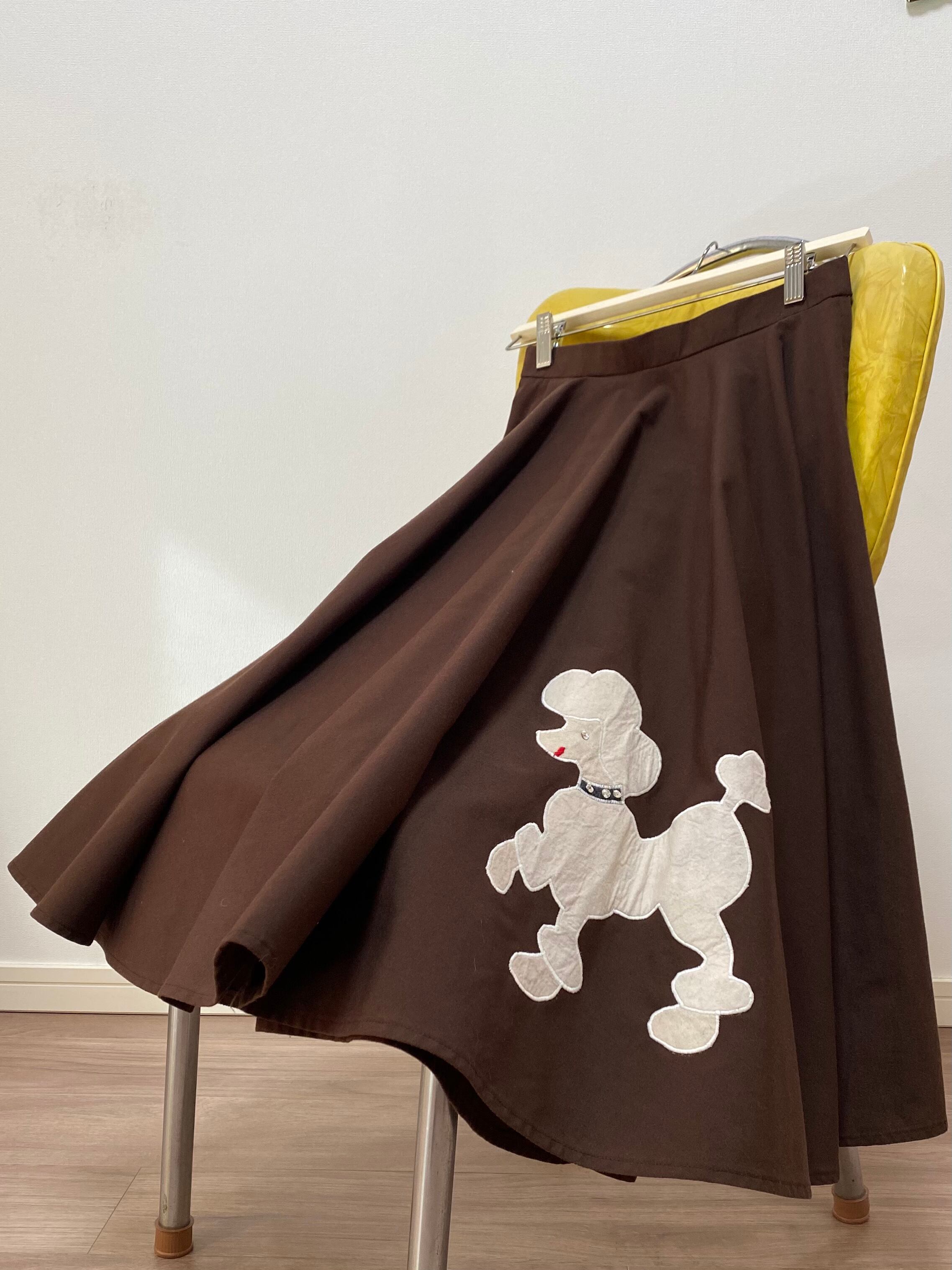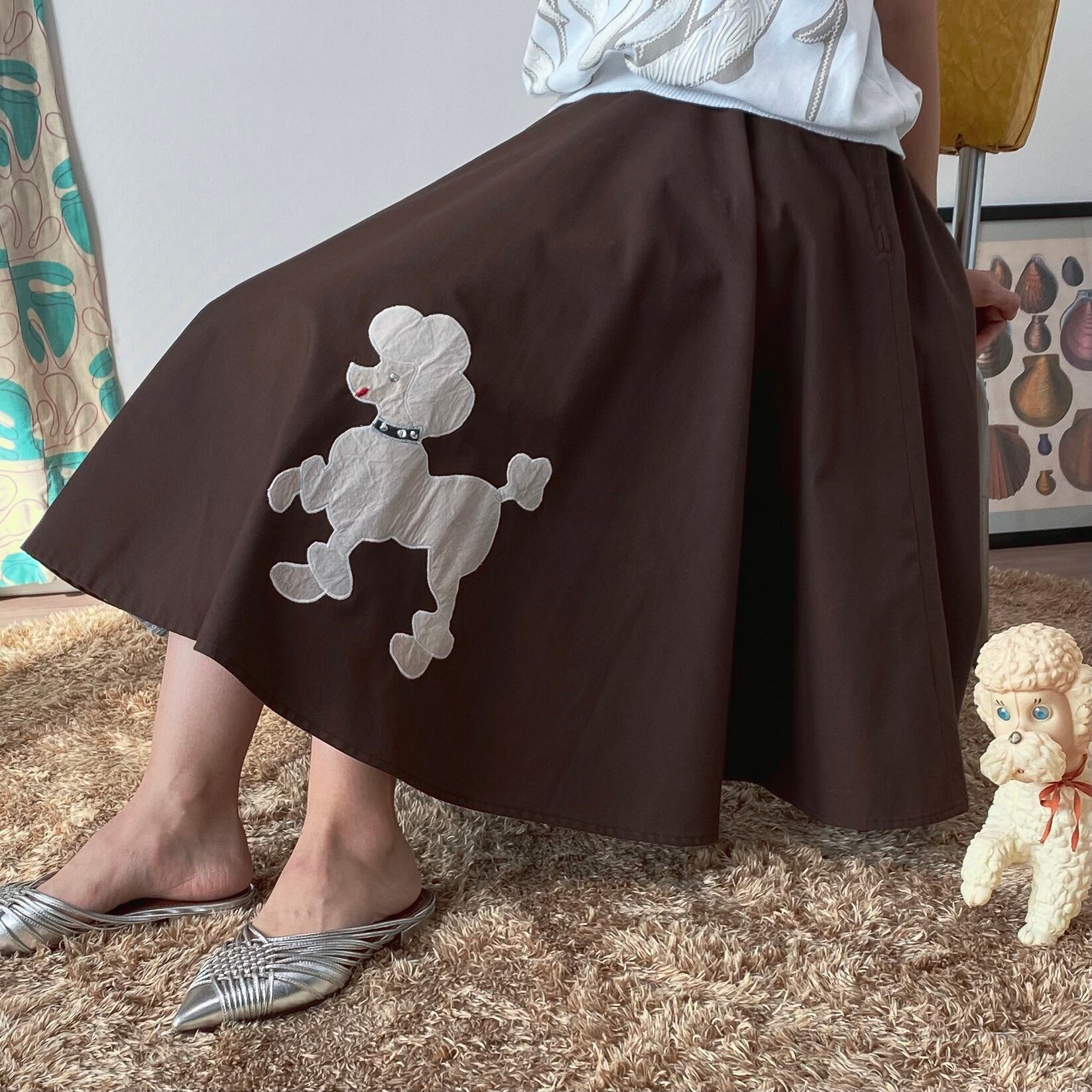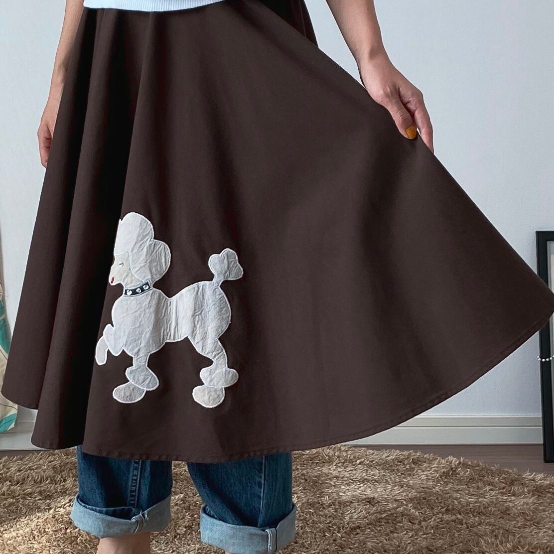 コレクターズアイテムのプードルアップリケのサーキュラースカート。ハンドメイドかと思われます。厚地コットンでボリューム感あるシルエット。フェルトのプードルは経年により折り目が見られますがビーズとスパンコール刺繍は全部付いています。お色味はダークブラウンなので甘すぎないのも素敵です。TALONジッパー使用。