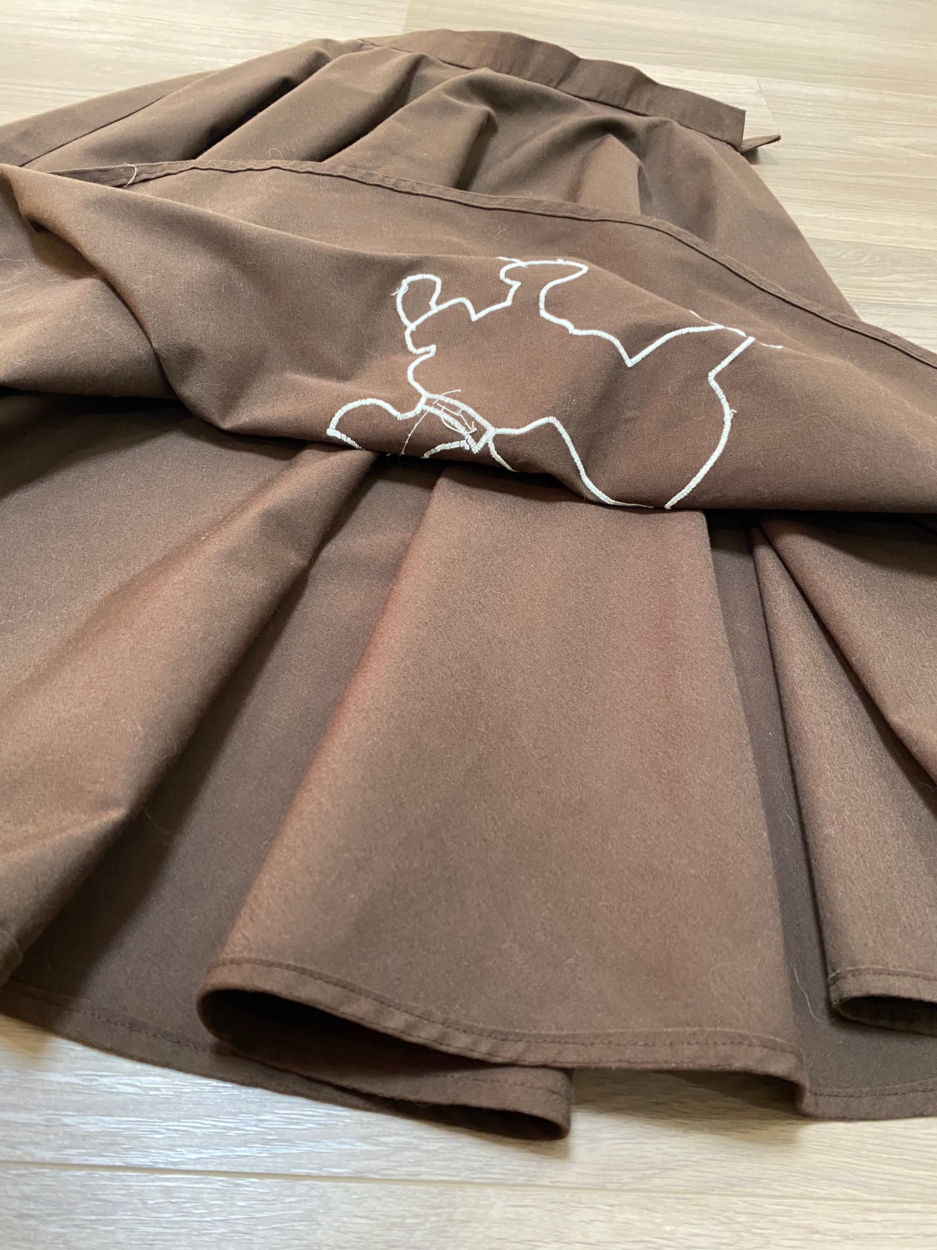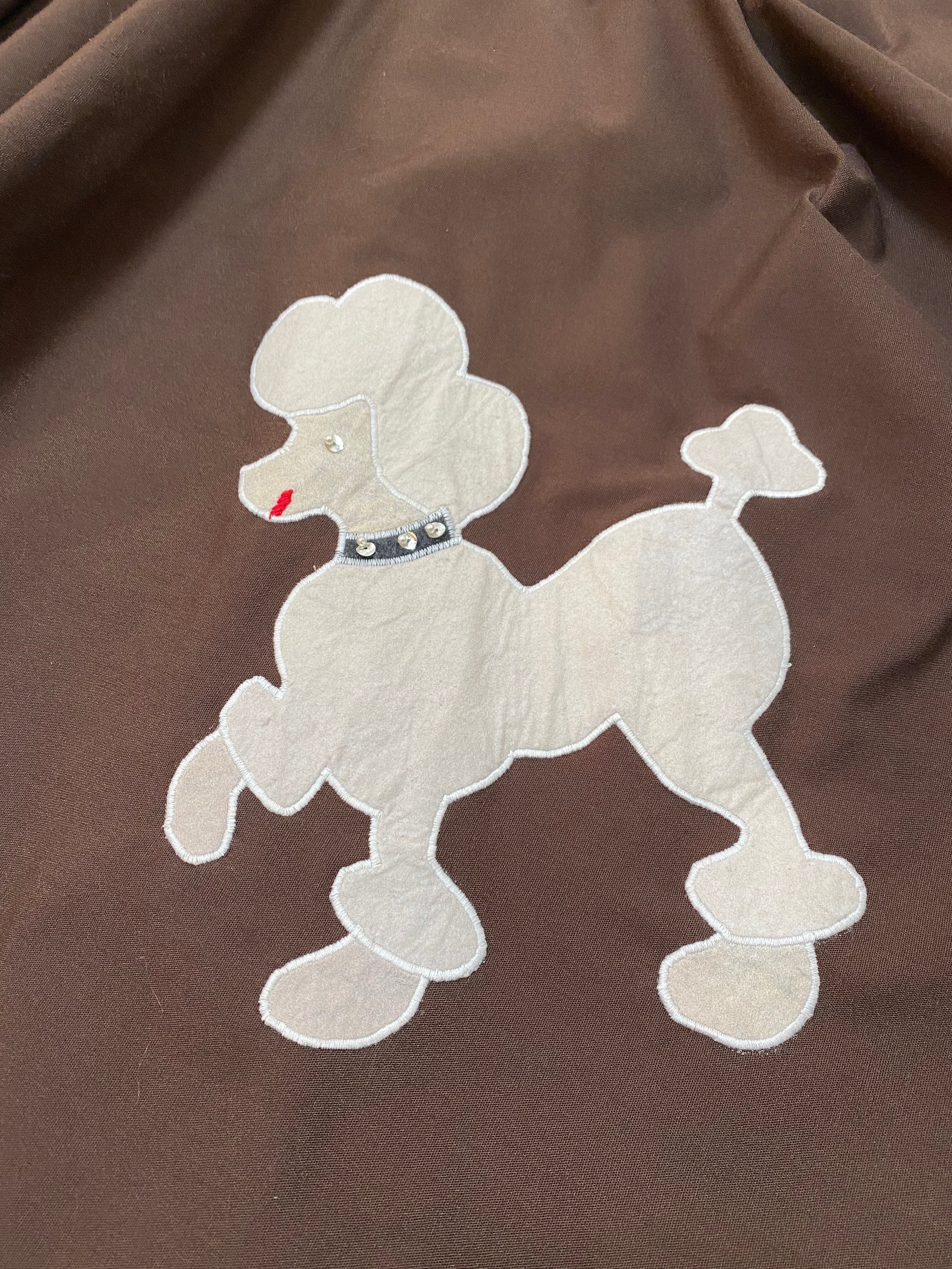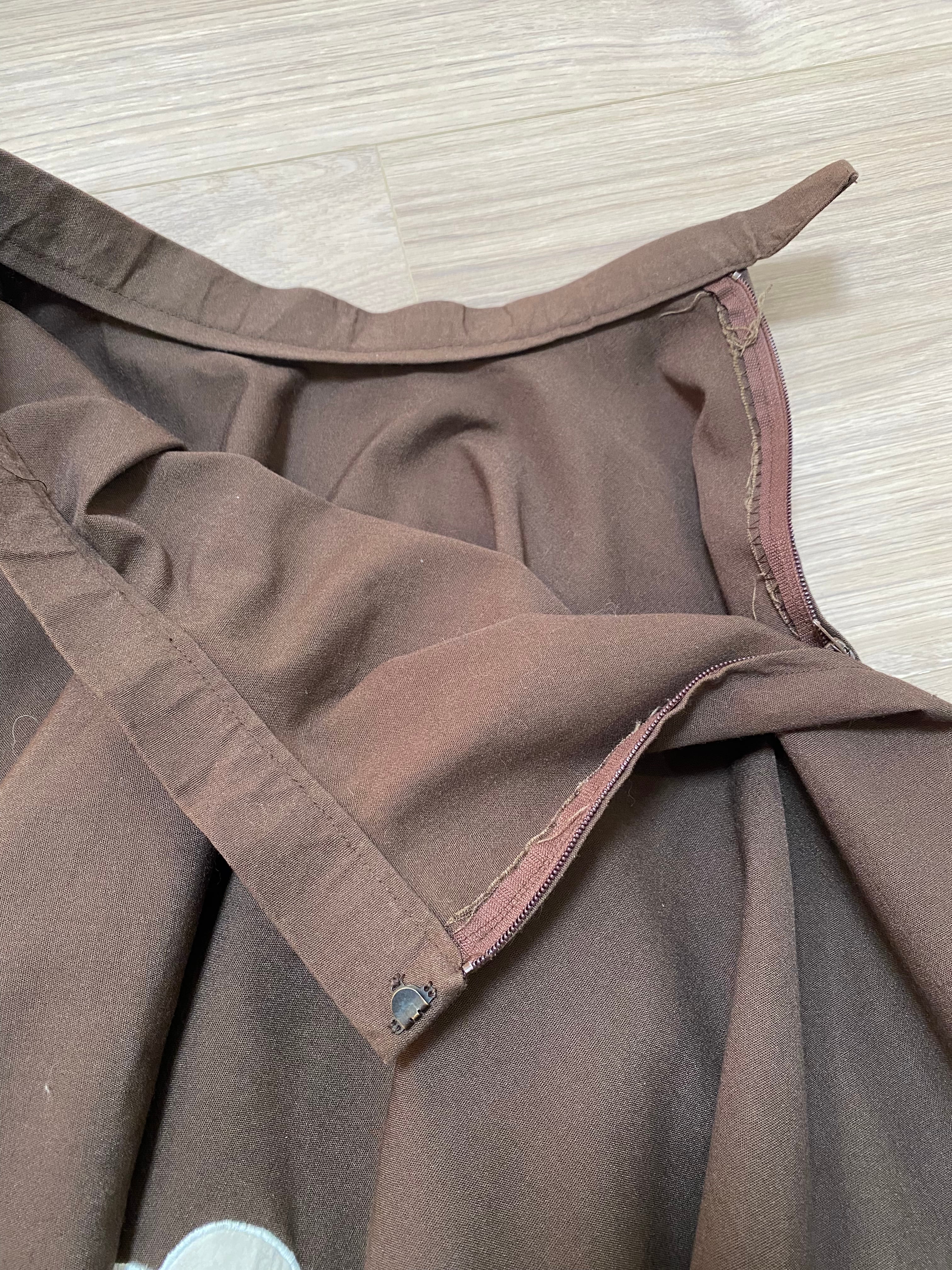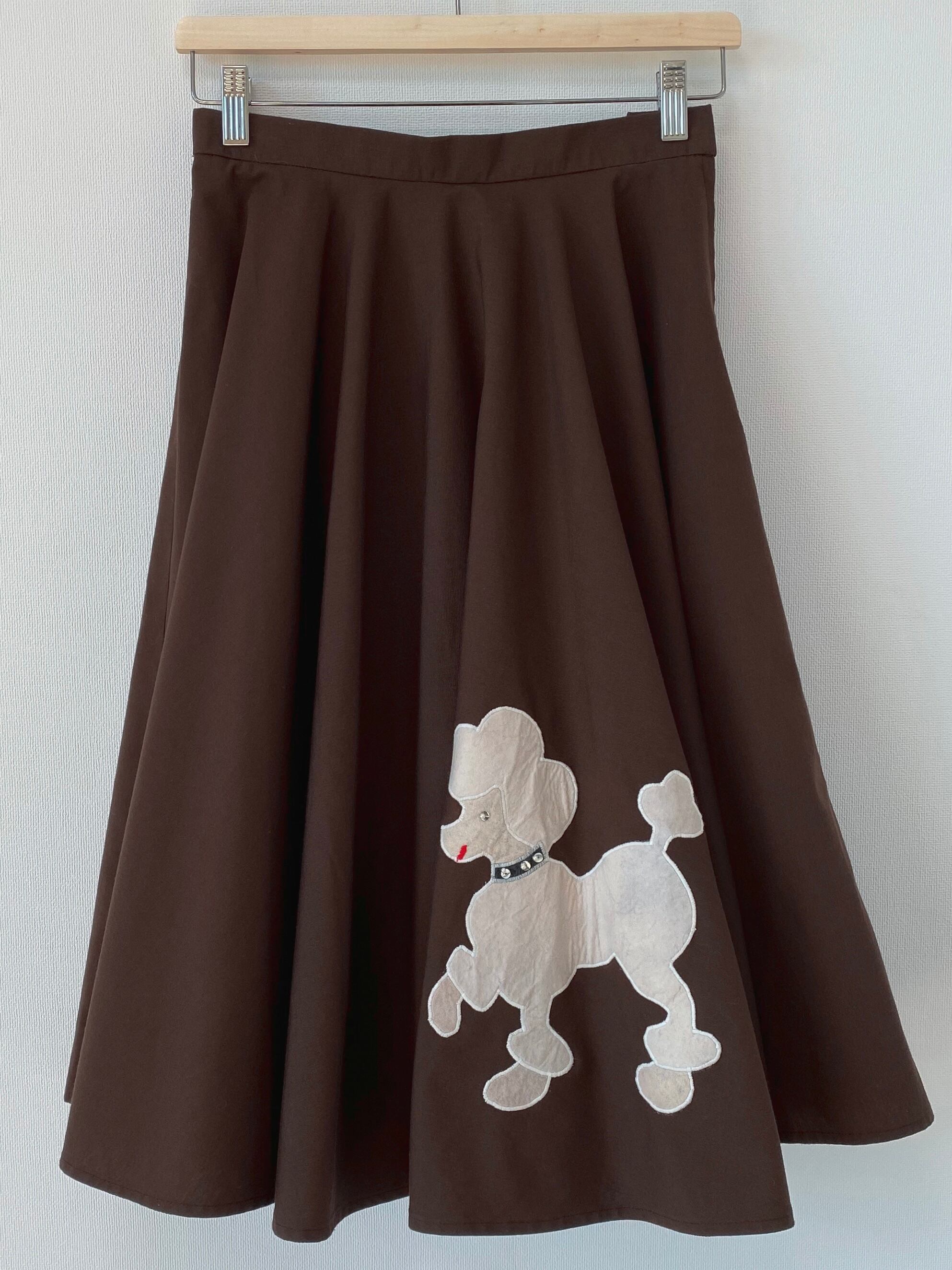 コレクターズアイテムのプードルアップリケのサーキュラースカート。ハンドメイドかと思われます。厚地コットンでボリューム感あるシルエット。フェルトのプードルは経年により折り目が見られますがビーズとスパンコール刺繍は全部付いています。お色味はダークブラウンなので甘すぎないのも素敵です。TALONジッパー使用。
