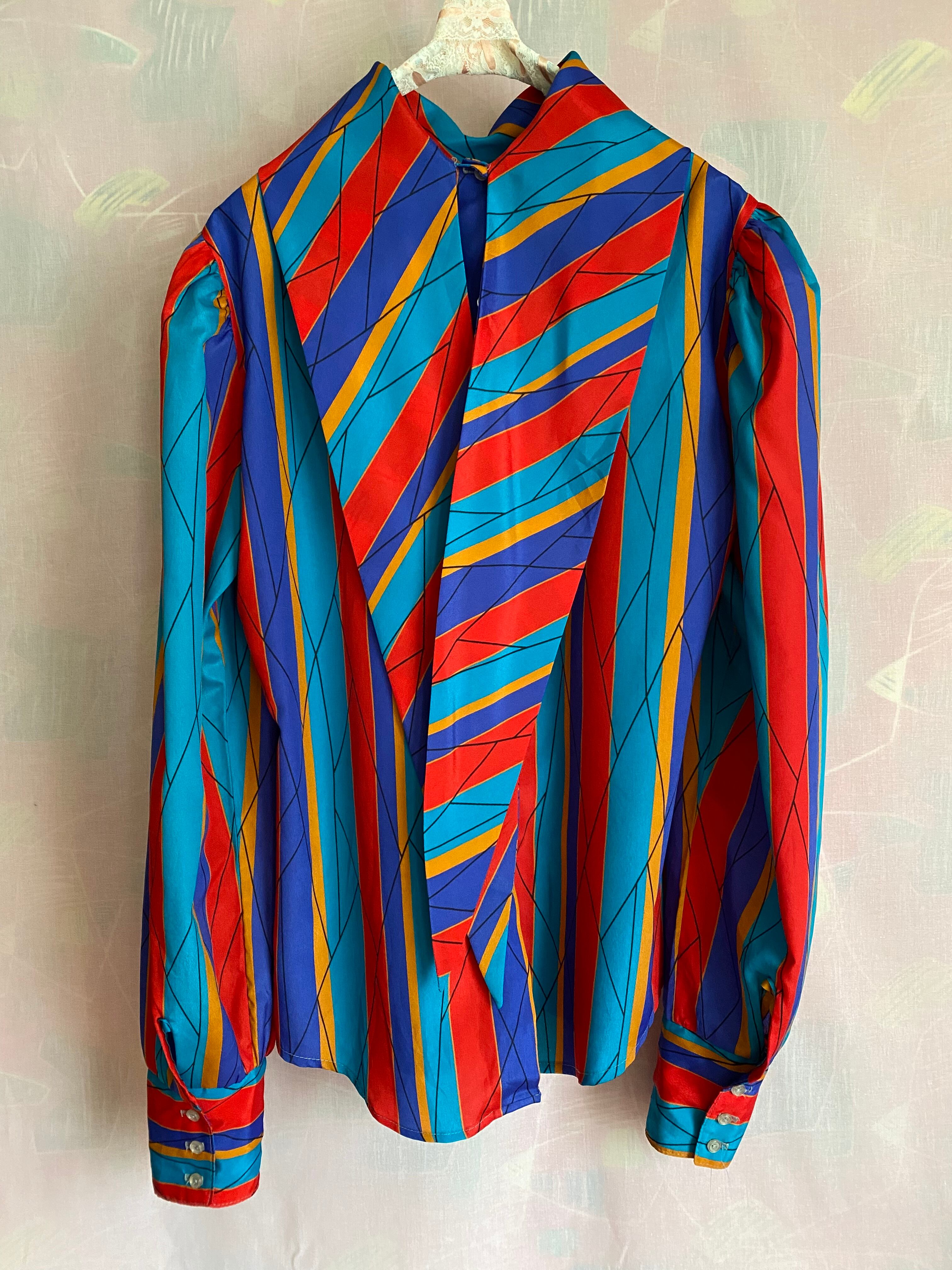 パフスリーブのボウタイブラウス。後ろ開きです。ボウタイは交差して後ろから前に持ってきて結ぶデザイン。パフスリーブの内側は芯地が施されております。(お袖版パニエ?)発色の良い色味でお行儀良すぎない楽しいお品です。