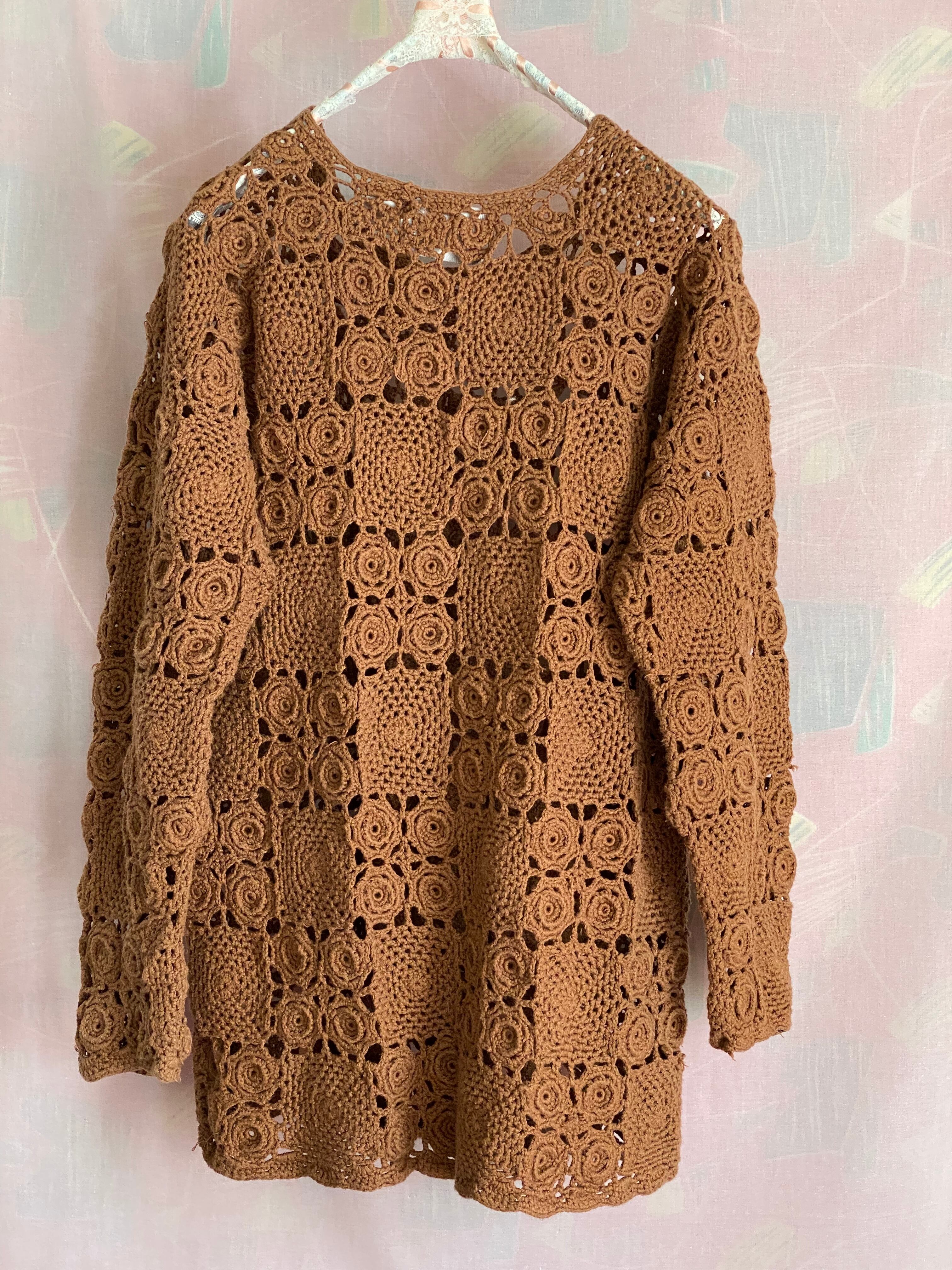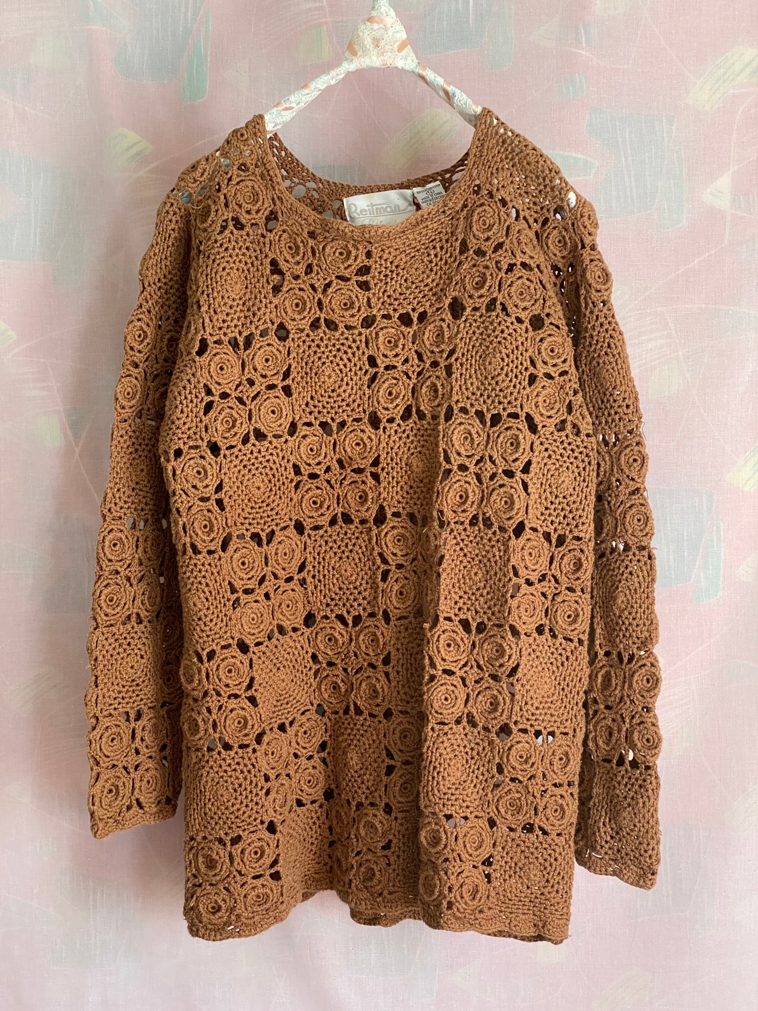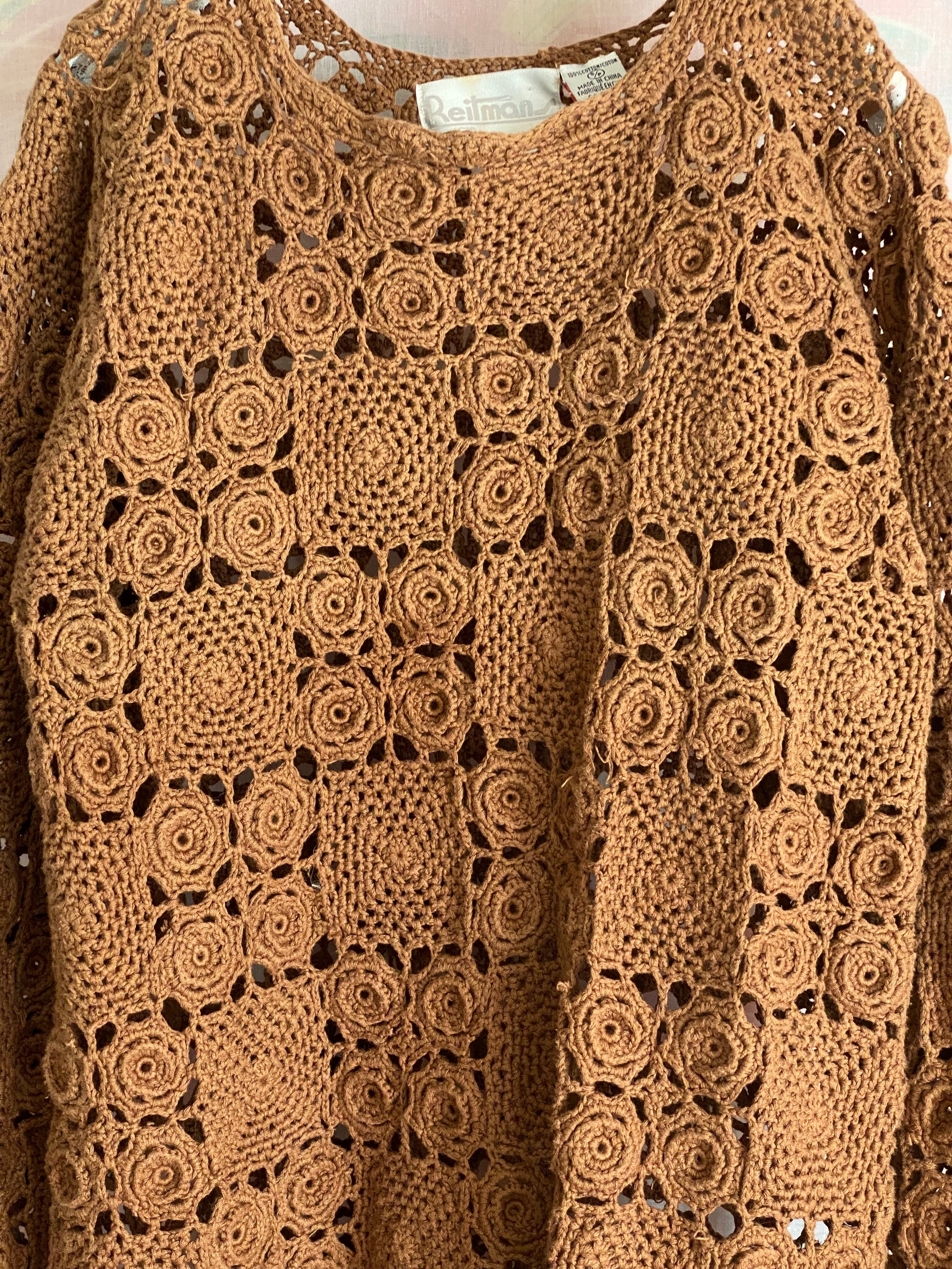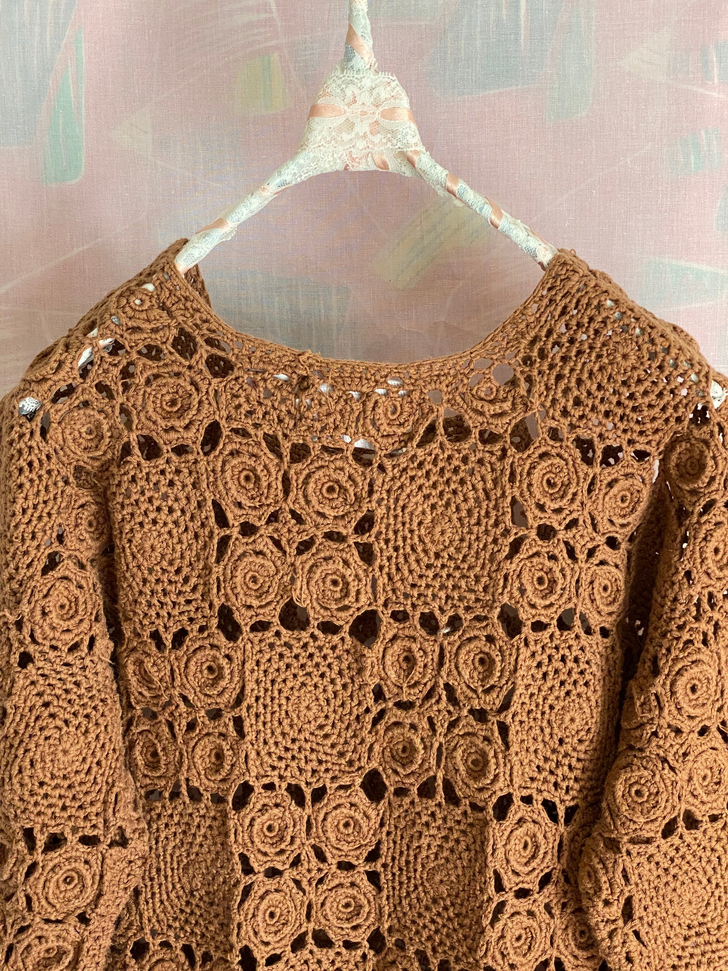 かぎ針編みのレーシーなセーター。程良い透け感で春はブラウスin、夏はキャミソールinで楽しめるお品です。