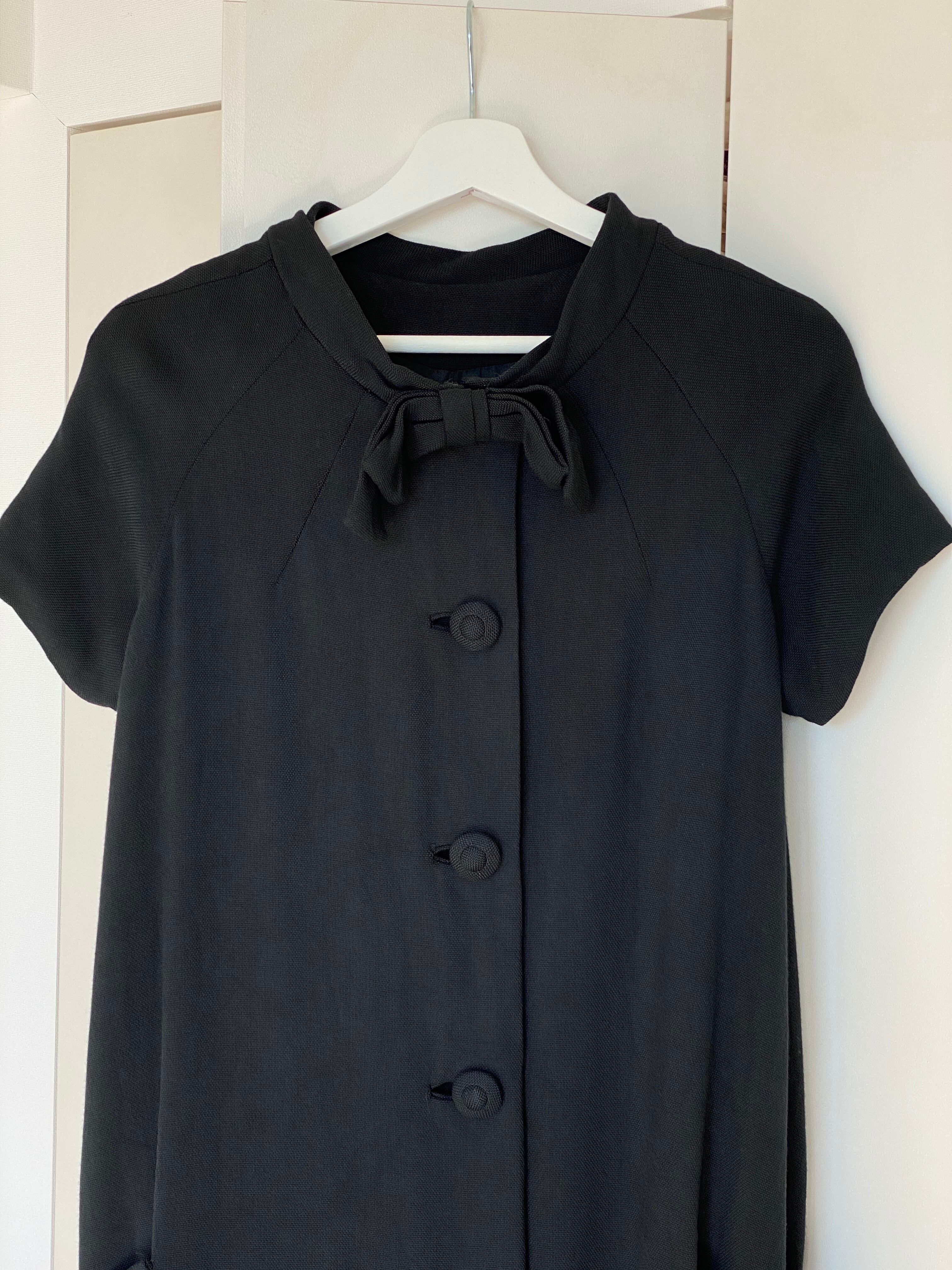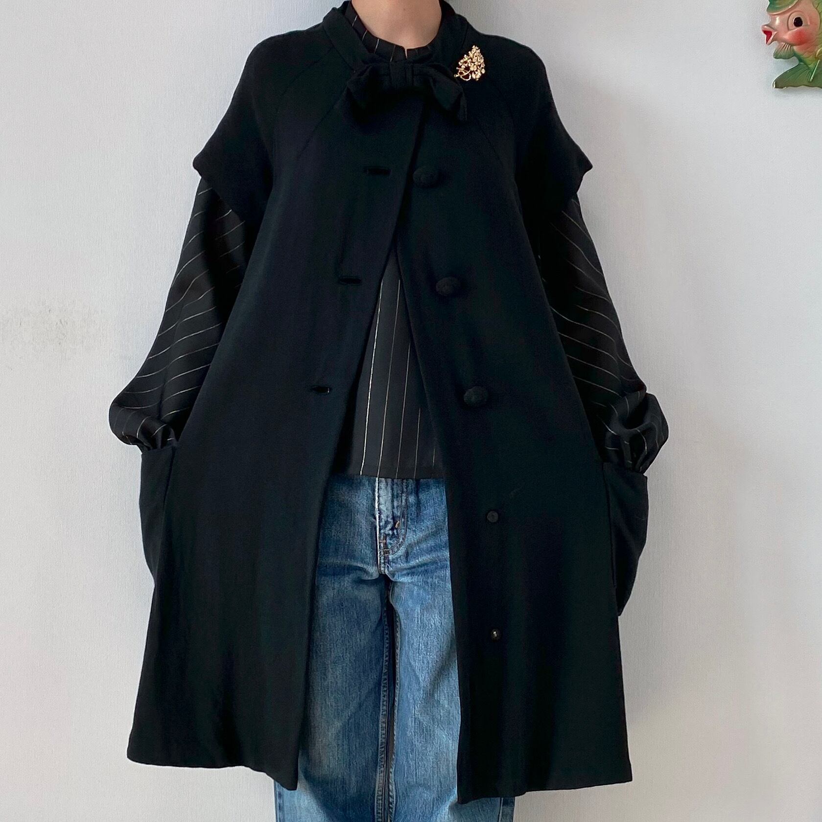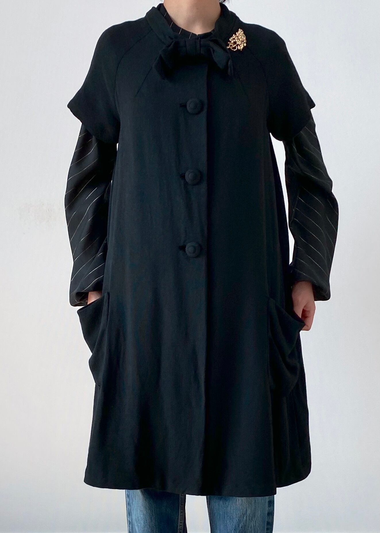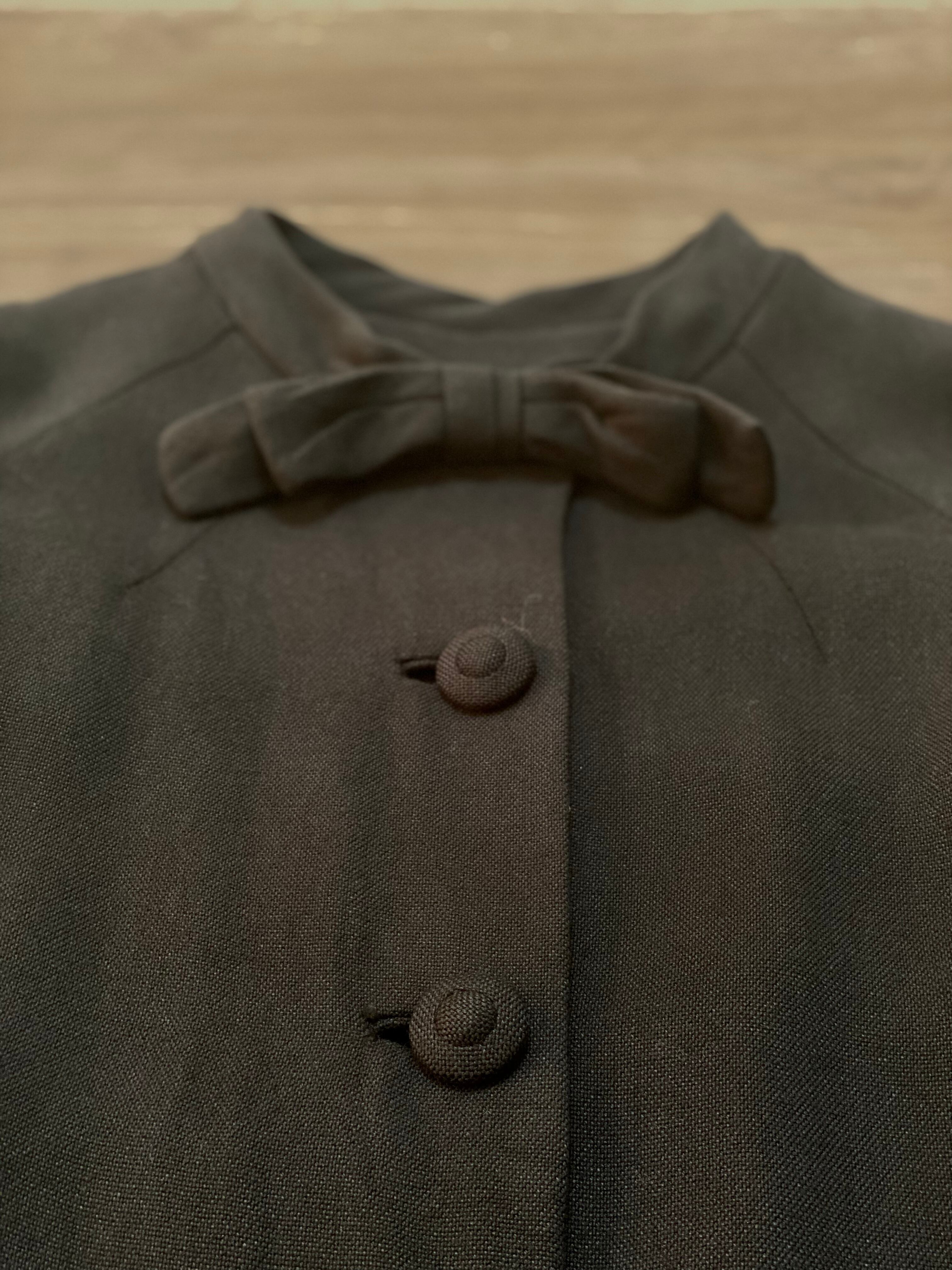 ラグランスリーブの半袖が珍しいブラックコート。襟元のおリボン、共布のくるみボタンが可愛らしいアイテムです。レーヨン混ウールかと思われる柔らかい素材感、少しAラインのシルエットなど50年代の素敵が詰まったお品です。