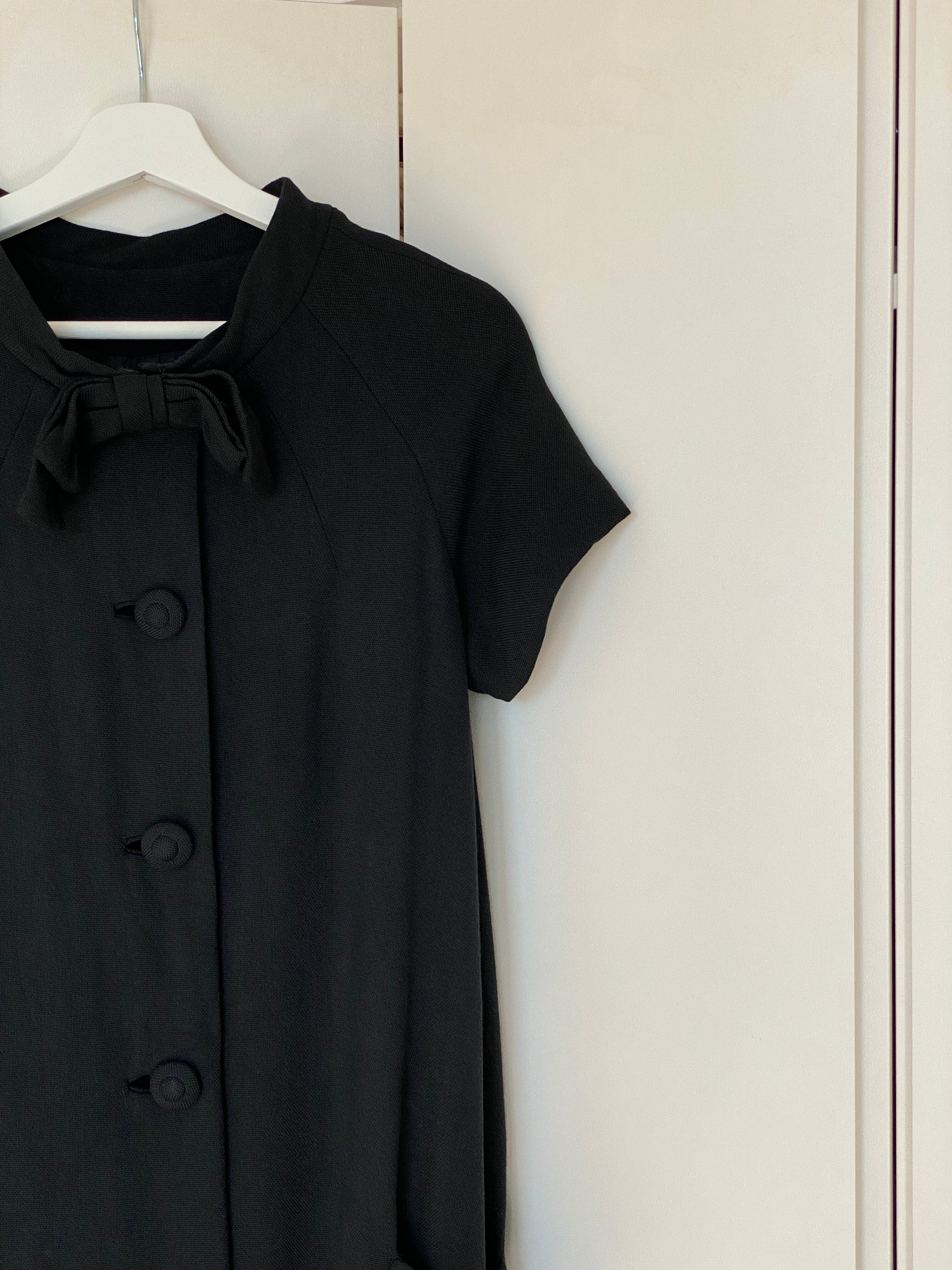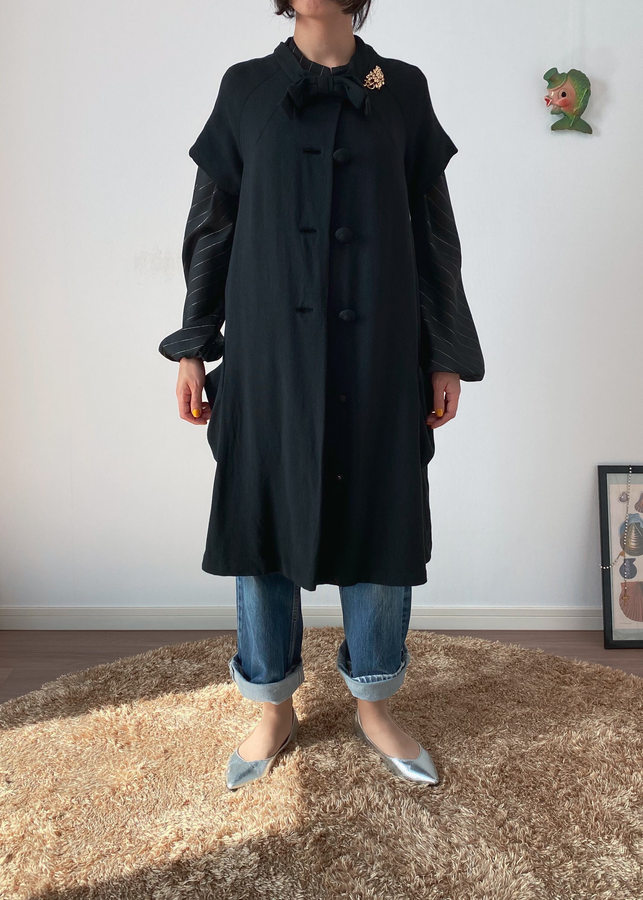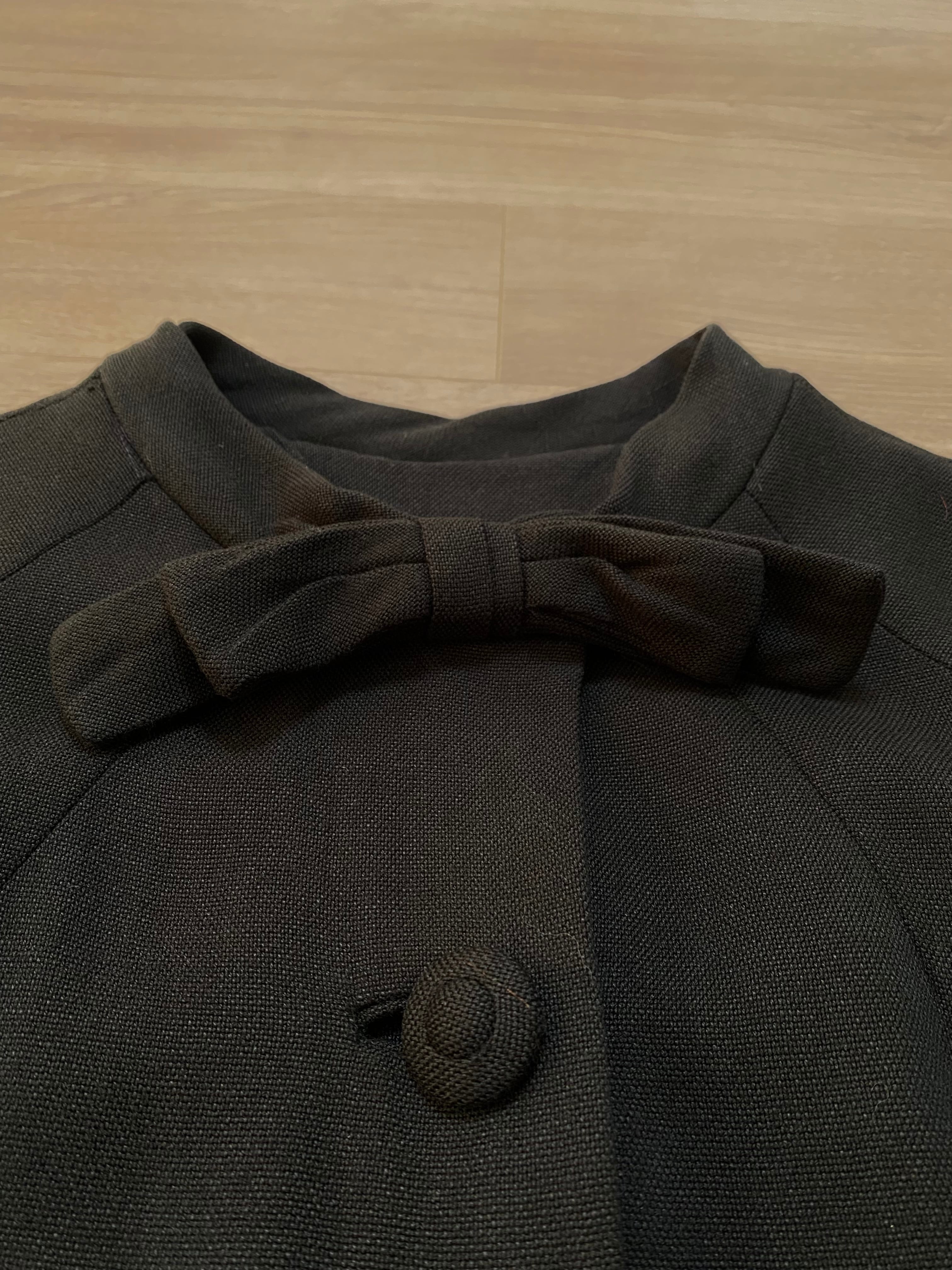 ラグランスリーブの半袖が珍しいブラックコート。襟元のおリボン、共布のくるみボタンが可愛らしいアイテムです。レーヨン混ウールかと思われる柔らかい素材感、少しAラインのシルエットなど50年代の素敵が詰まったお品です。