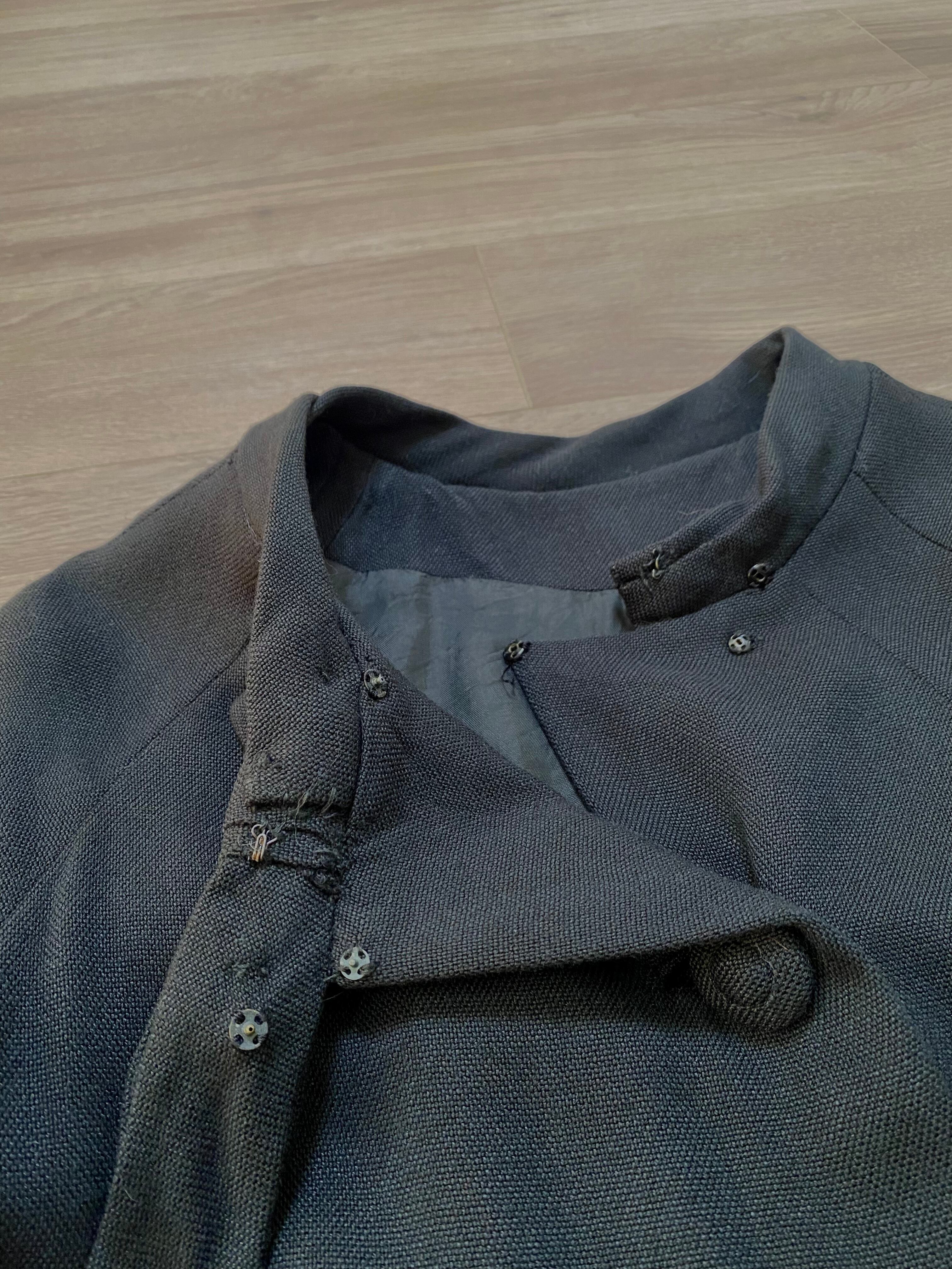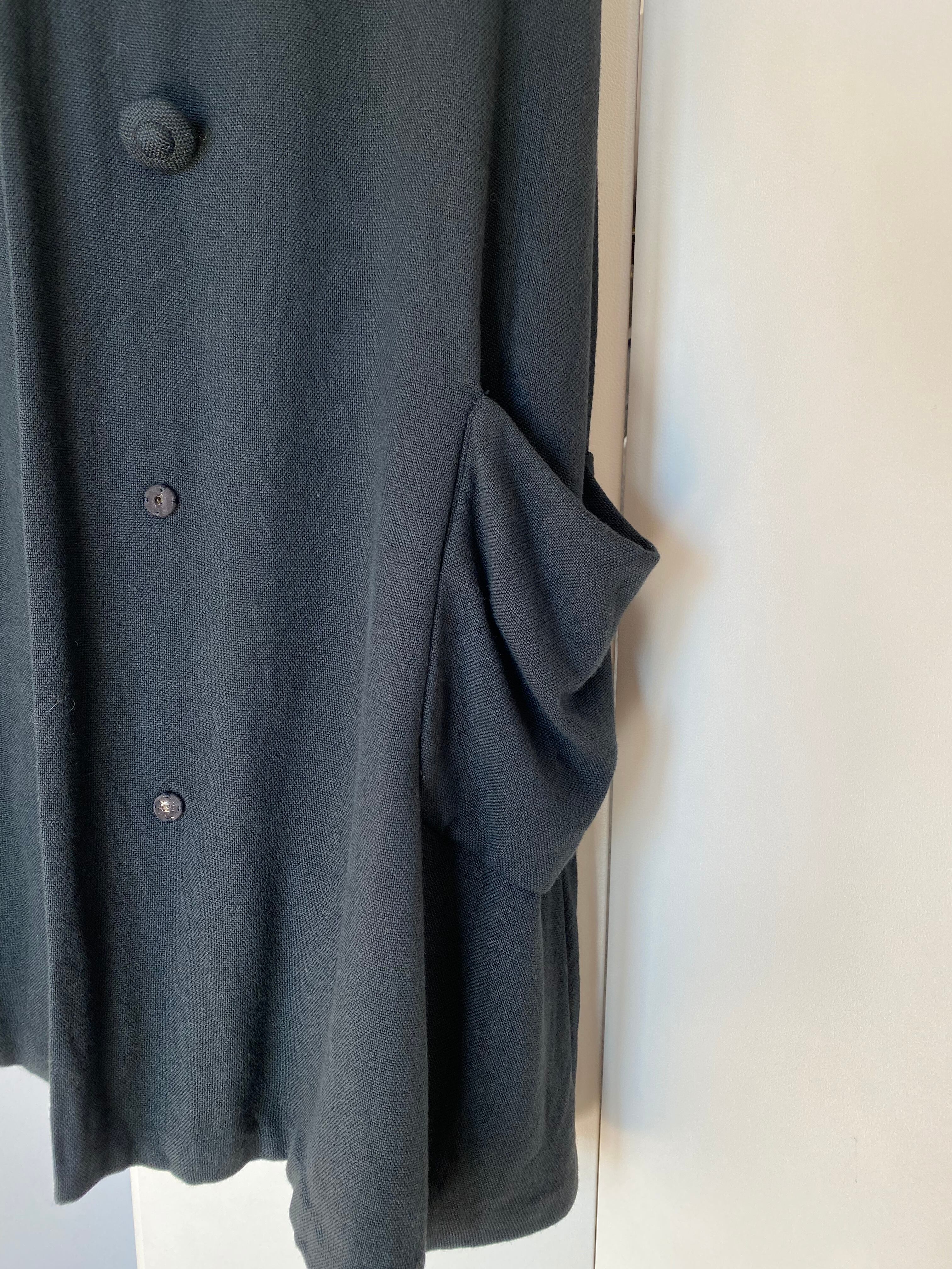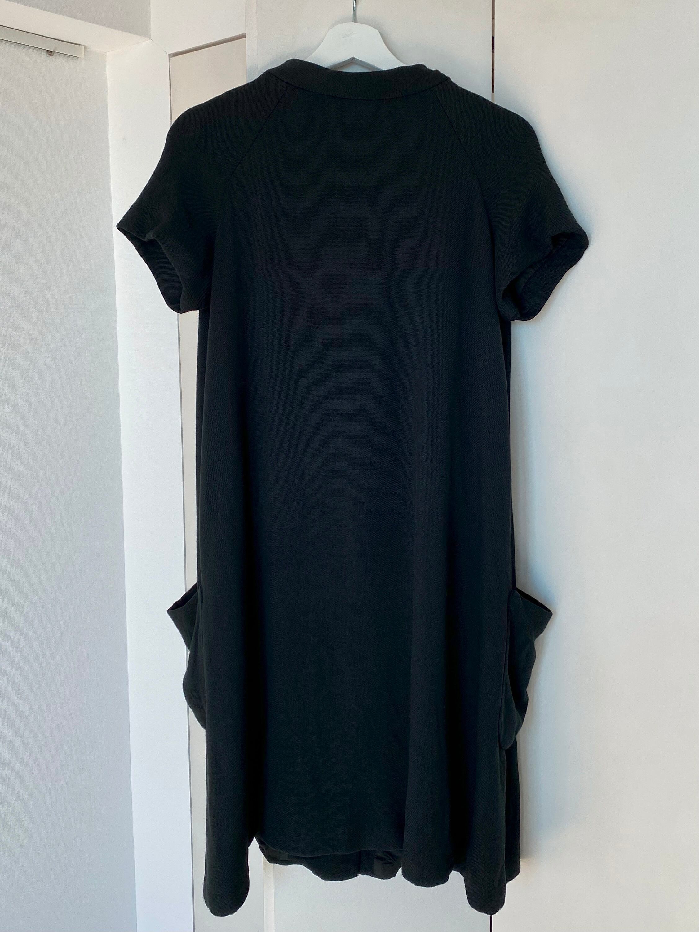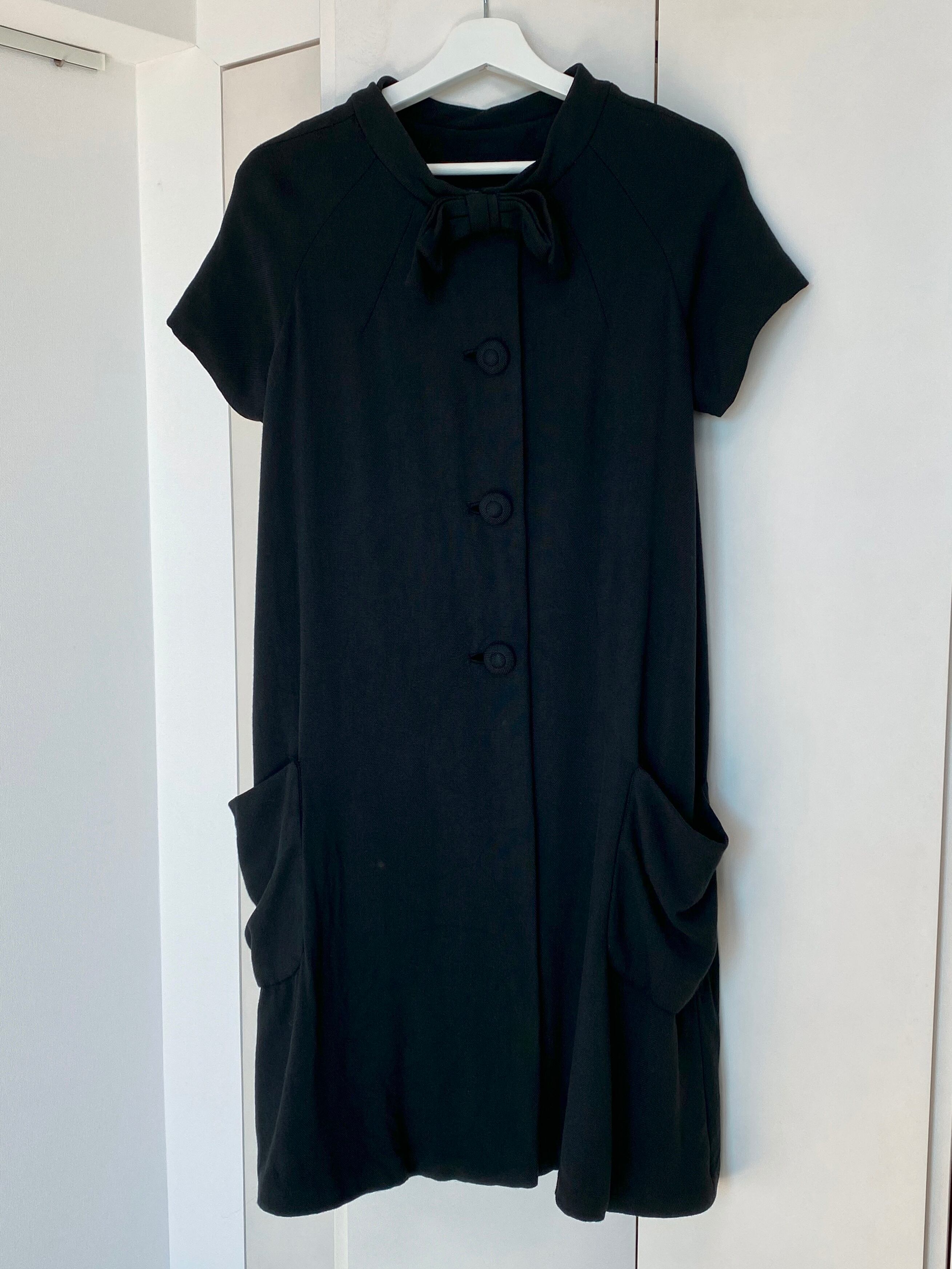 ラグランスリーブの半袖が珍しいブラックコート。襟元のおリボン、共布のくるみボタンが可愛らしいアイテムです。レーヨン混ウールかと思われる柔らかい素材感、少しAラインのシルエットなど50年代の素敵が詰まったお品です。