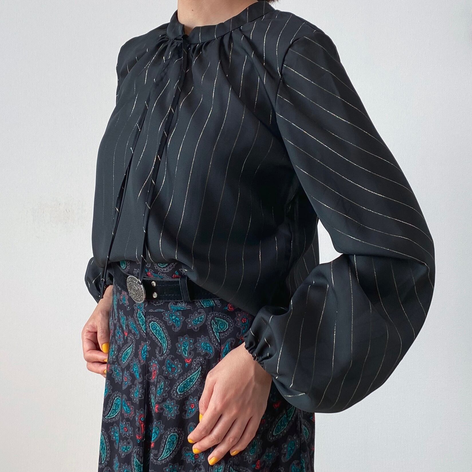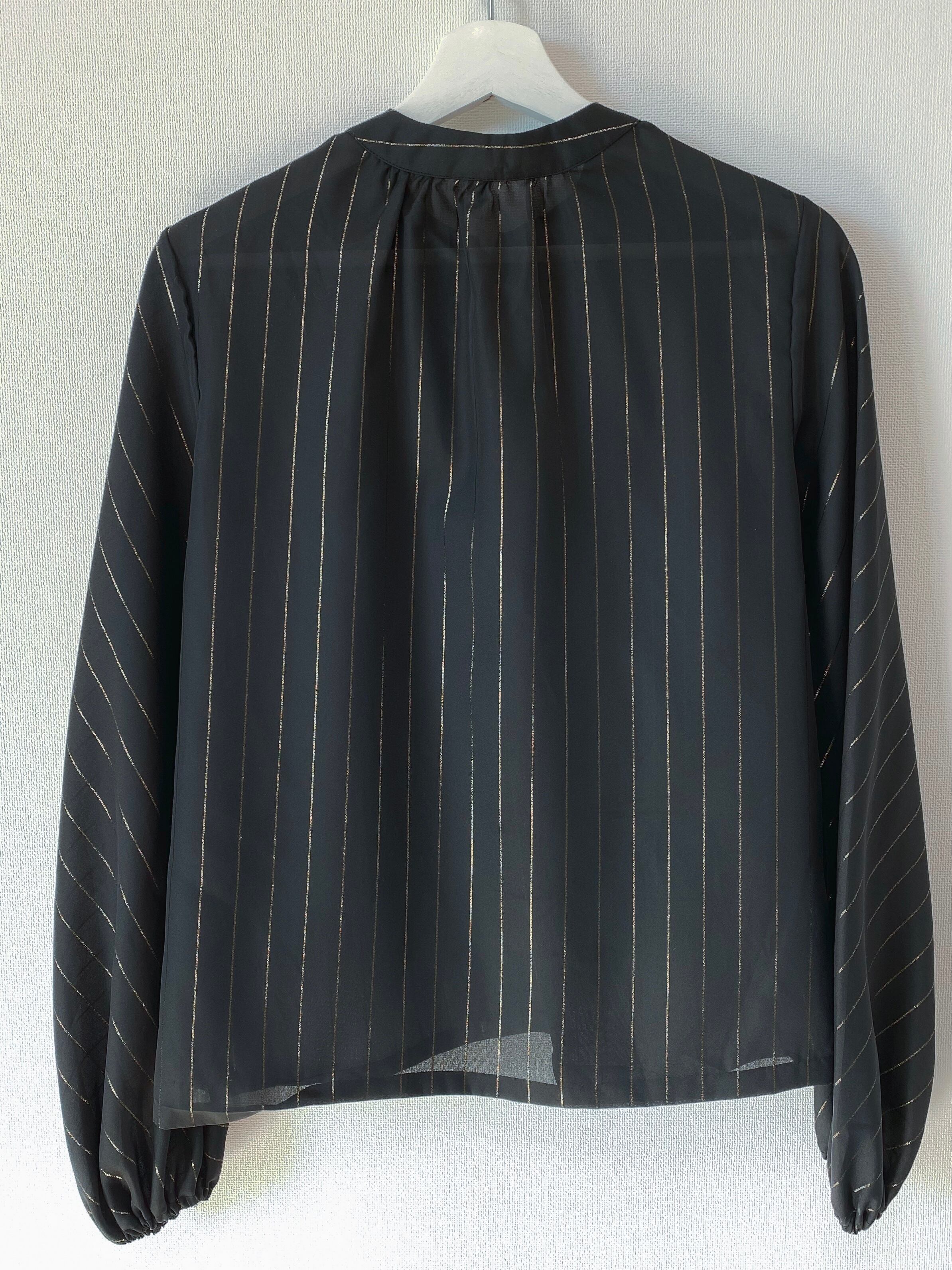 ゴールドラメ糸ストライプのシアーブラウス。ボディは縦ストライプ、お袖は斜めストライプ。襟元はリボンを結ぶデザインです。長めの袖口はギャザーたっぷり。程よい丈感なのでINでもOUTでも着られます。