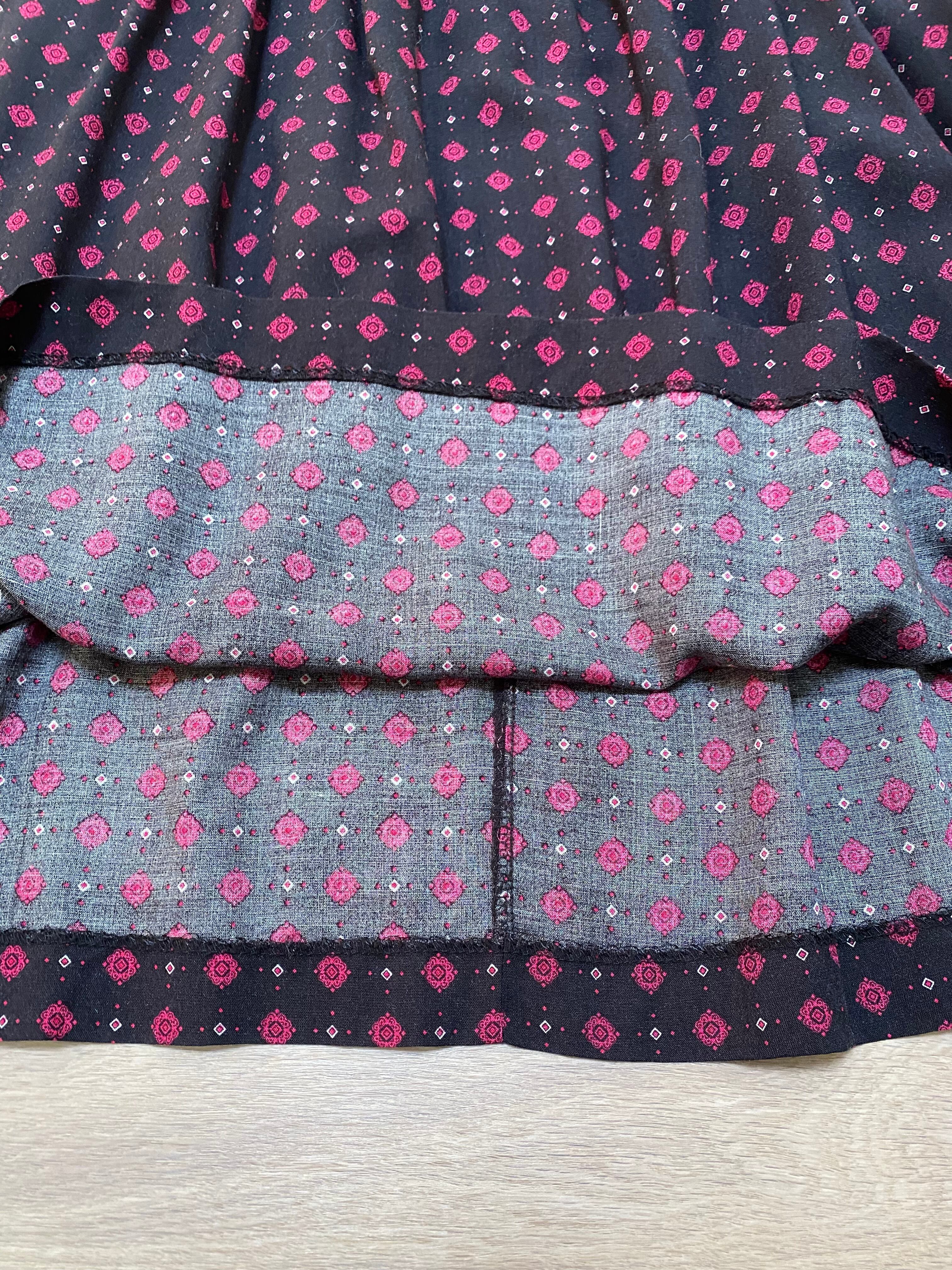 ピンクの小さい紋章柄が印象的なスカート。フロントはタック、バックはギャザーで程よいボリューム感。ウエストはゴム仕様となっております。レーヨン特有の柔らかい素材感で落ち感も美しいお品です。