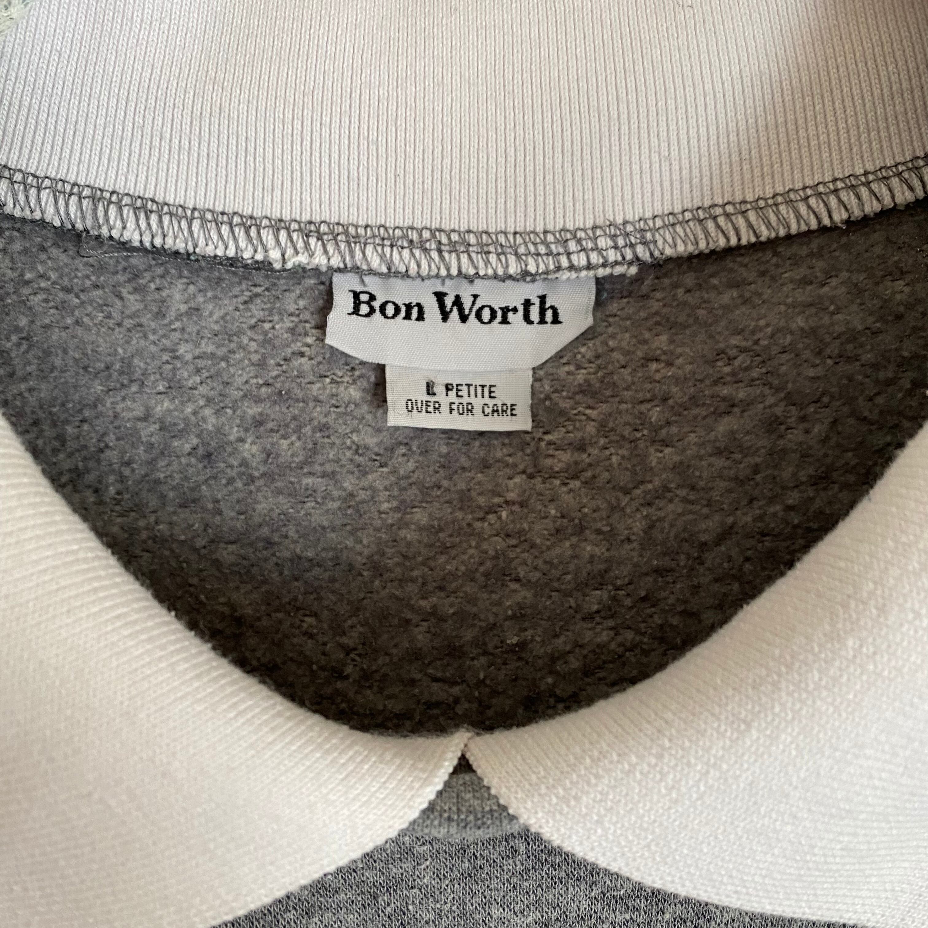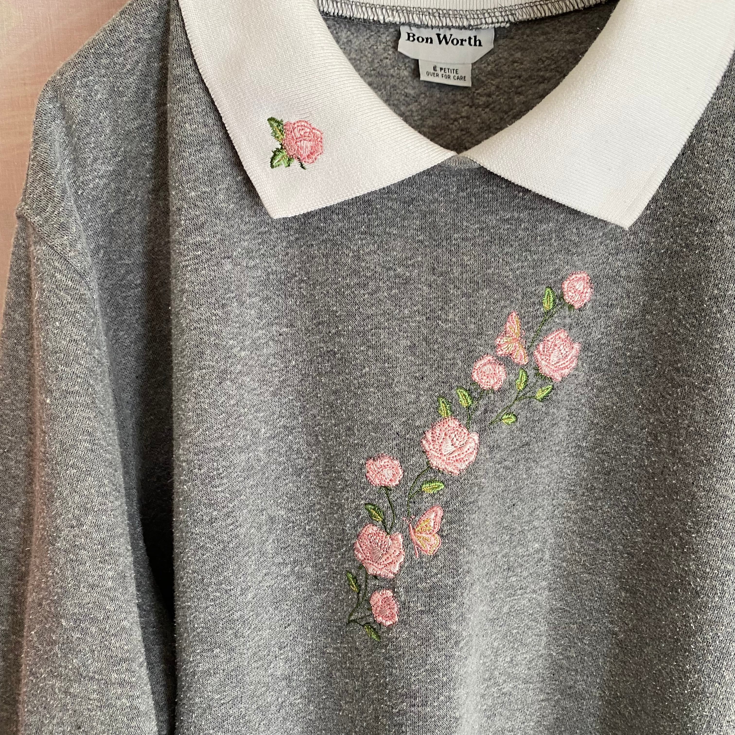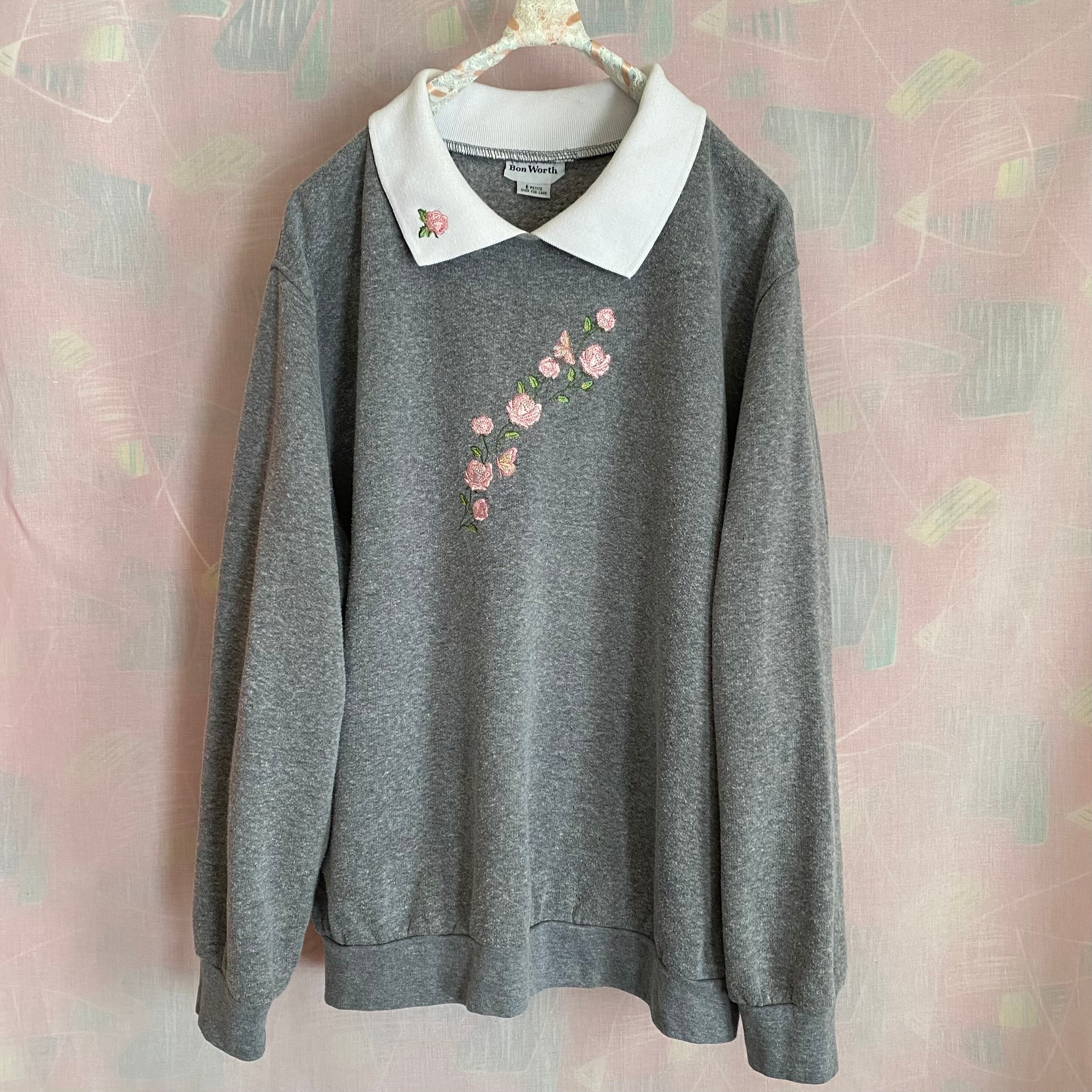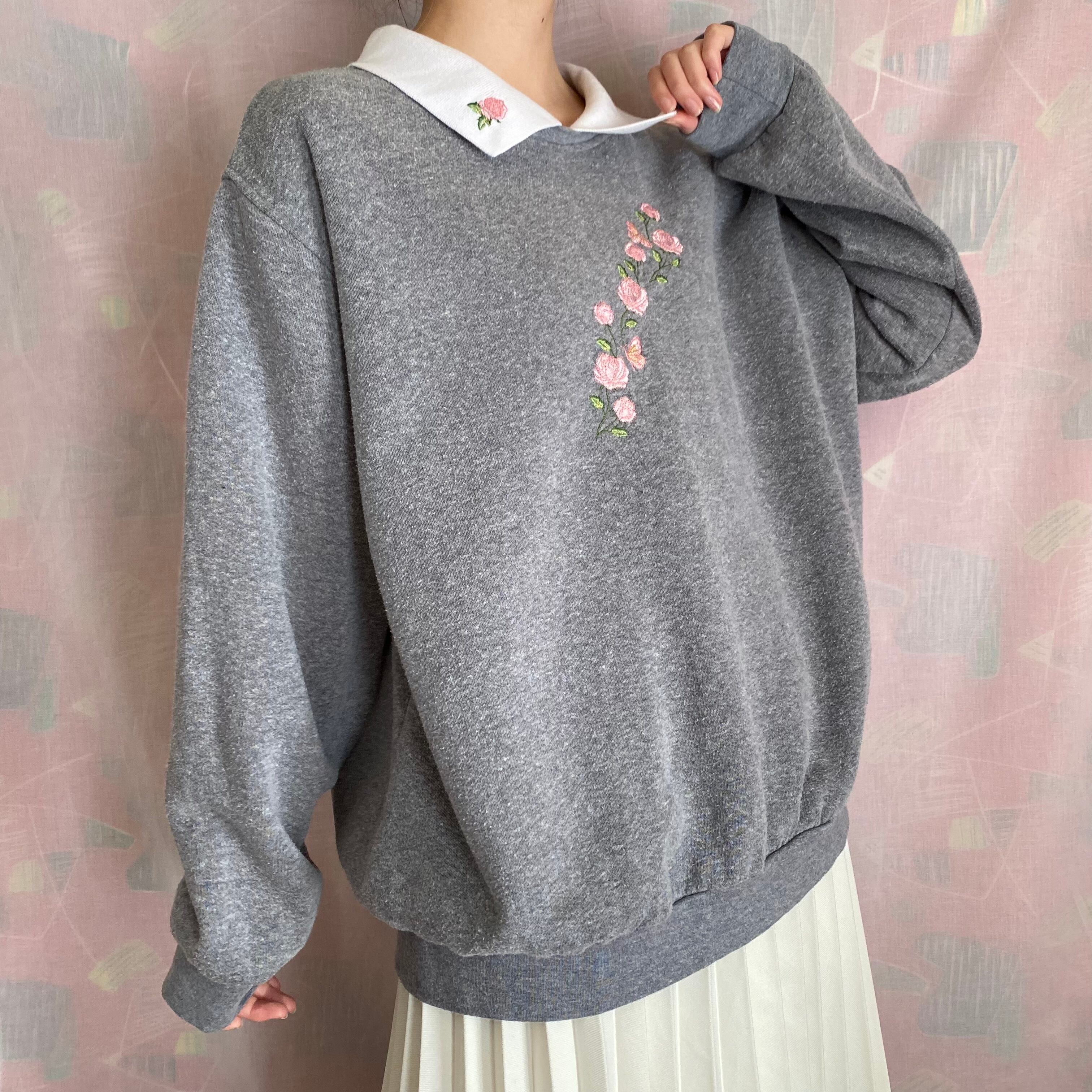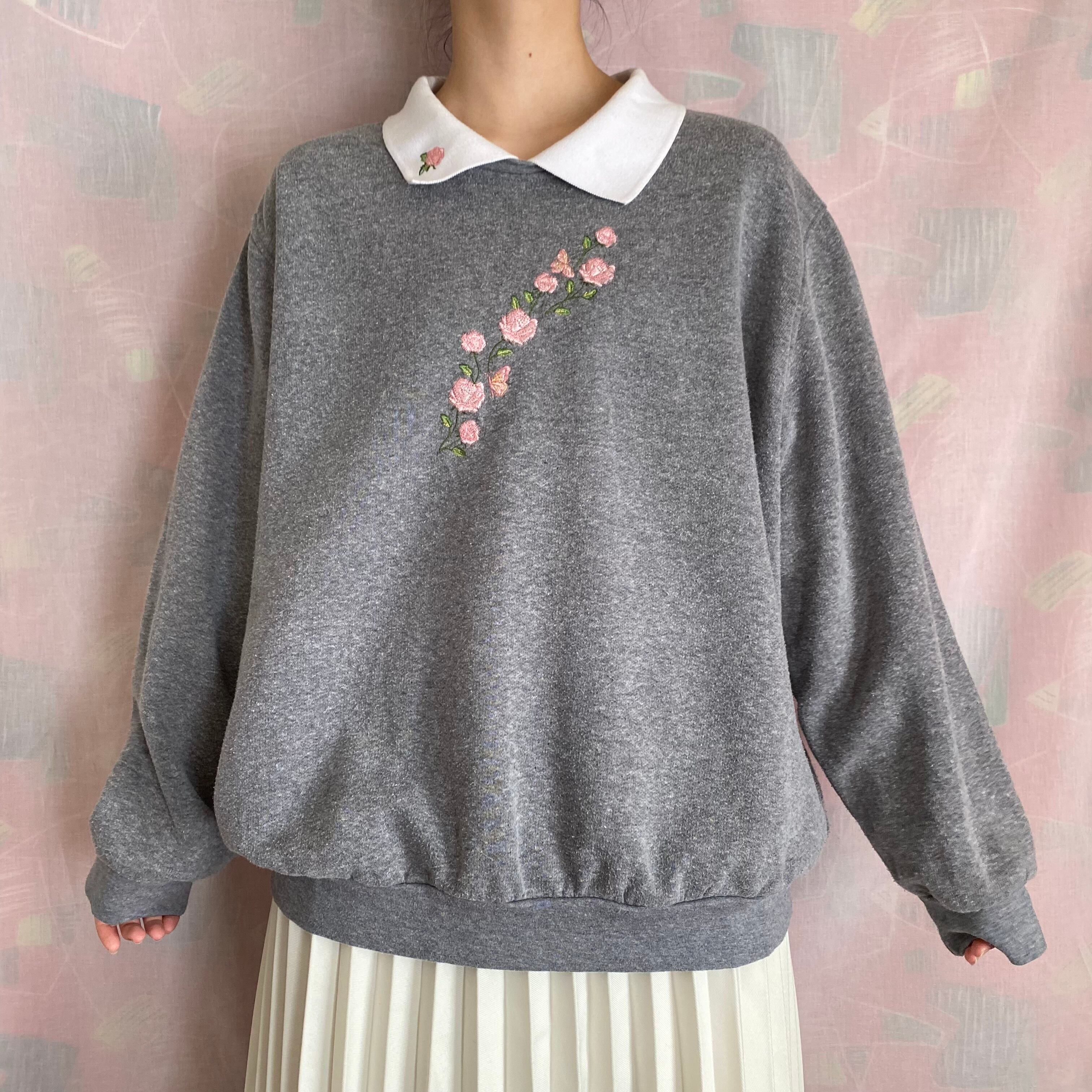 ピンクの薔薇の刺繍が可愛らしい大きめサイズのトレーナーです。白い襟付きのデザインです。身幅は大きめですが、丈感は長すぎず、ボトムスとのバランスも良いお品です。