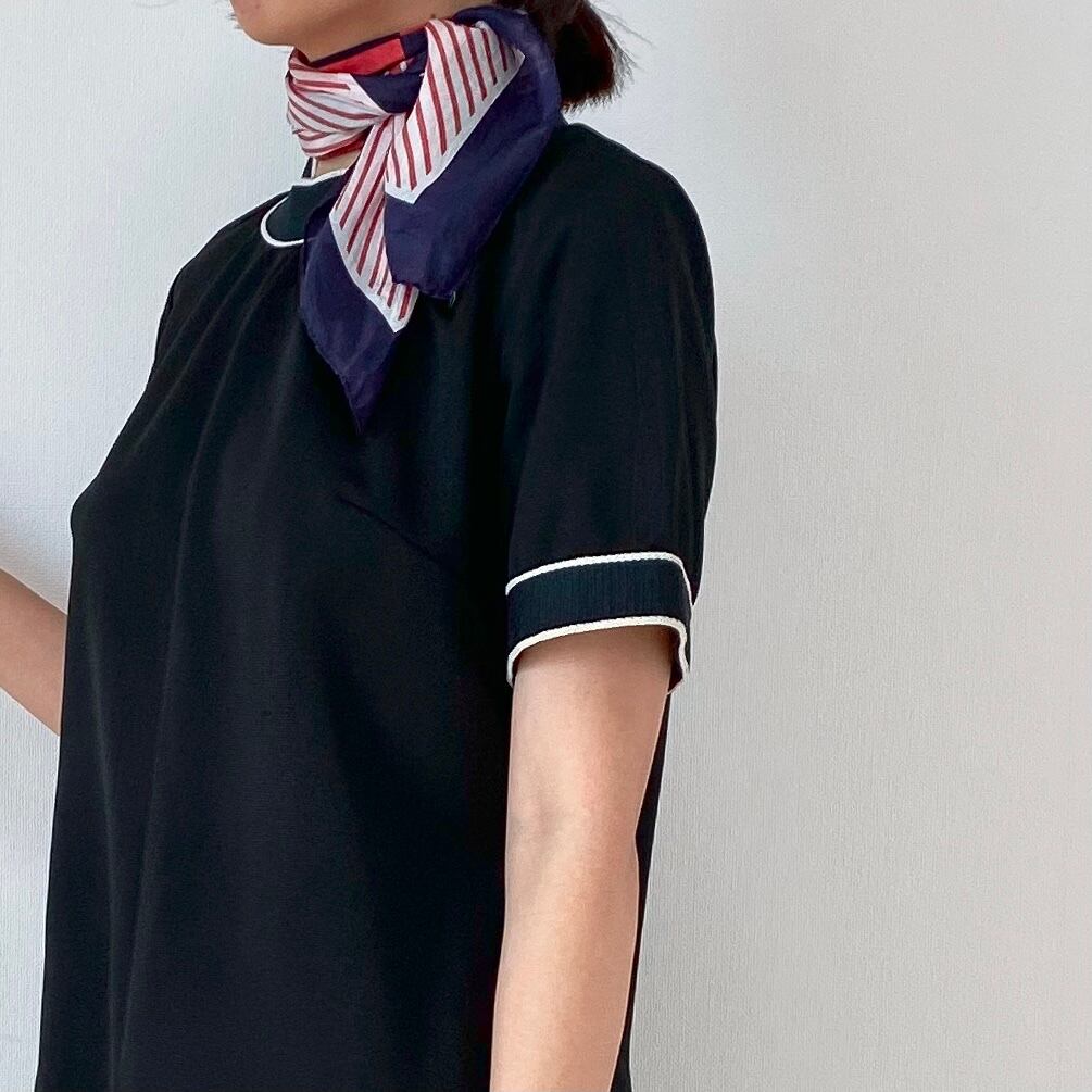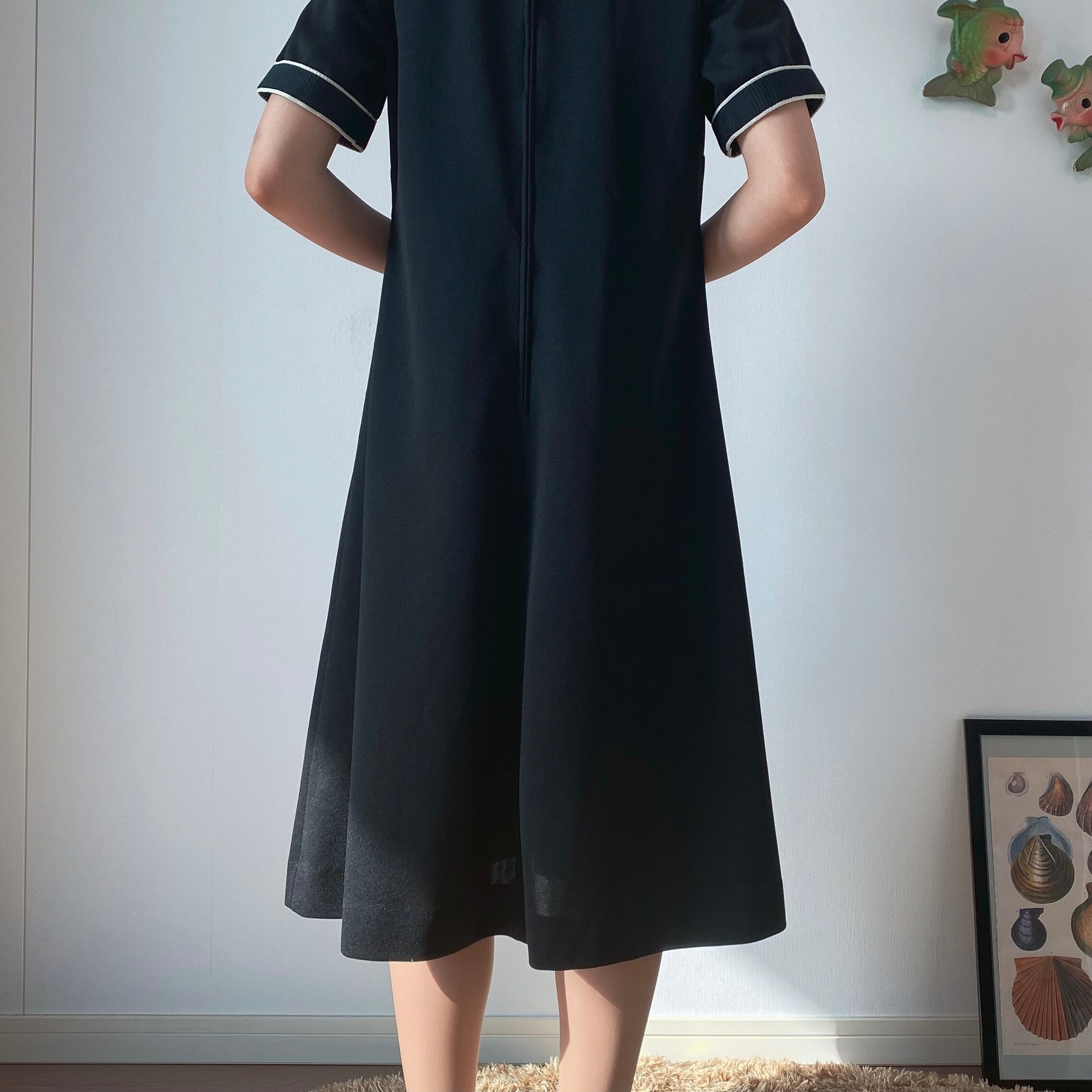 黒のAラインワンピース。首周りと袖口はリブになっています。肩の辺りはコンパクト、裾に向かって程よいフレアーが広がる綺麗なシルエット。絶妙に入った白いラインがスポーティな印象のお品です。