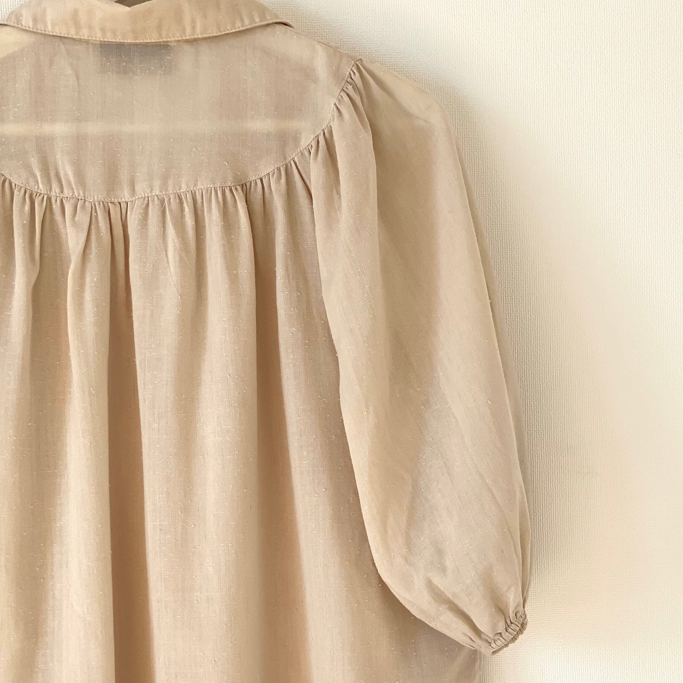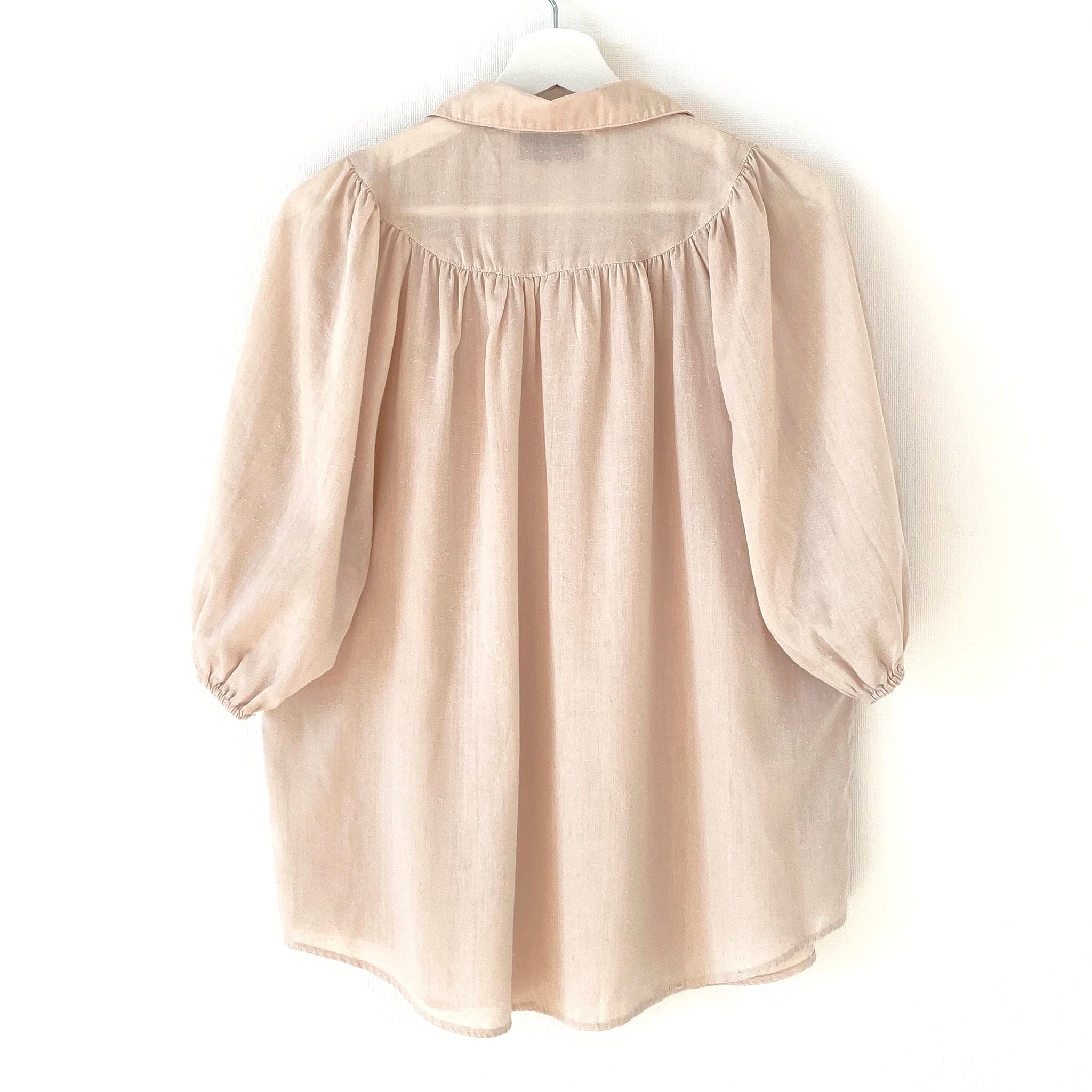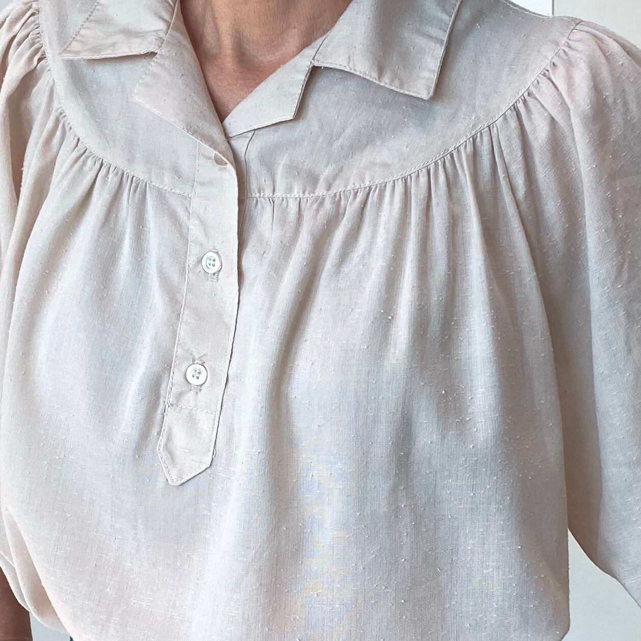 5分丈バルーンスリーブが印象的なブラウス。ドルマンスリーブ。フロントバックもギャザー使いなのでふわっとボリューミーなシルエット。柔らかく肌触りも良いネップ生地のお品です。