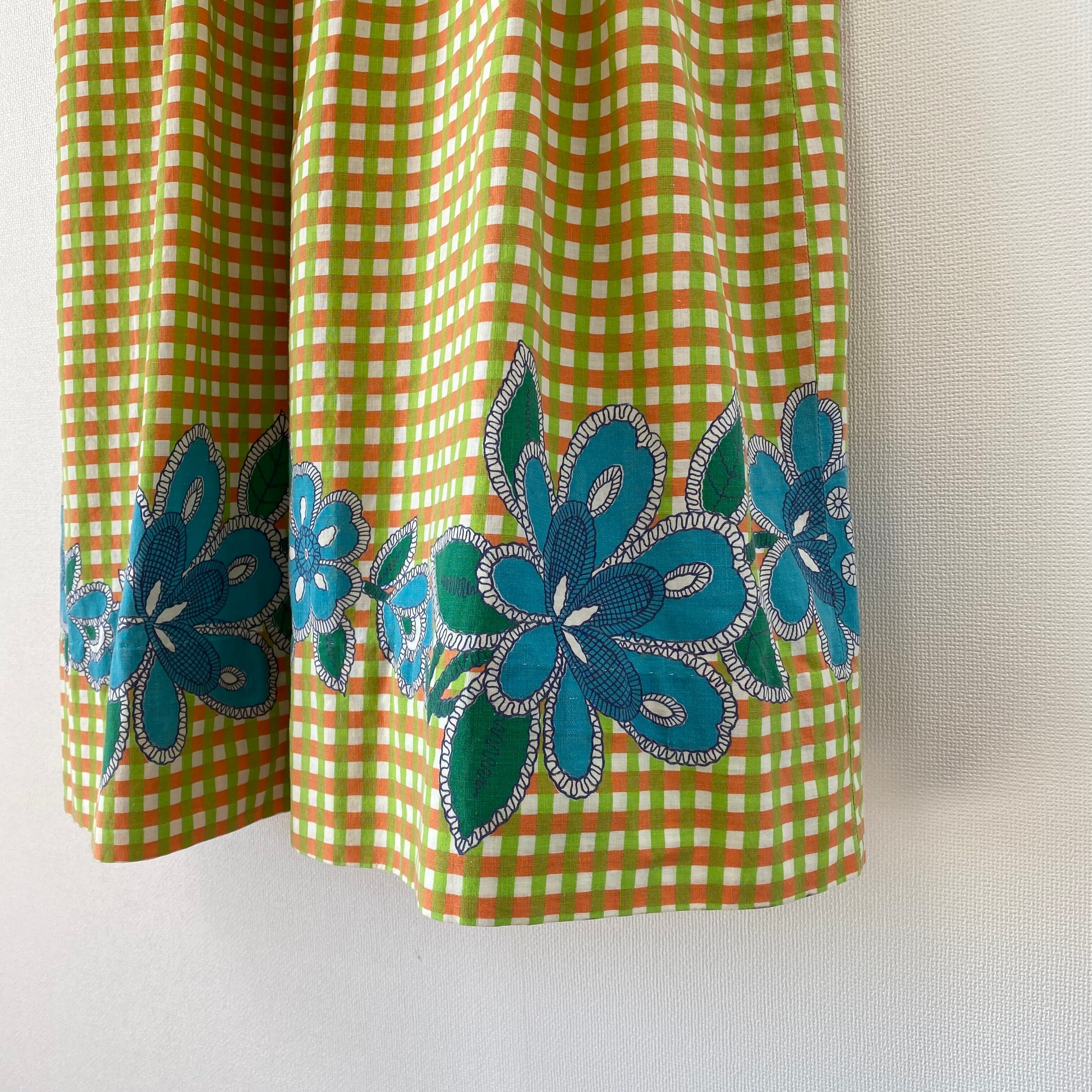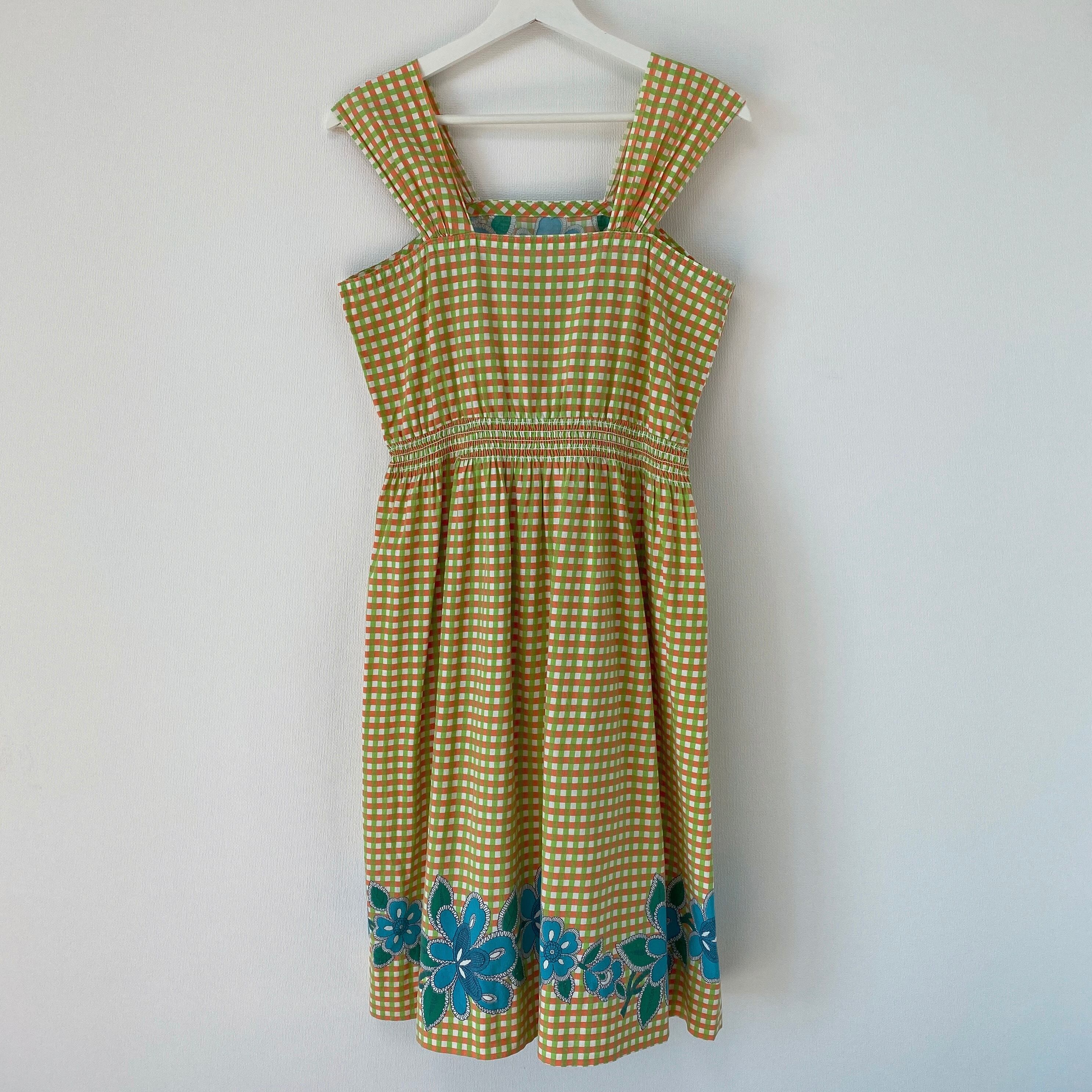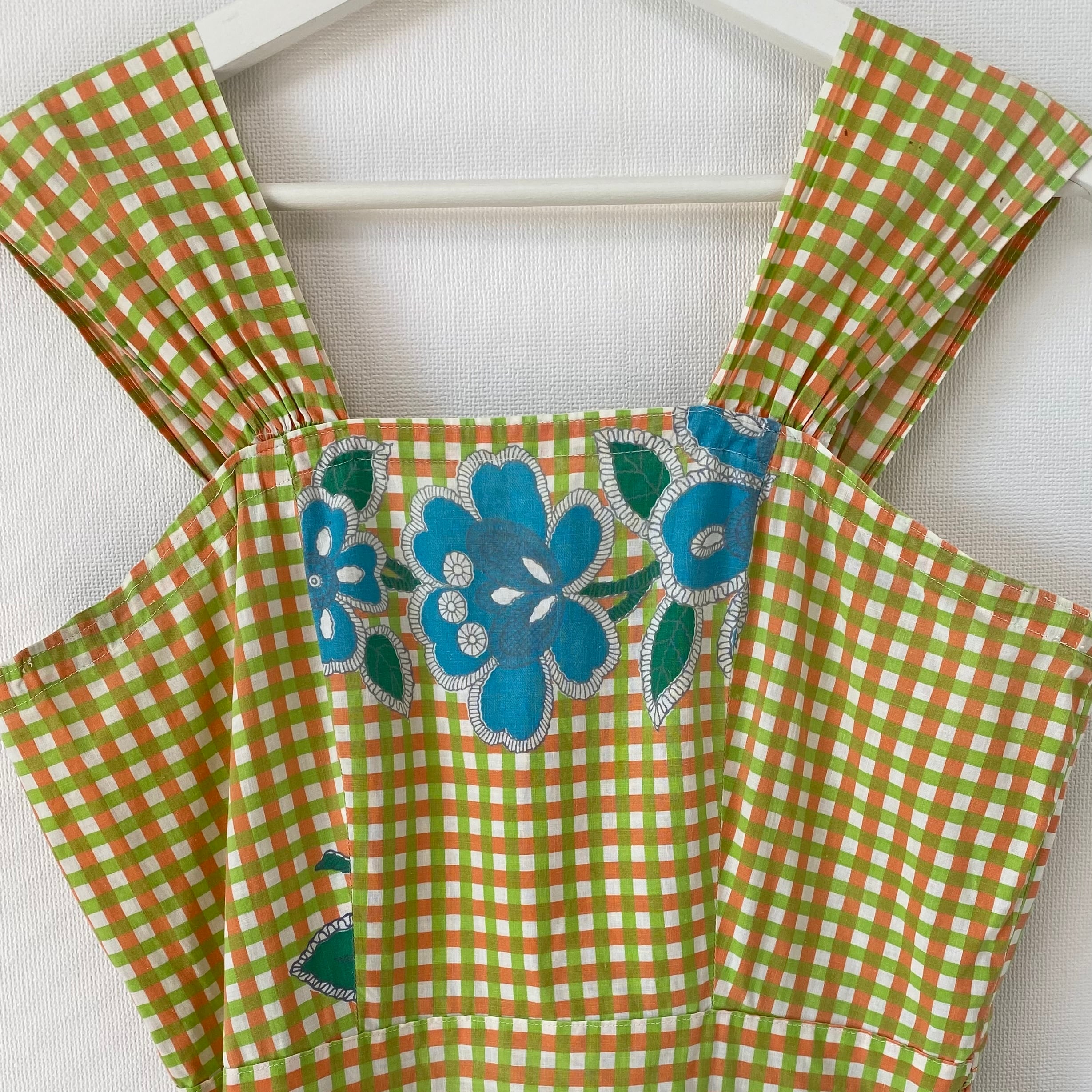 黄緑×オレンジチェックにターコイズカラーのフラワープリントがハッピーな印象のワンピース。ショルダー幅が太いデザインもガーリー。バックのウエスト部分がスモッキングなのも可愛いです。