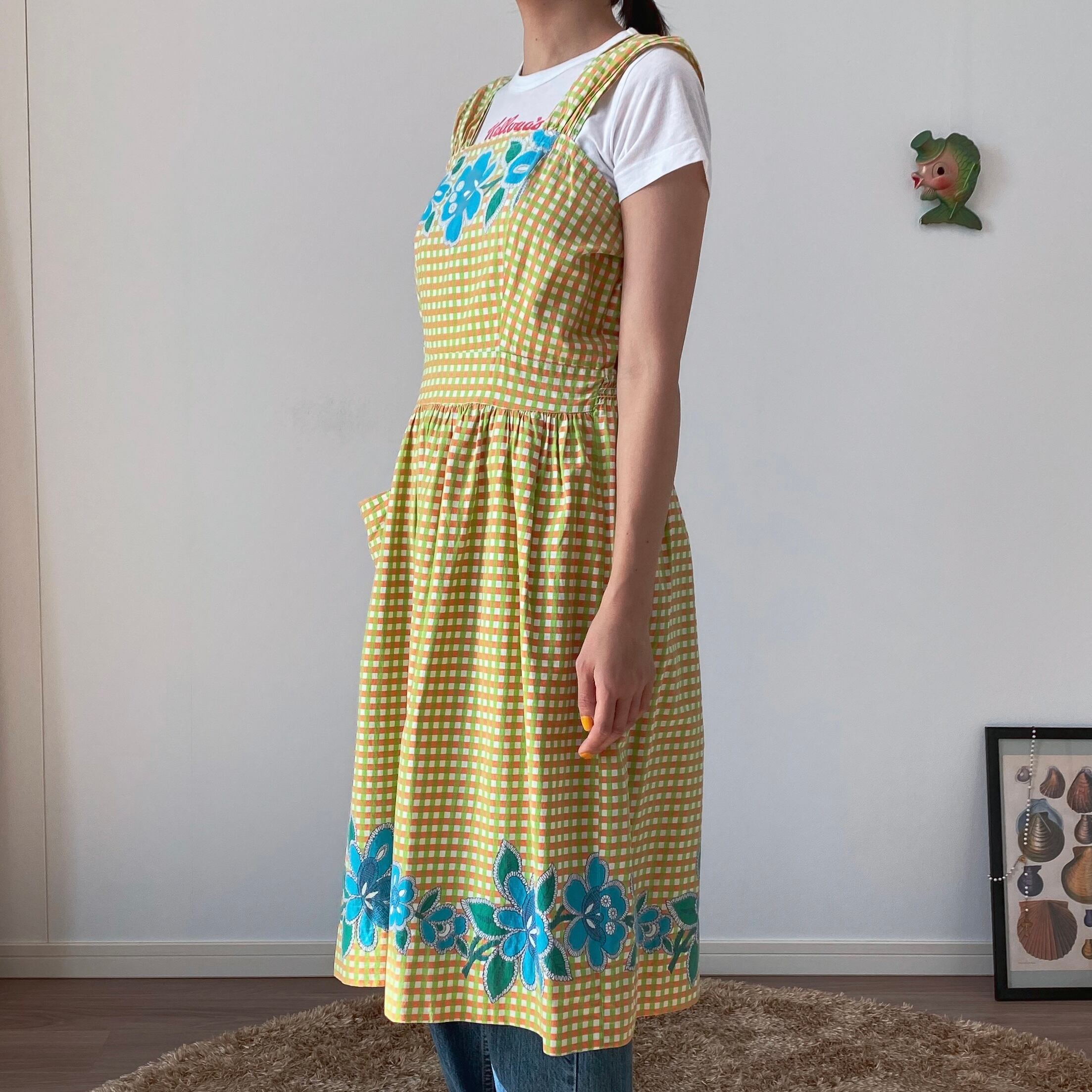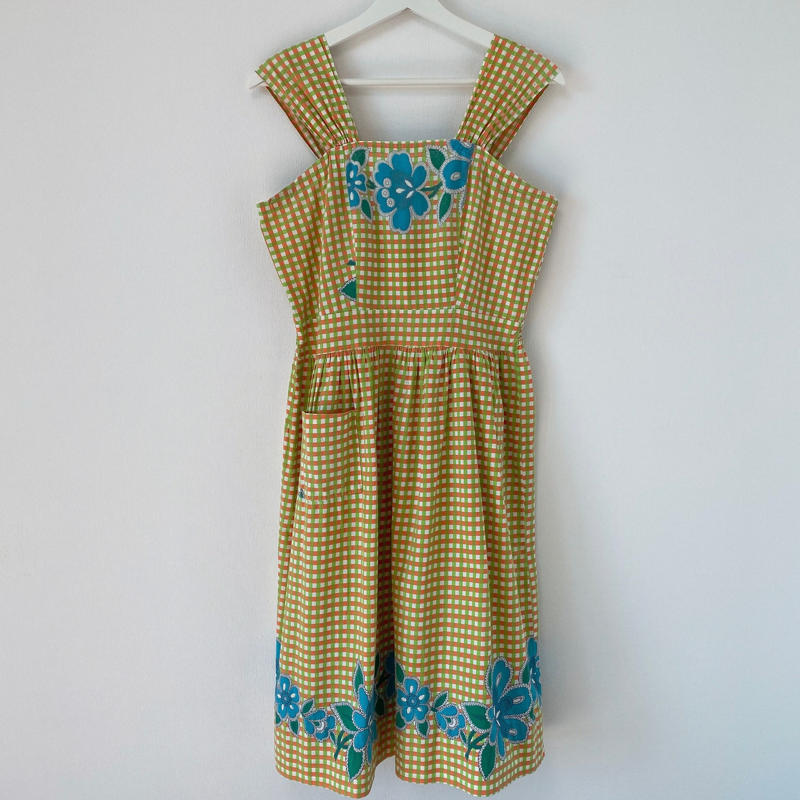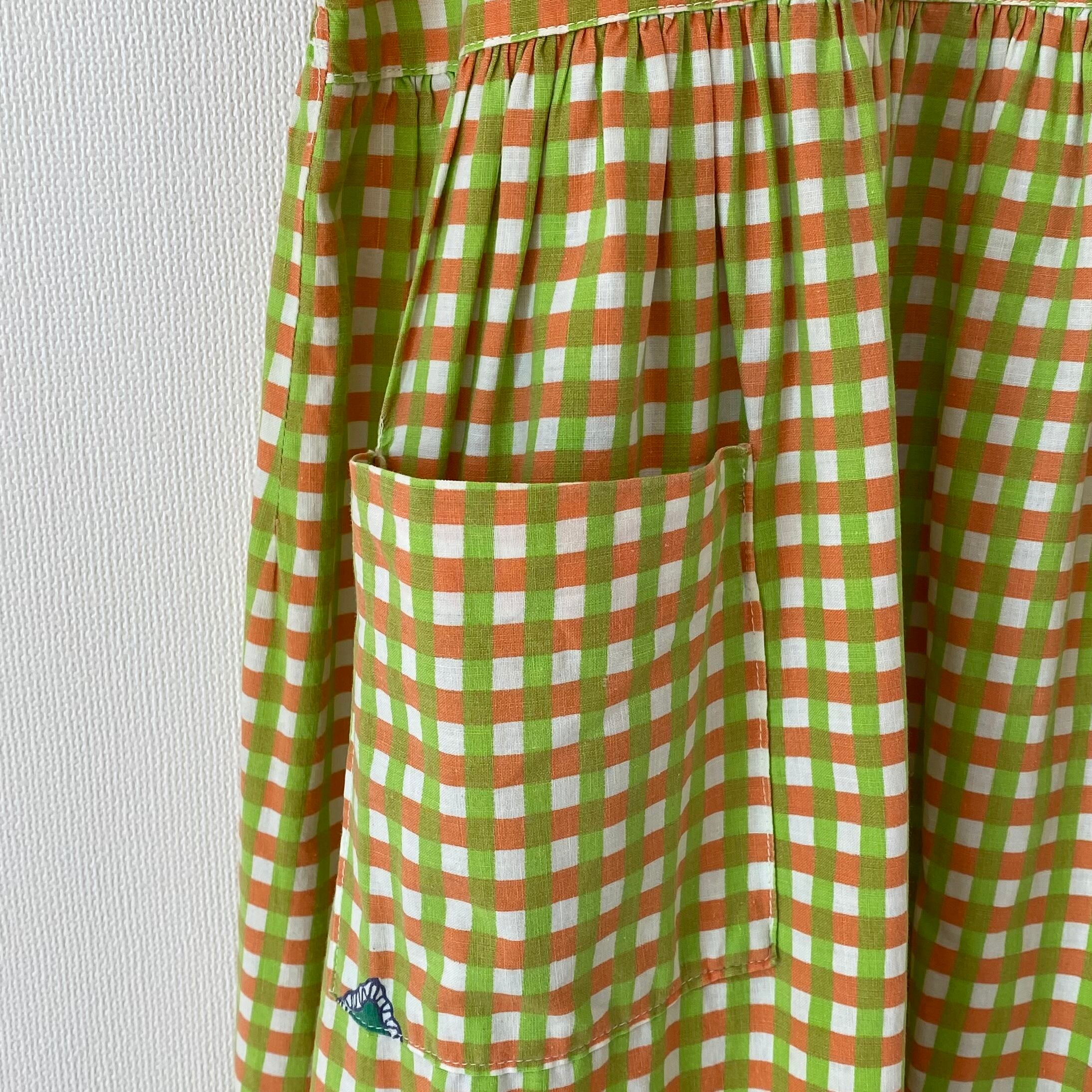 黄緑×オレンジチェックにターコイズカラーのフラワープリントがハッピーな印象のワンピース。ショルダー幅が太いデザインもガーリー。バックのウエスト部分がスモッキングなのも可愛いです。