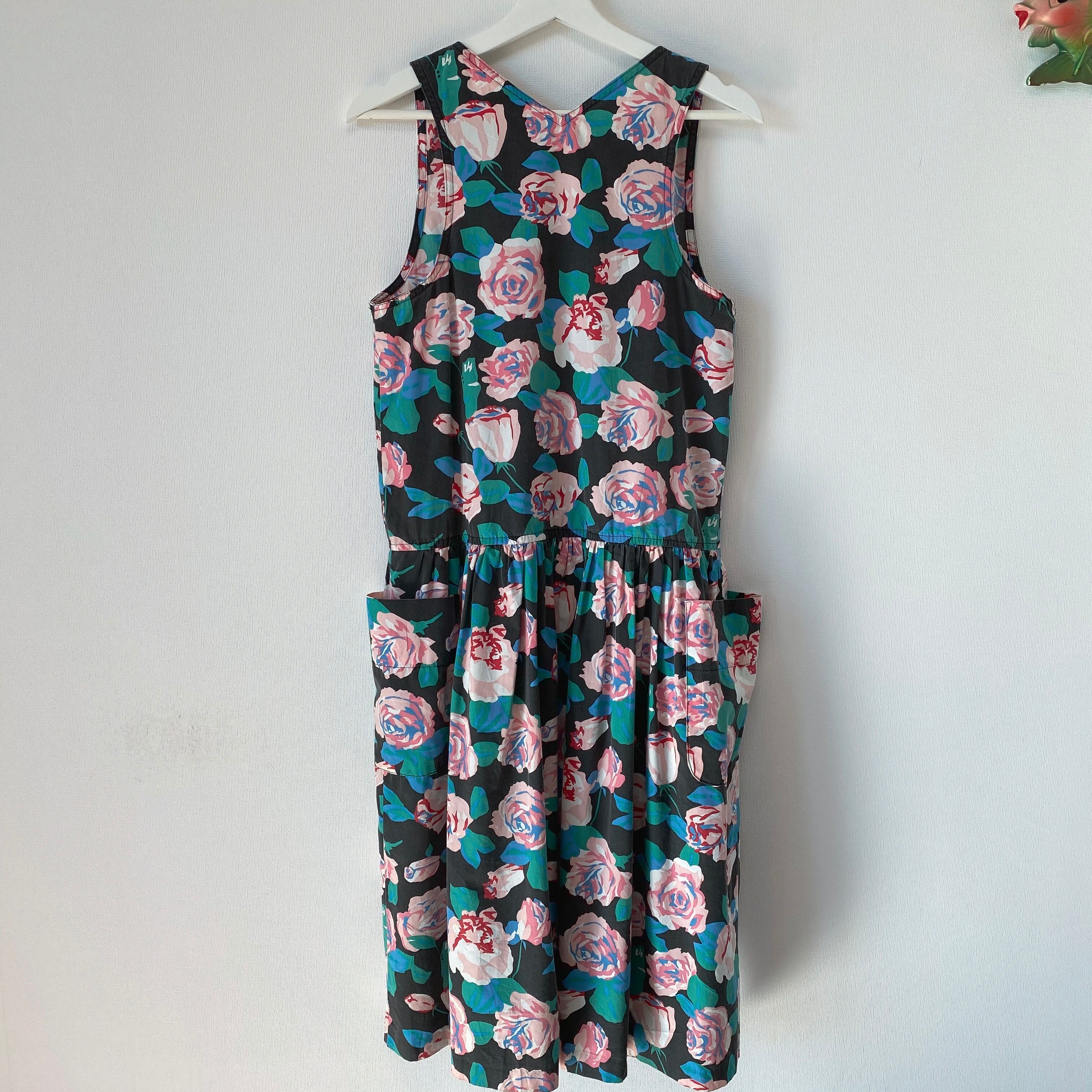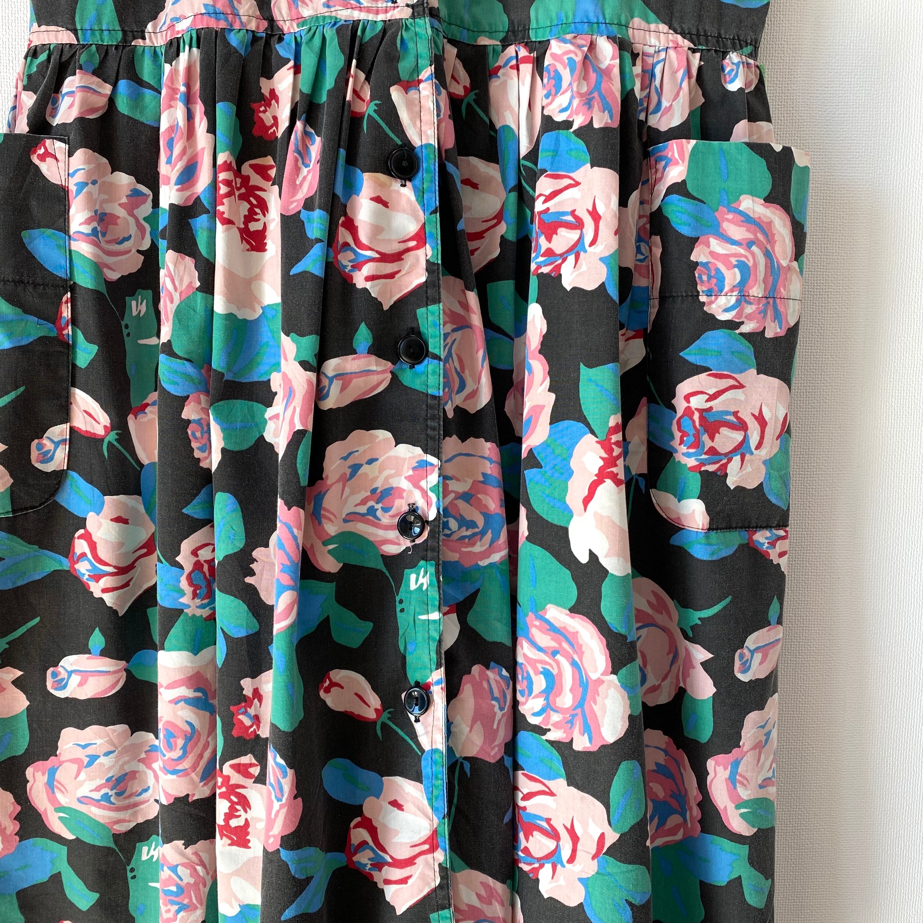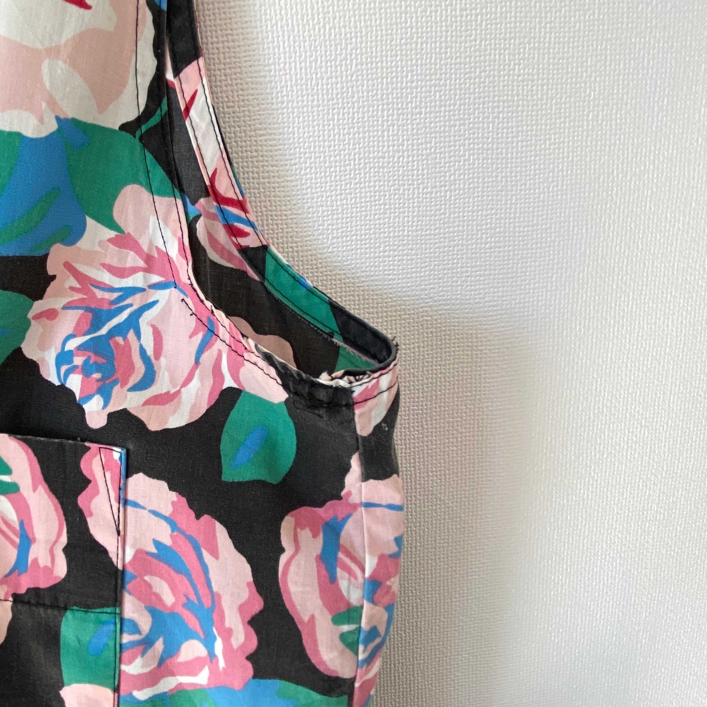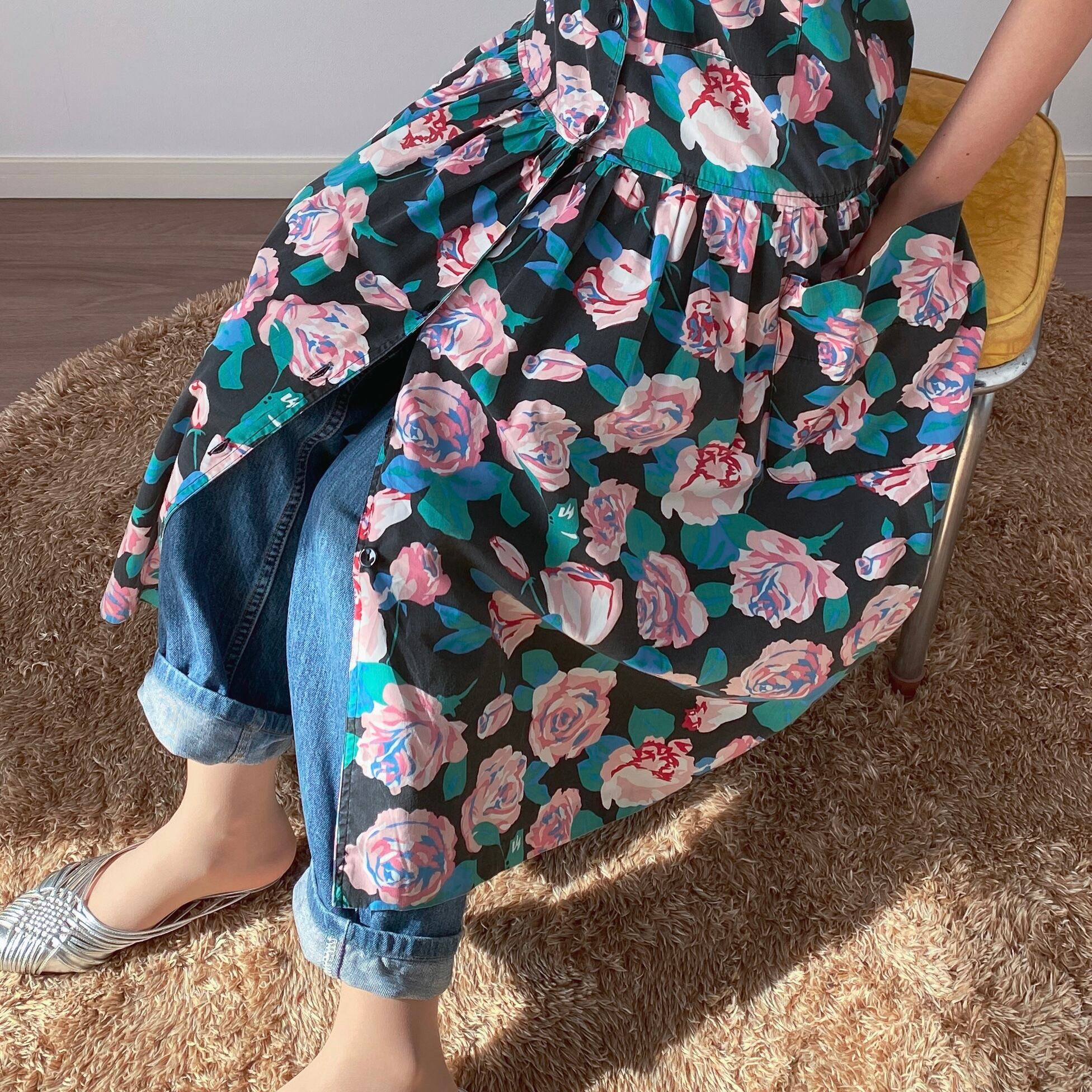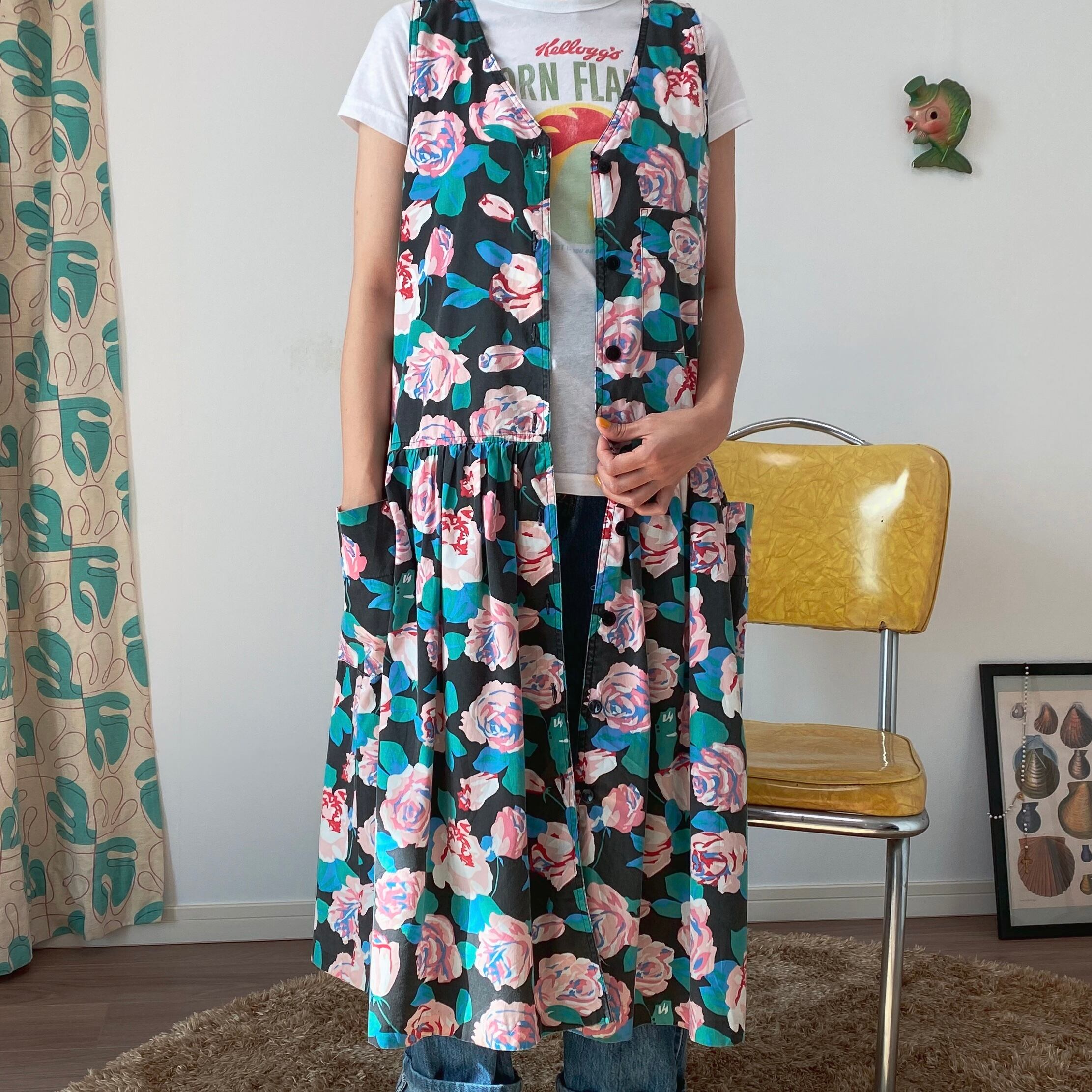 フロントオープンのワンピース。ホームメイドかと思われます。左右の大きなアウトポケットが可愛いです。経年による色褪せでくすみ感が程良く、フロントオープンなのでジレ代わりに楽しめます。