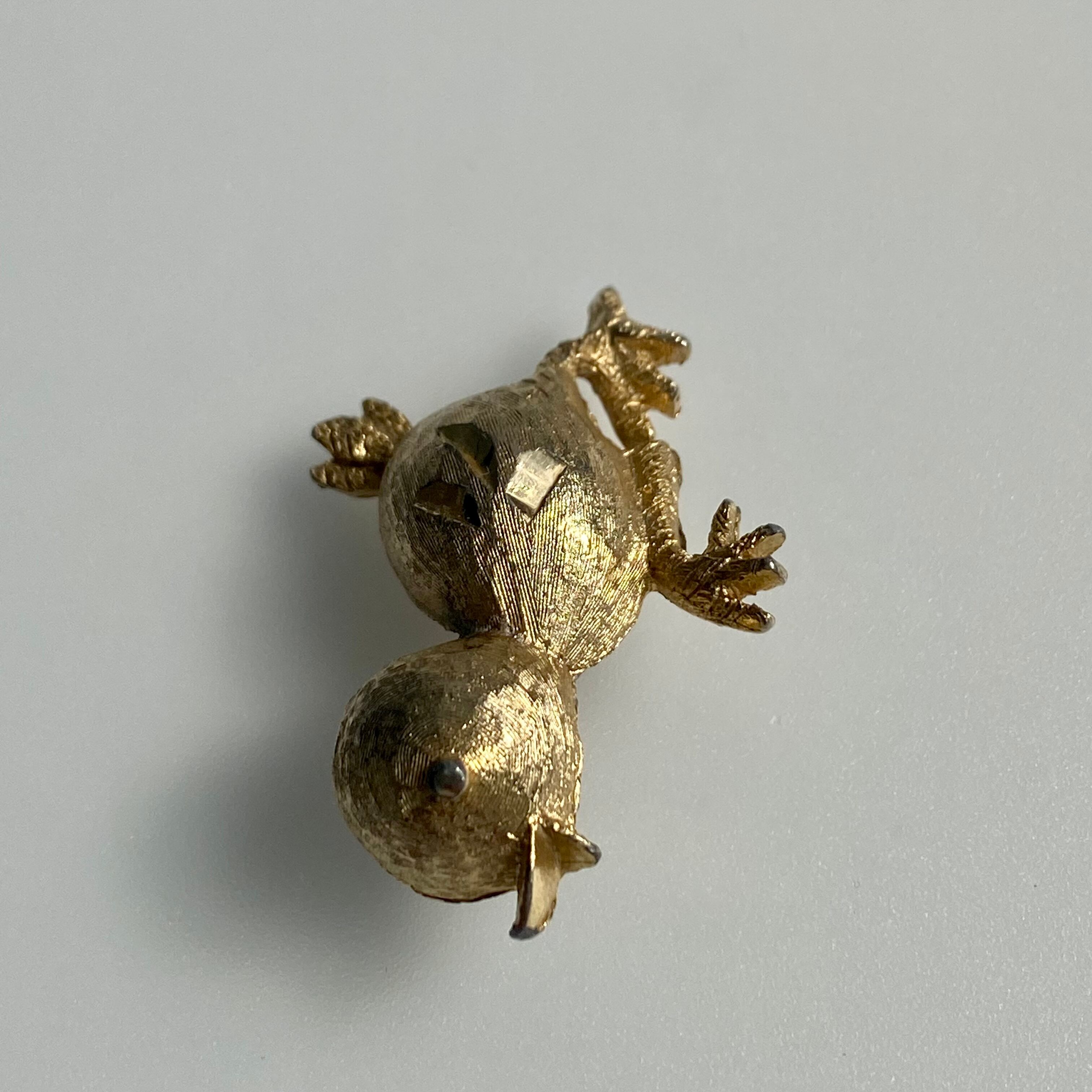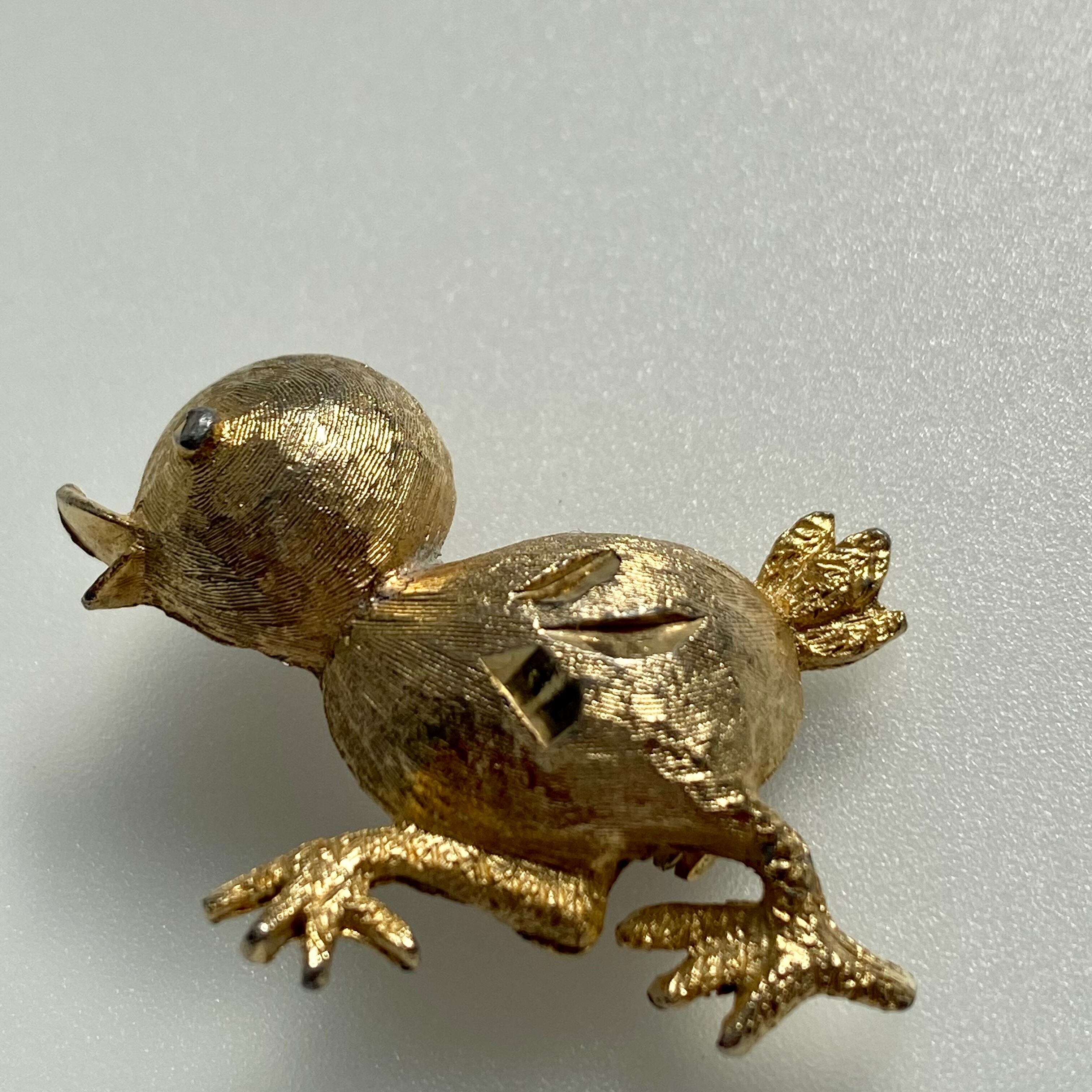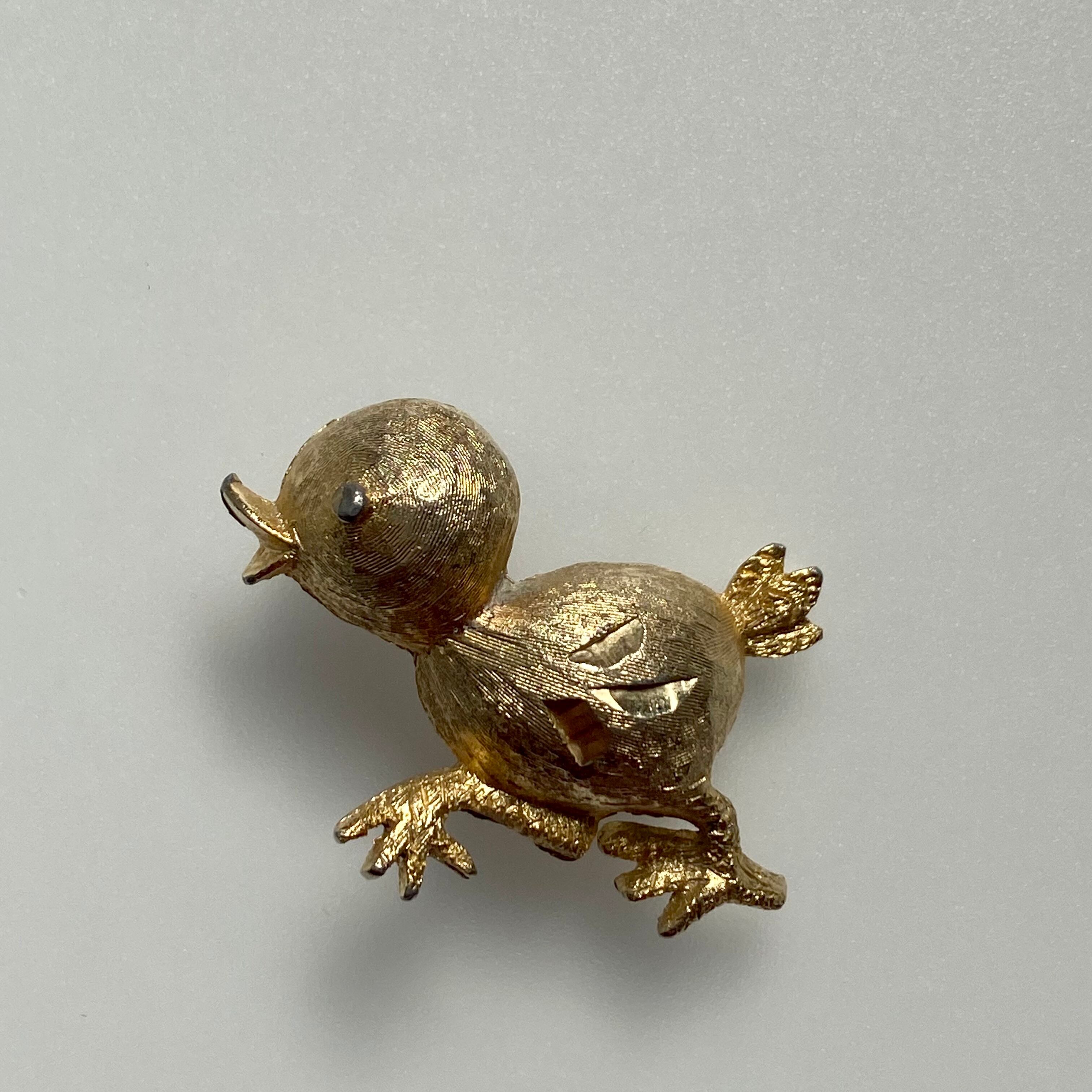 アメリカのコスチュームジュエリーメーカー「マムゼル」のヒヨコブローチ。マットゴールドメタルに羽毛のテクスチャー、センターに入った素敵なカッティングがマムゼルの特徴です。小さなヒヨコが一生懸命走っている愛らしいデザインのお品です。裏に「MAMSELL」の刻印があります。