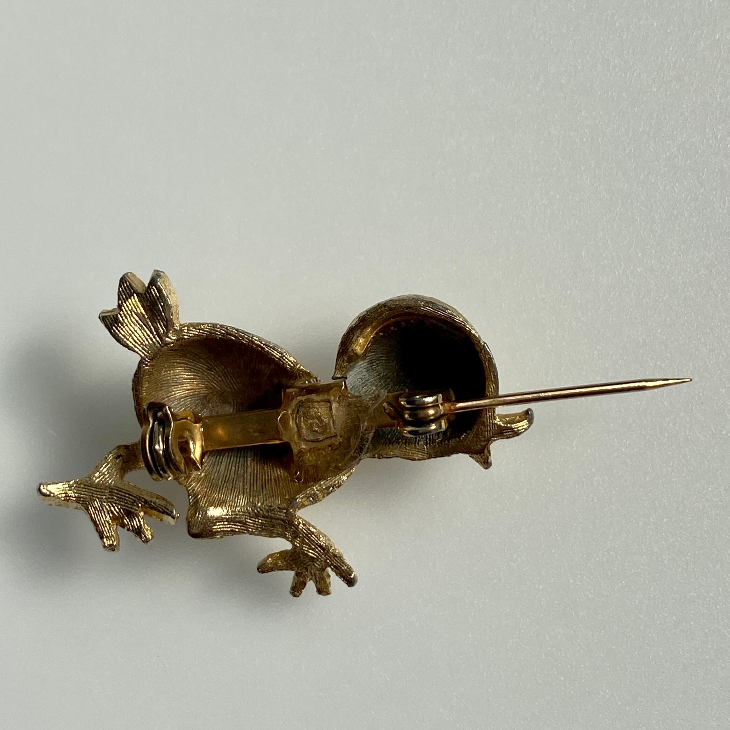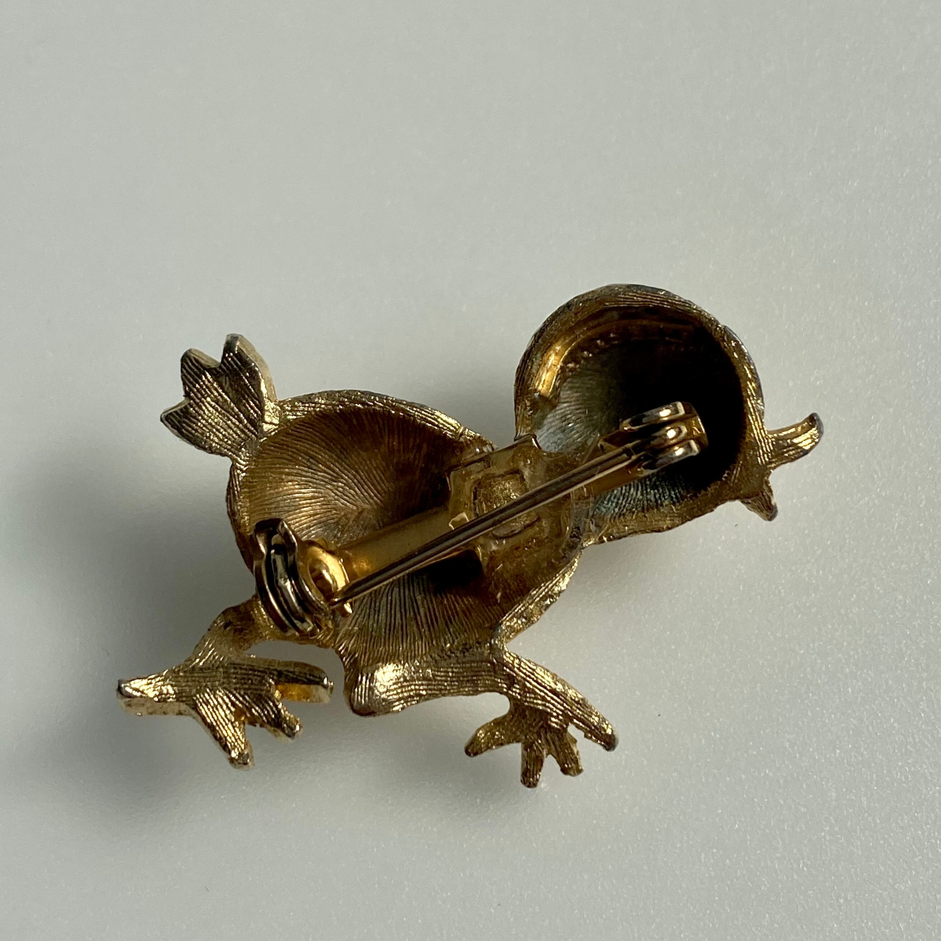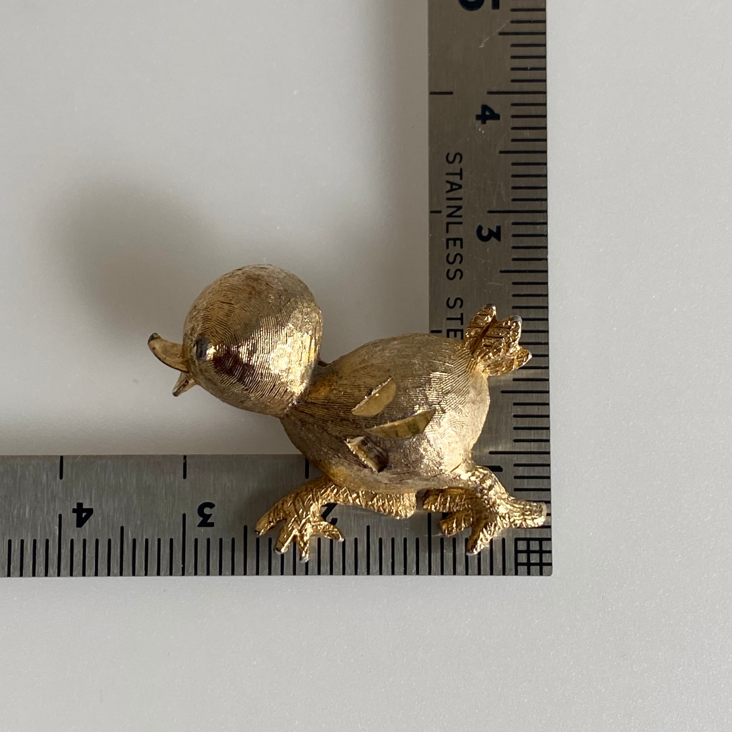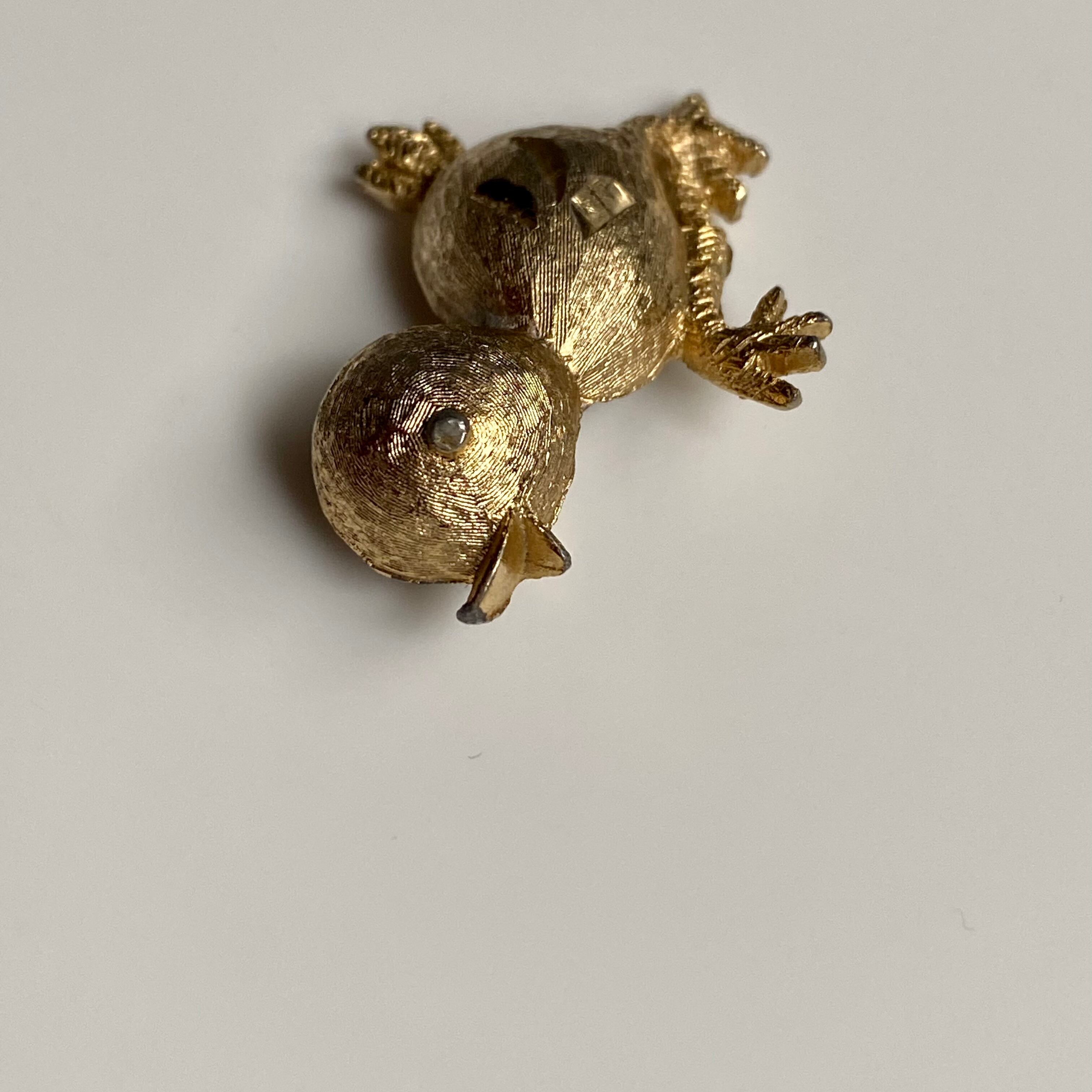 アメリカのコスチュームジュエリーメーカー「マムゼル」のヒヨコブローチ。マットゴールドメタルに羽毛のテクスチャー、センターに入った素敵なカッティングがマムゼルの特徴です。小さなヒヨコが一生懸命走っている愛らしいデザインのお品です。裏に「MAMSELL」の刻印があります。