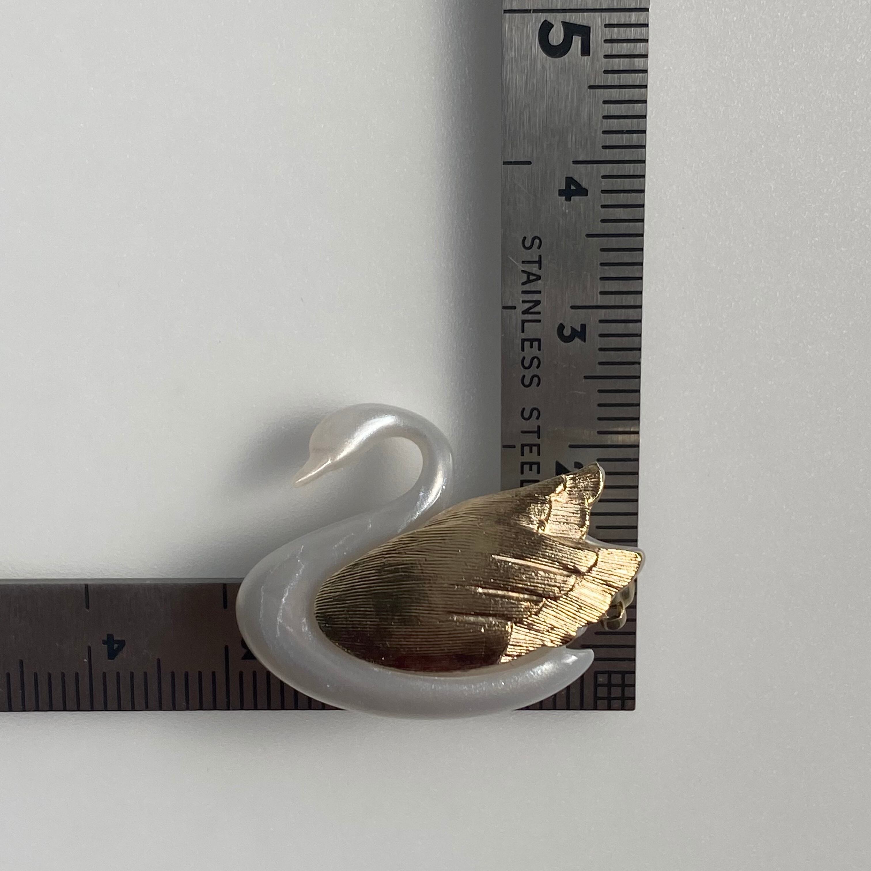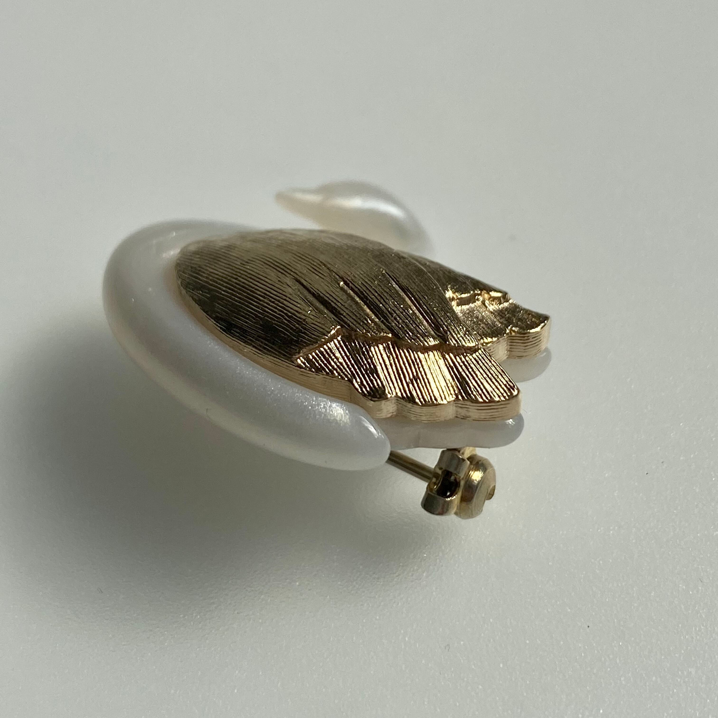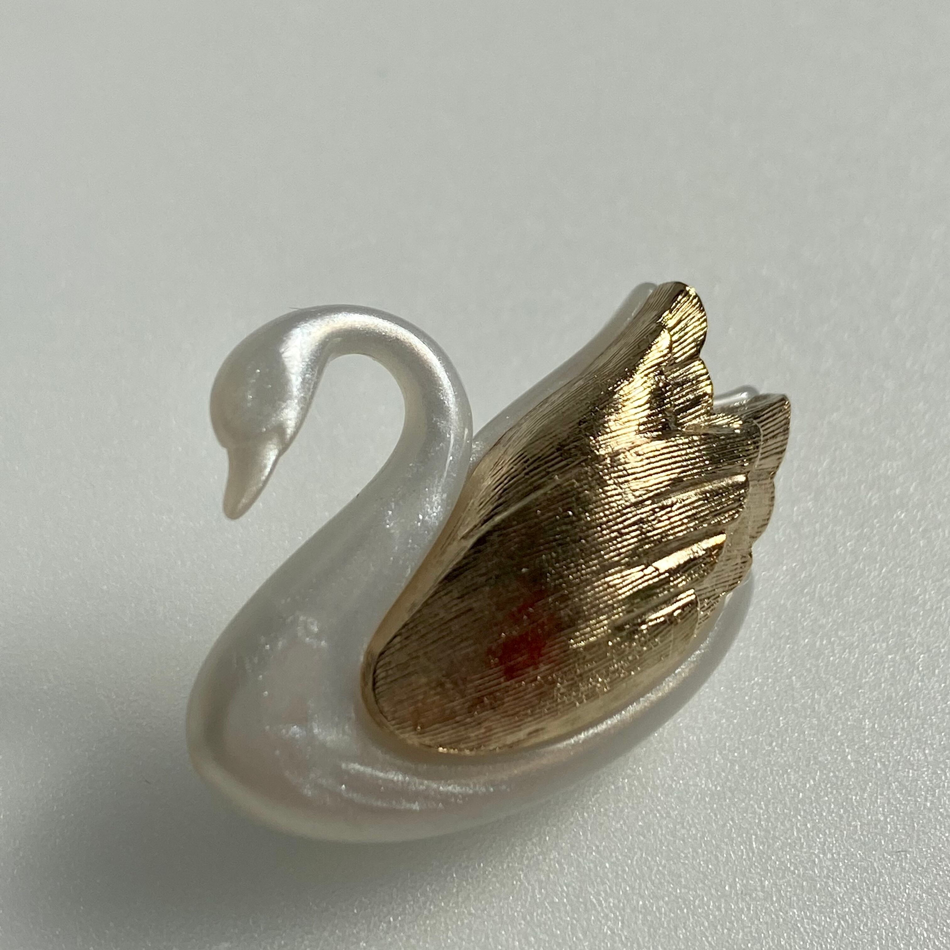 エイボン製のスワンブローチ。ボディはパール調ホワイト、翼はマットゴールドに羽毛の流れが刻まれています。細い首下からの繊細なラインが素敵なお品です。「AVON」の刻印あり。