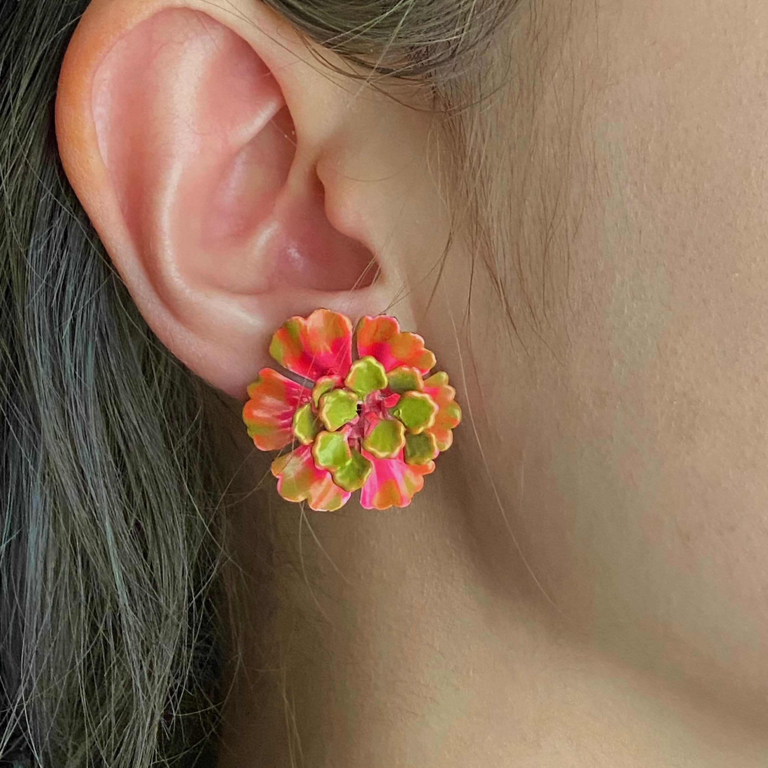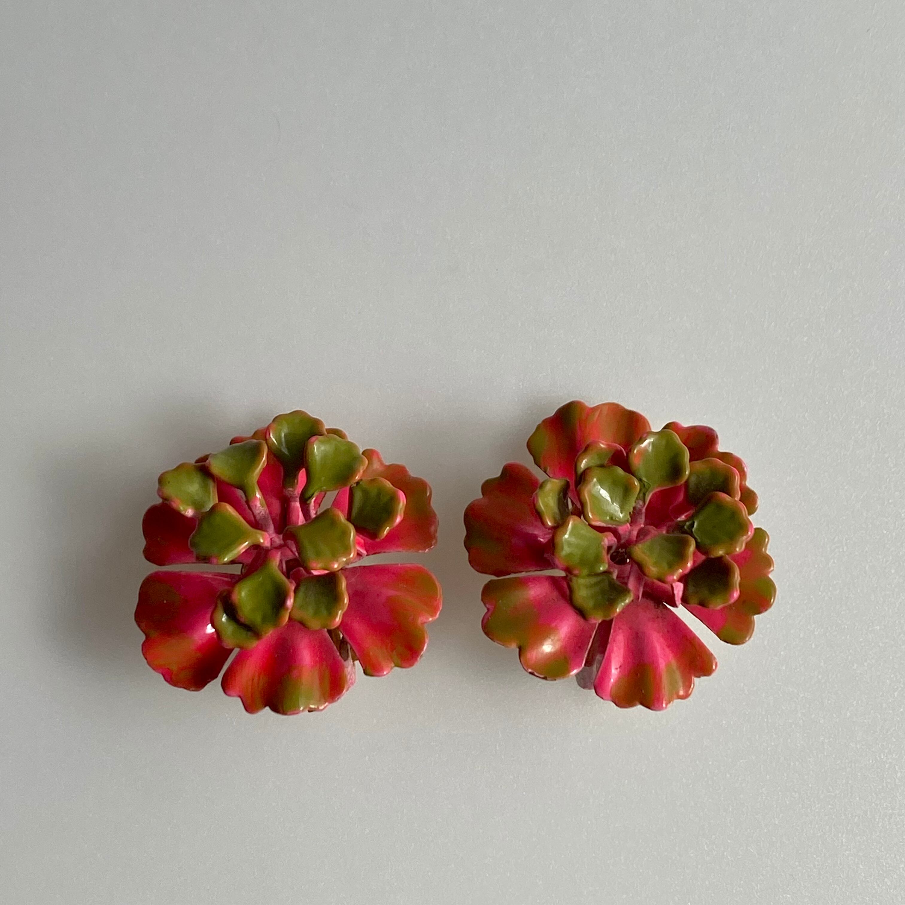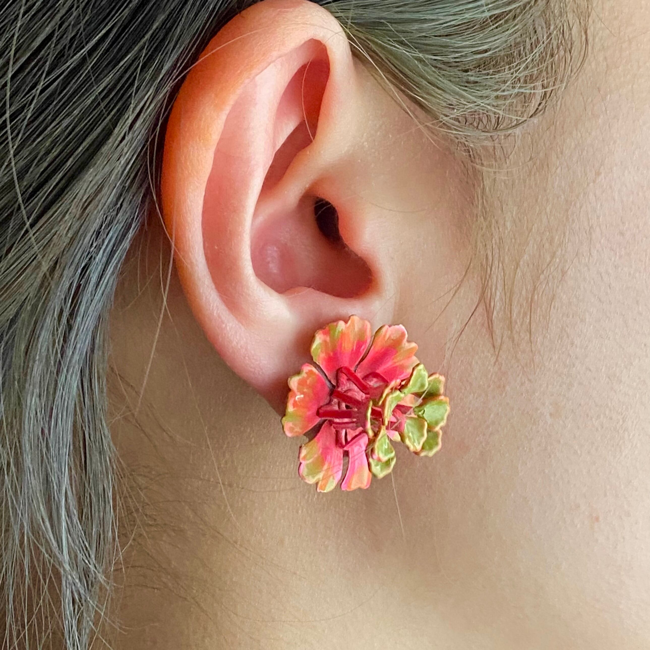 サイケデリックなお花のスチールイヤリング。フューシャピンク×モスグリーンのお色味、高く飛び出した「花糸」、ペイント感、70年代の空気感が詰まったユニークなお品です。