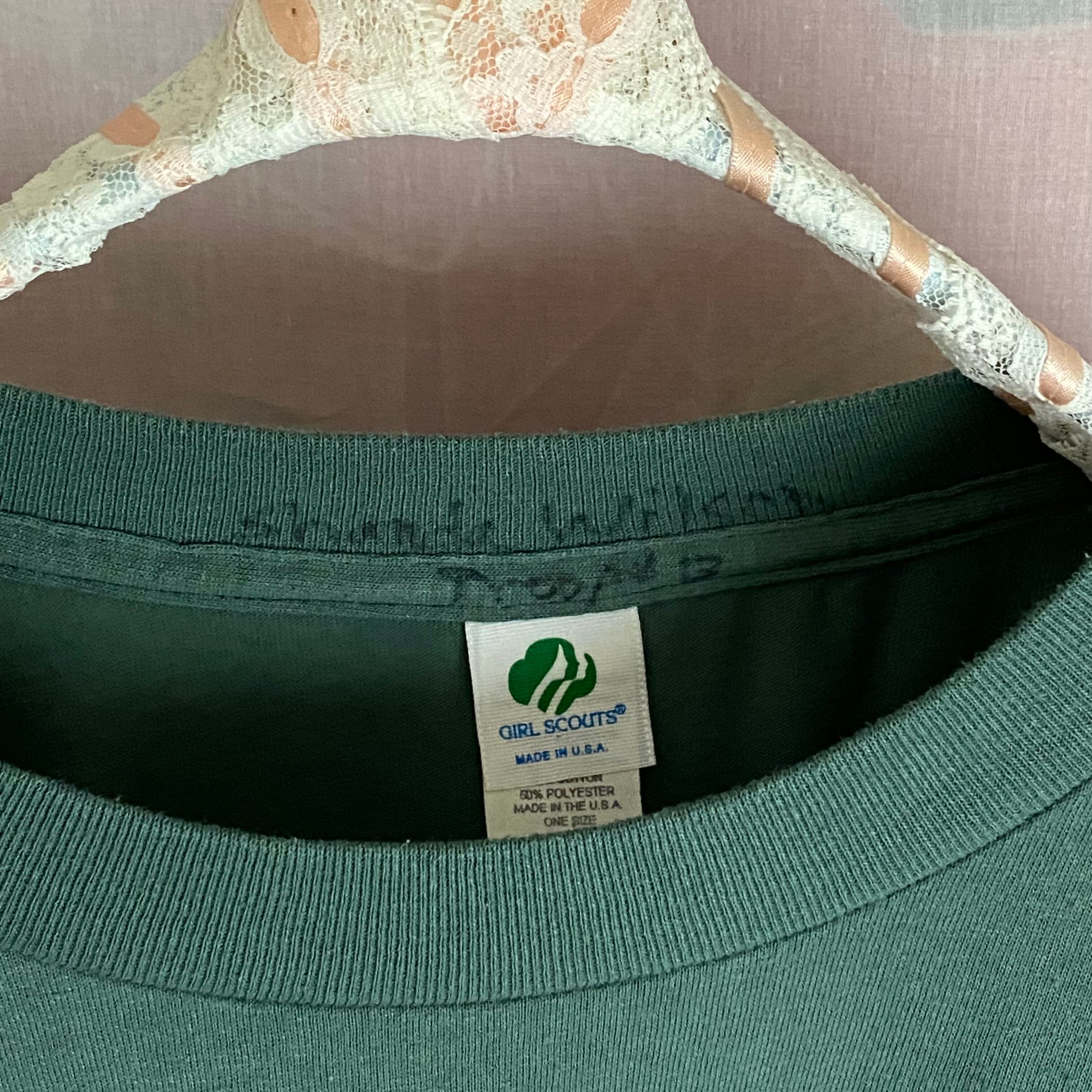 絶妙な色合いのガールスカウトT。襟ぐりに前の持ち主の名前がマジックで書いてあります。キュン。