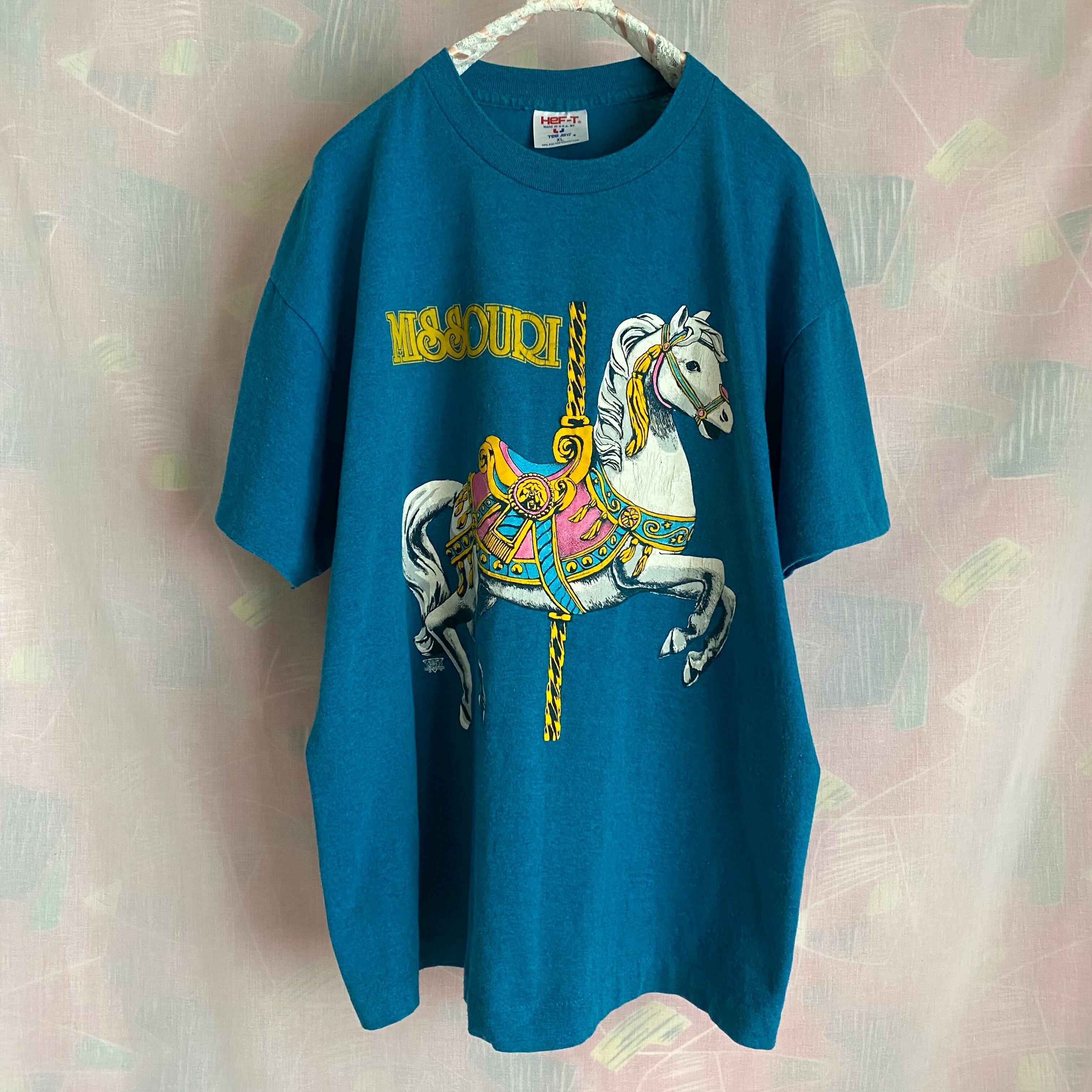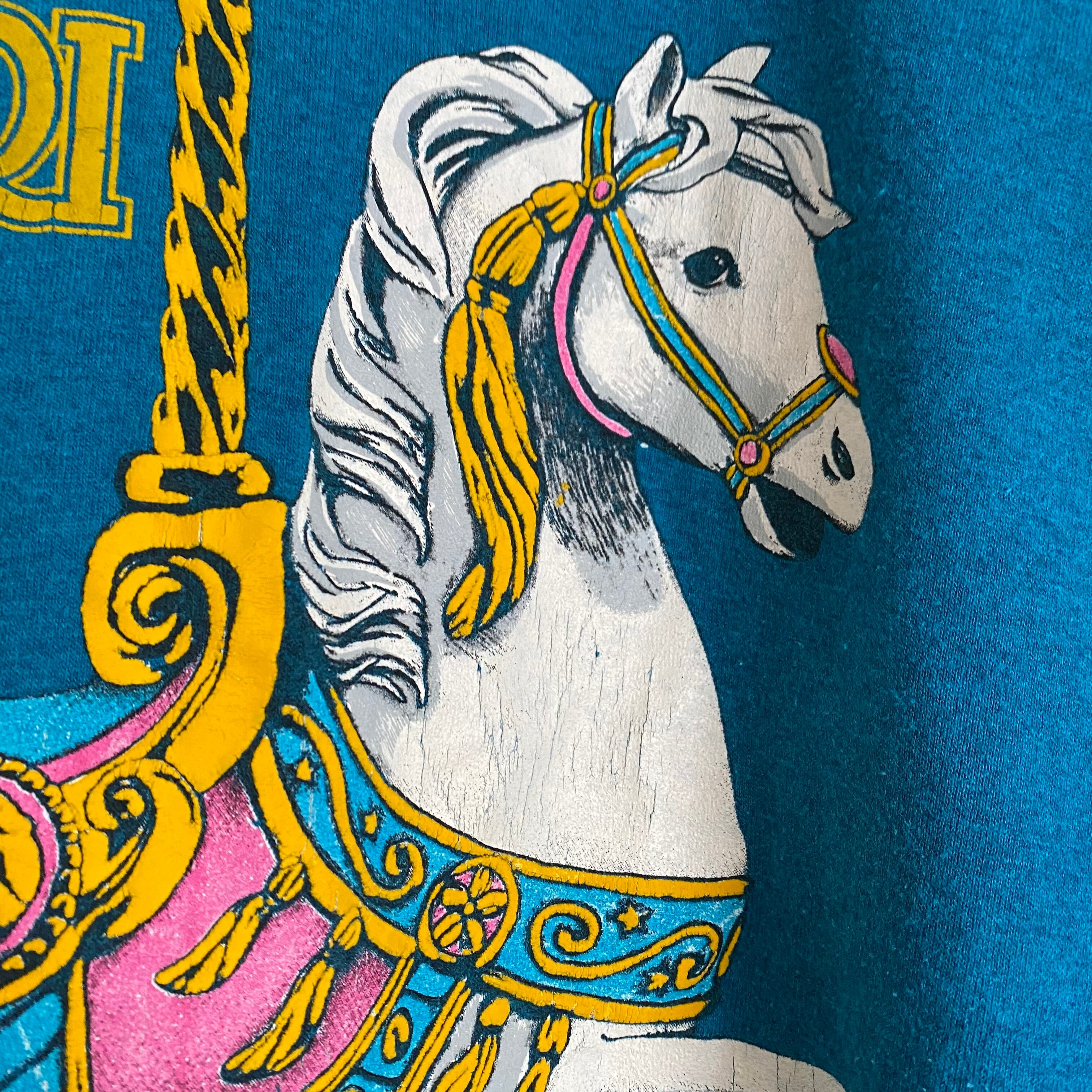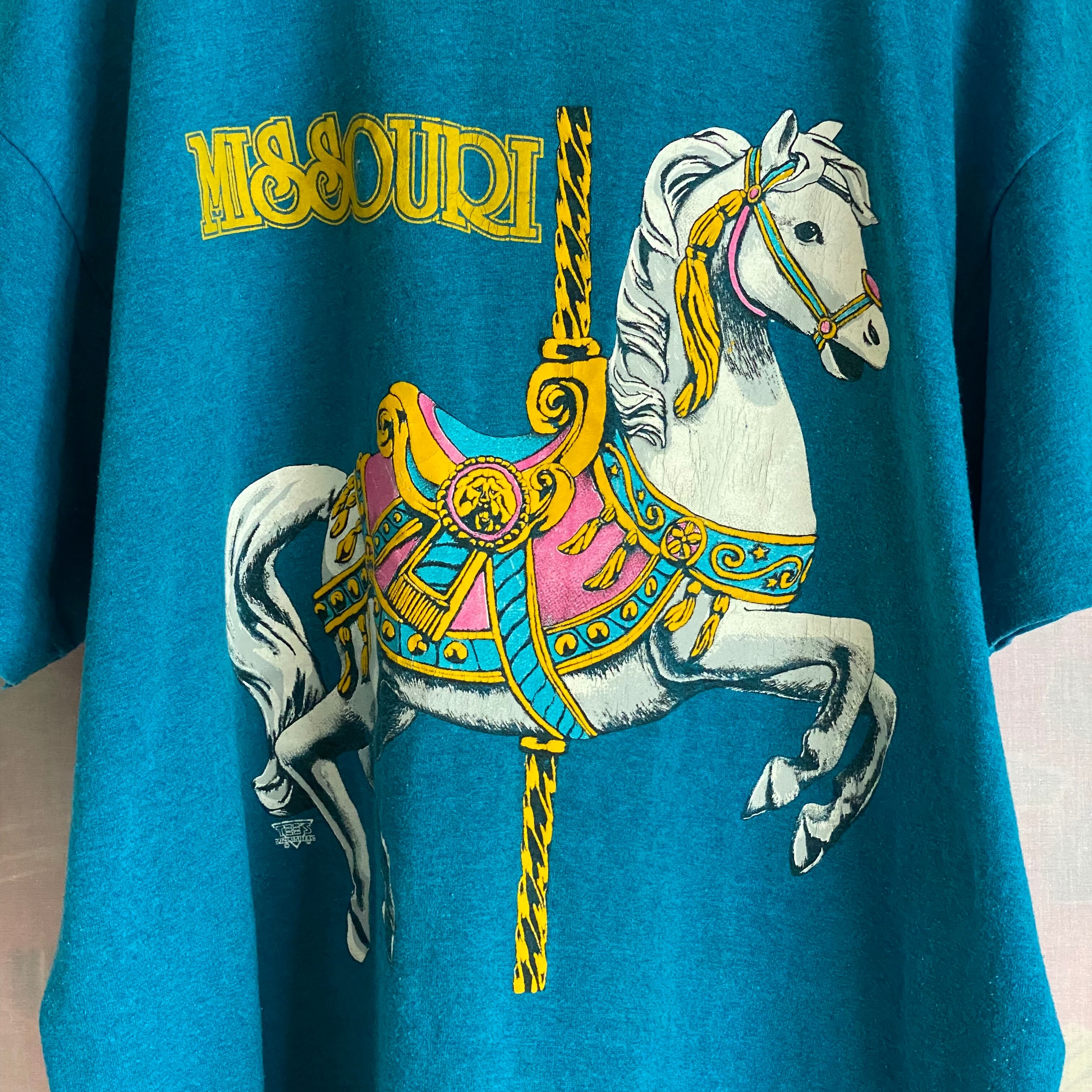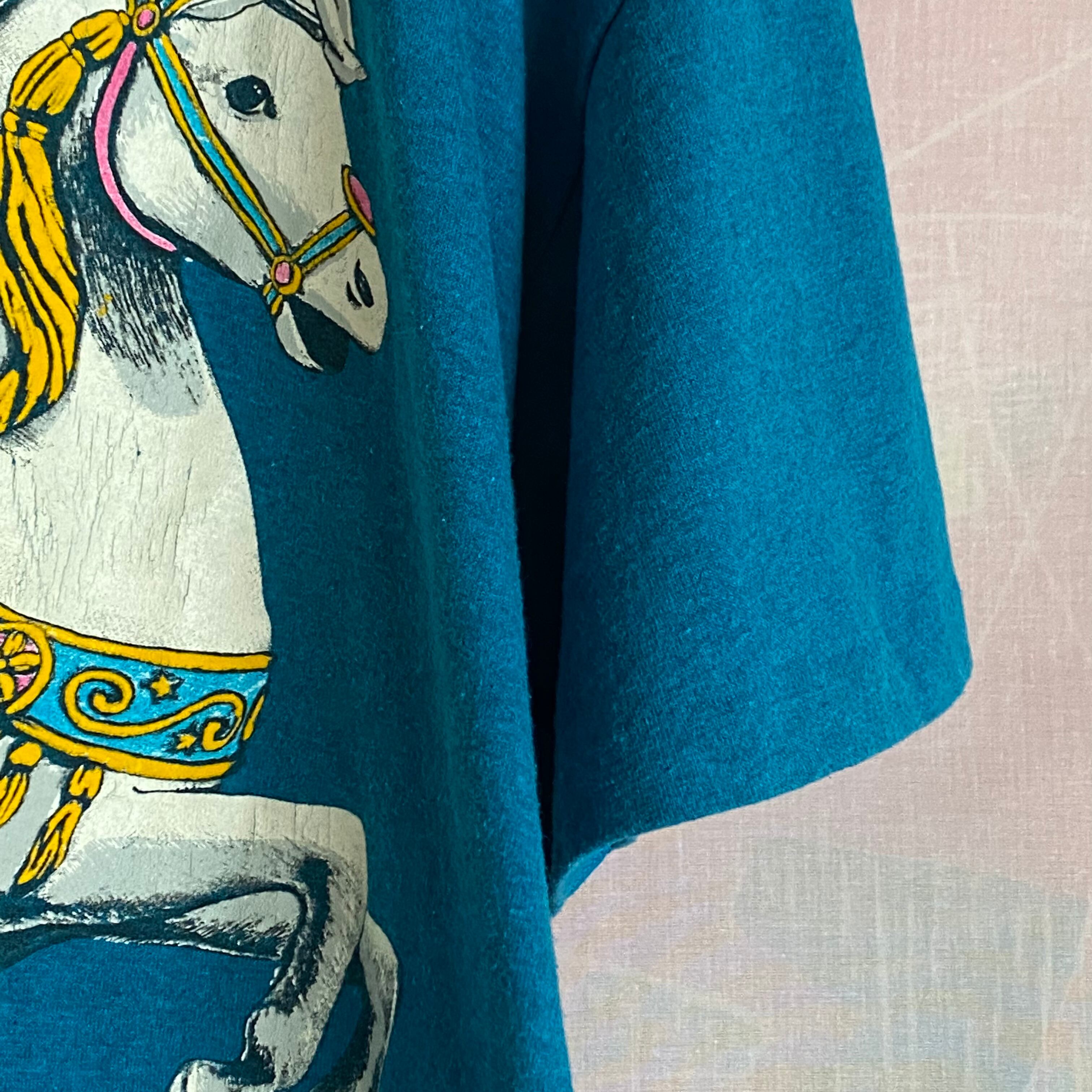 濃いめブルーの生地にリアルな回転木馬がインパクト大のTシャツ。