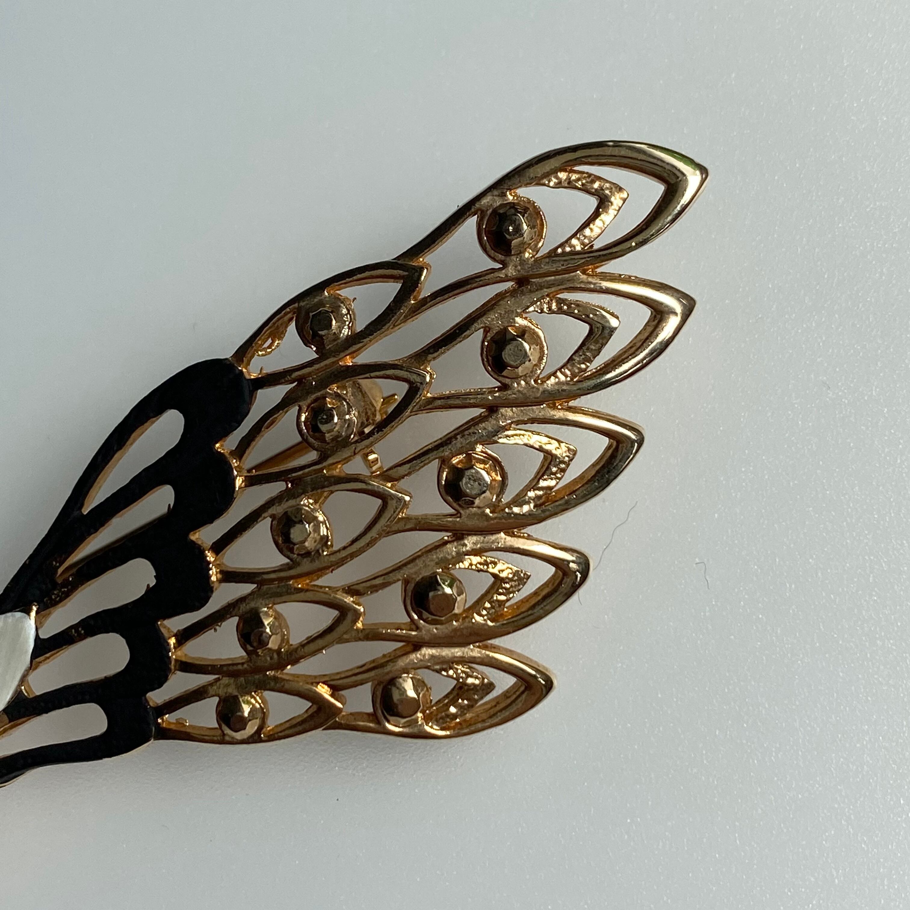 大胆なワイド感のクジャクブローチ。