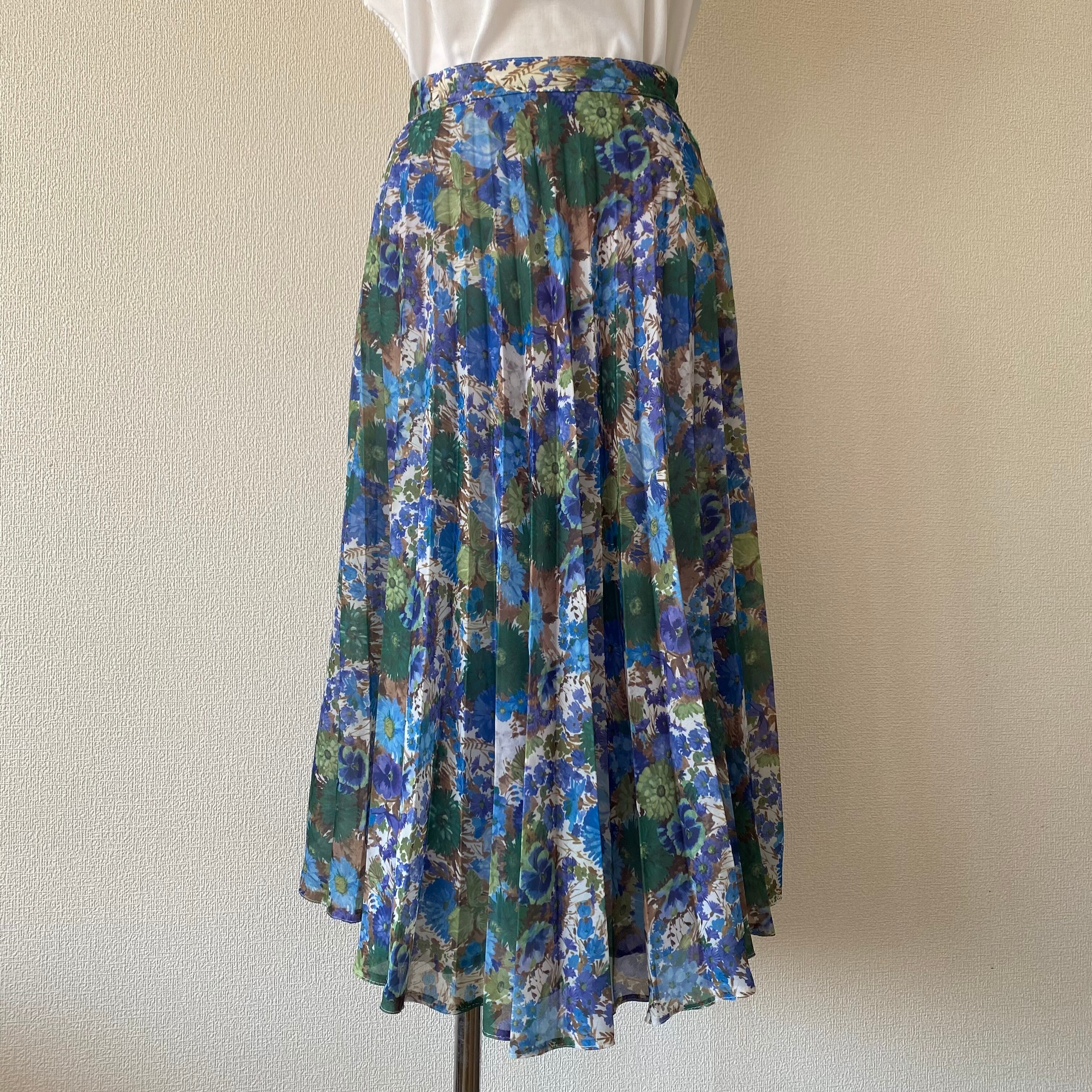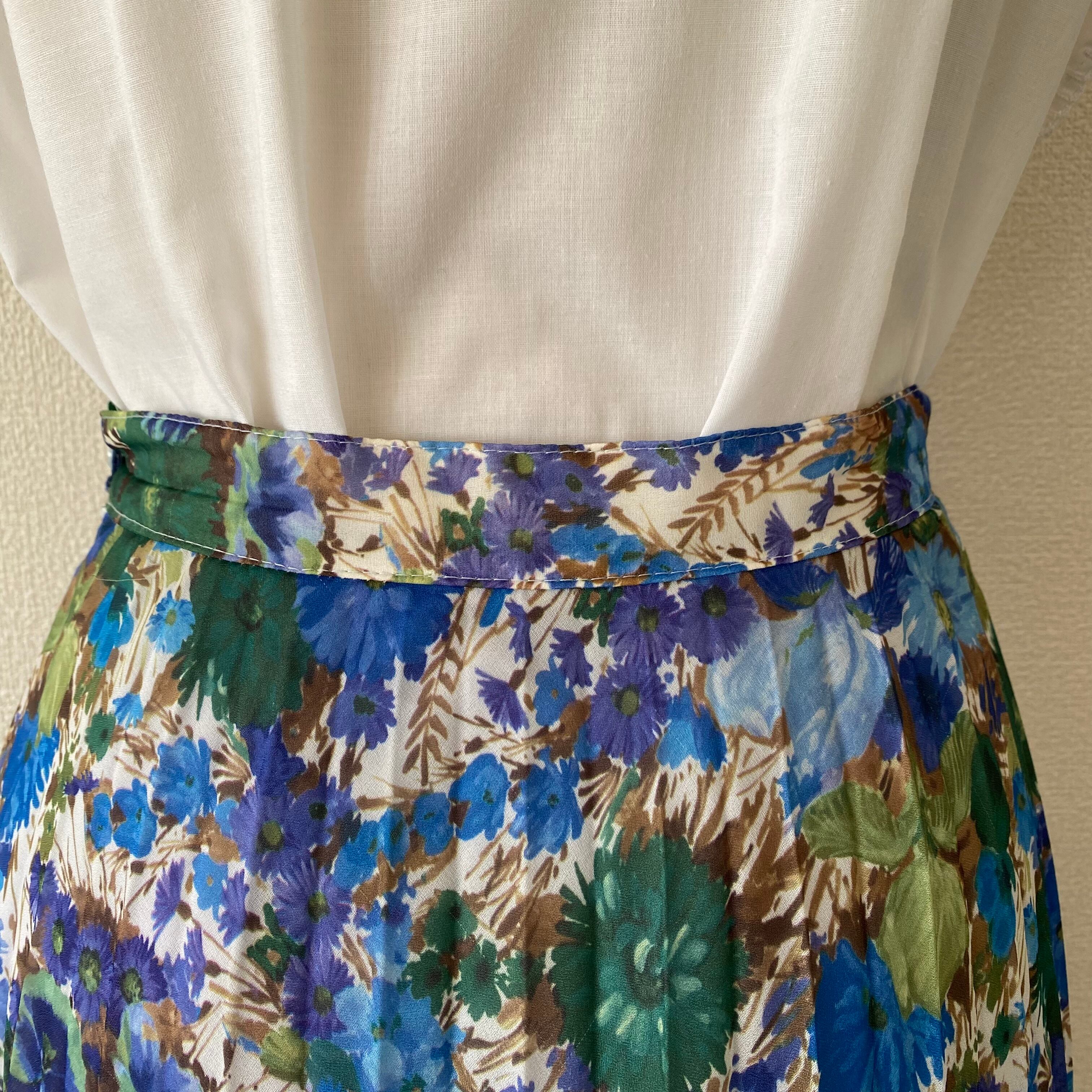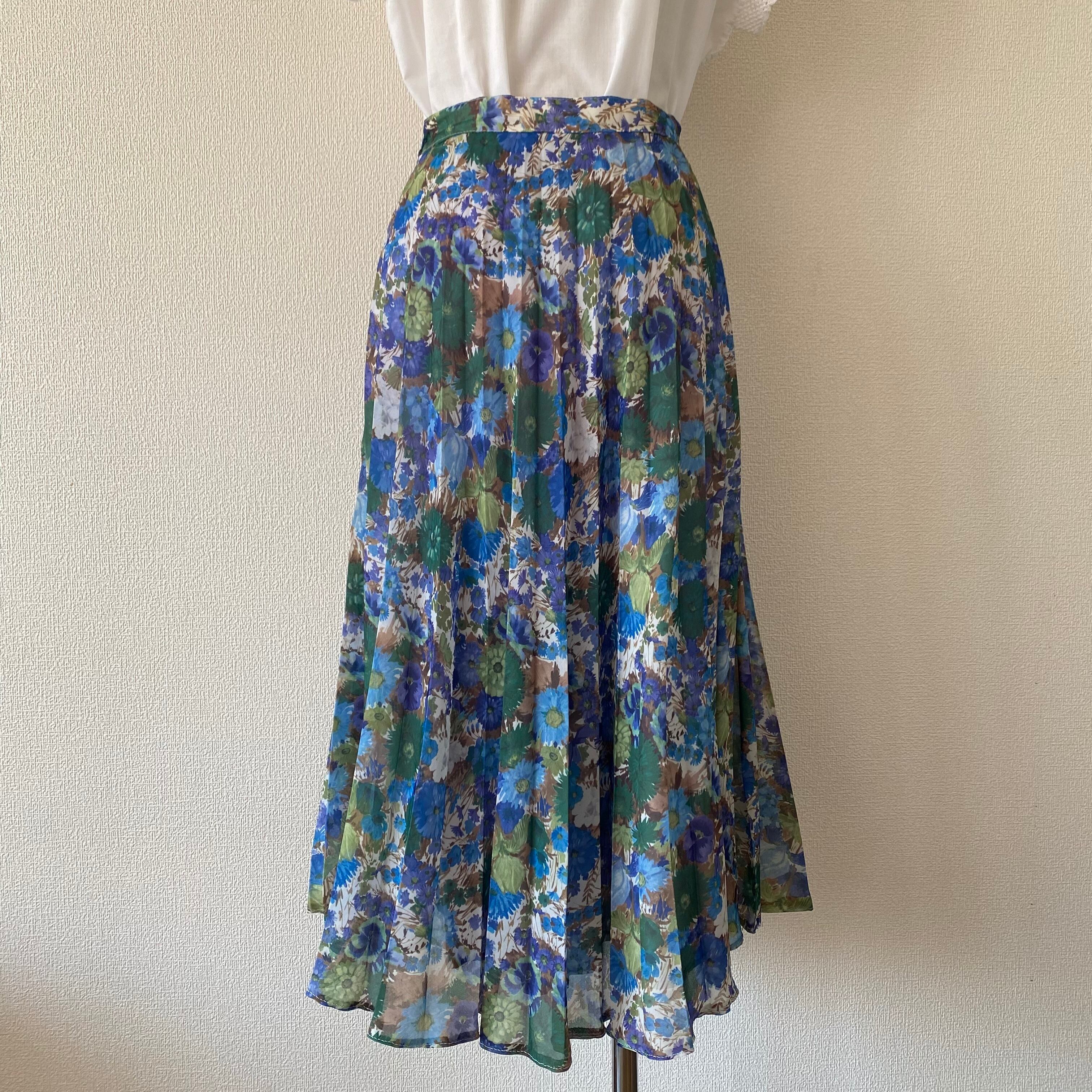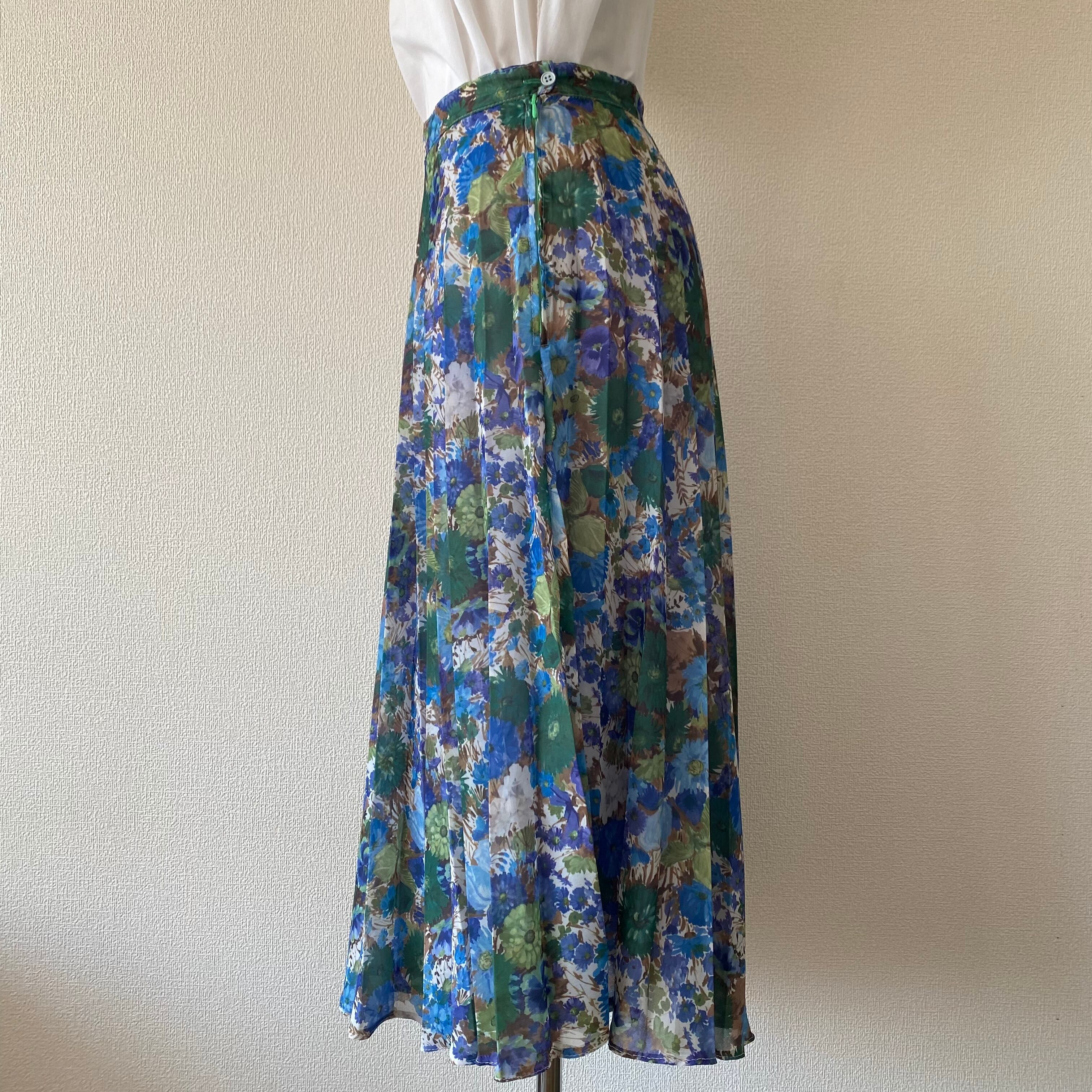 透け感のある素材にブルー×グリーン系のお色味は総柄でも着やすい、爽やかな印象のスカートです。