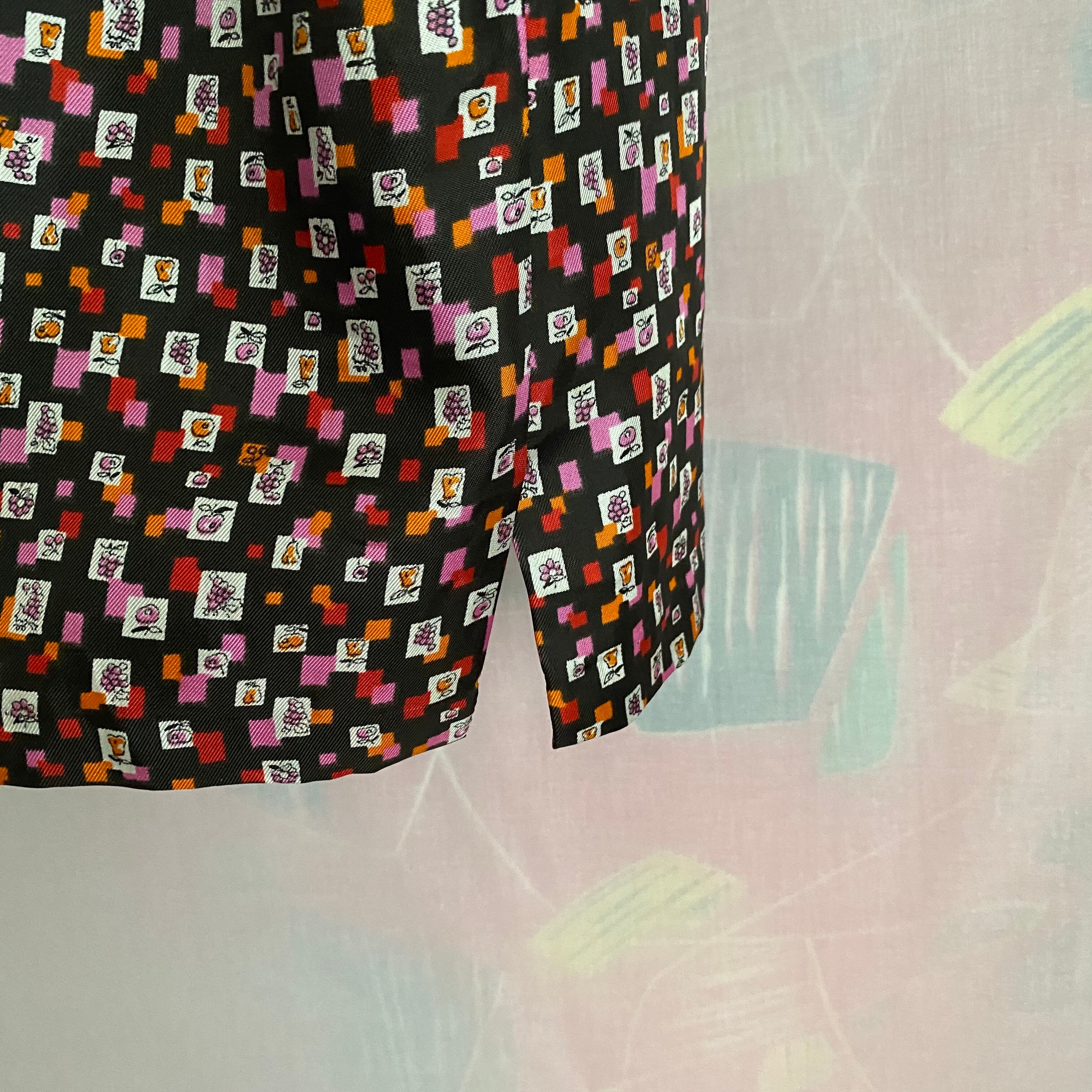 幾何学柄の中にいたずら書きのような小さな小さなフルーツがたくさんプリントされたブラウス。