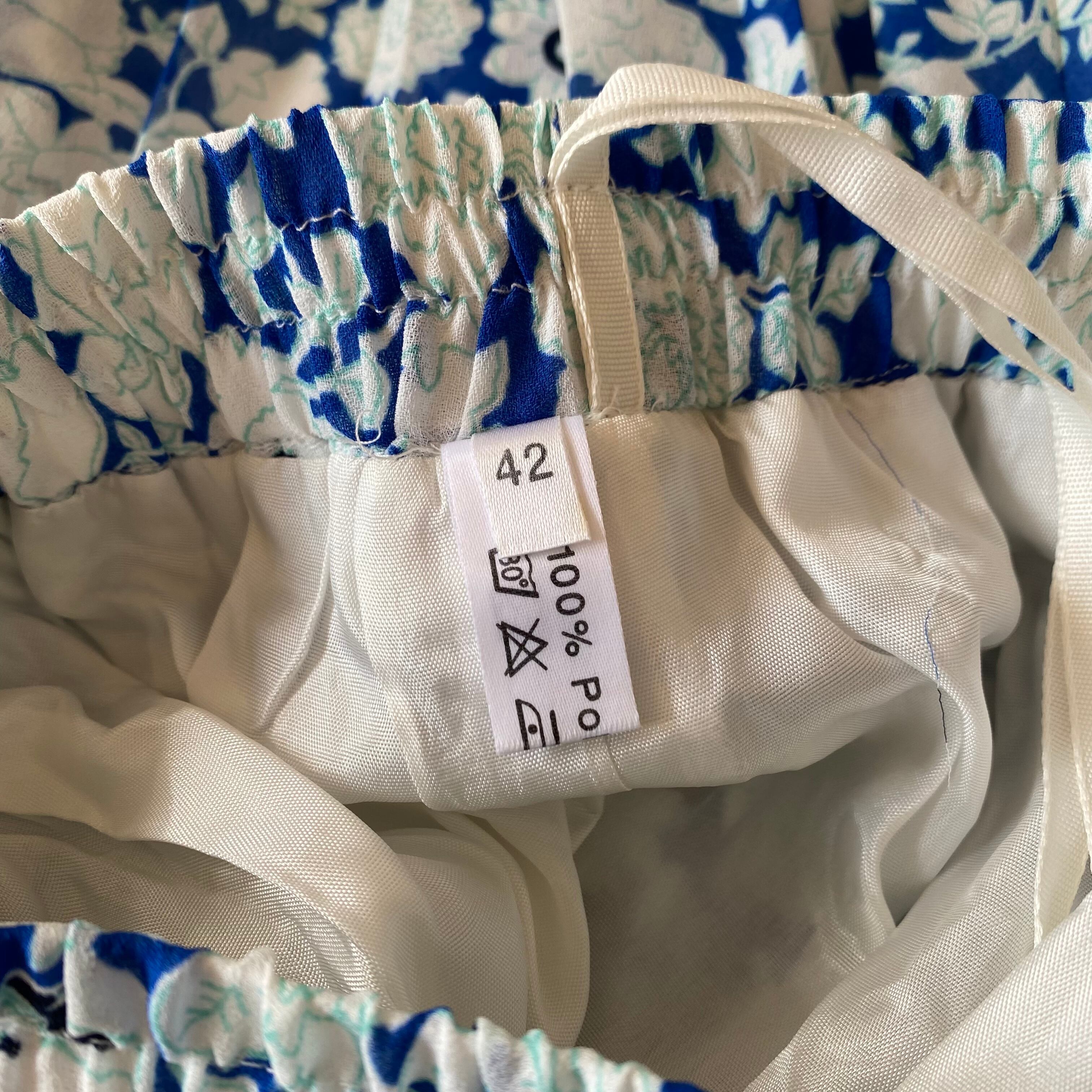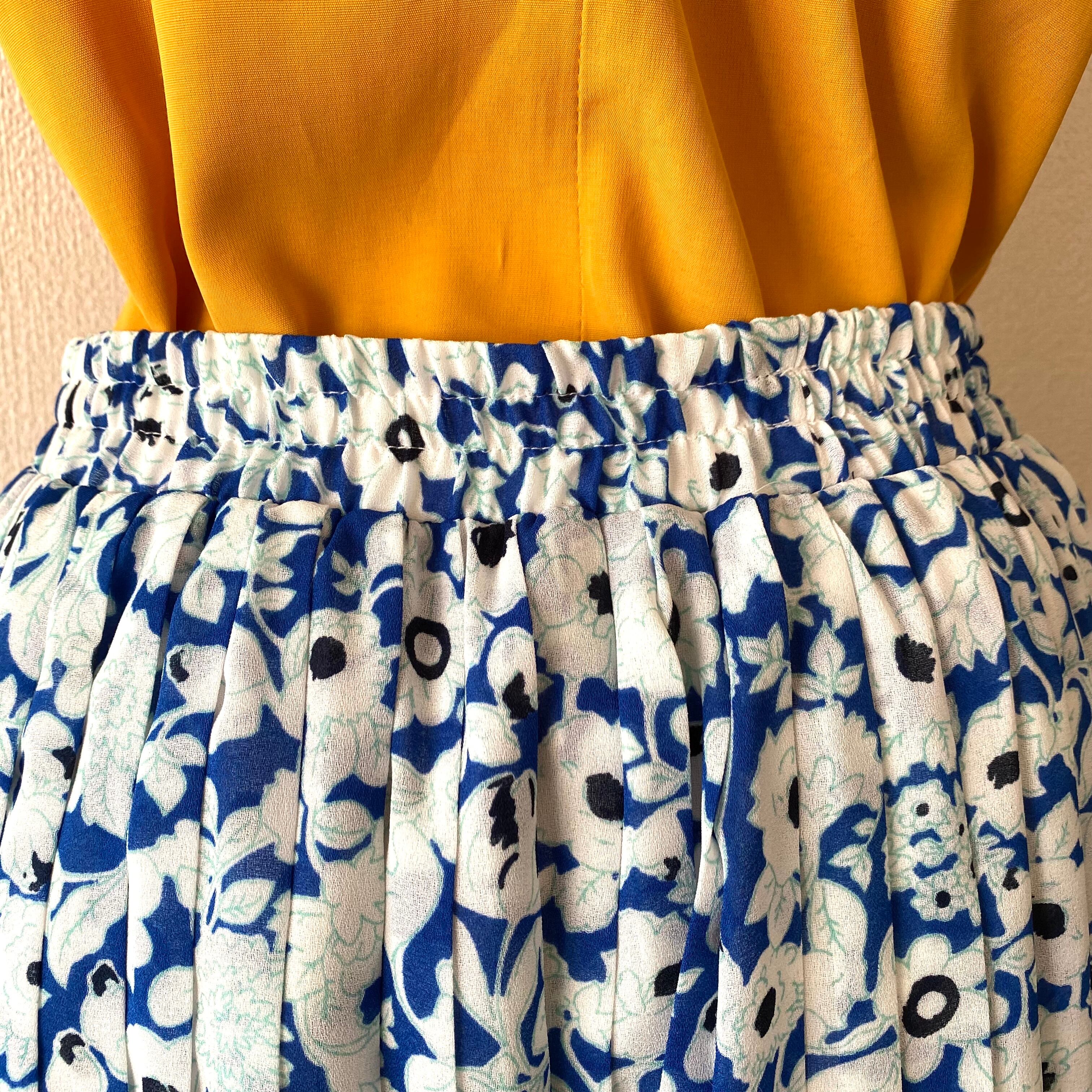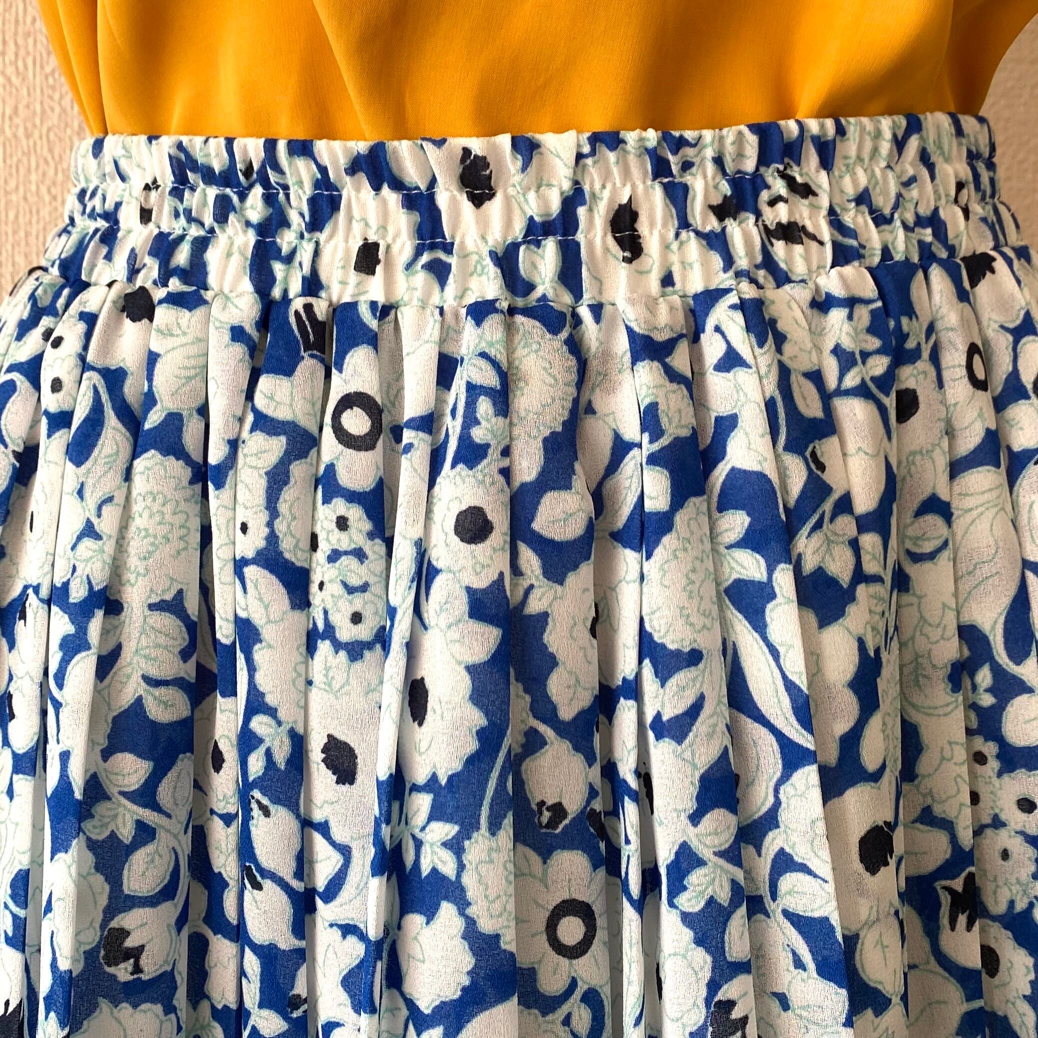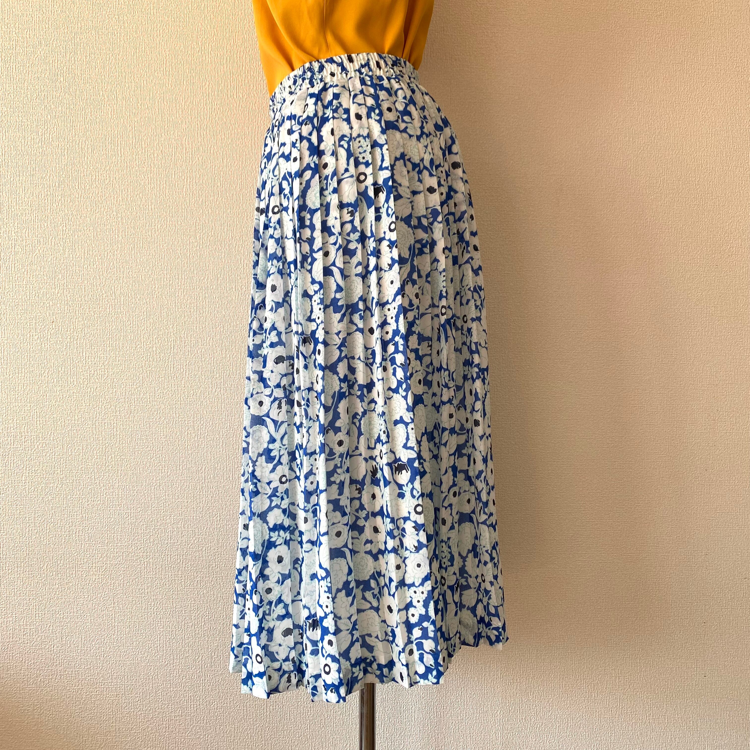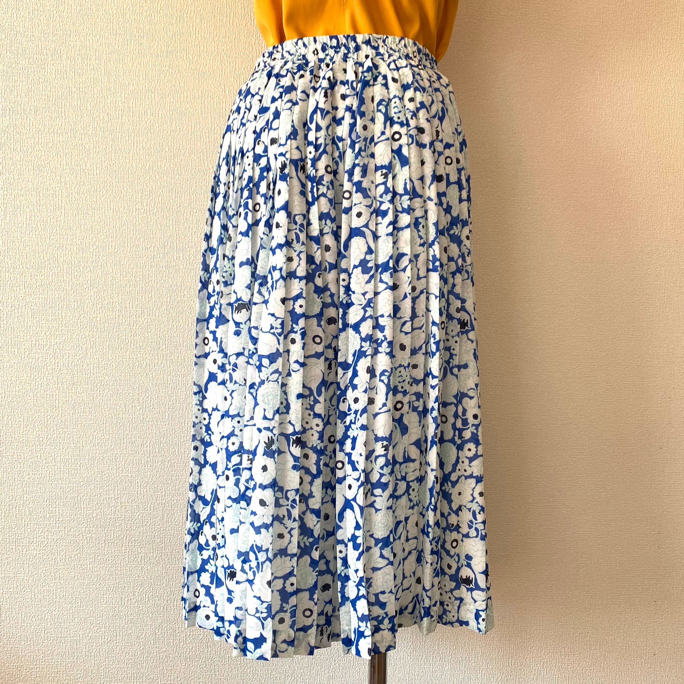 ブルー×白のボタニカル柄プリーツスカート。
