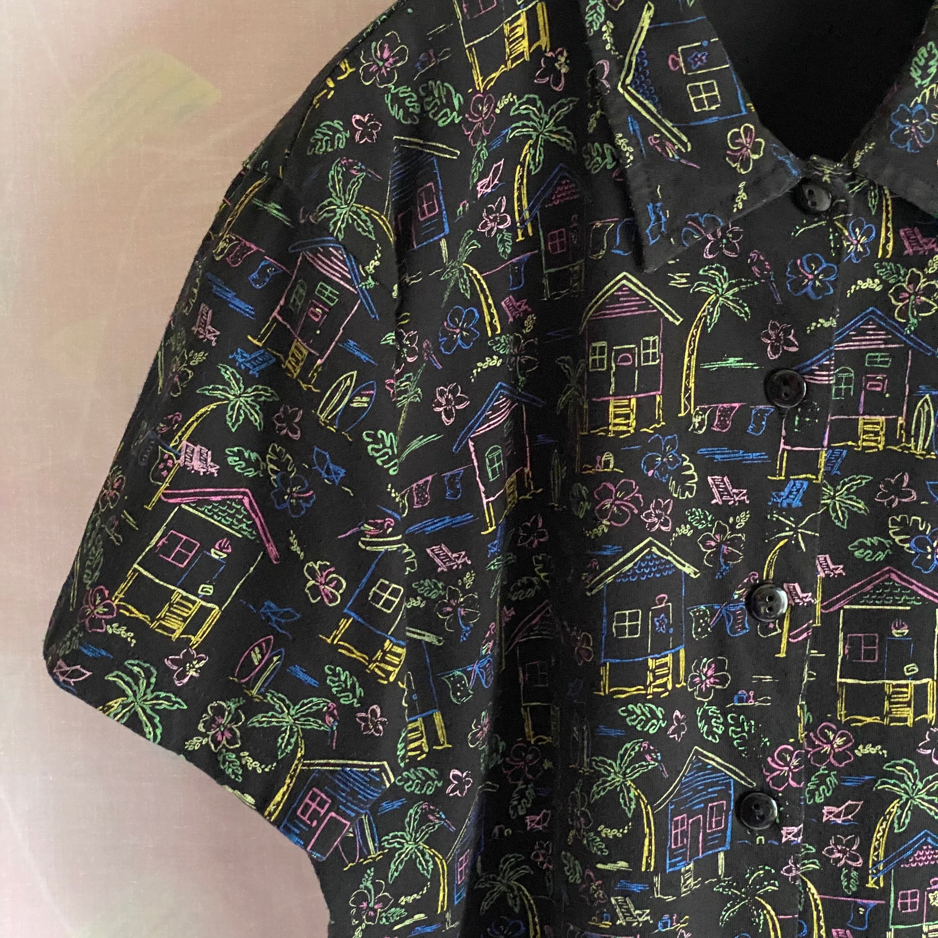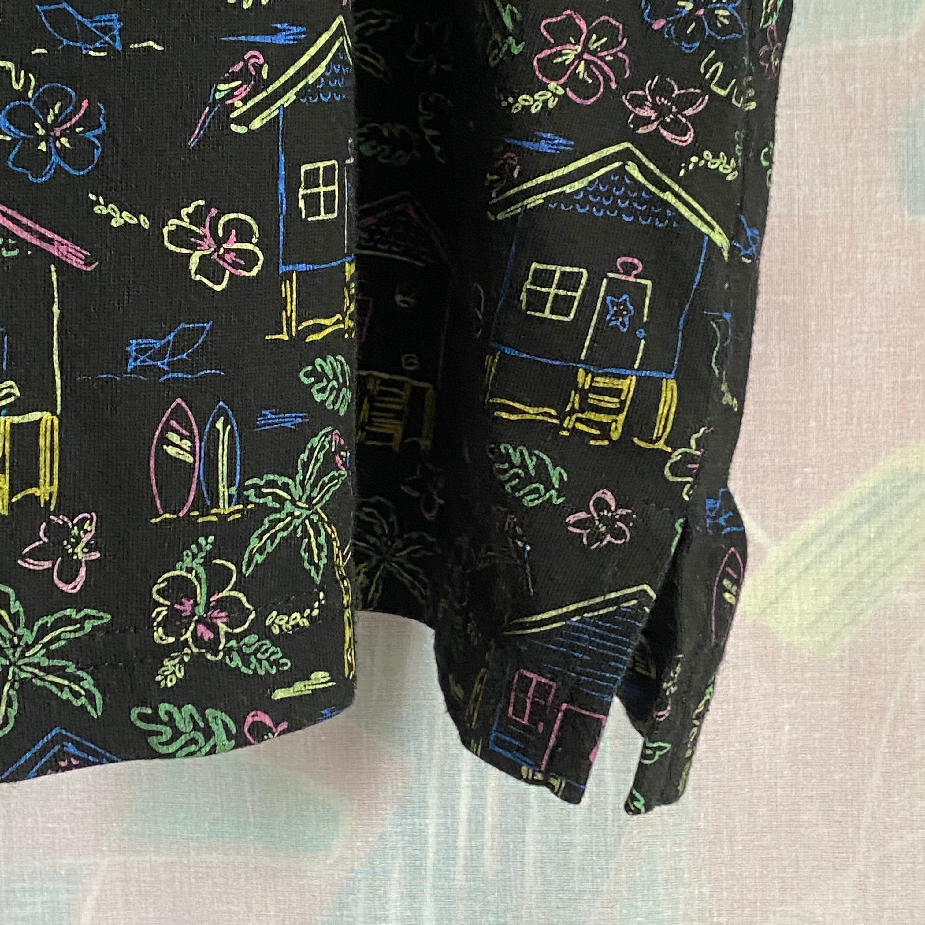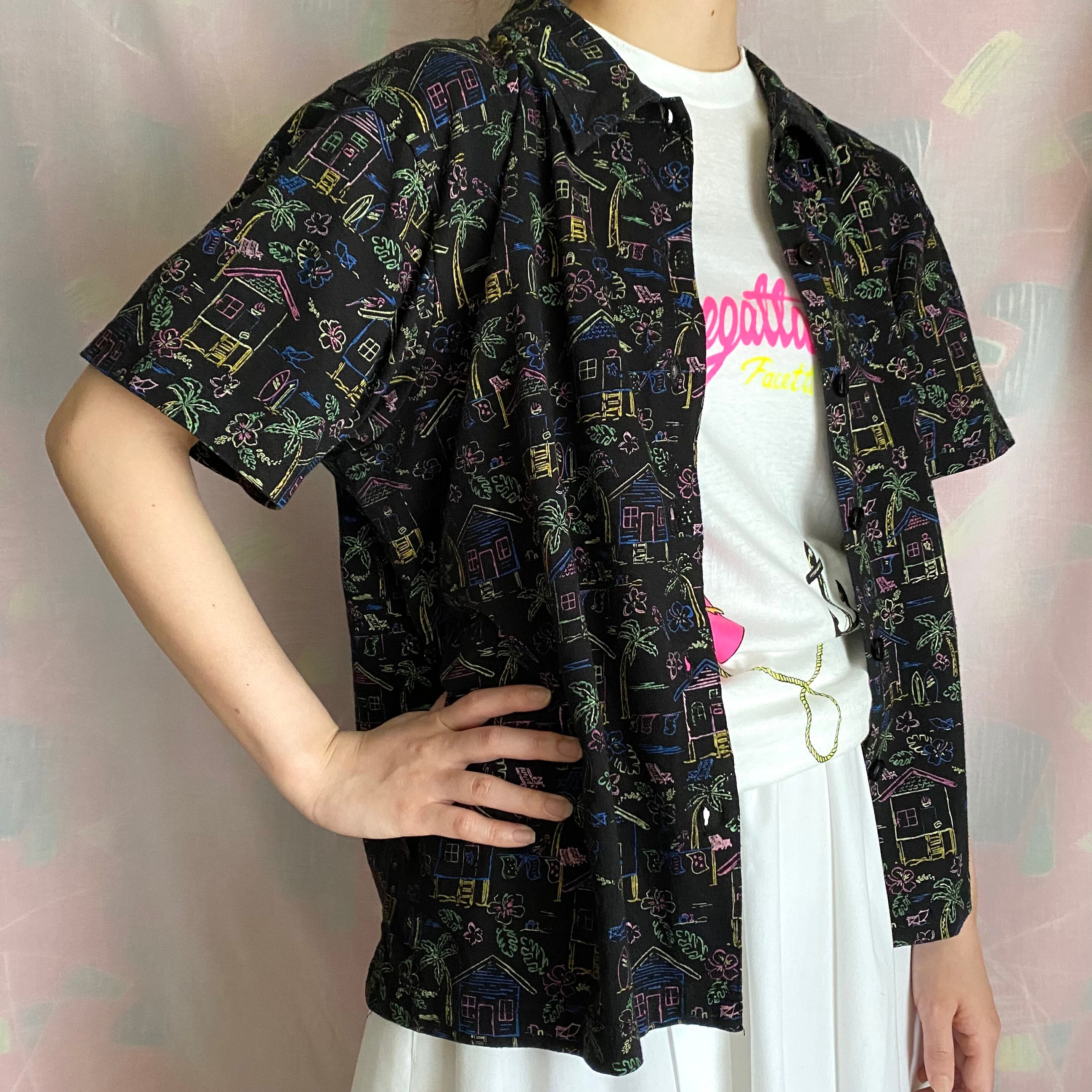 椰子の木、ハイビスカス、高床式住居などがネオンカラーでプリントされたシャツ。