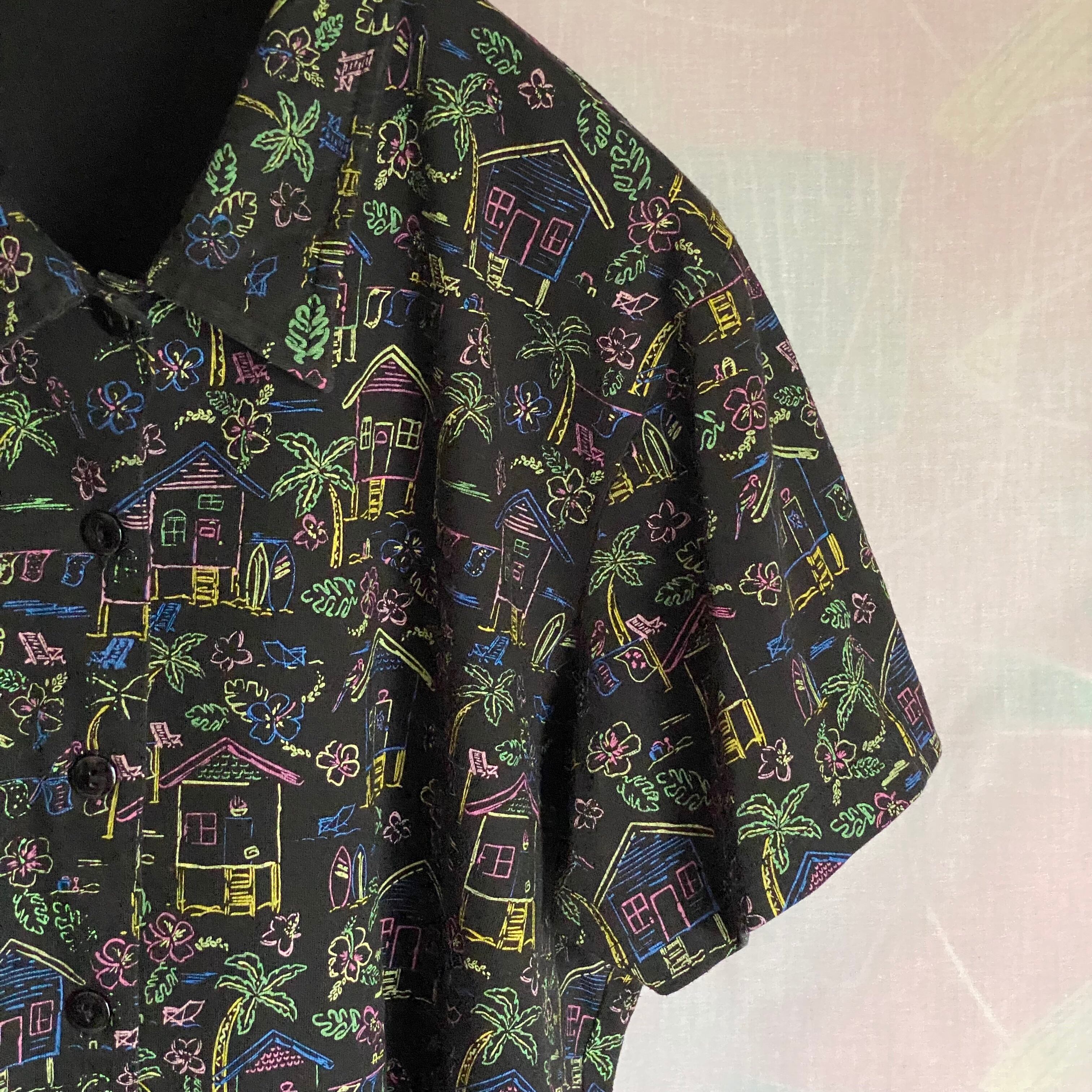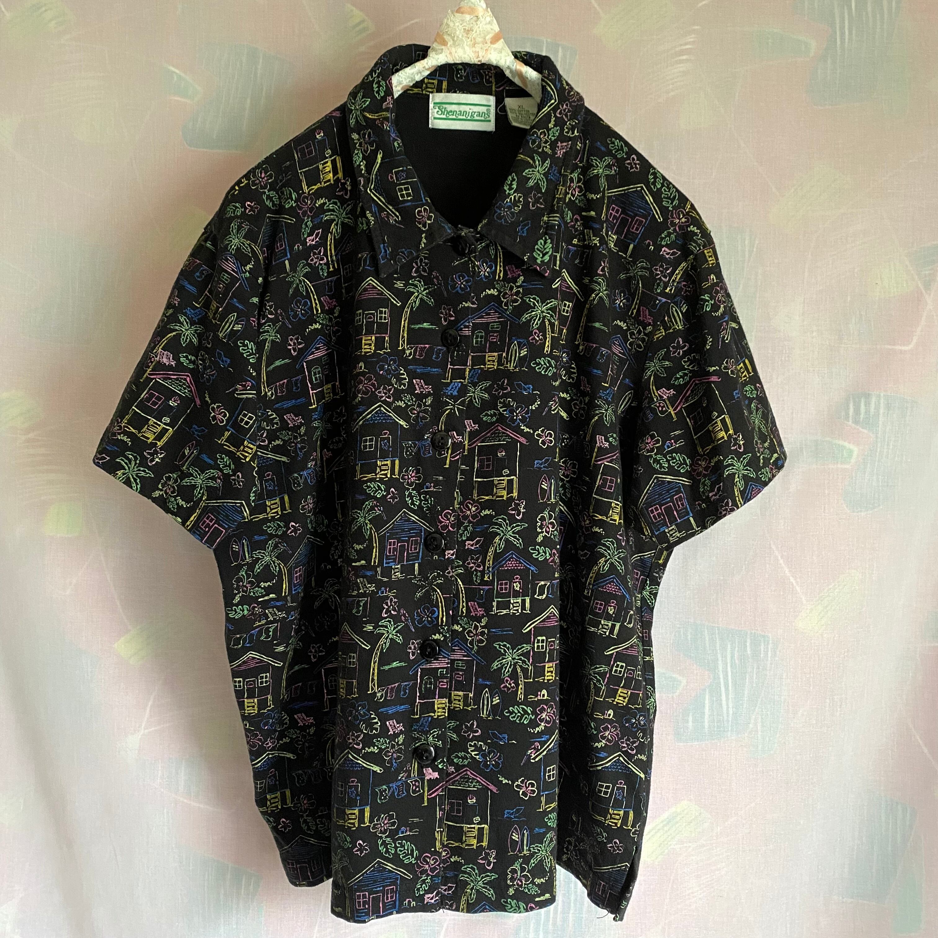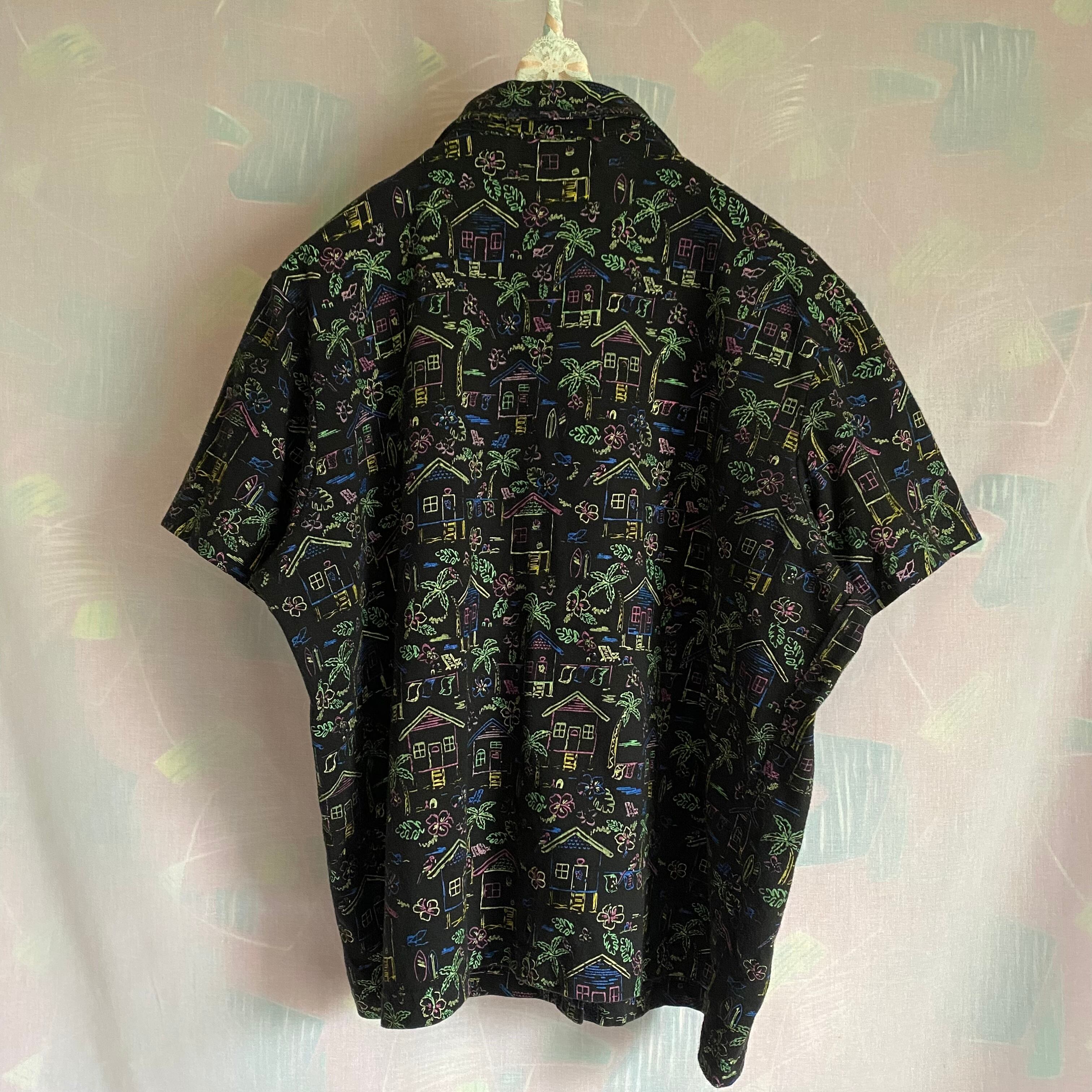 椰子の木、ハイビスカス、高床式住居などがネオンカラーでプリントされたシャツ。