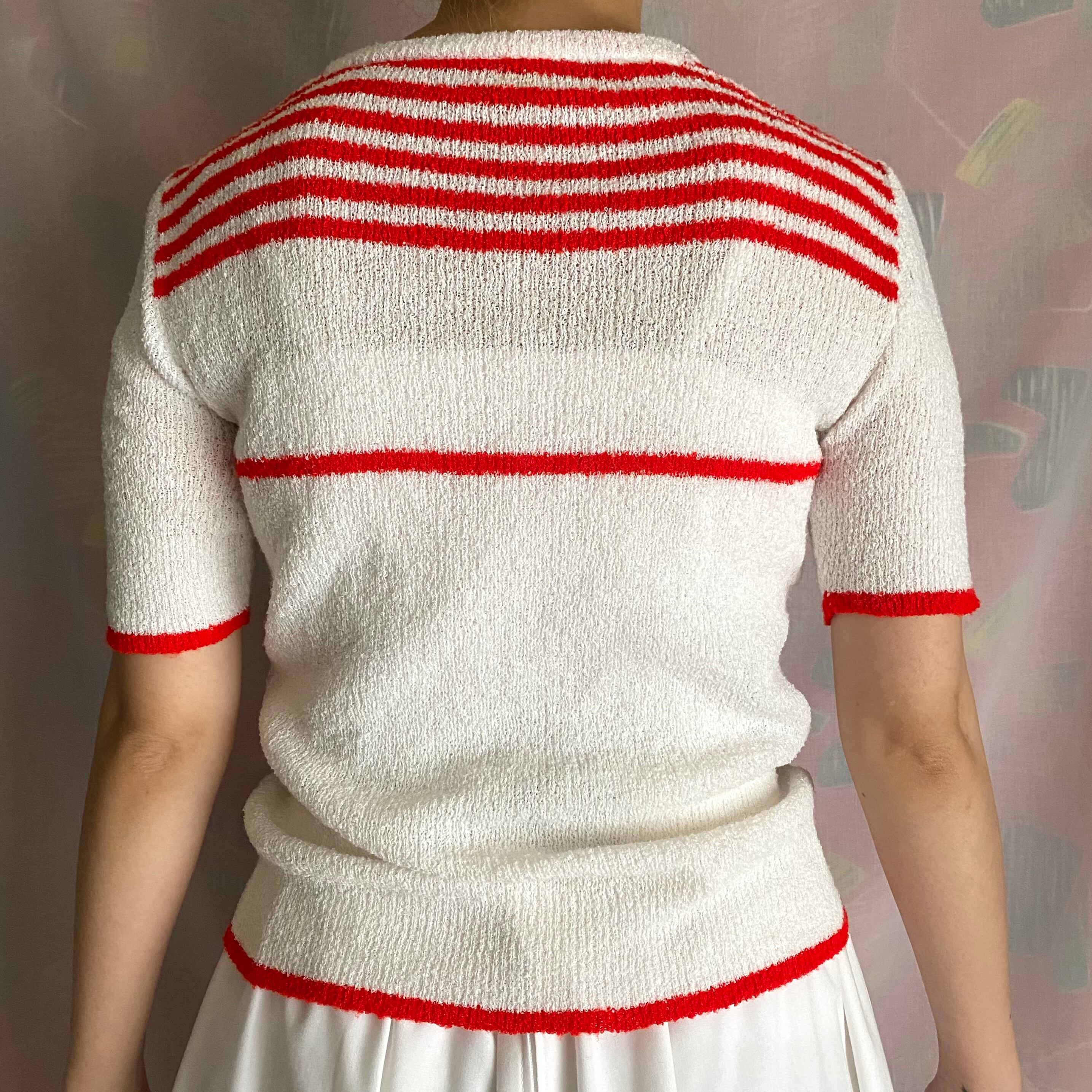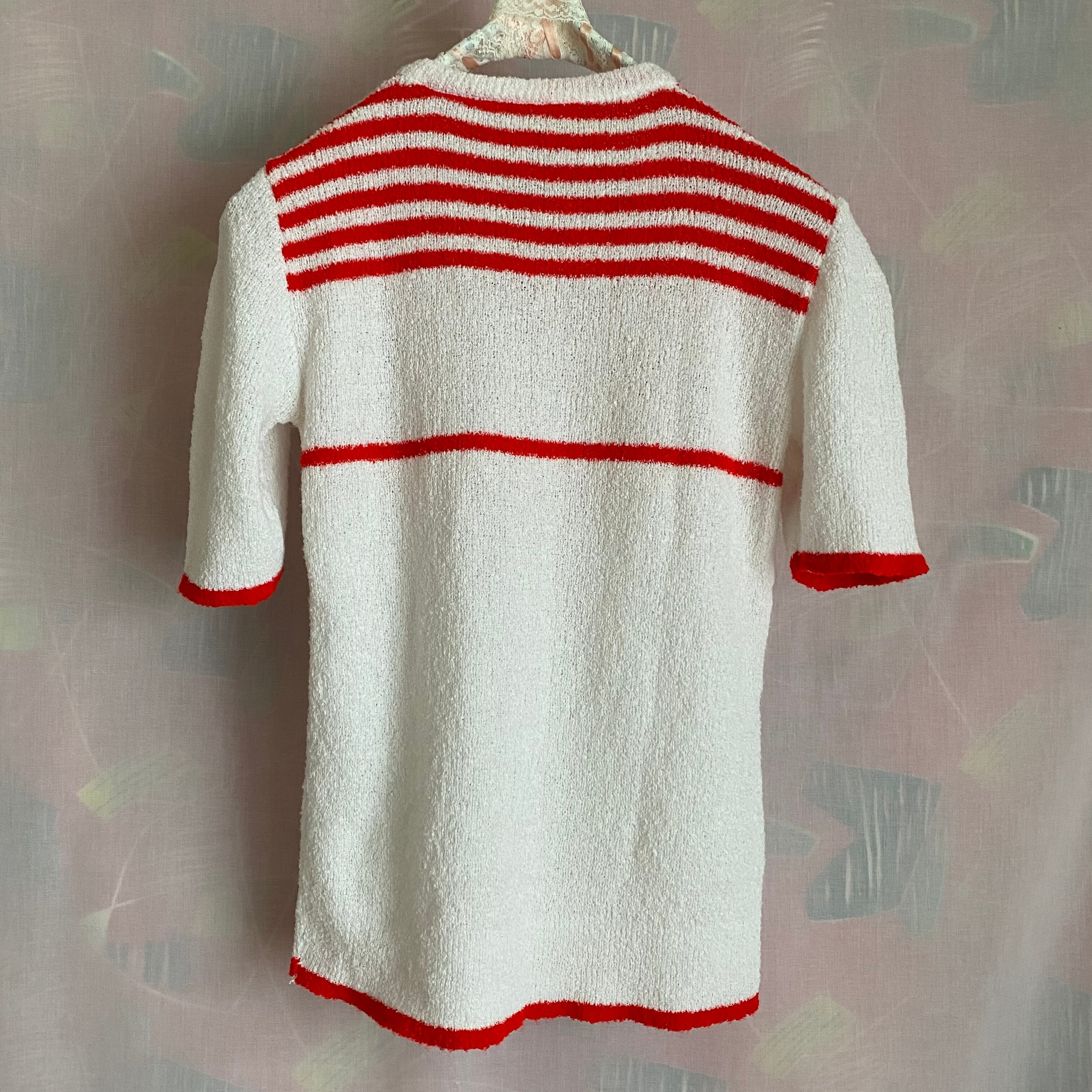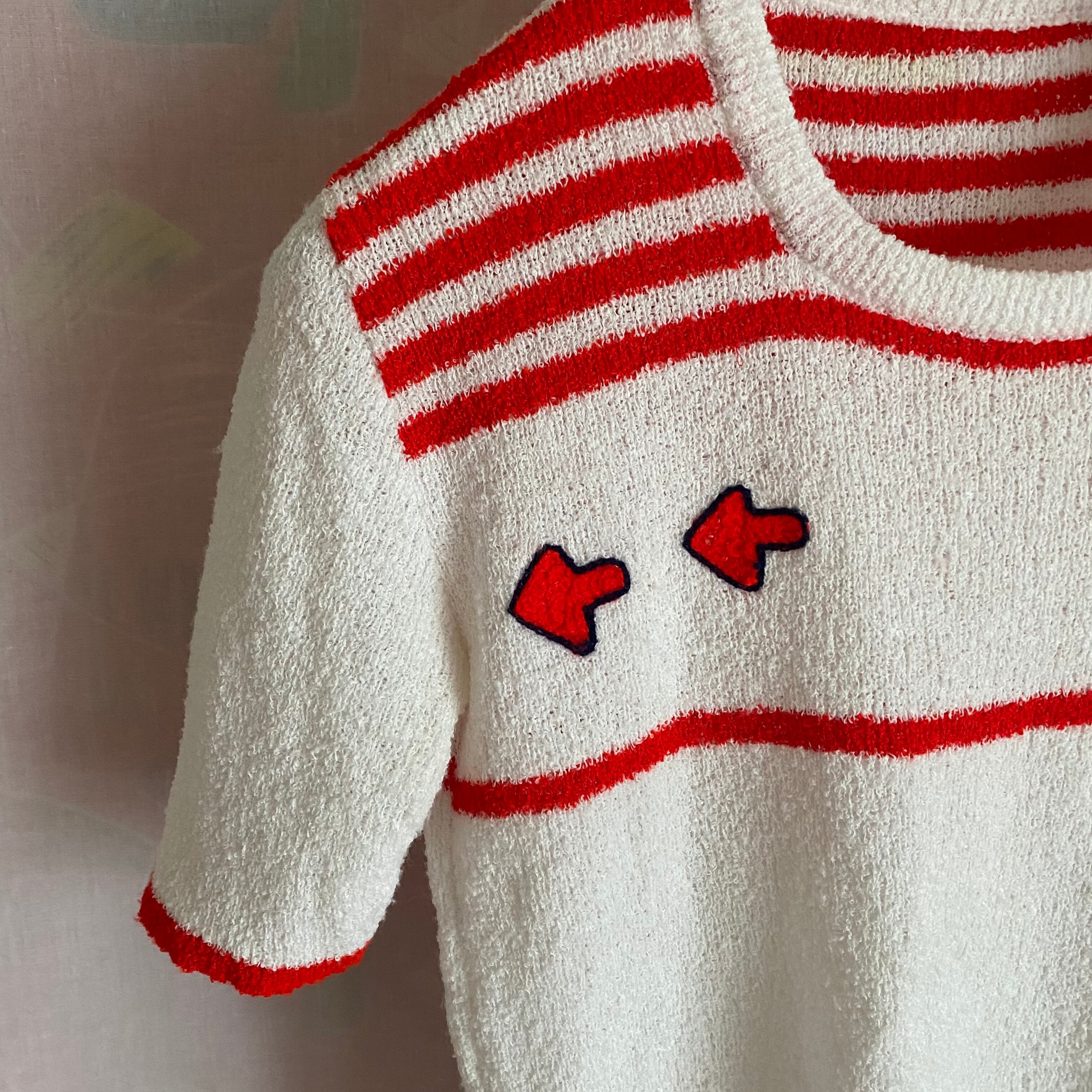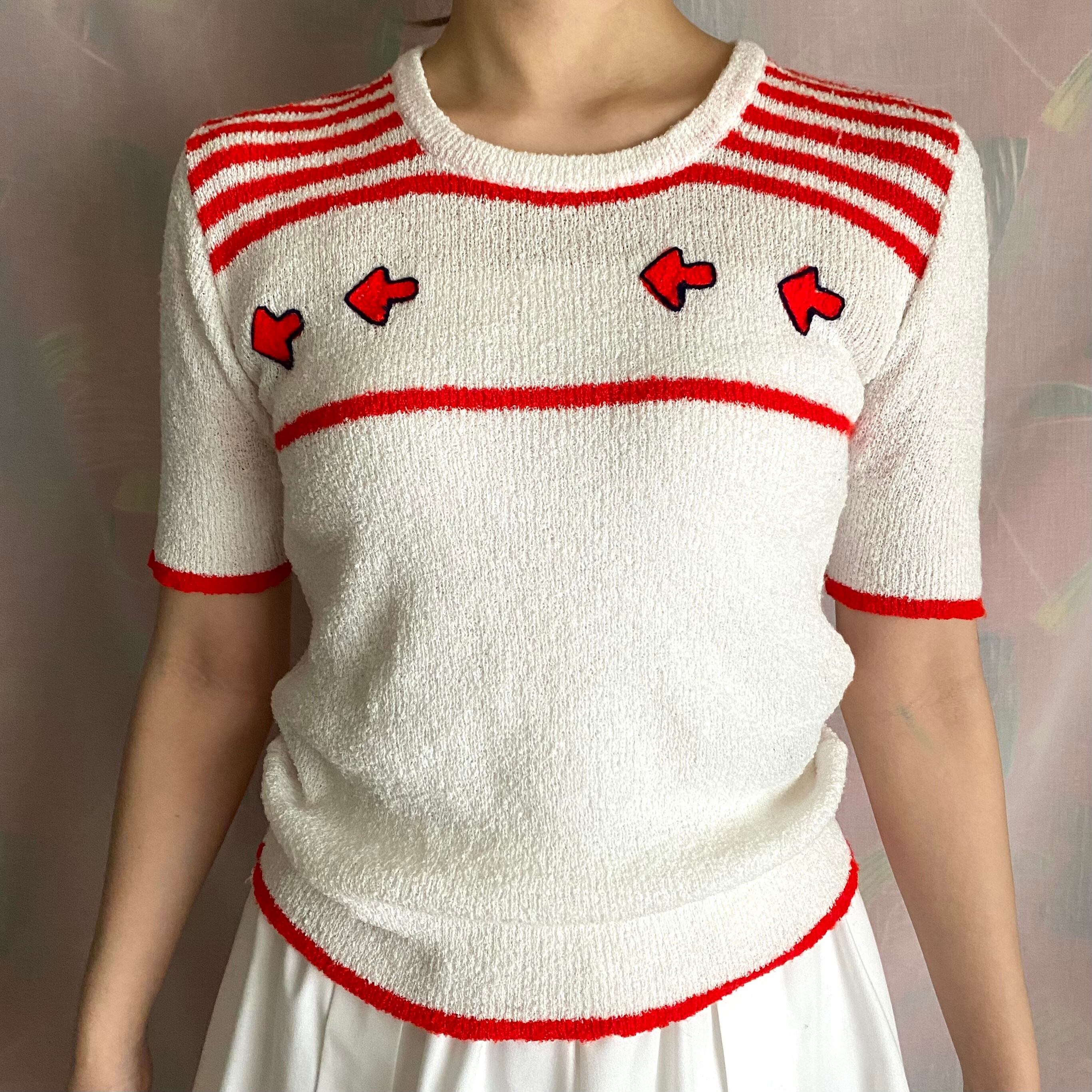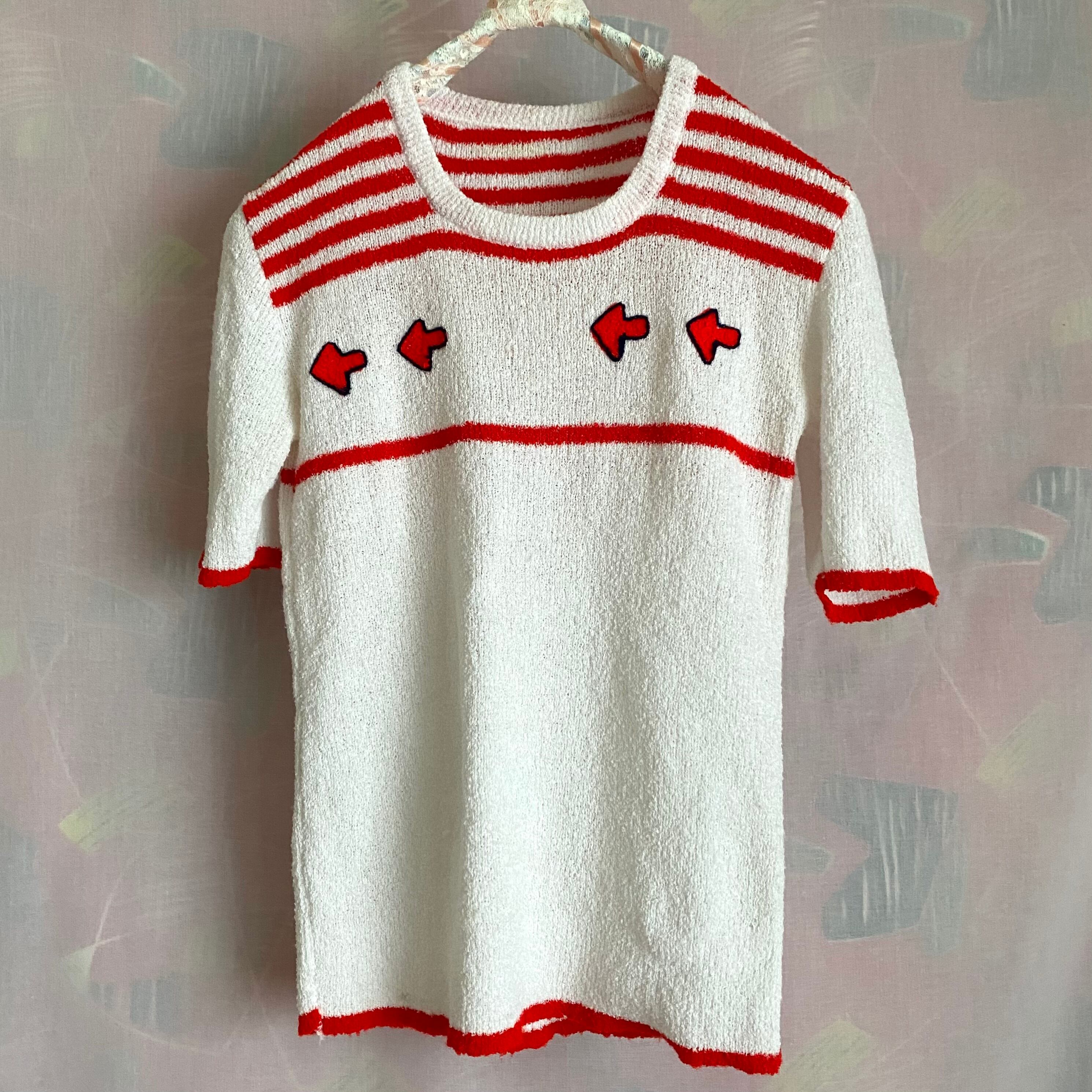 「右ですよ」と矢印が刺繍された半袖ニット。