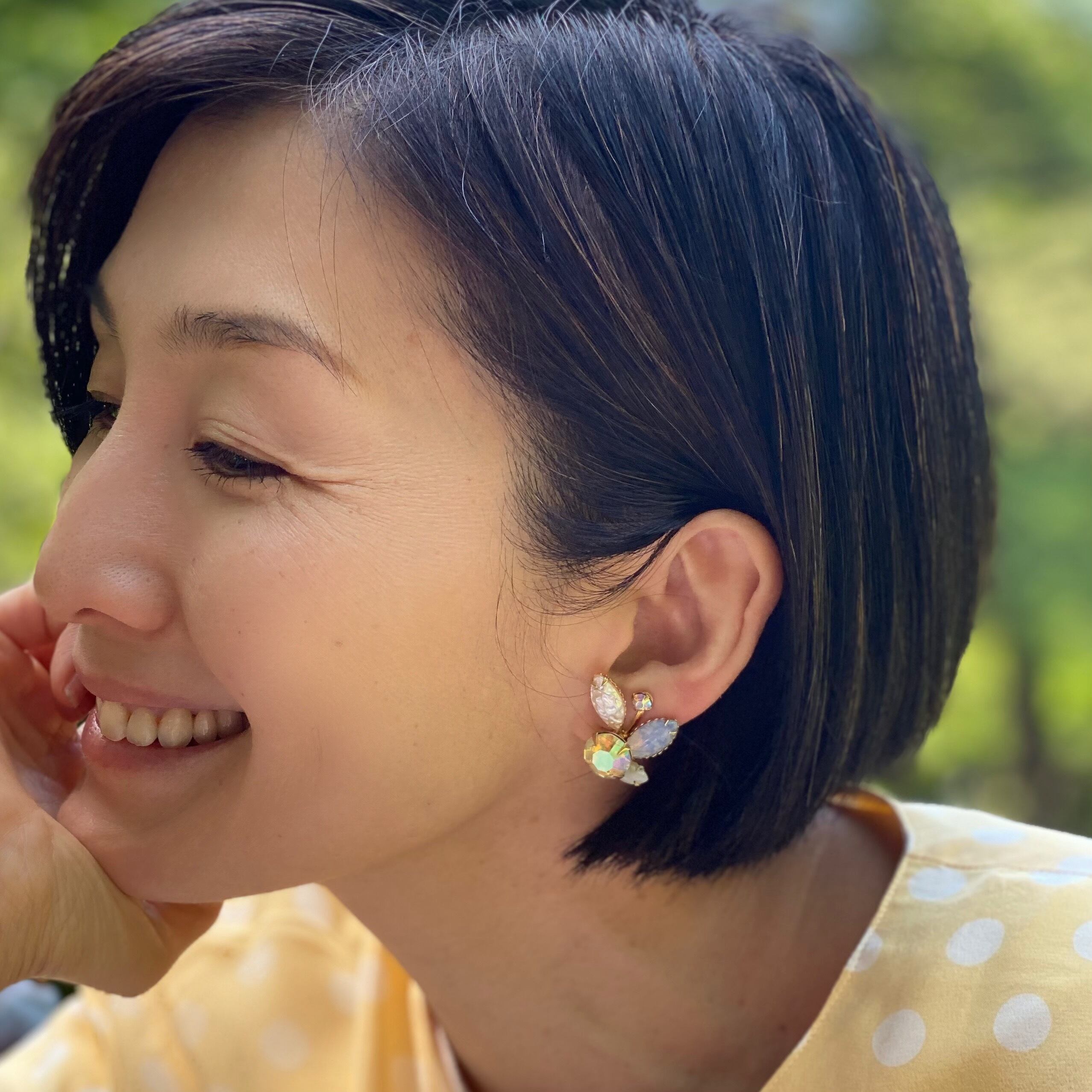 オーロラ、ホワイト、ミルク色のパーツが素敵に配置された立体感のあるイヤリング。