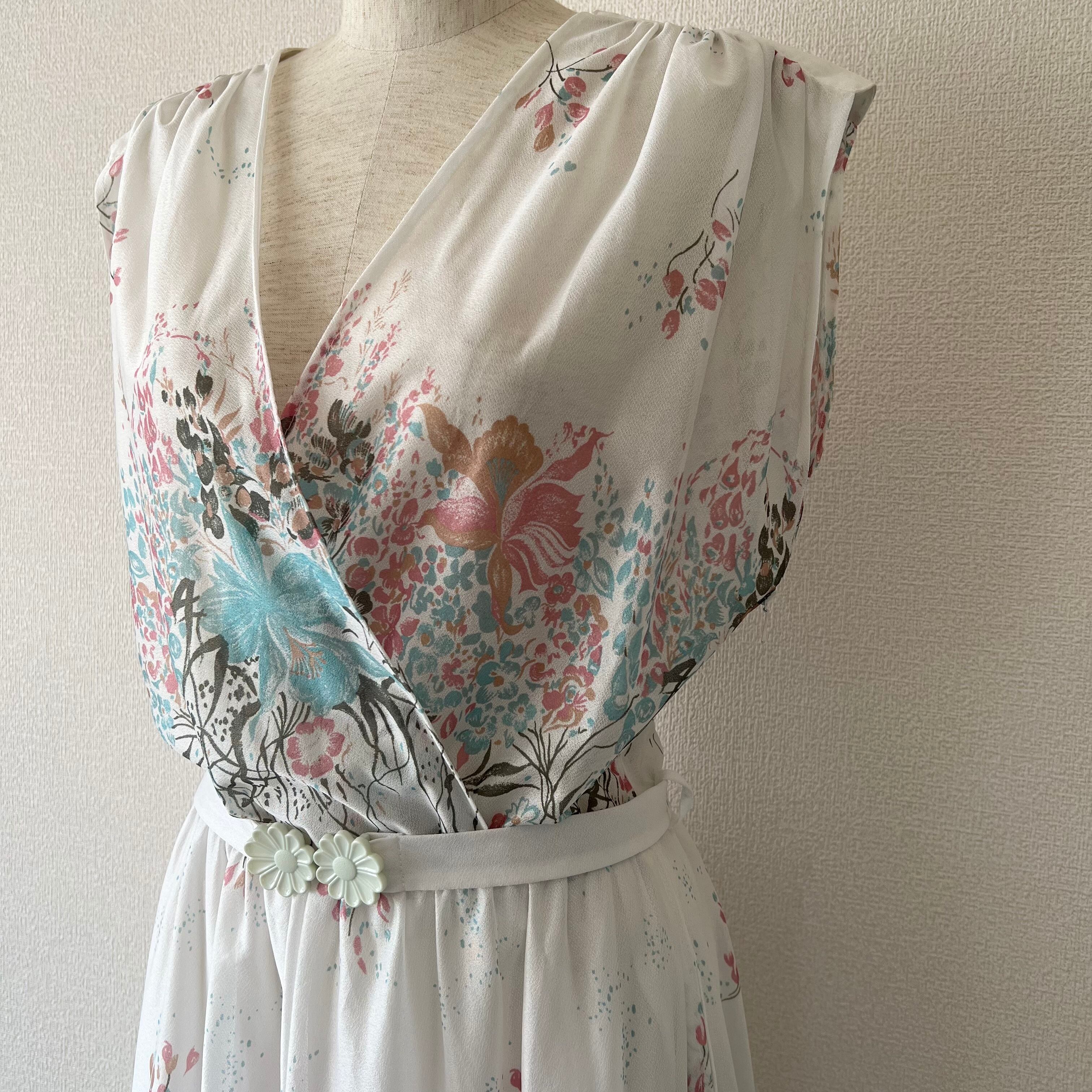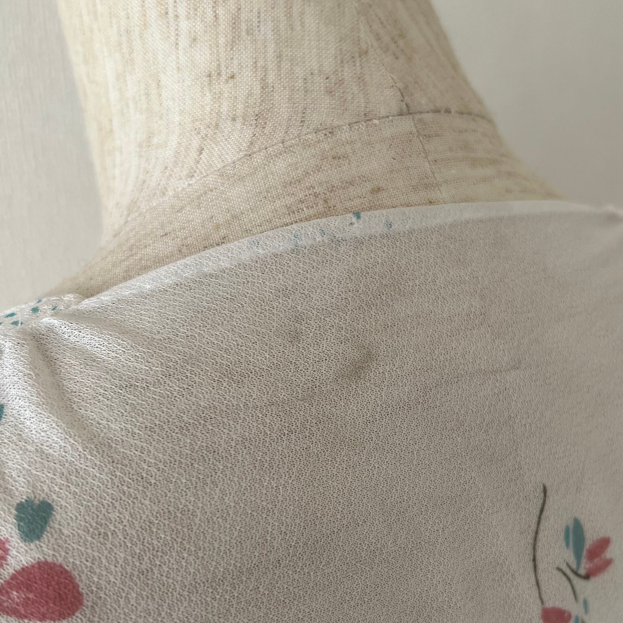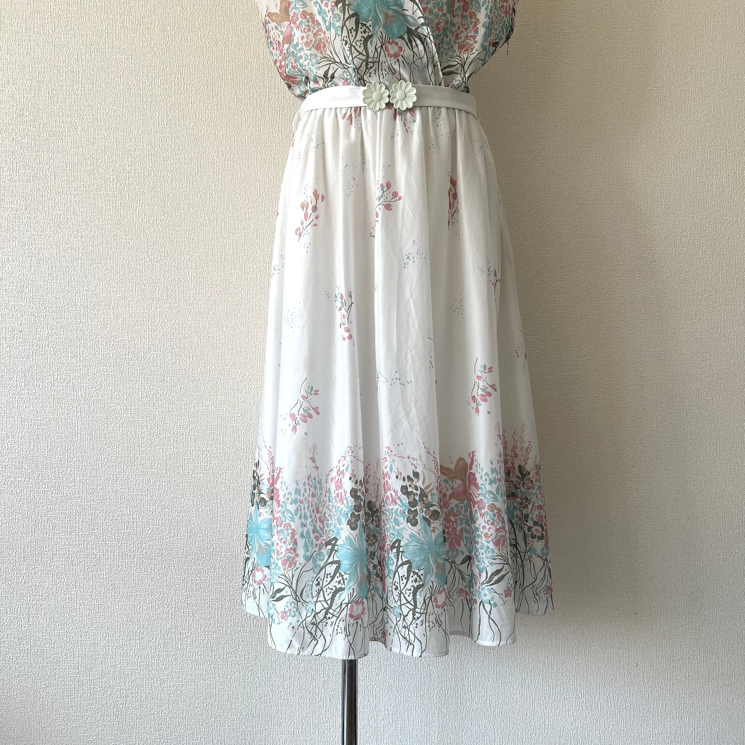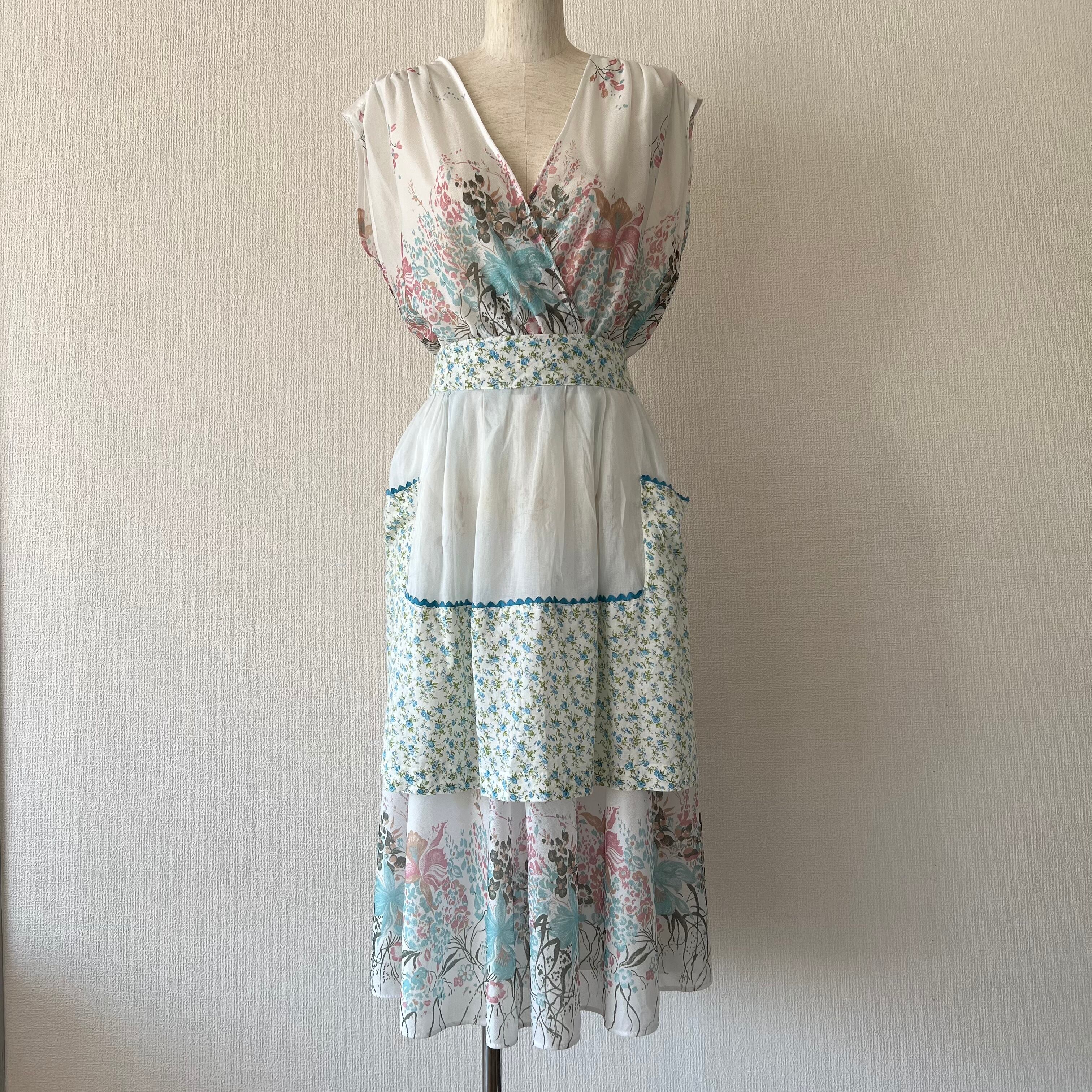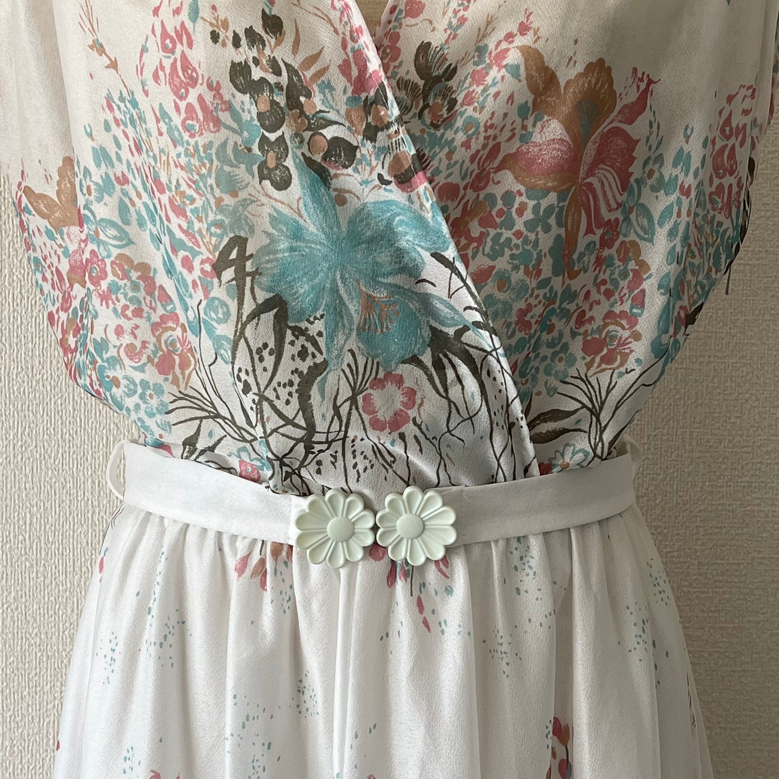共布ベルトのバックルは、お花モチーフのプラスチック。キュン。フロントスカートの右部分にうっすらシミが2箇所ありますが、あまりにも可愛いお品なので、シミ隠しに70年代のエプロンをお付けします。こちらはオーガンジー×小花柄コットン×ヤマミチテープの腰エプロンです。