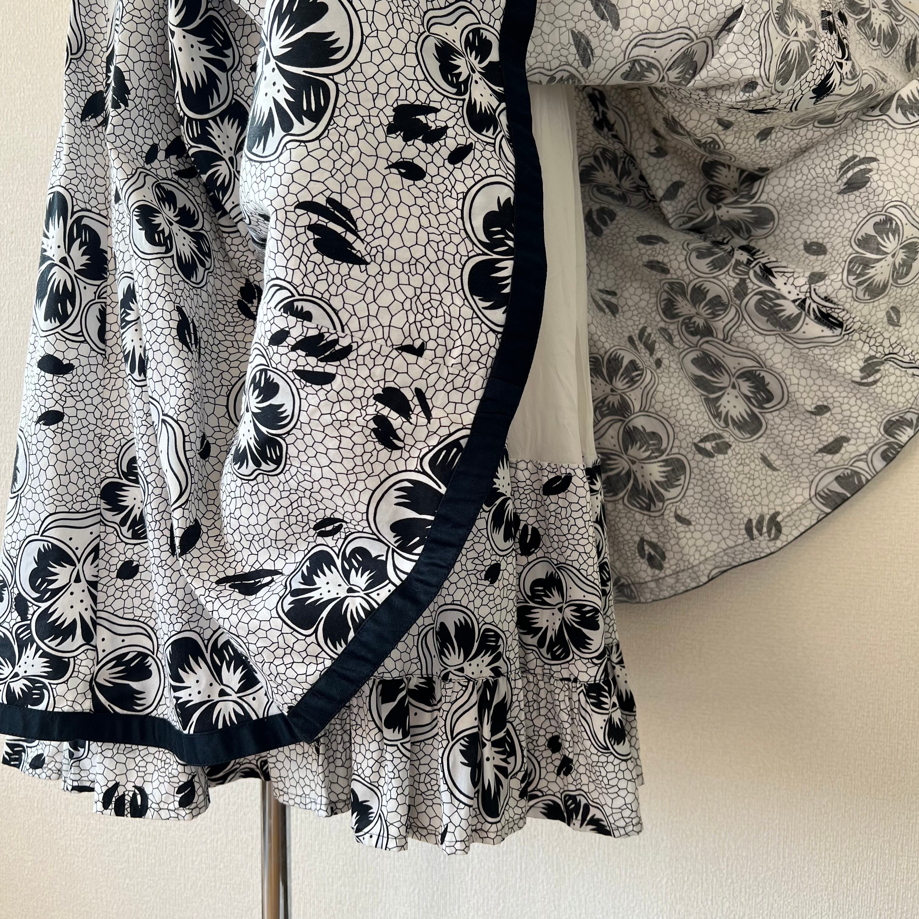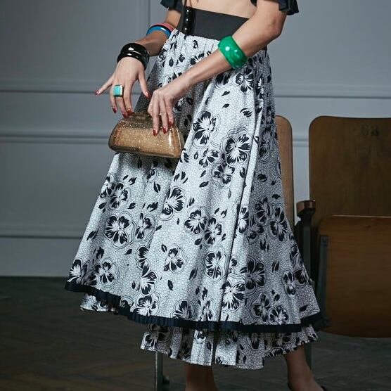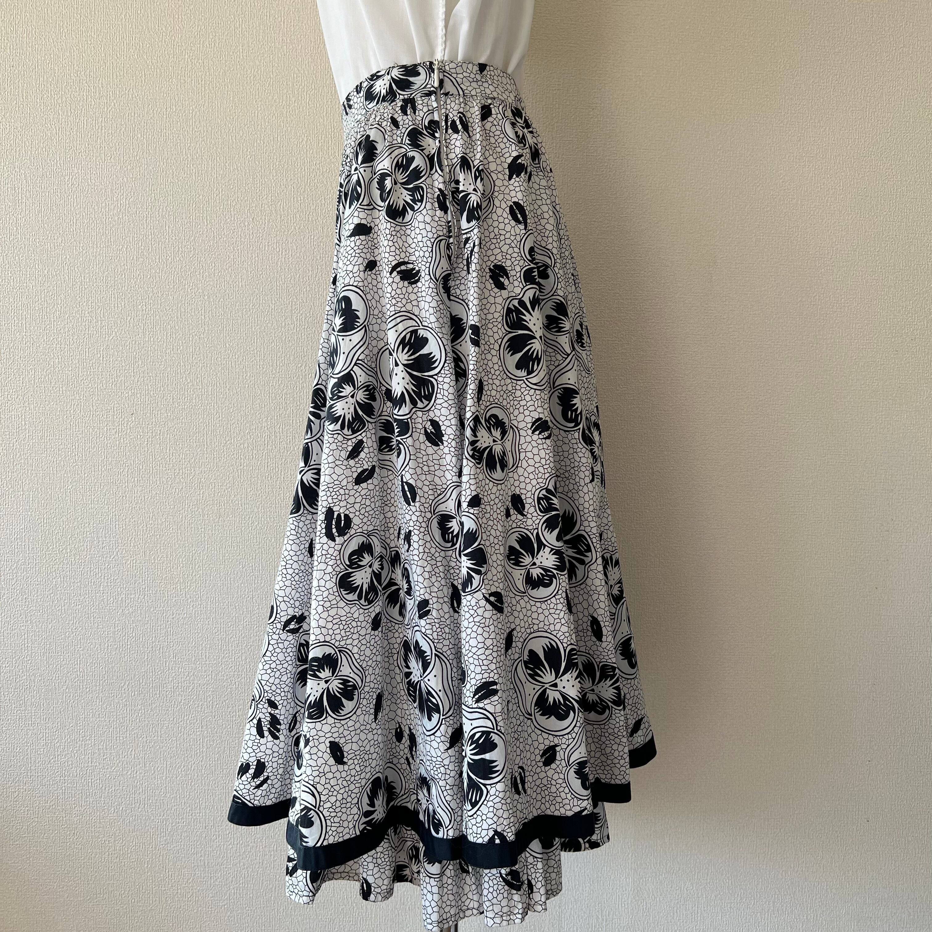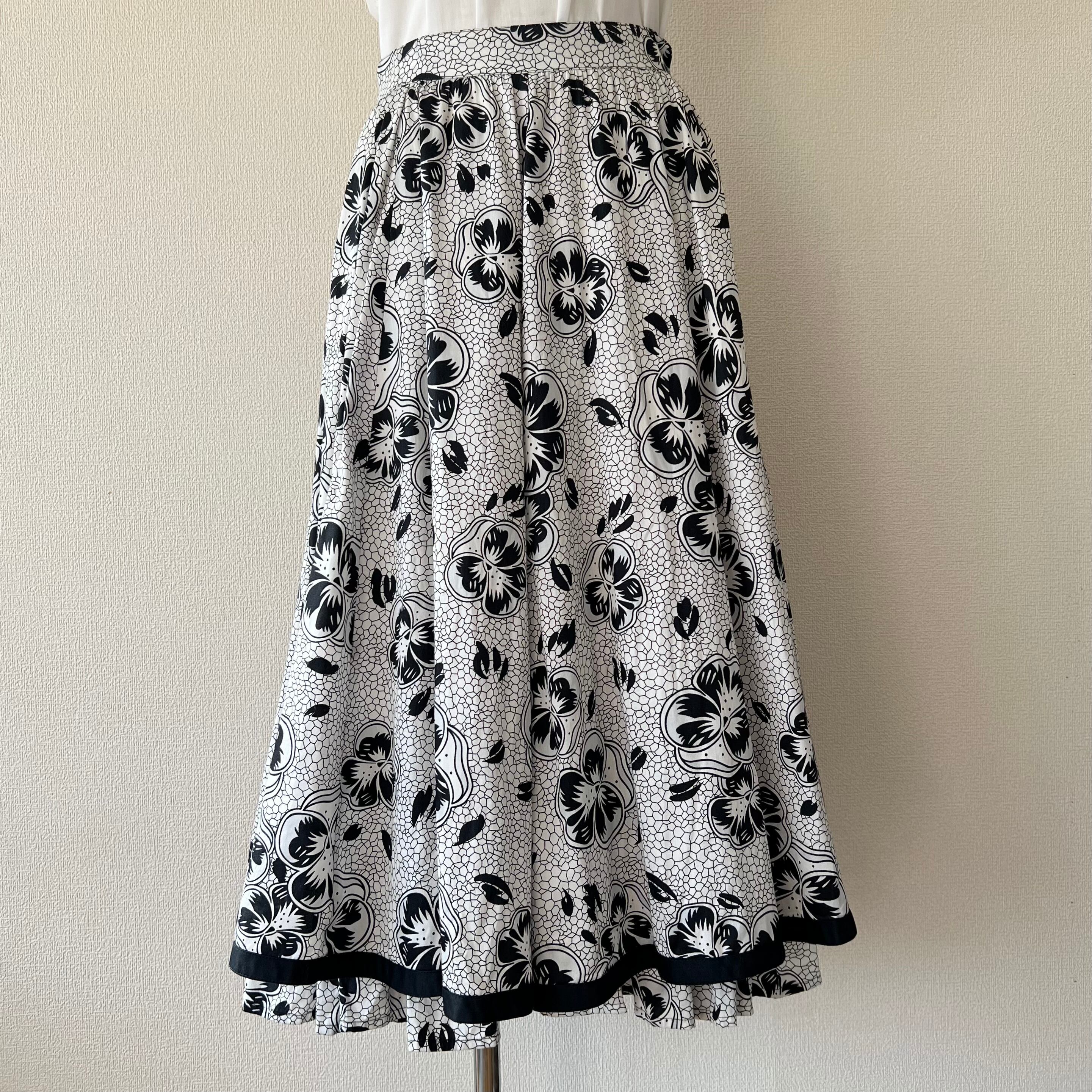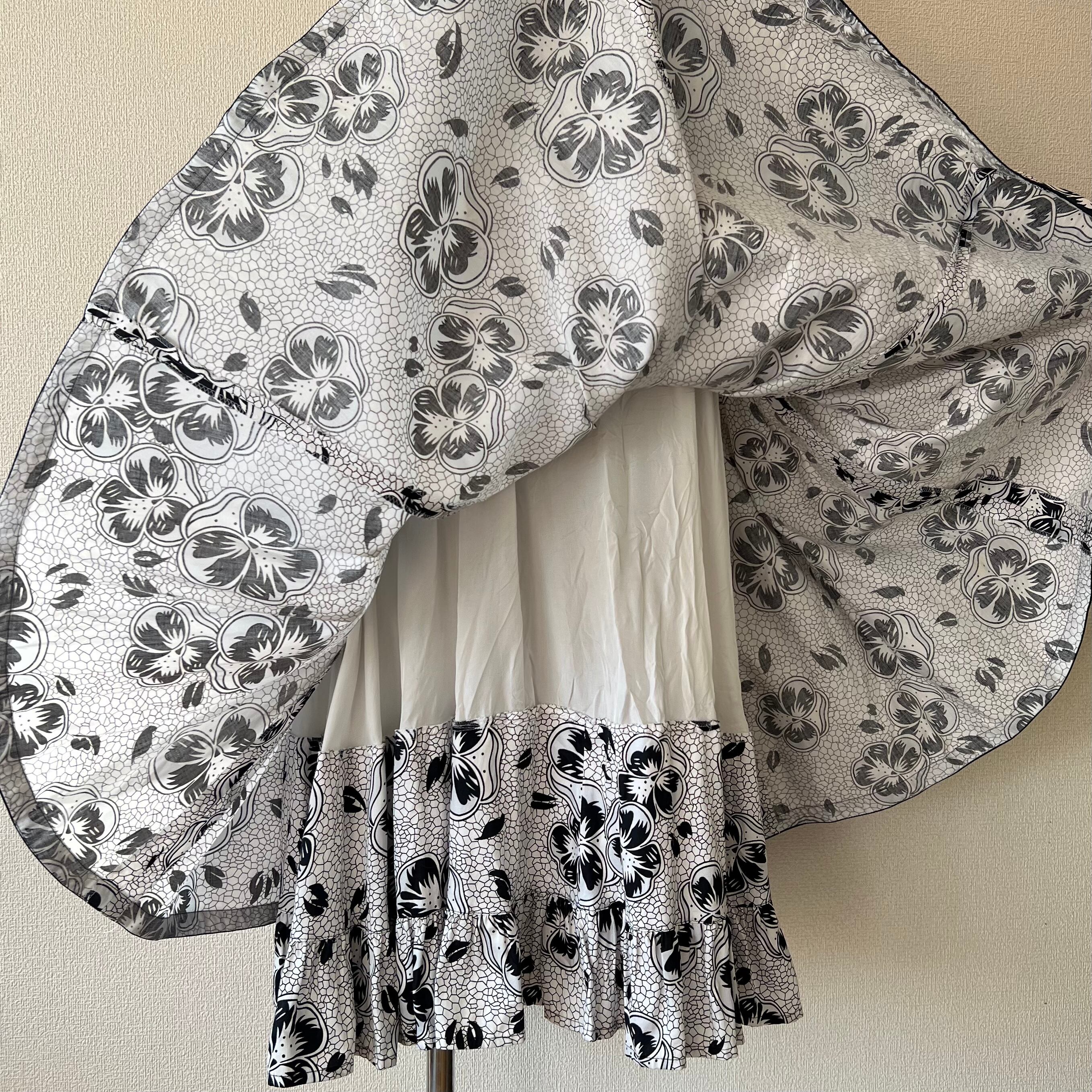 黒いパイピングがあしらわれた裾から覗く裏地には共布素材、更に内側にはハリのあるオーガンジーがあしらわれた二重仕立て。ボリューミーで優雅に揺れるフレアーと印象的なフラワープリントが素敵なスカートです。