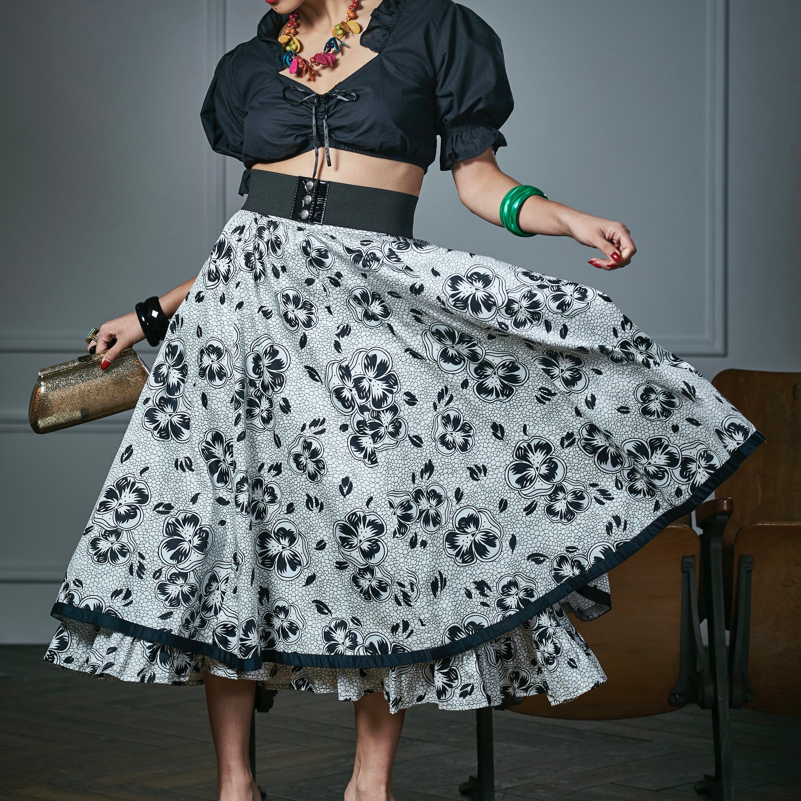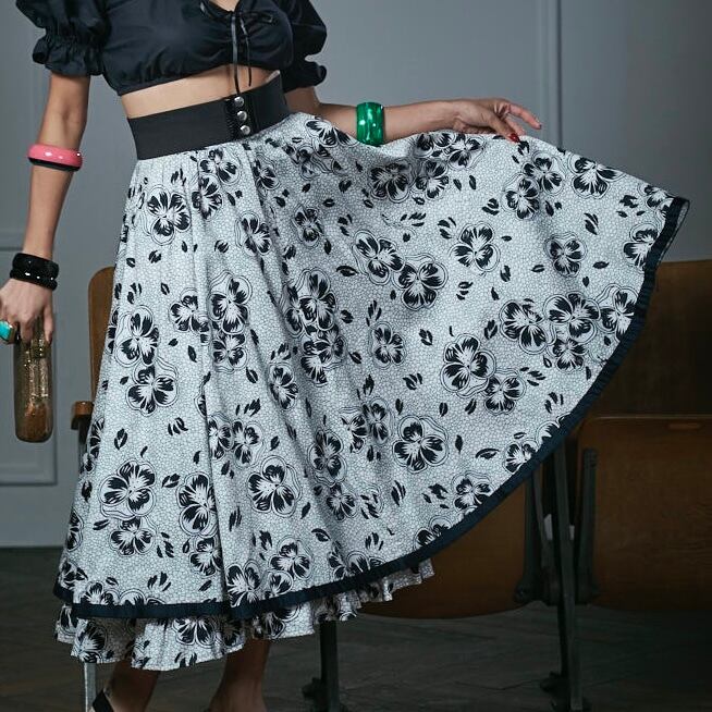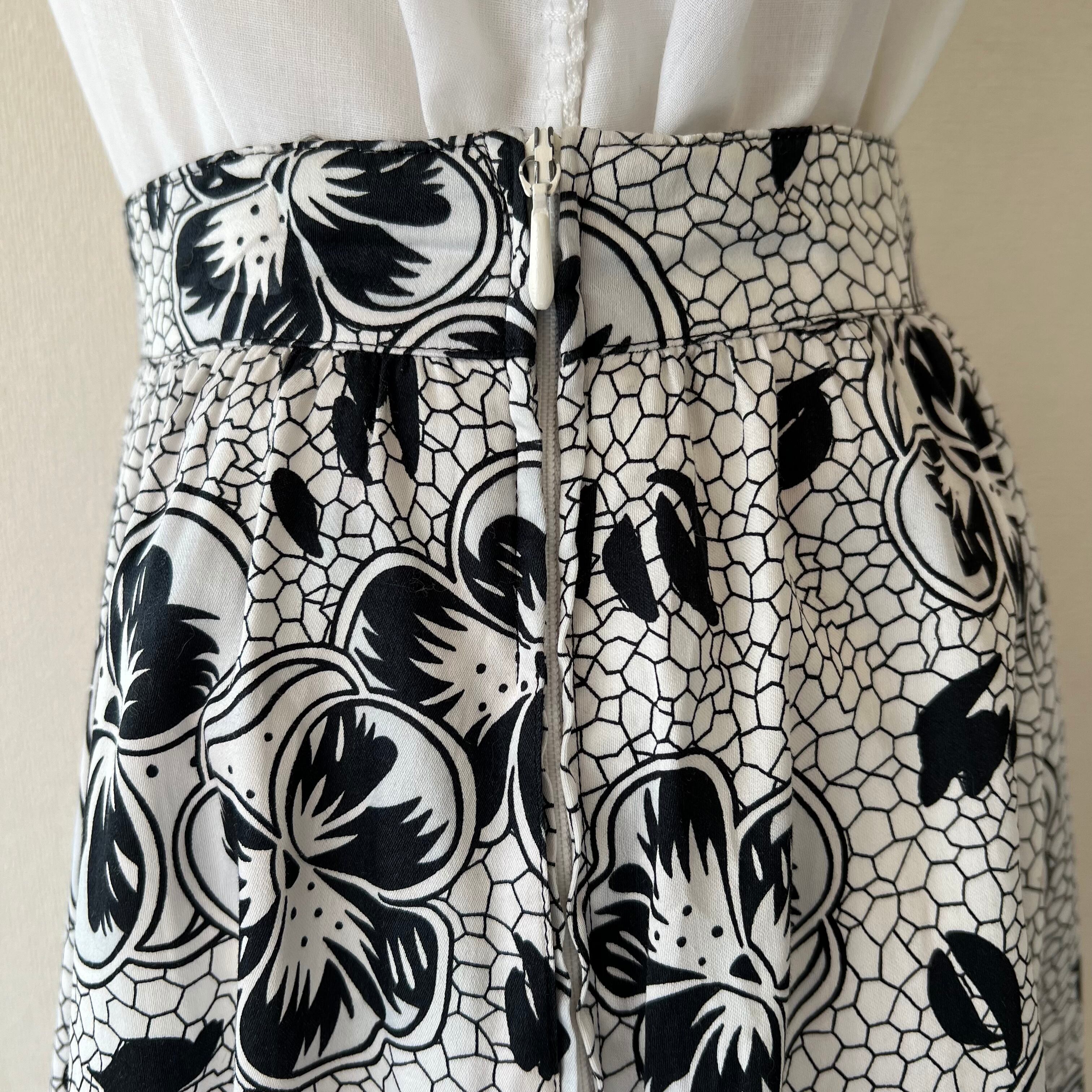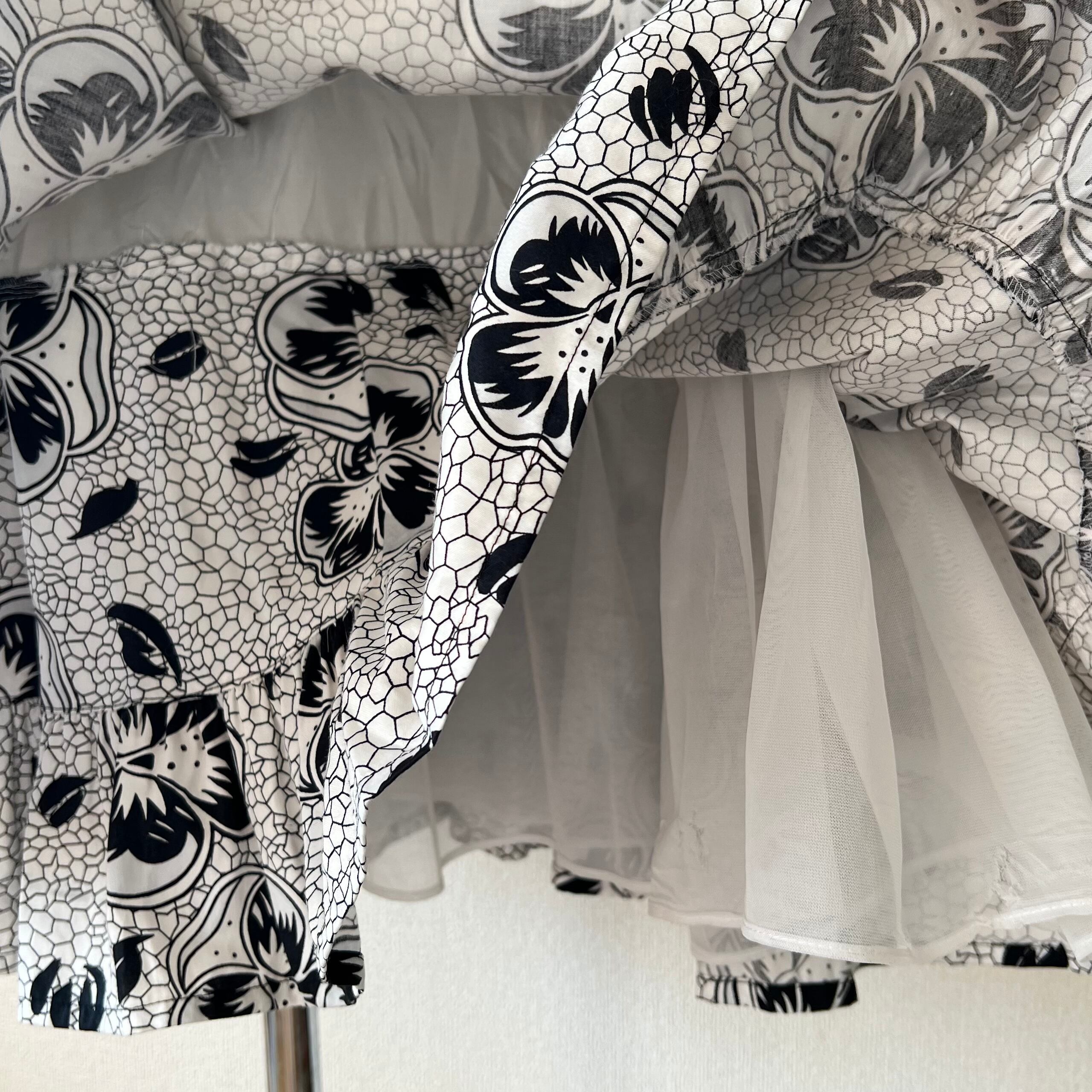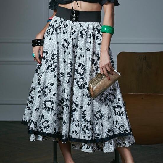 黒いパイピングがあしらわれた裾から覗く裏地には共布素材、更に内側にはハリのあるオーガンジーがあしらわれた二重仕立て。ボリューミーで優雅に揺れるフレアーと印象的なフラワープリントが素敵なスカートです。